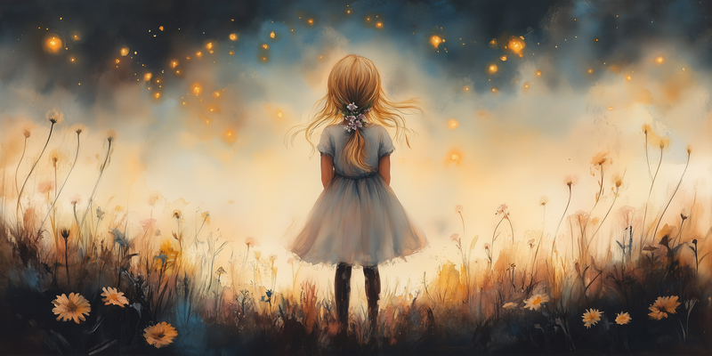 Dromerig Meisje tussen Bloemen en Sterrenhemel