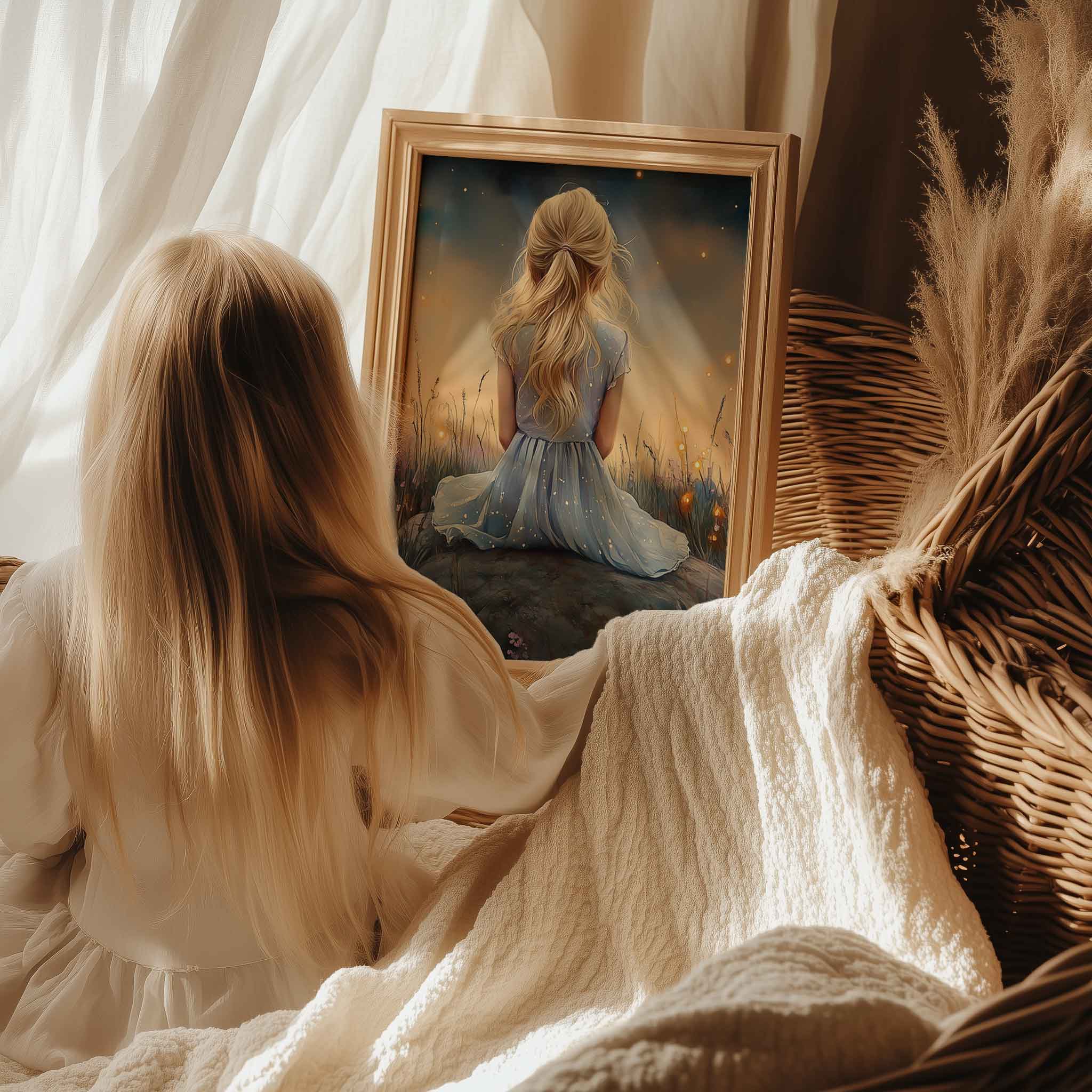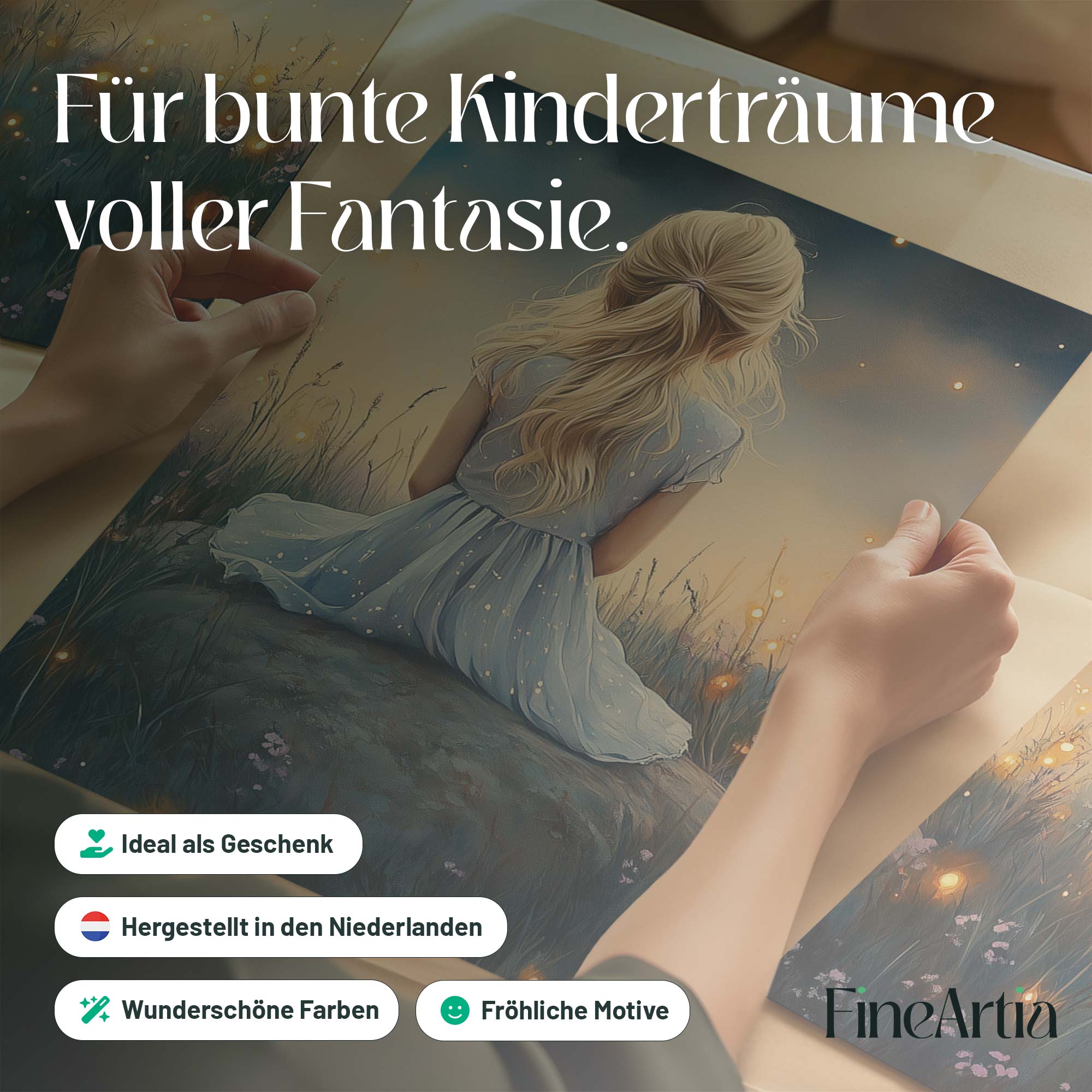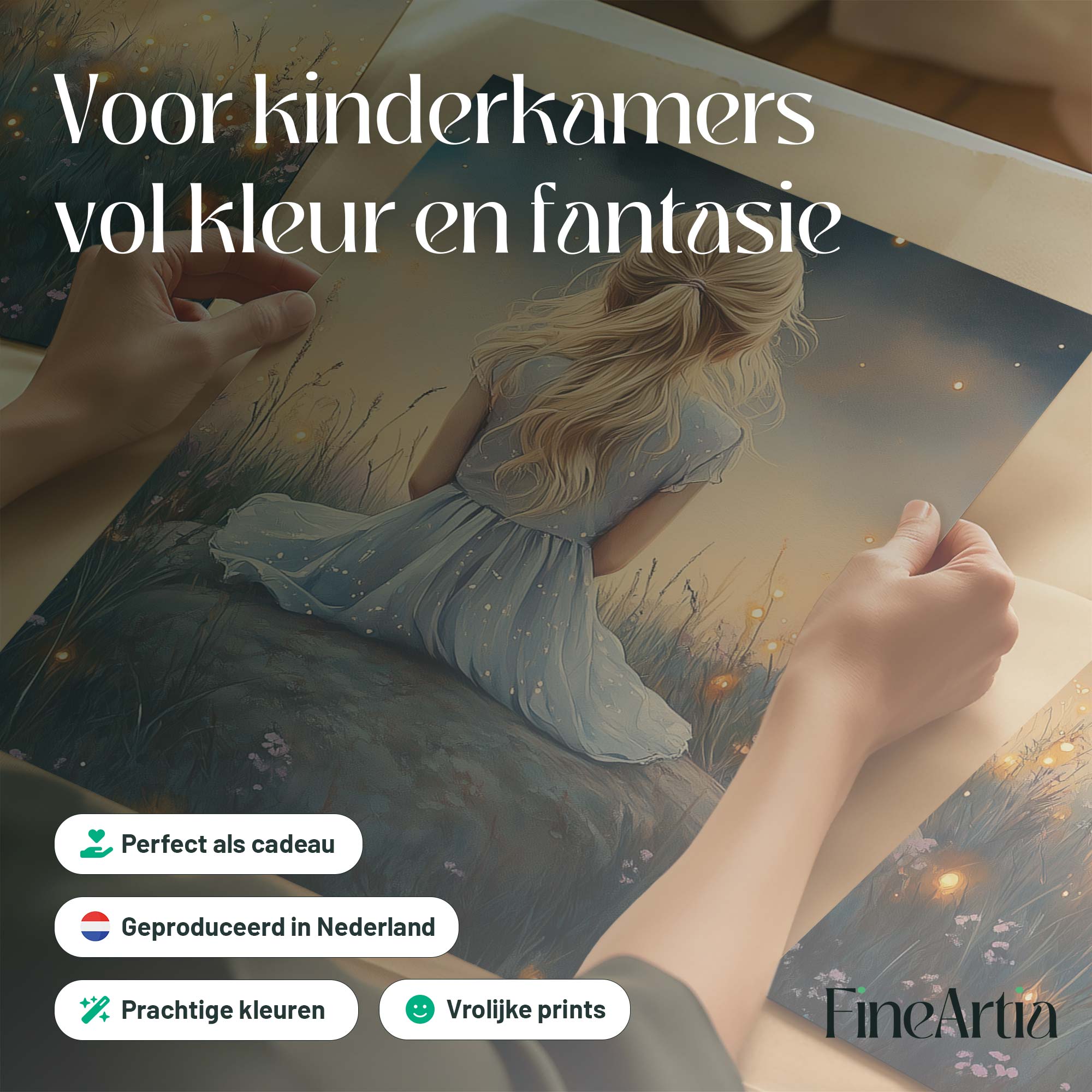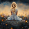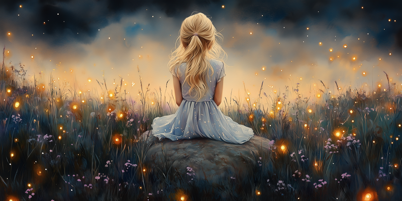 Dromerig Meisje tussen Vuurvliegjes en Bloemen