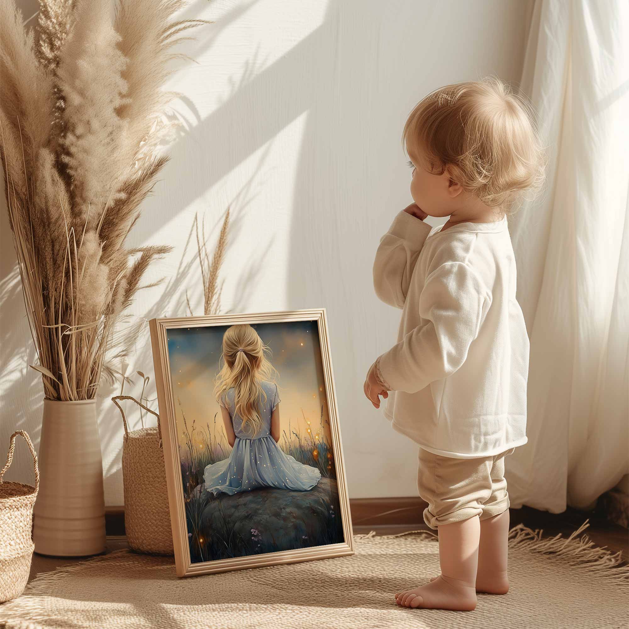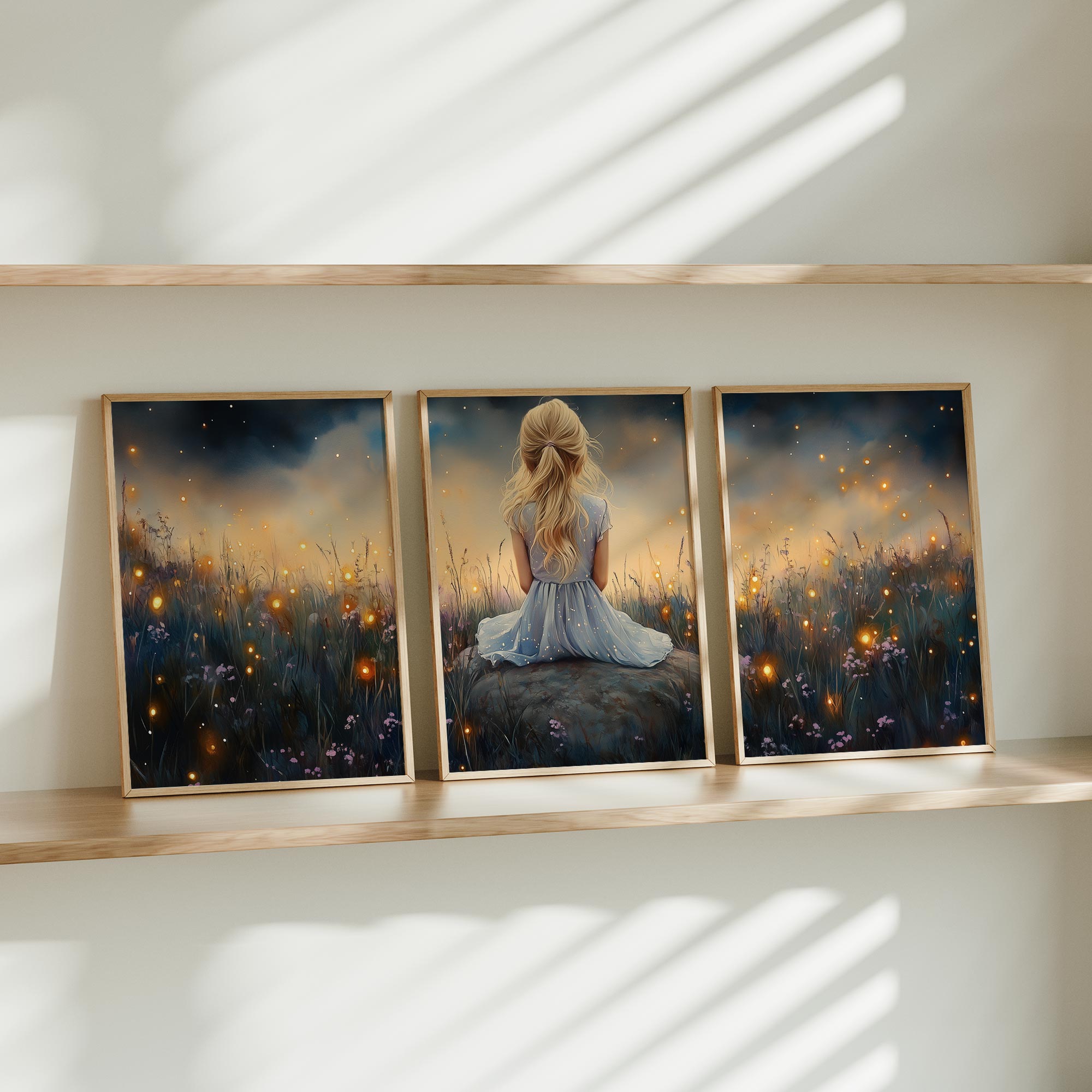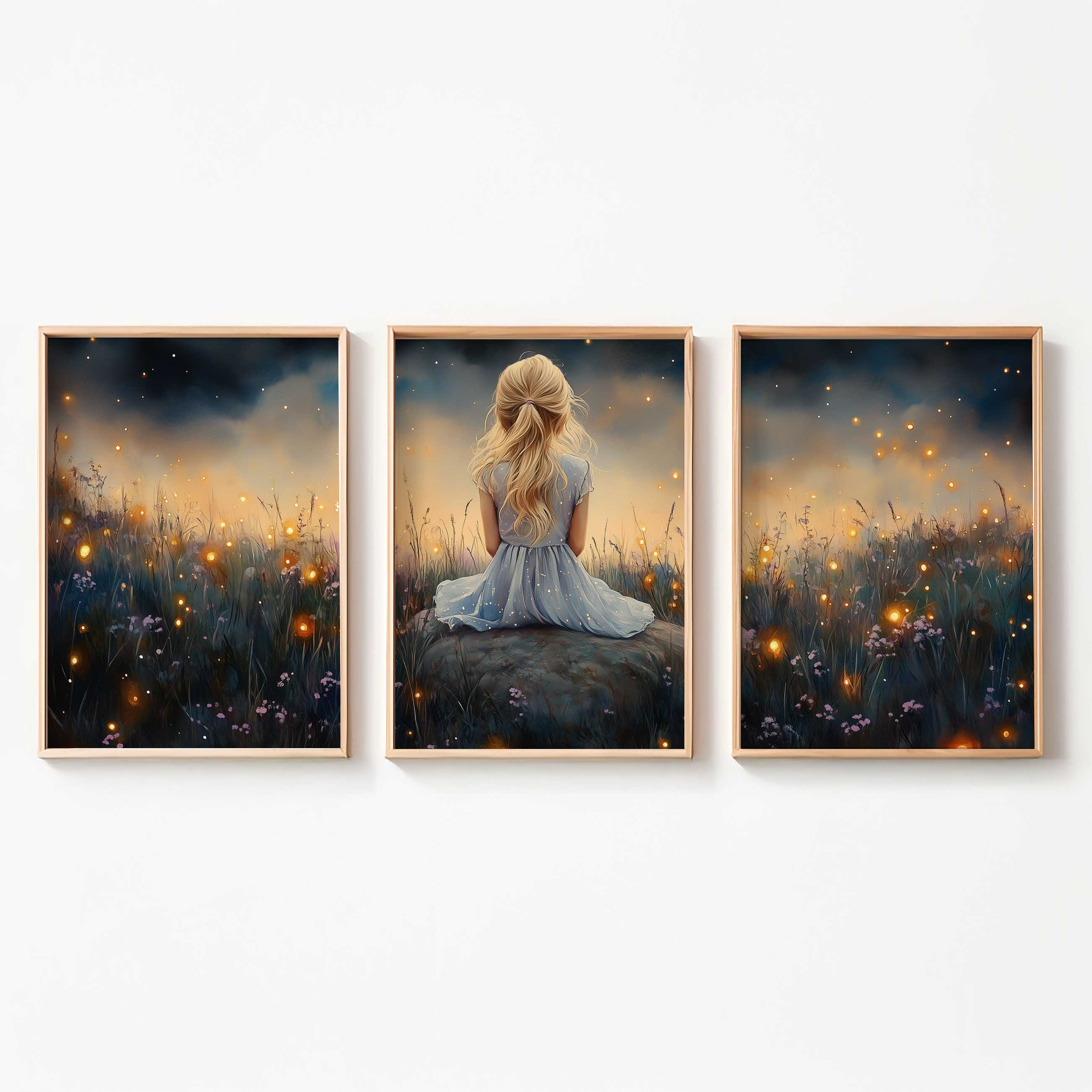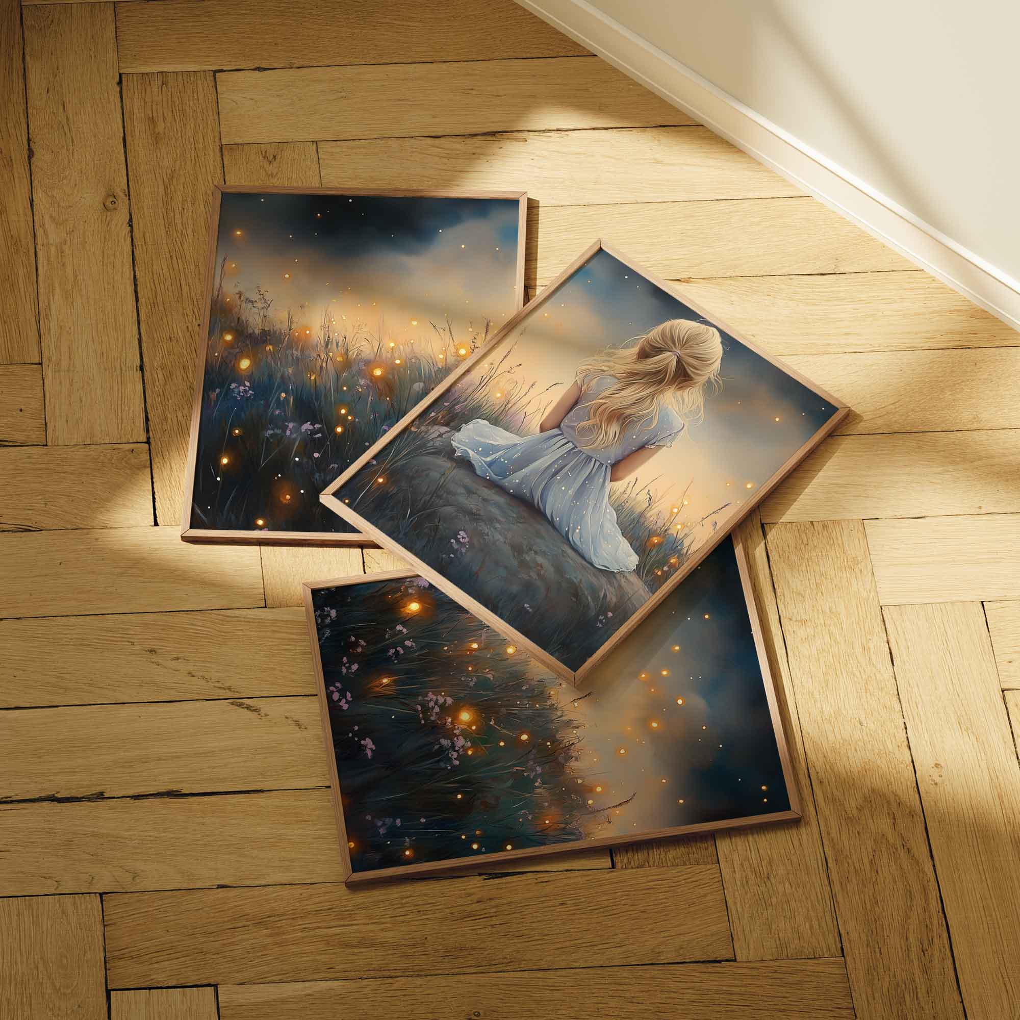 Dromerig Meisje tussen Vuurvliegjes en Bloemen