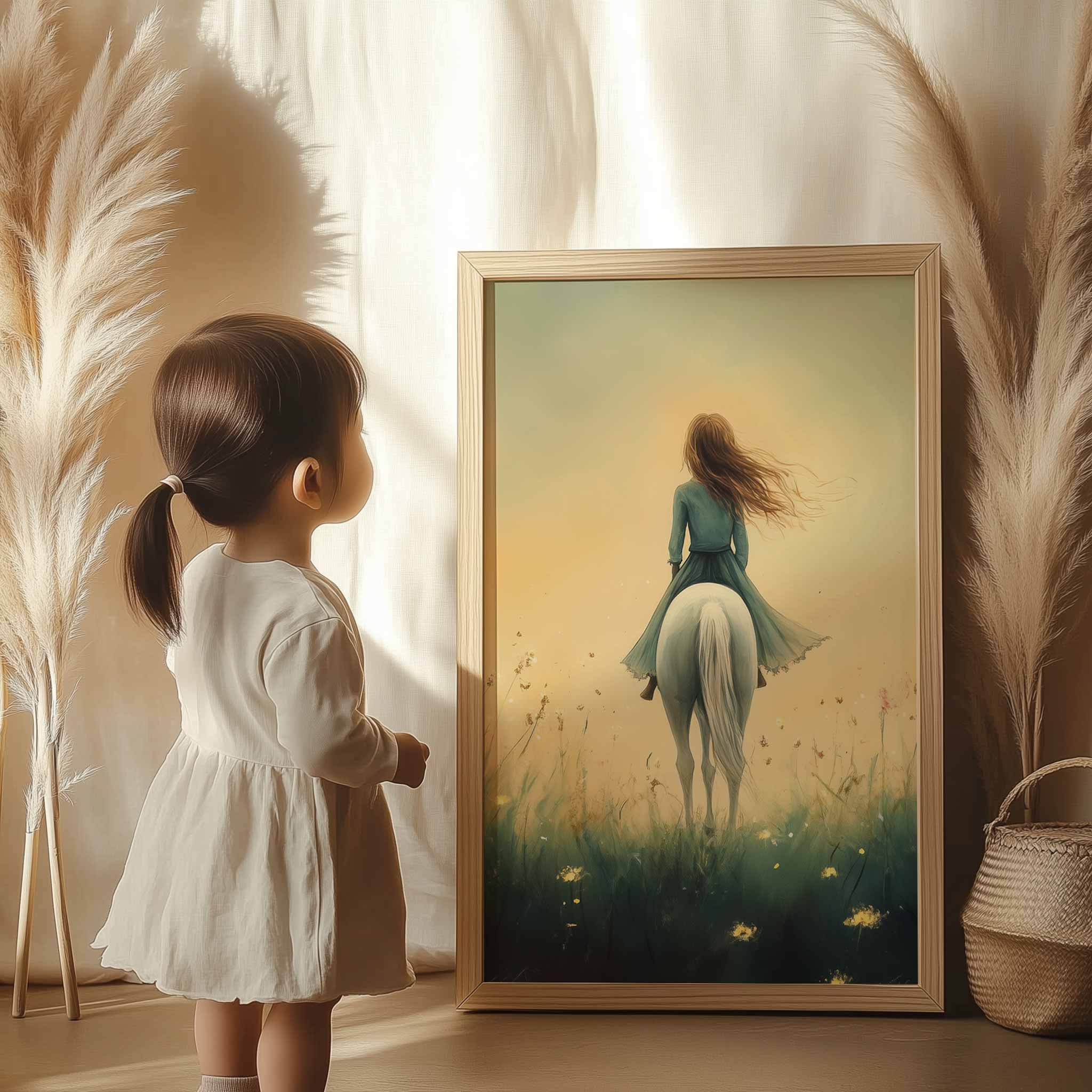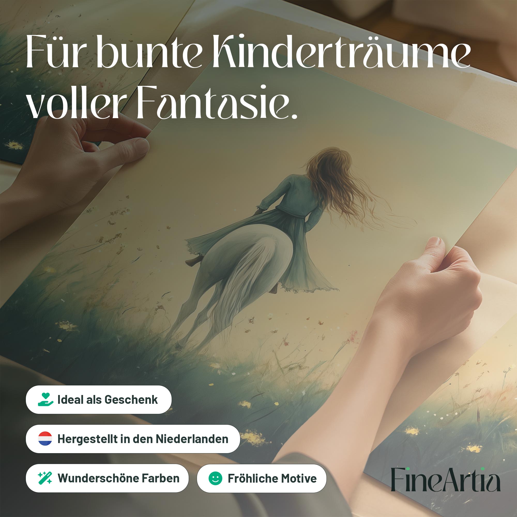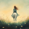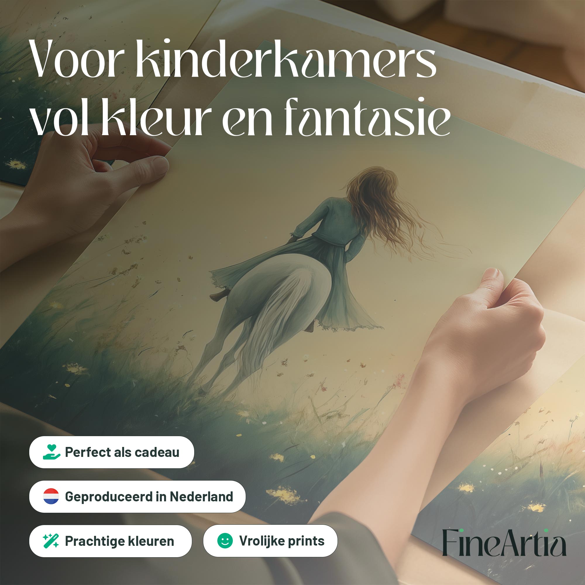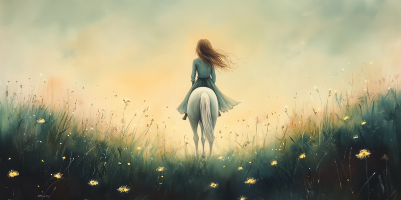 Dromerig Tafereel: Vrouw en Wit Paard in Bloemenveld