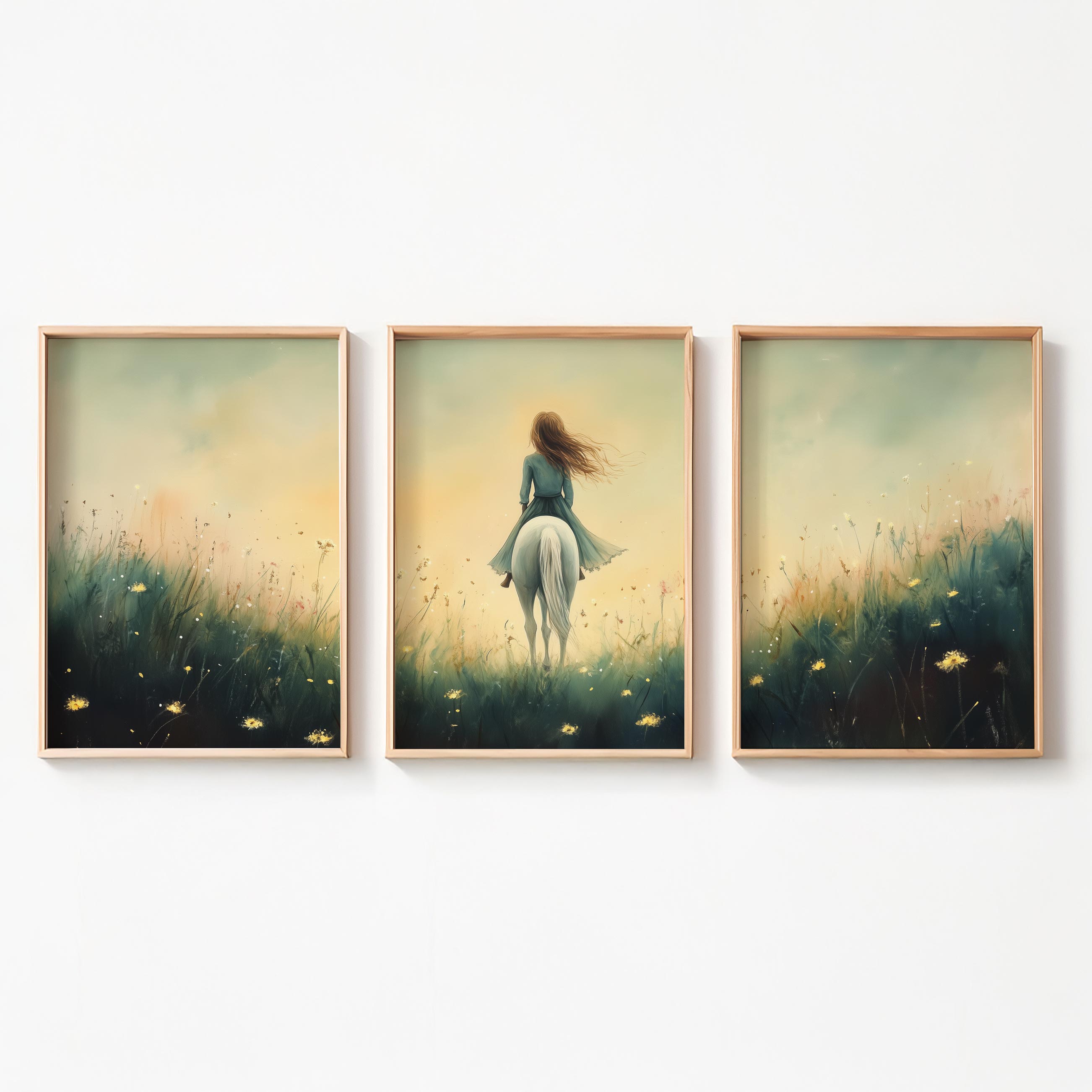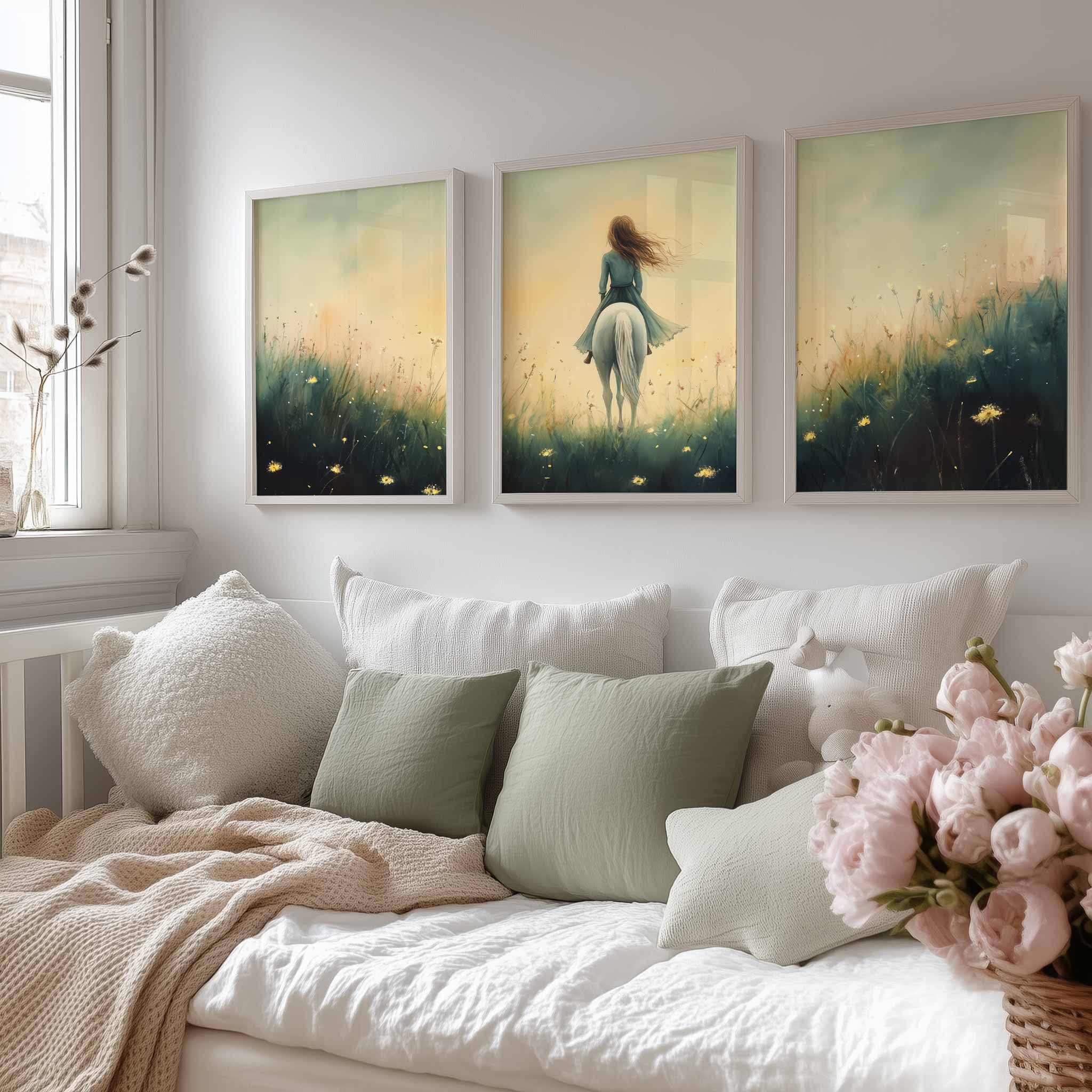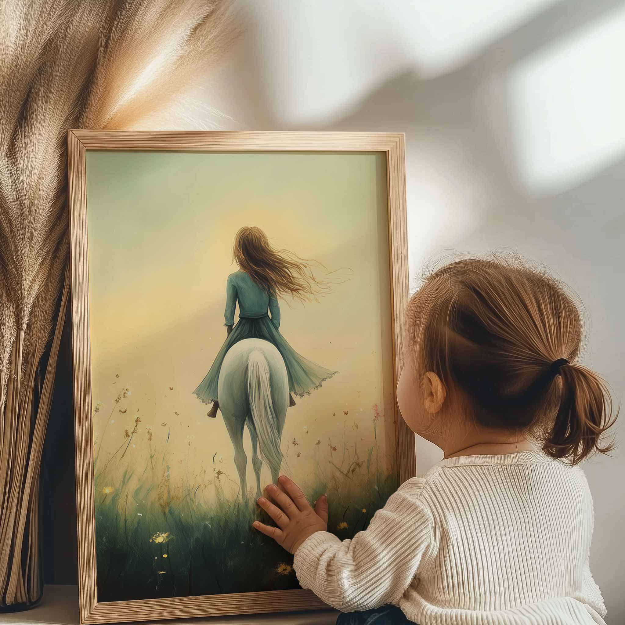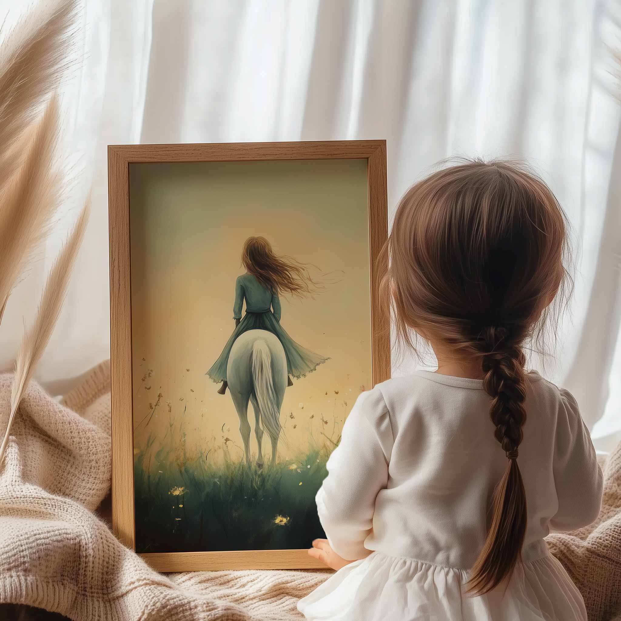 Dromerig Tafereel: Vrouw en Wit Paard in Bloemenveld