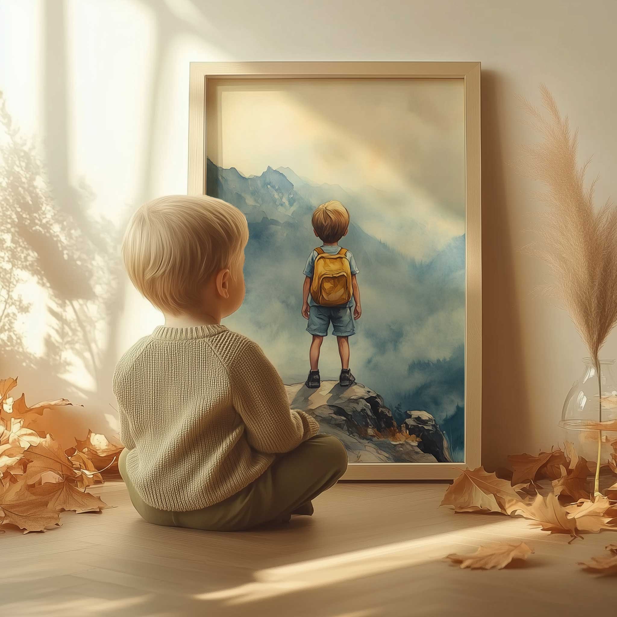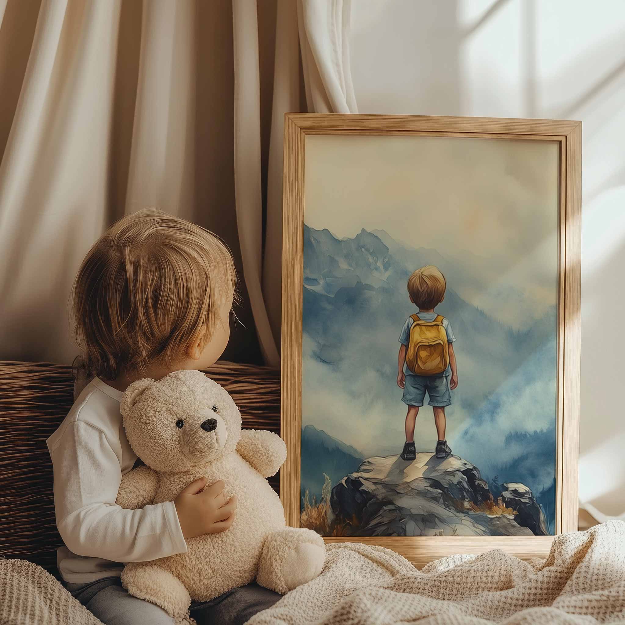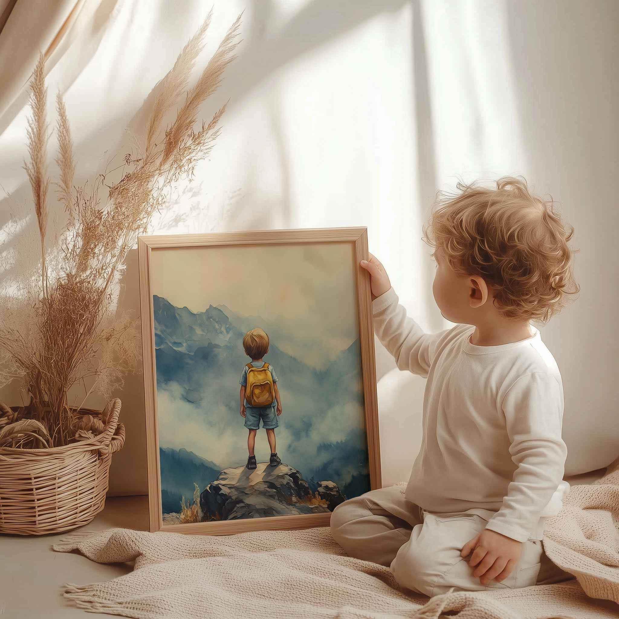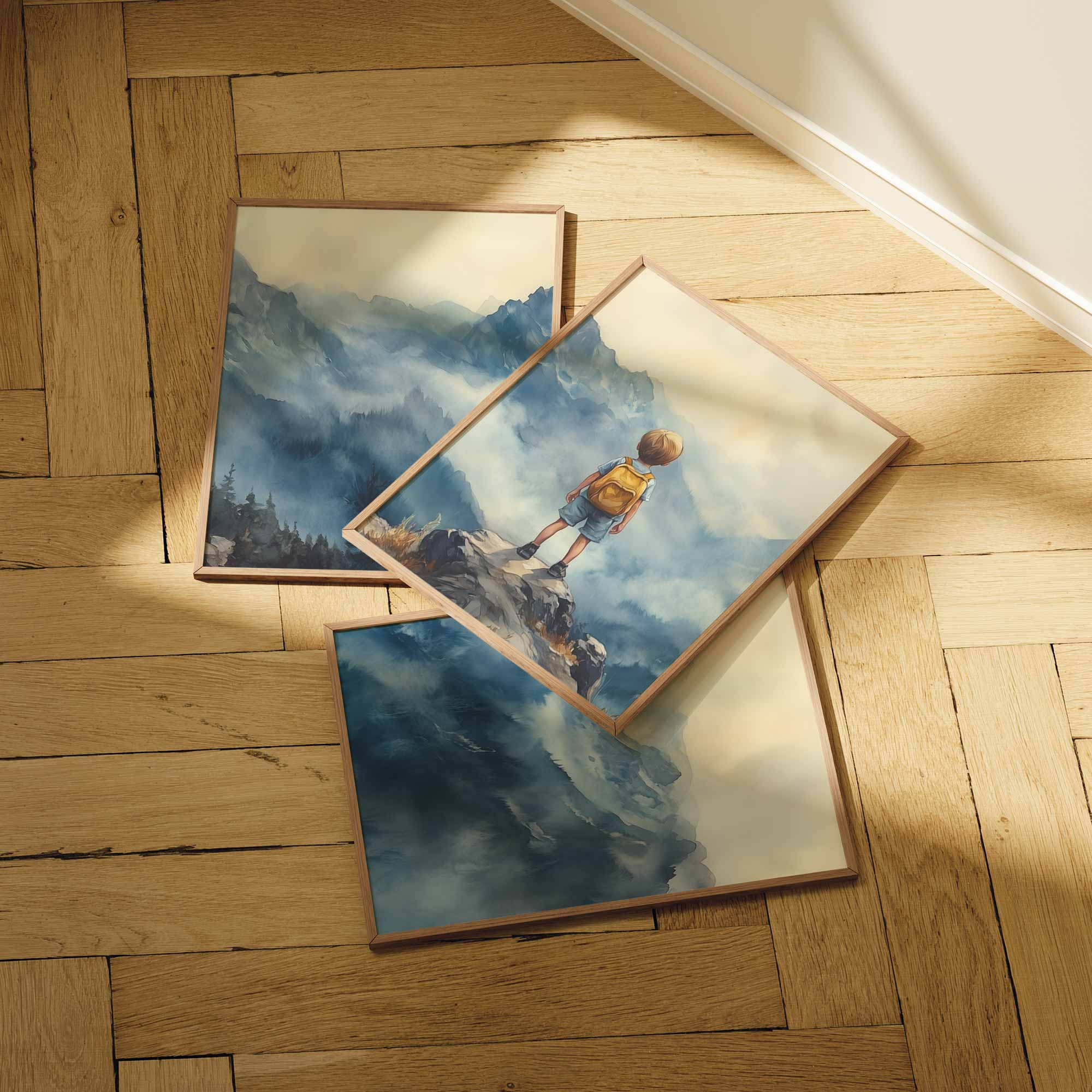 Dromerige Bergverkenner – Blauw-Wit Pastel Schilderij