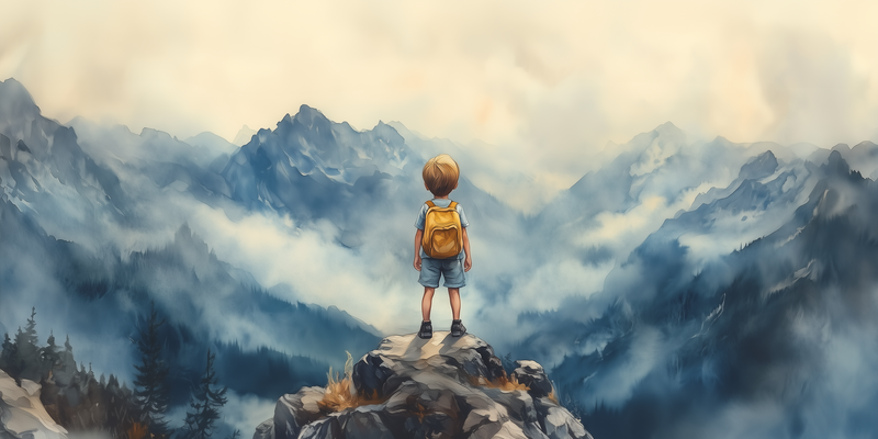 Dromerige Bergverkenner – Pastel Landschap voor Jonge Avonturiers