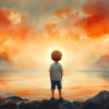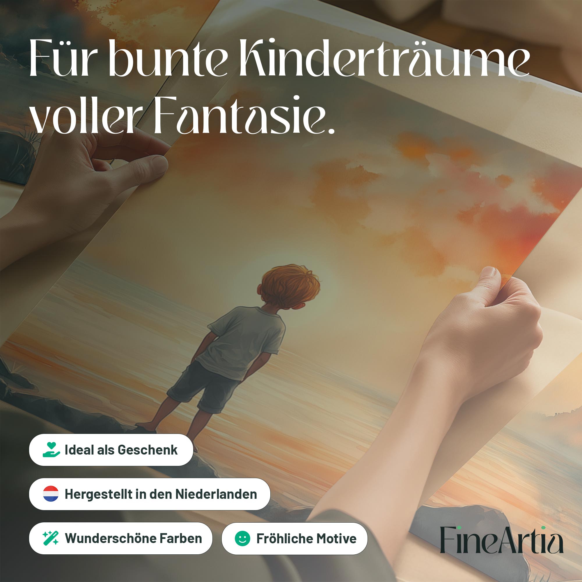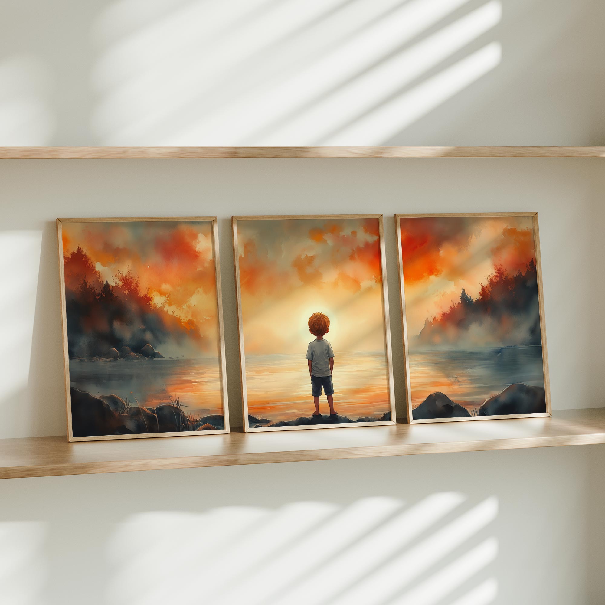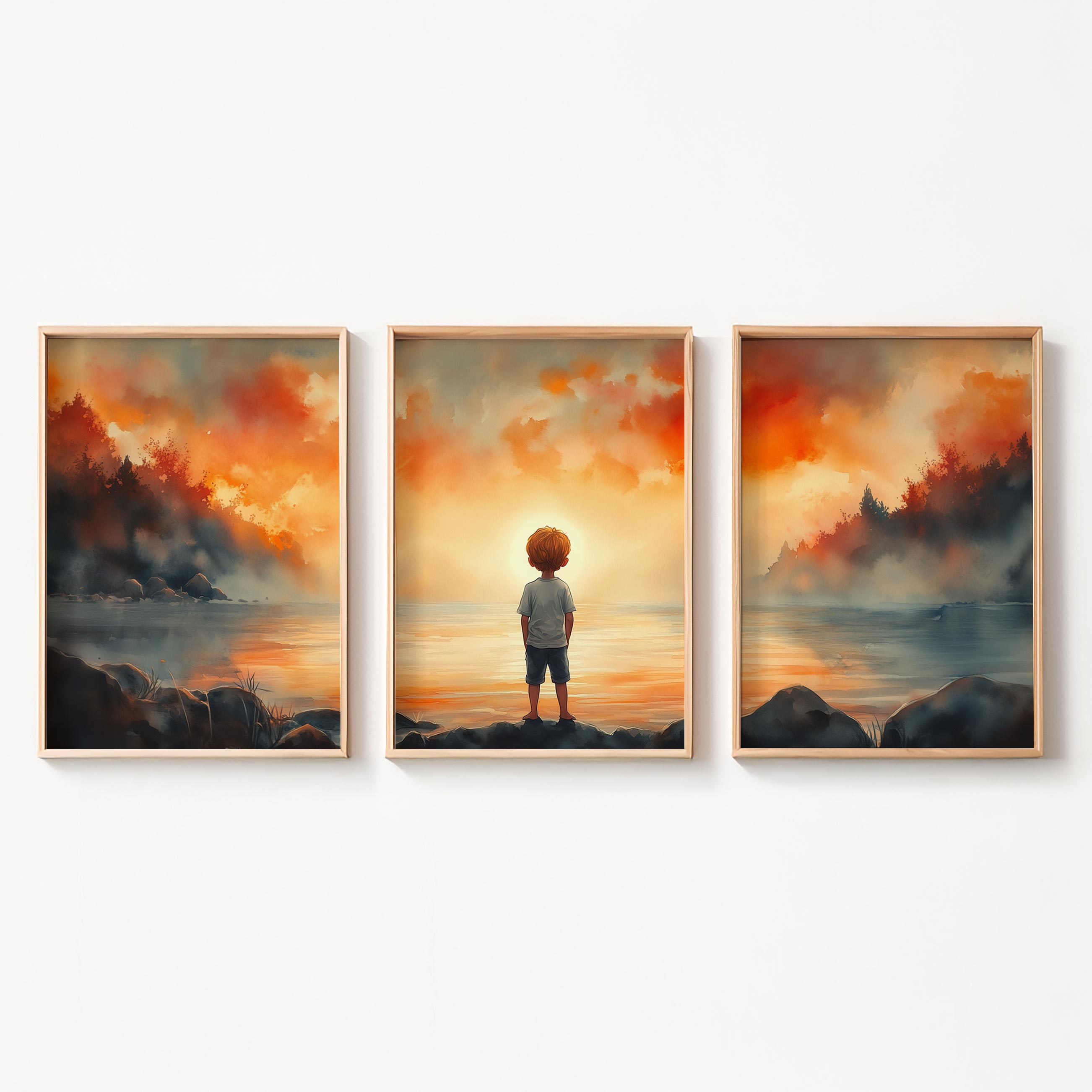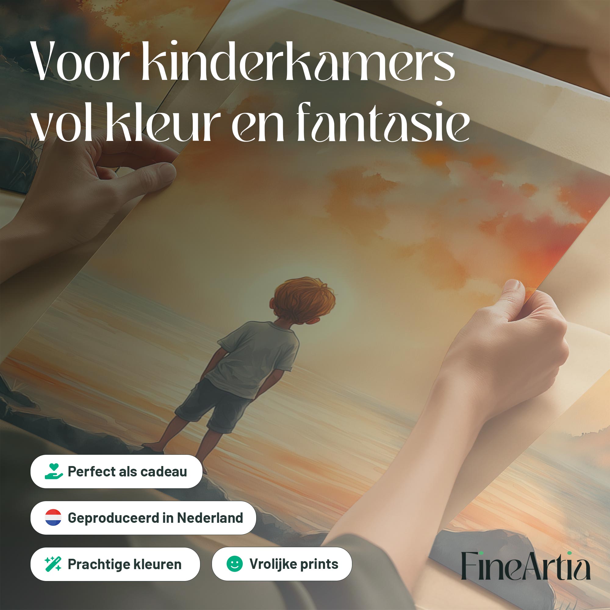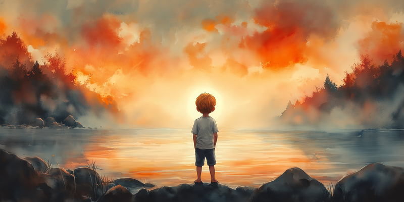 Dromerige jongen bij sprookjesachtig waterlandschap