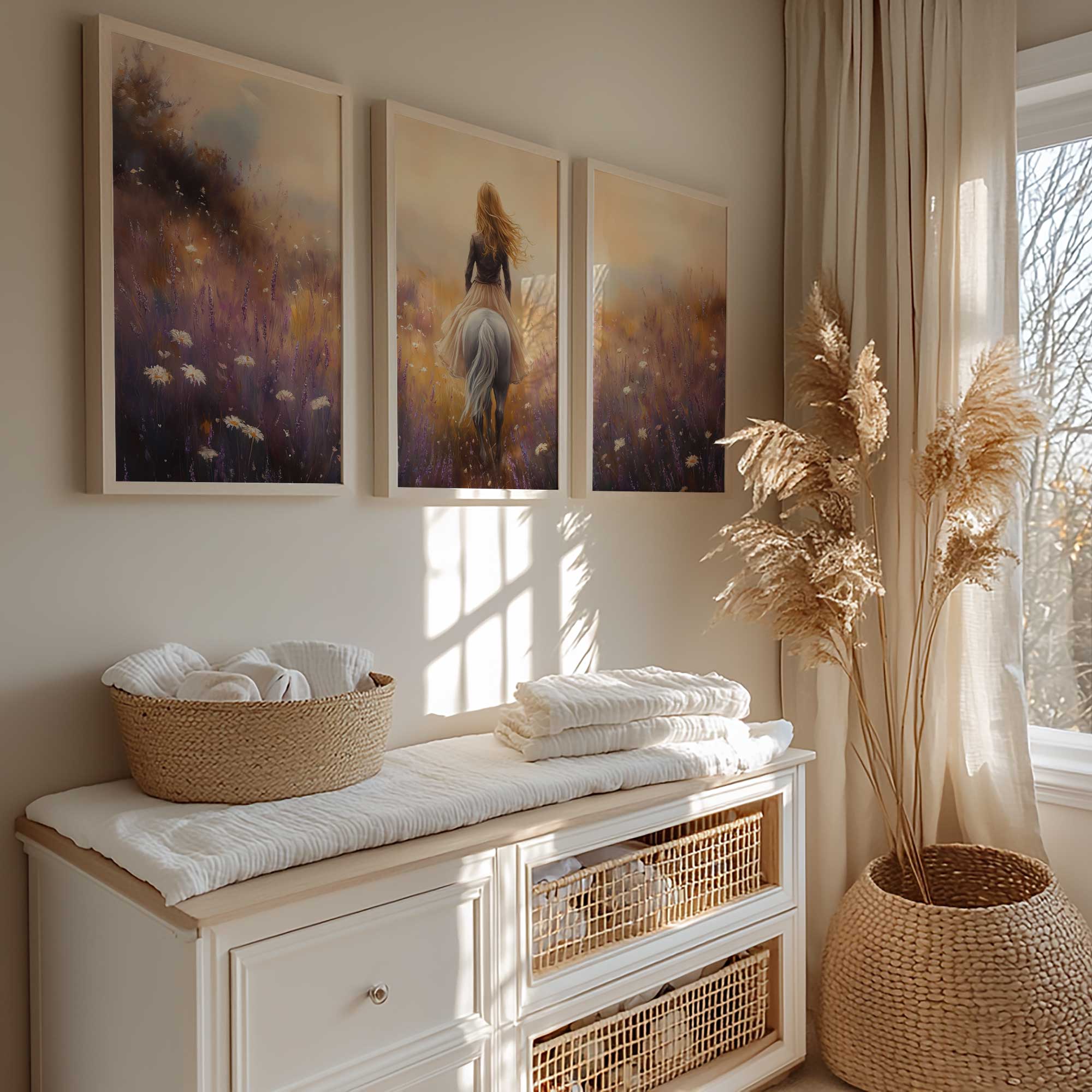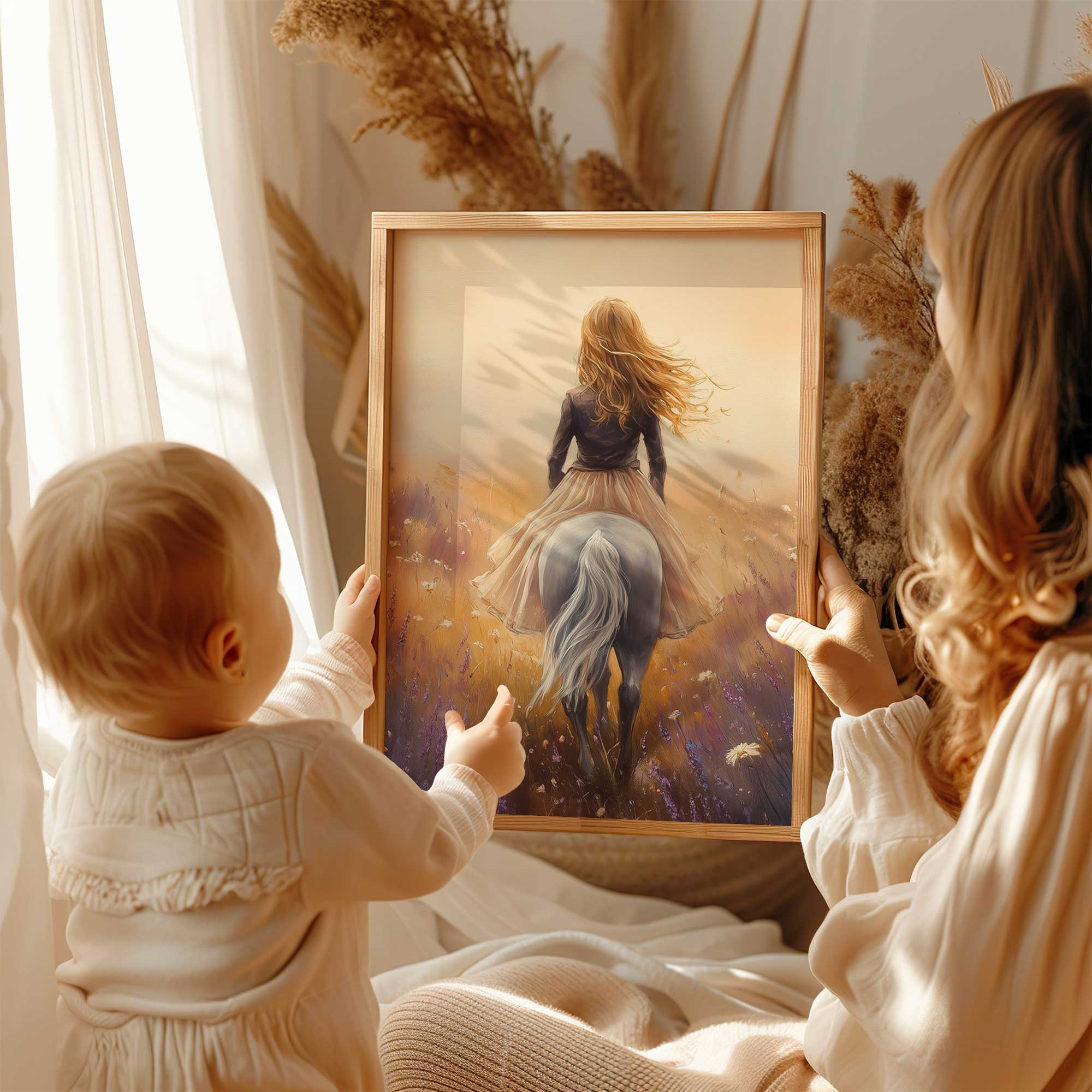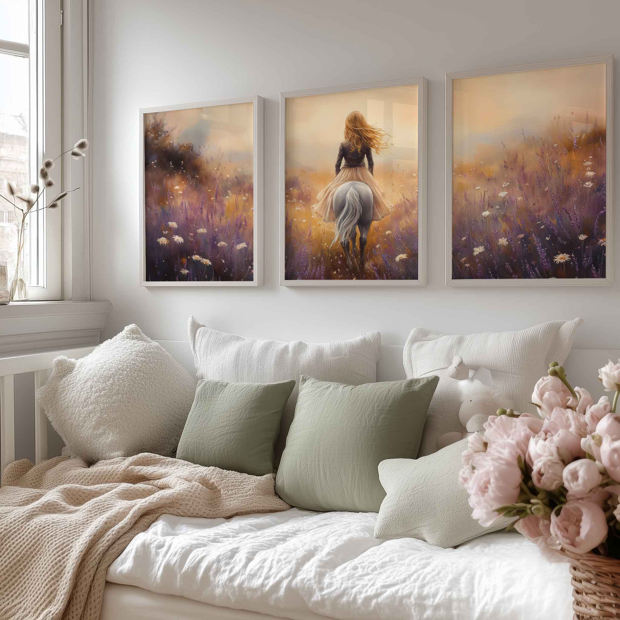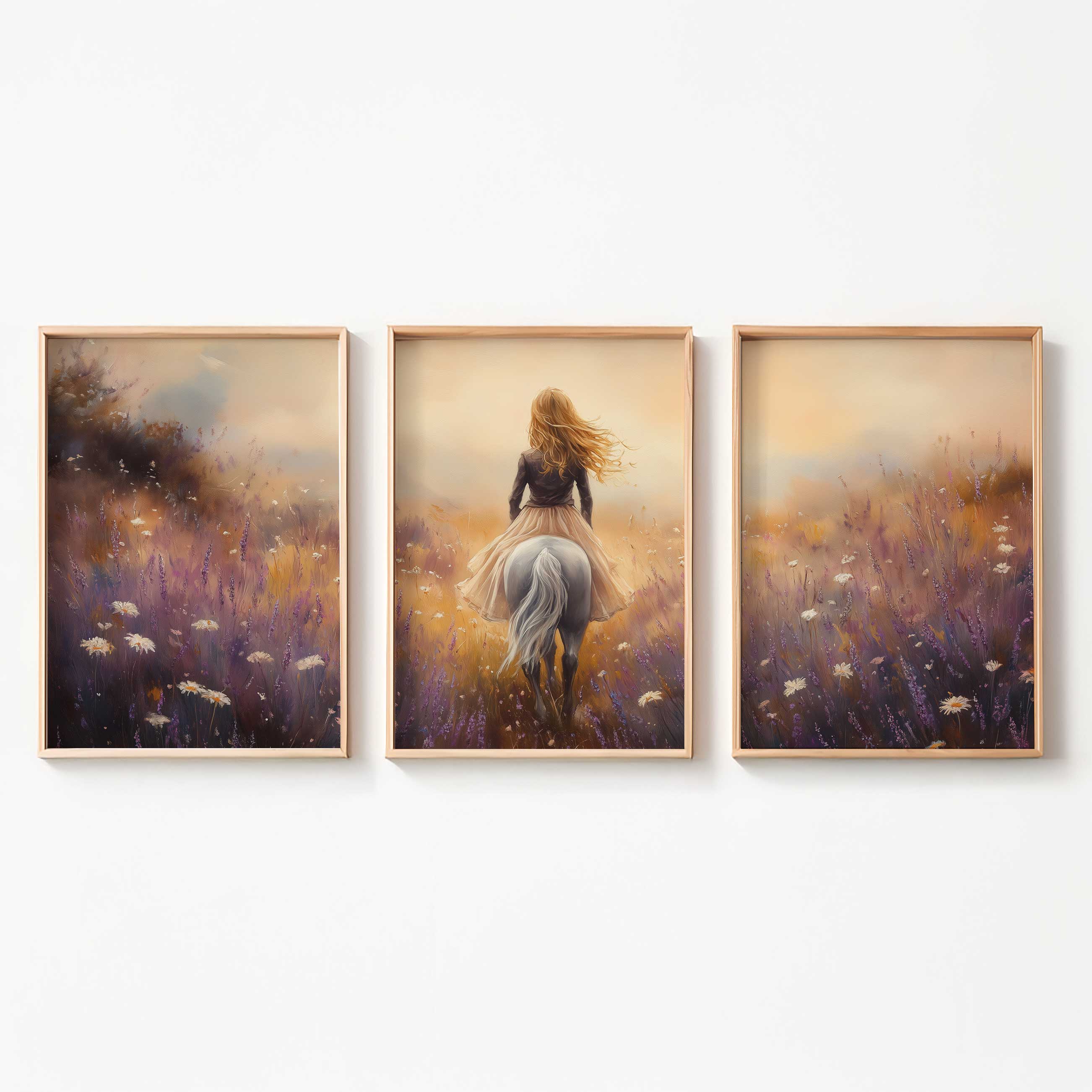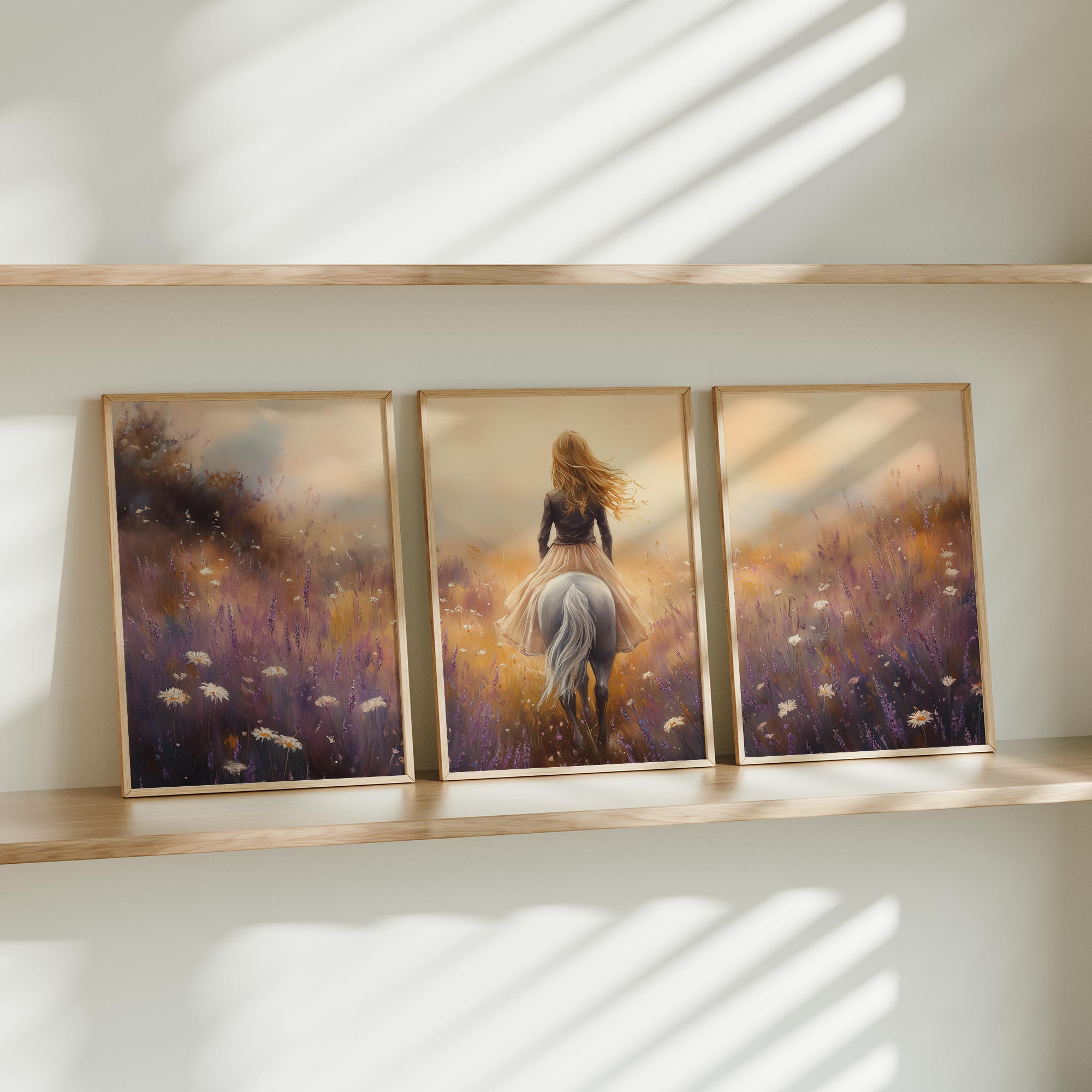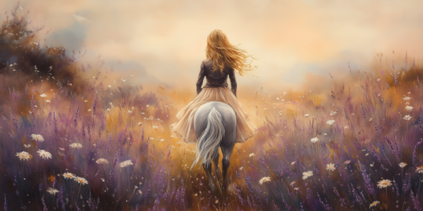 Elegante Dame te Paard in Bloeiend Paars Landschap