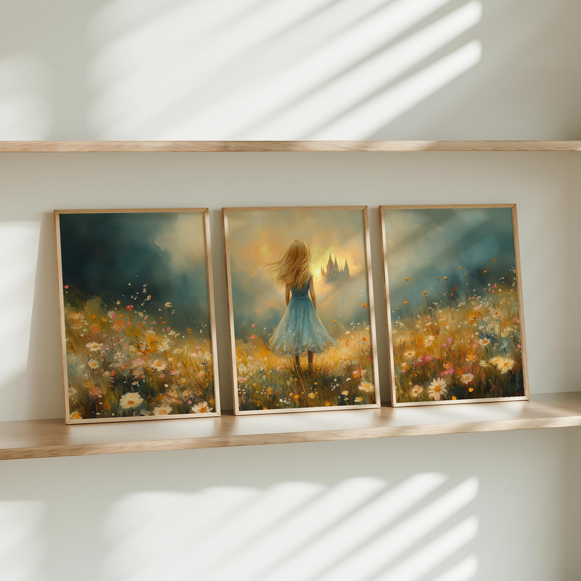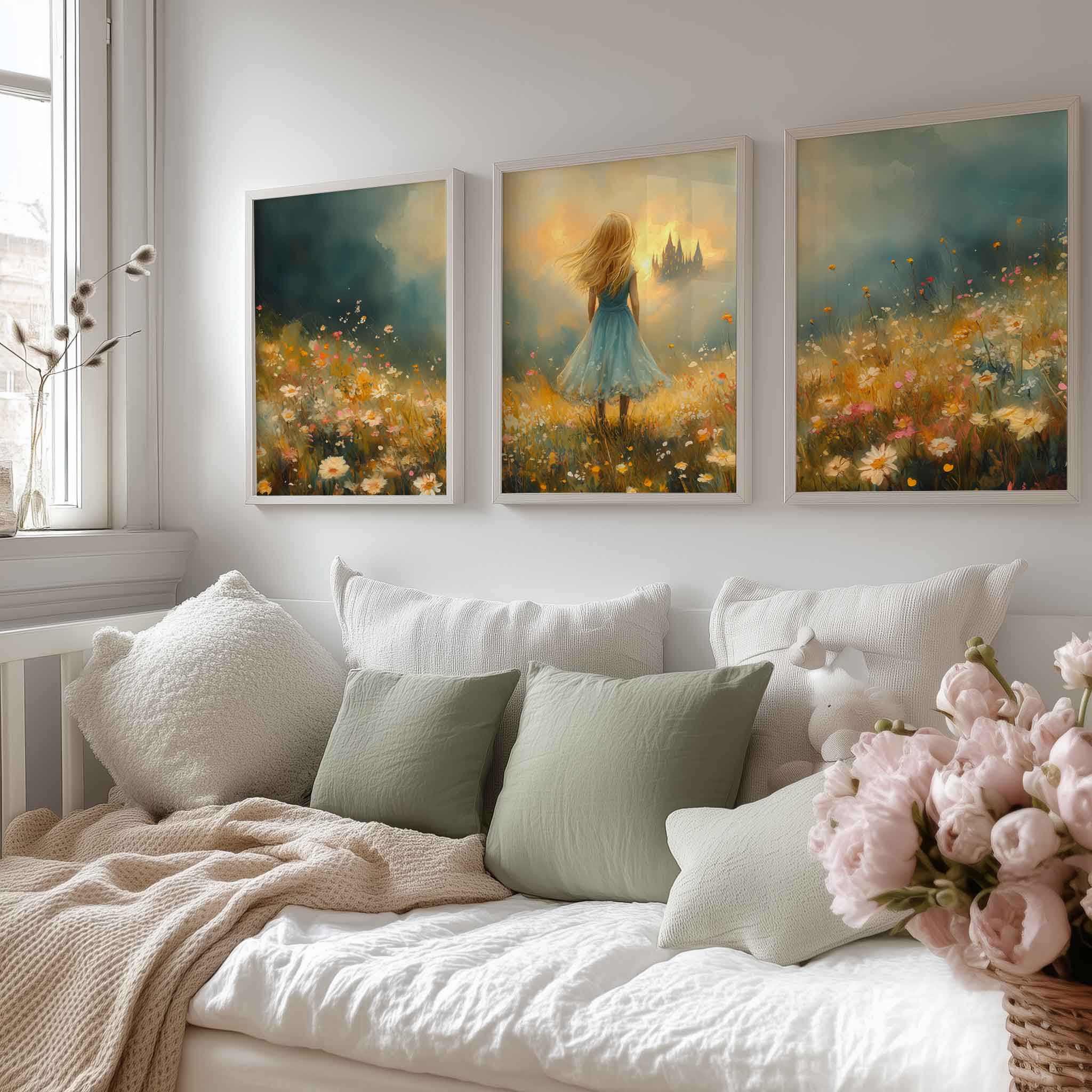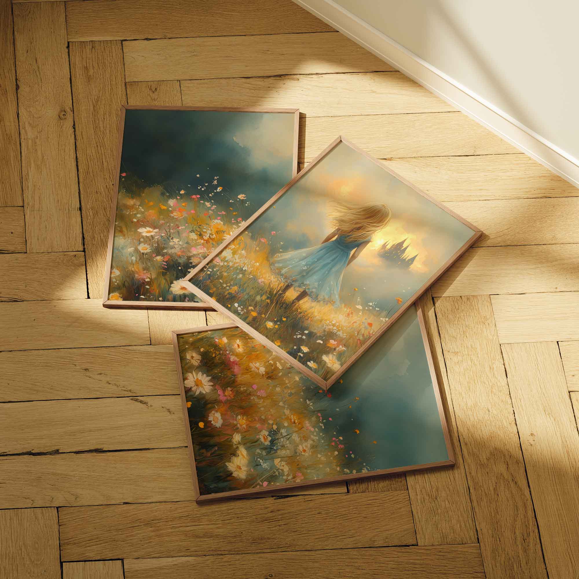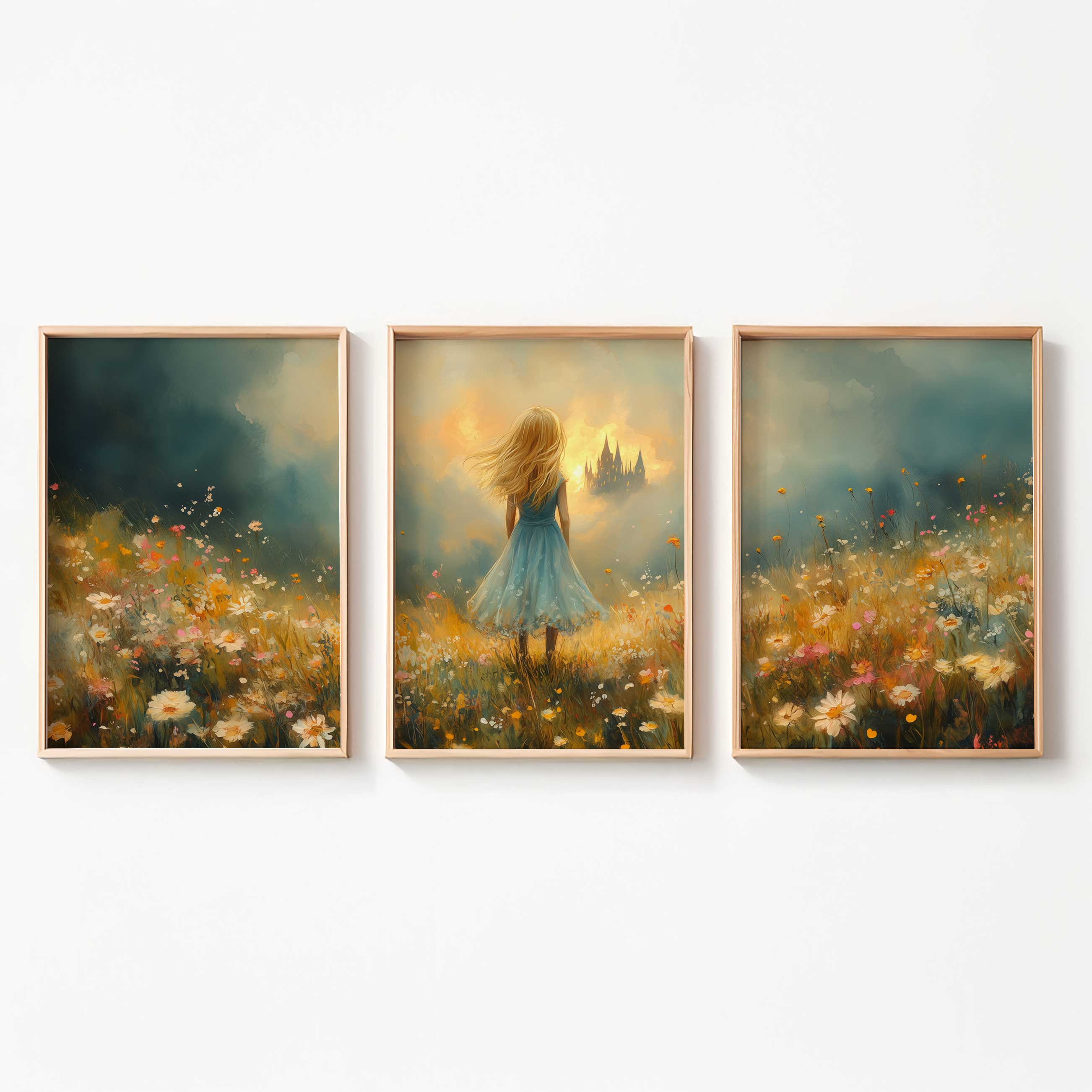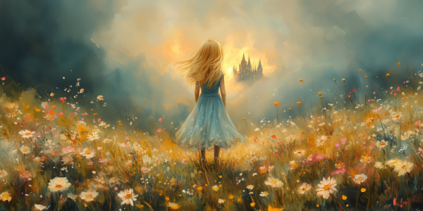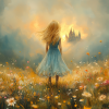 Feeëriek Meisje in Bloeiend Bloemenveld met Kasteel