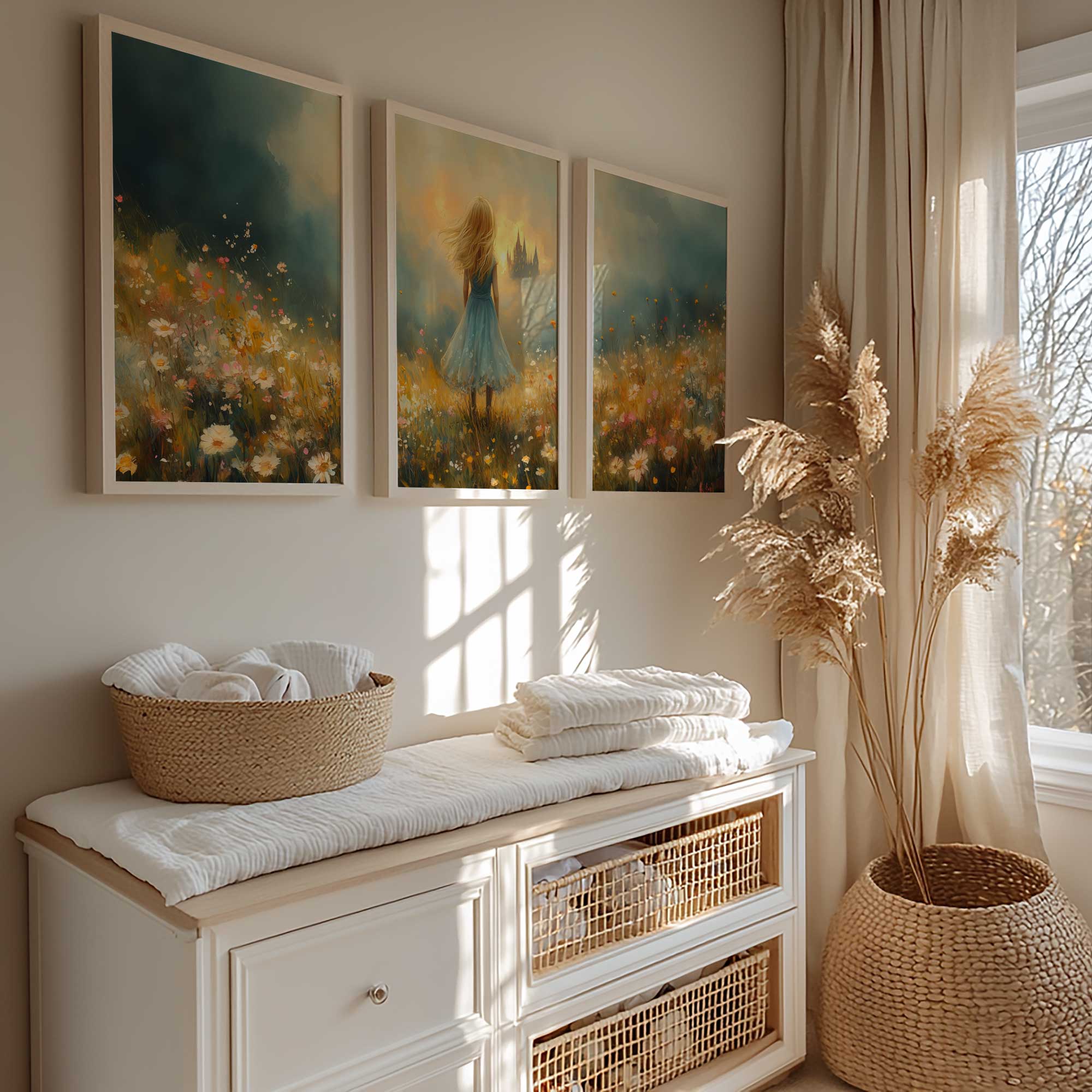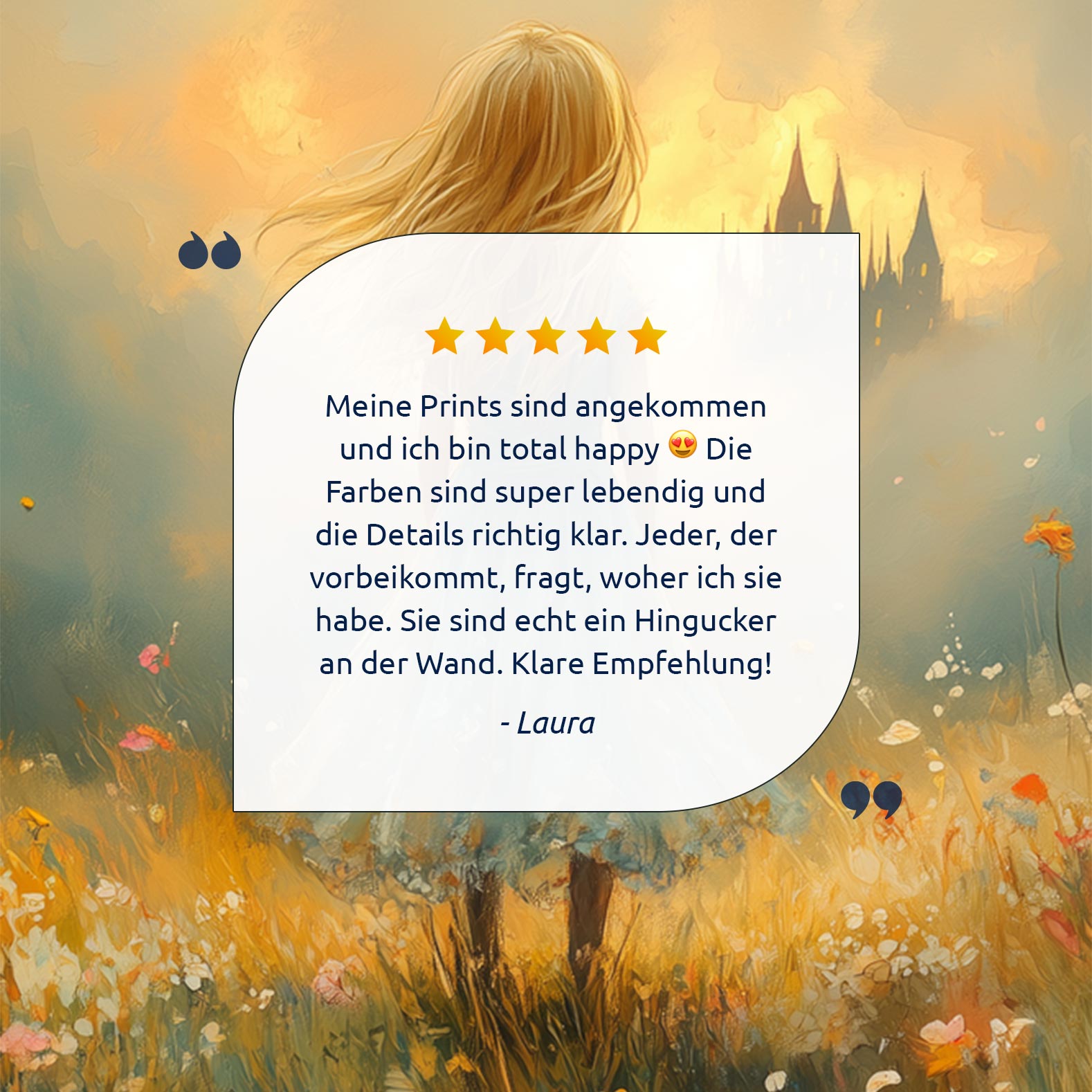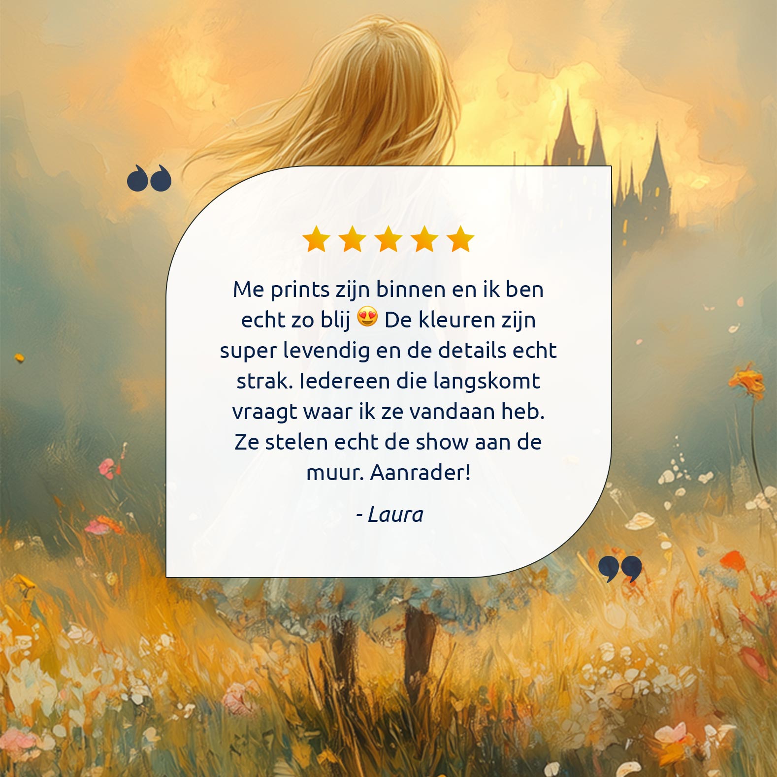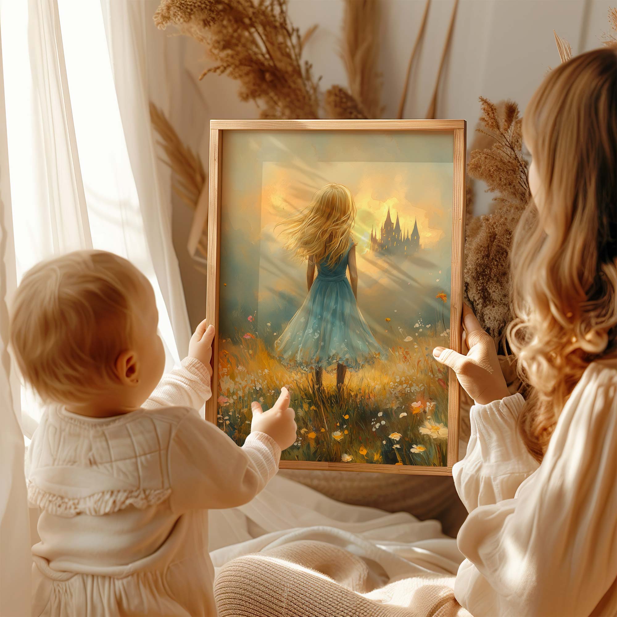 Feeëriek Meisje in Bloeiend Bloemenveld met Kasteel