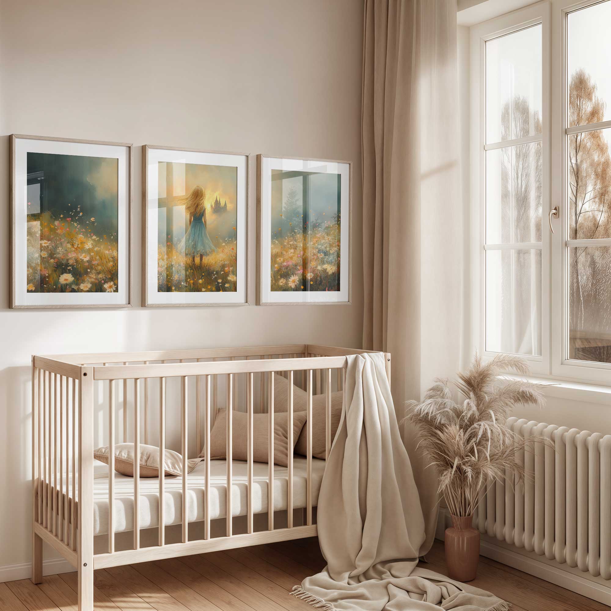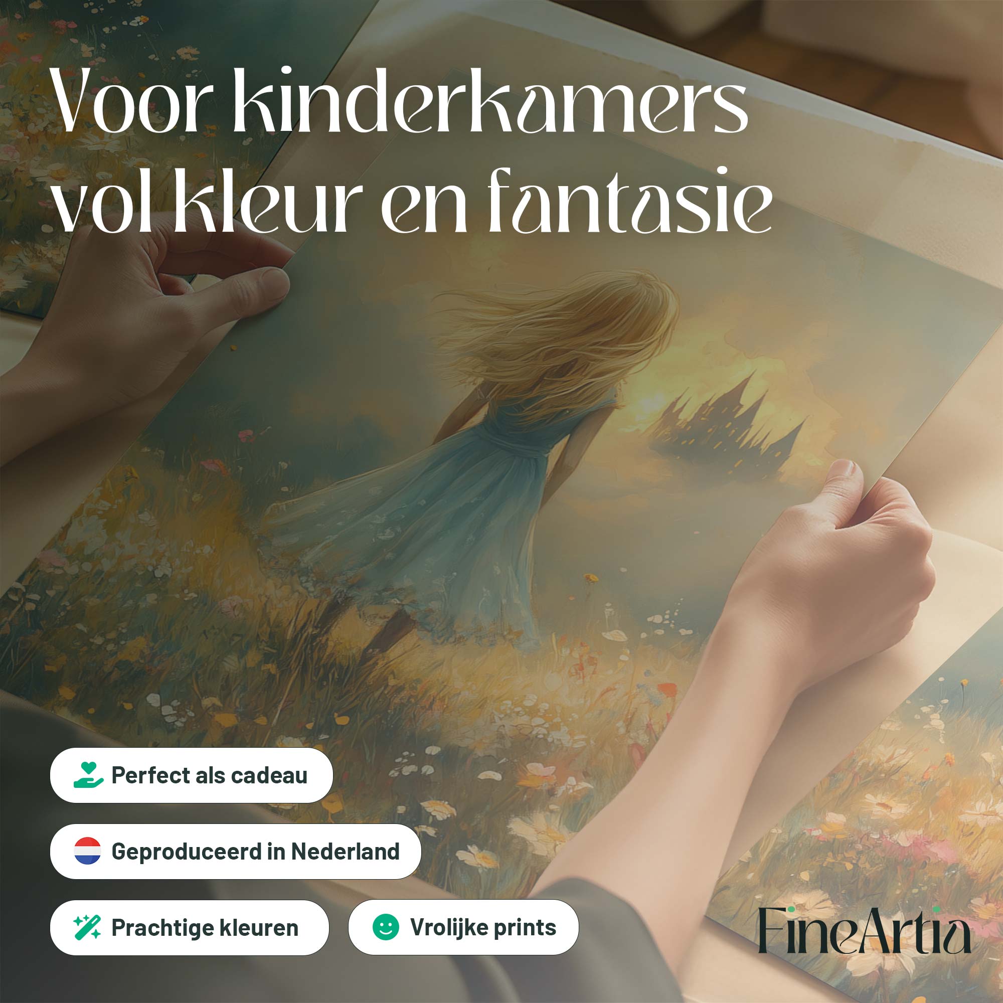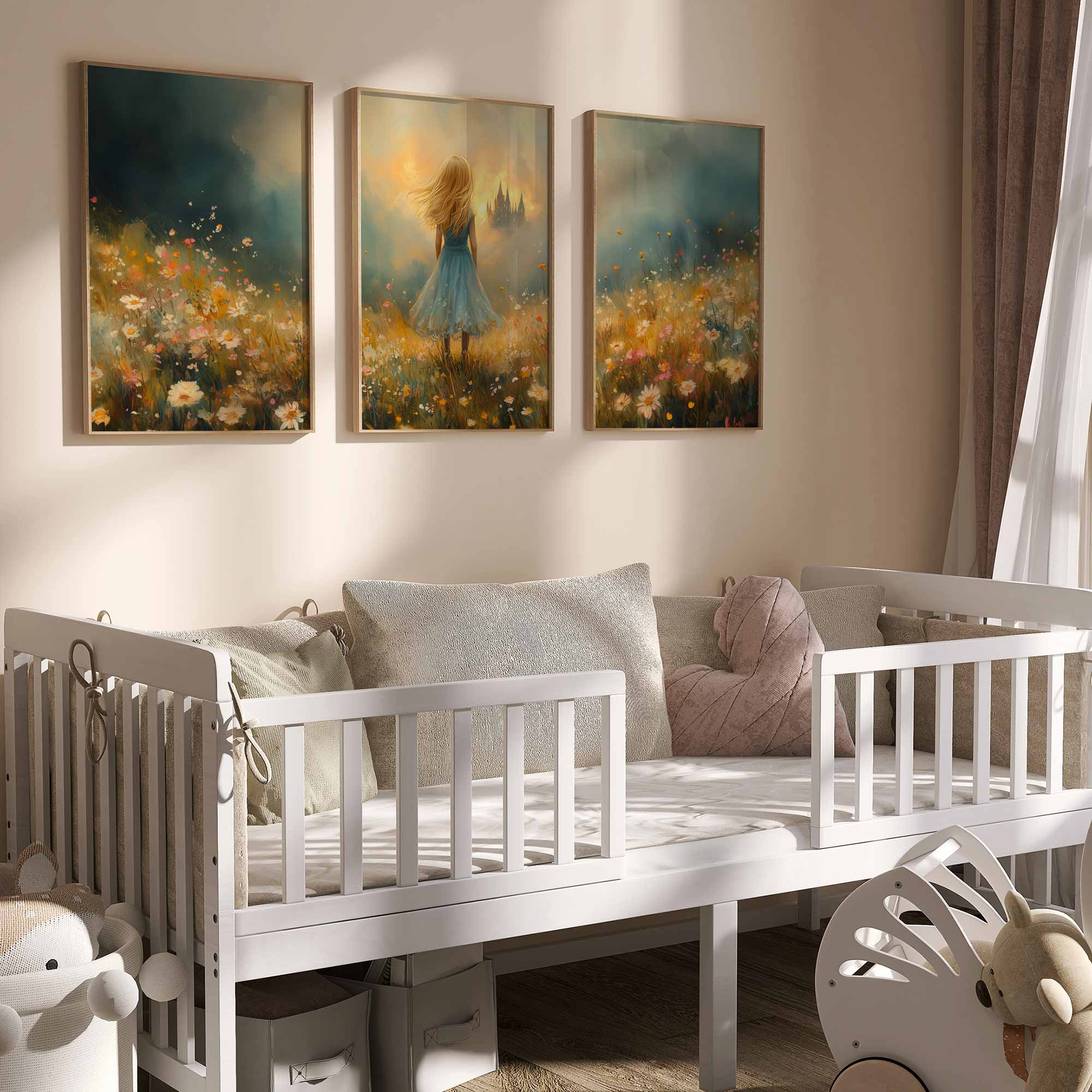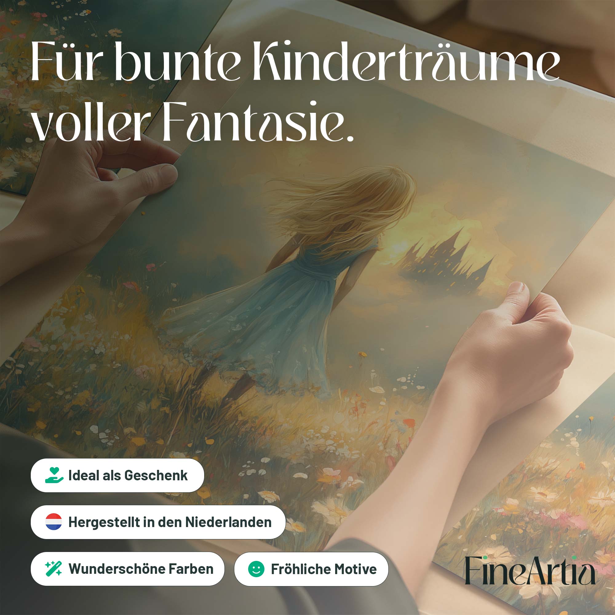 Feeëriek Meisje in Bloeiend Bloemenveld met Kasteel
