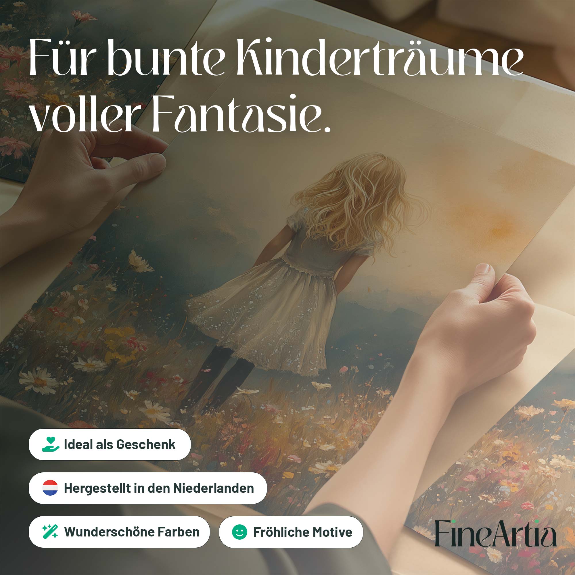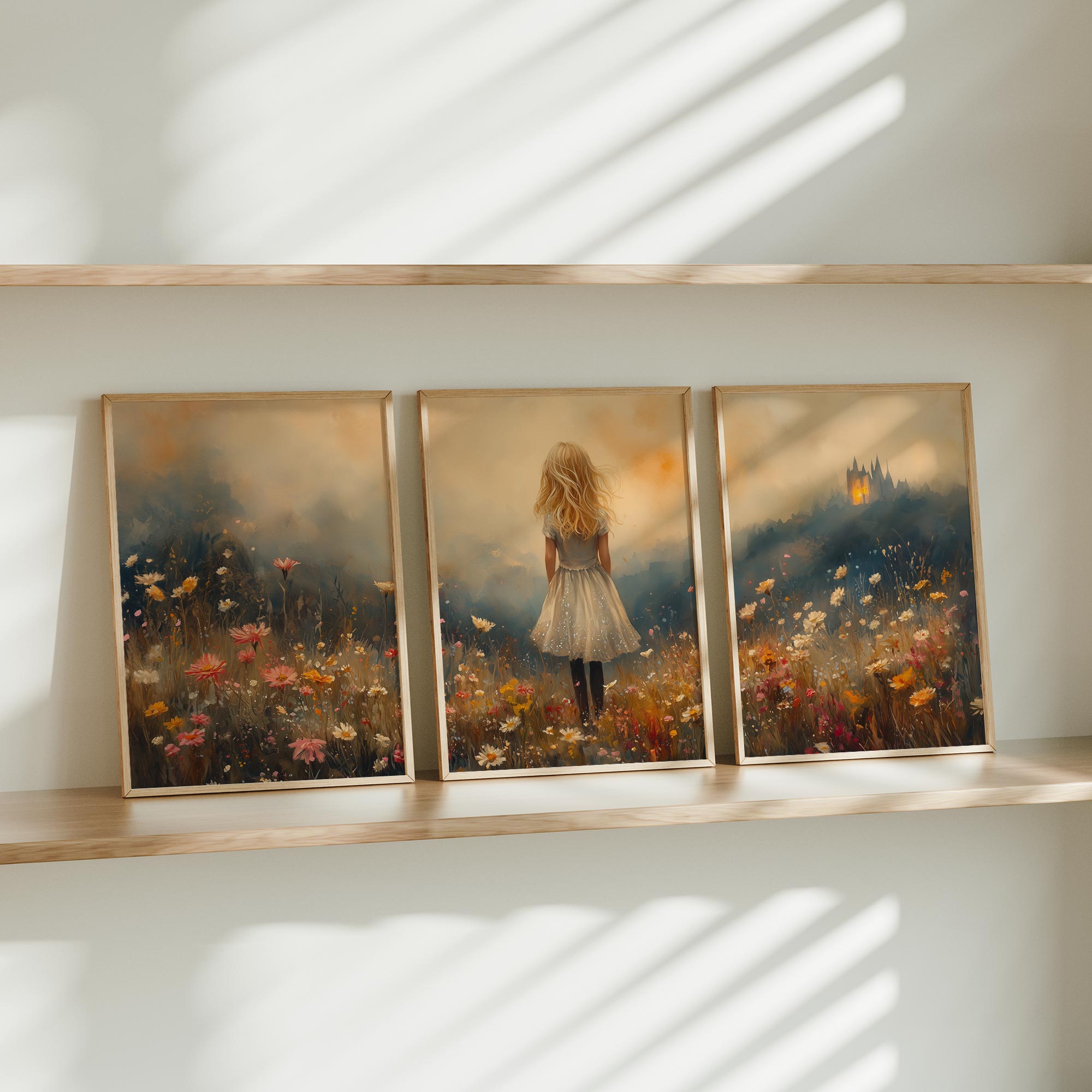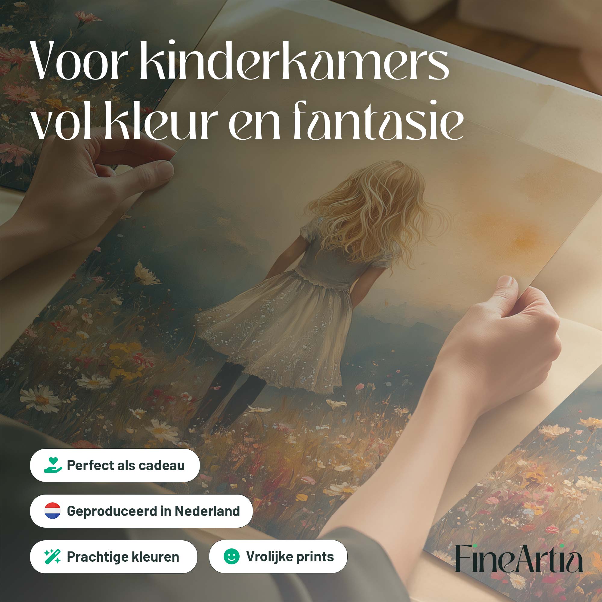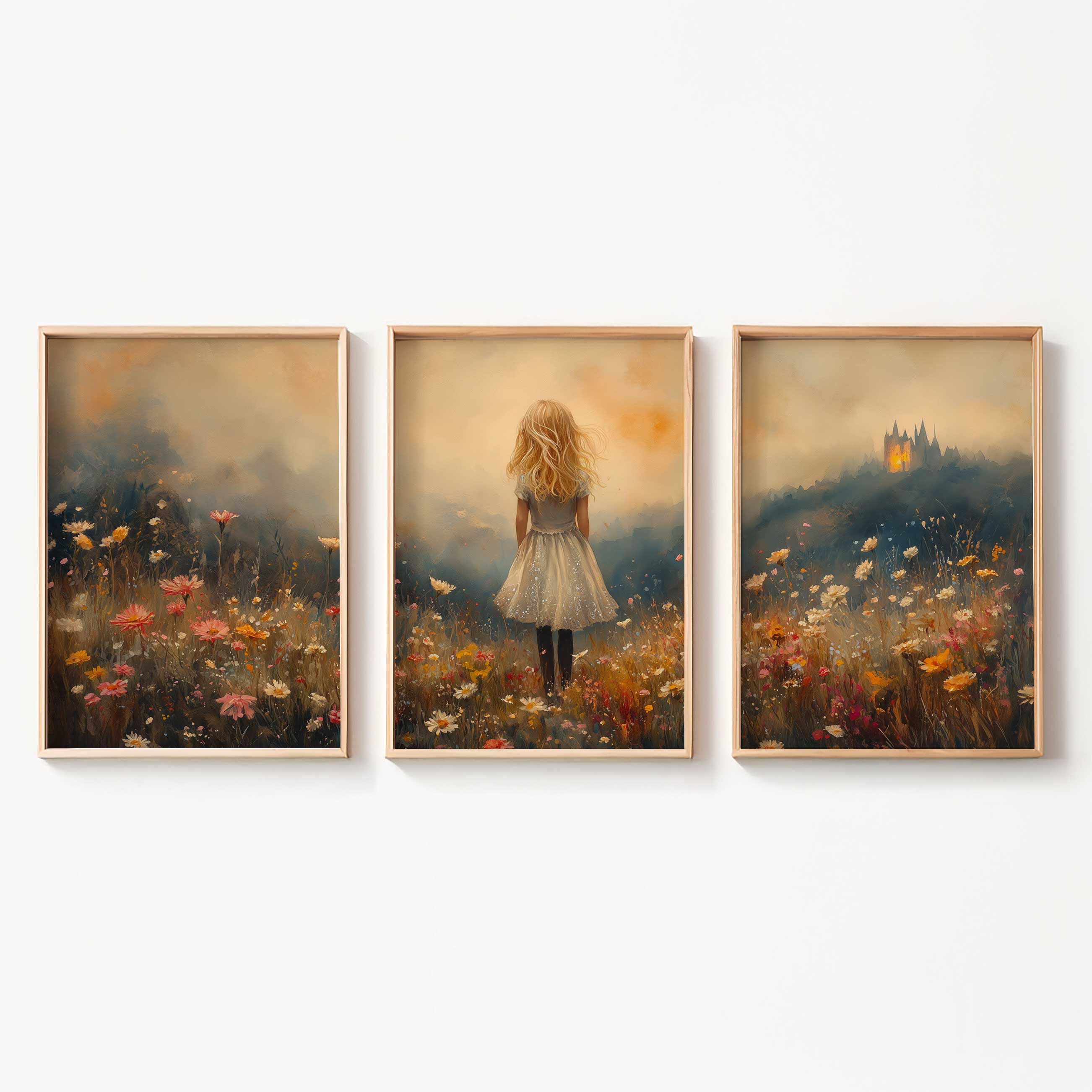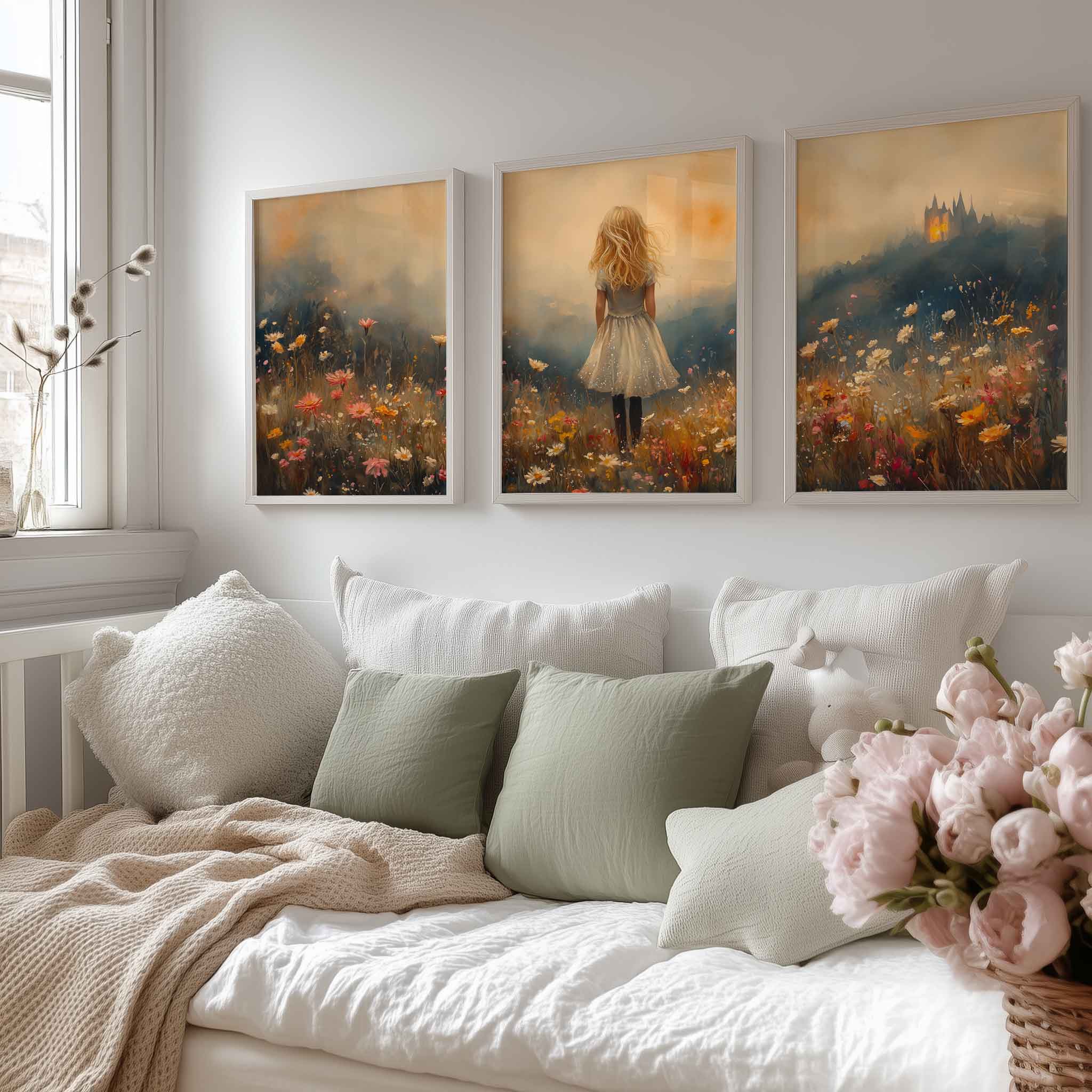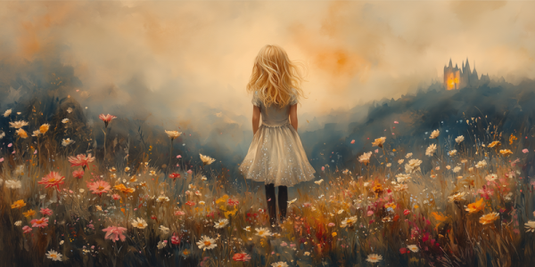 Feeëriek Meisje in Bloemenveld met Kasteel