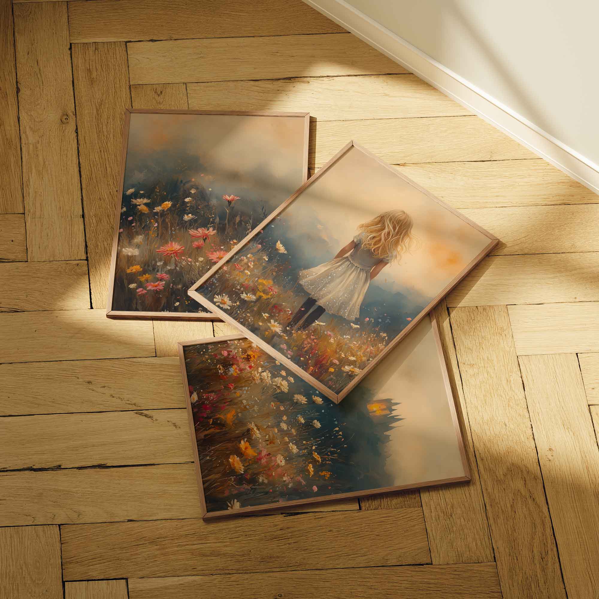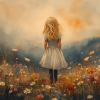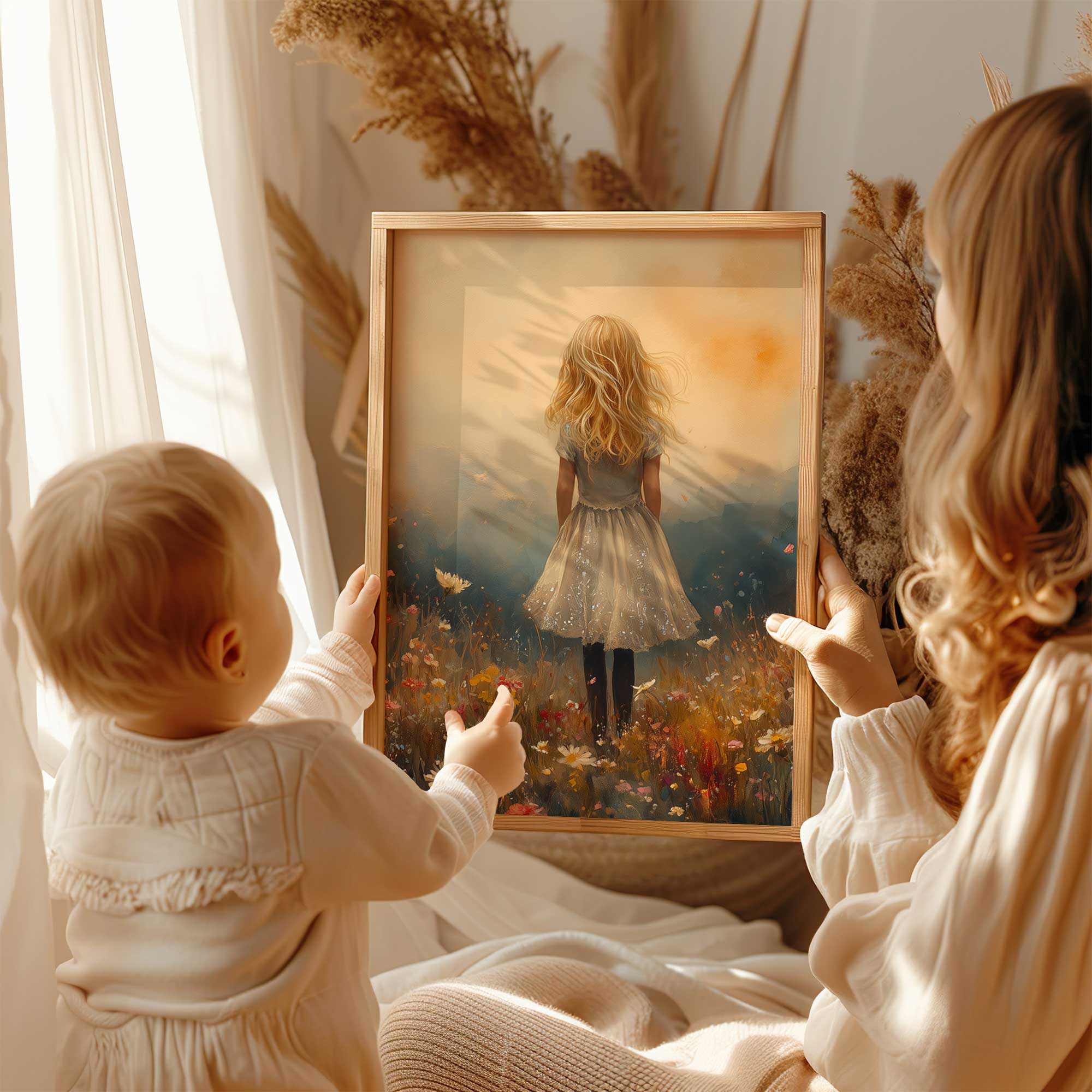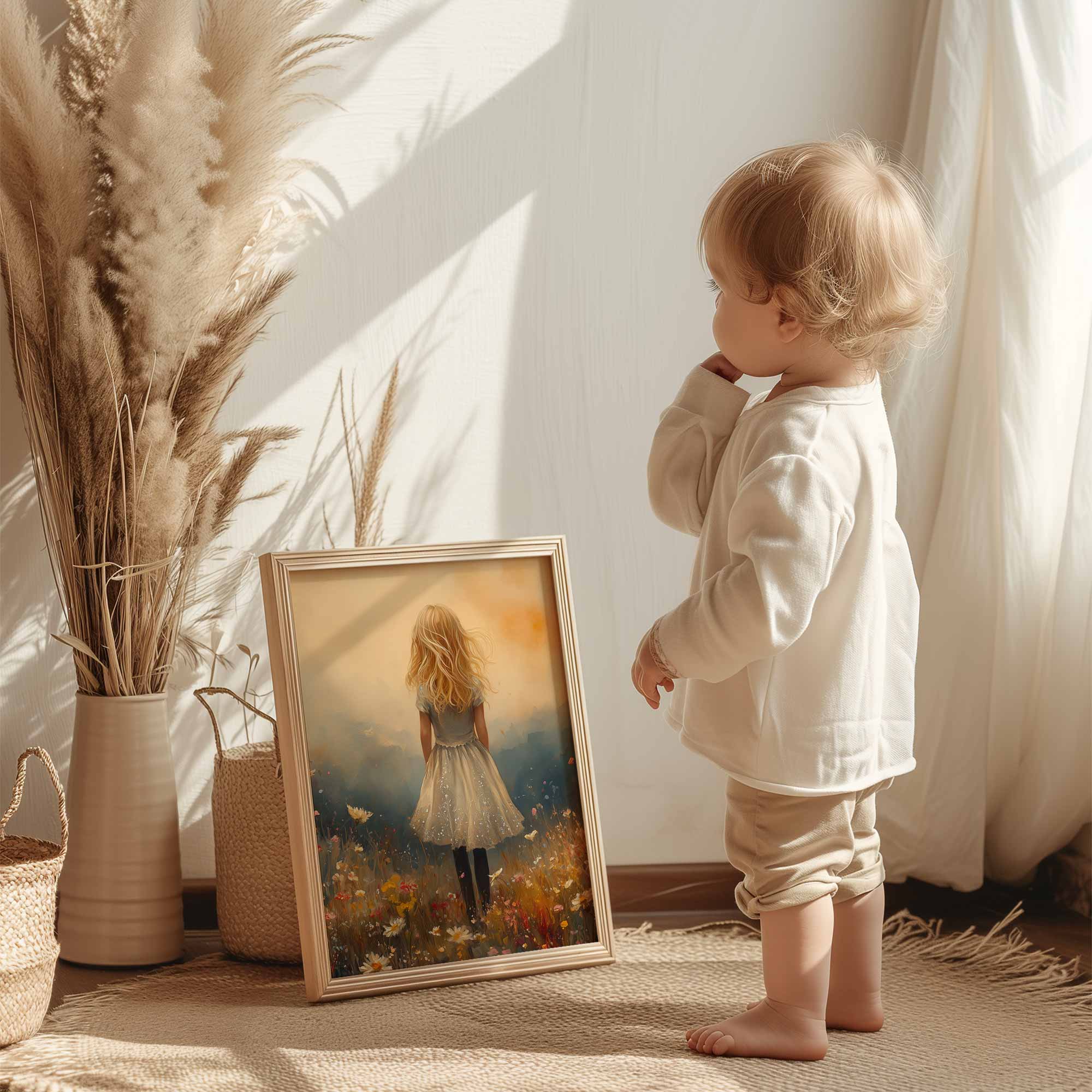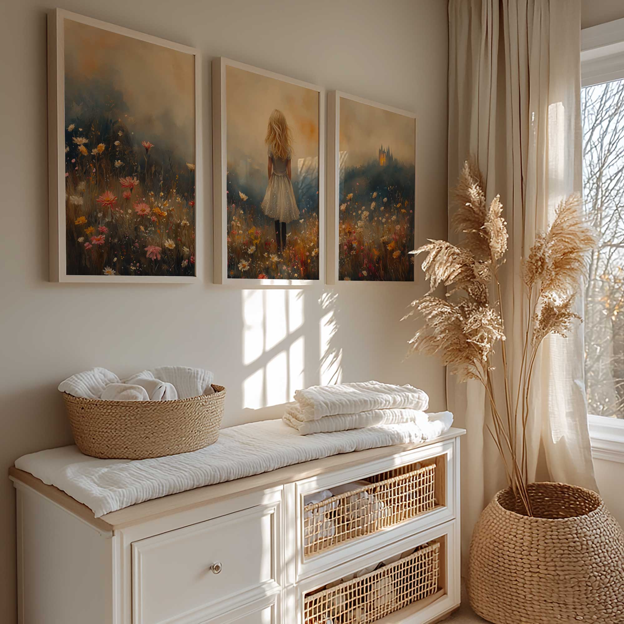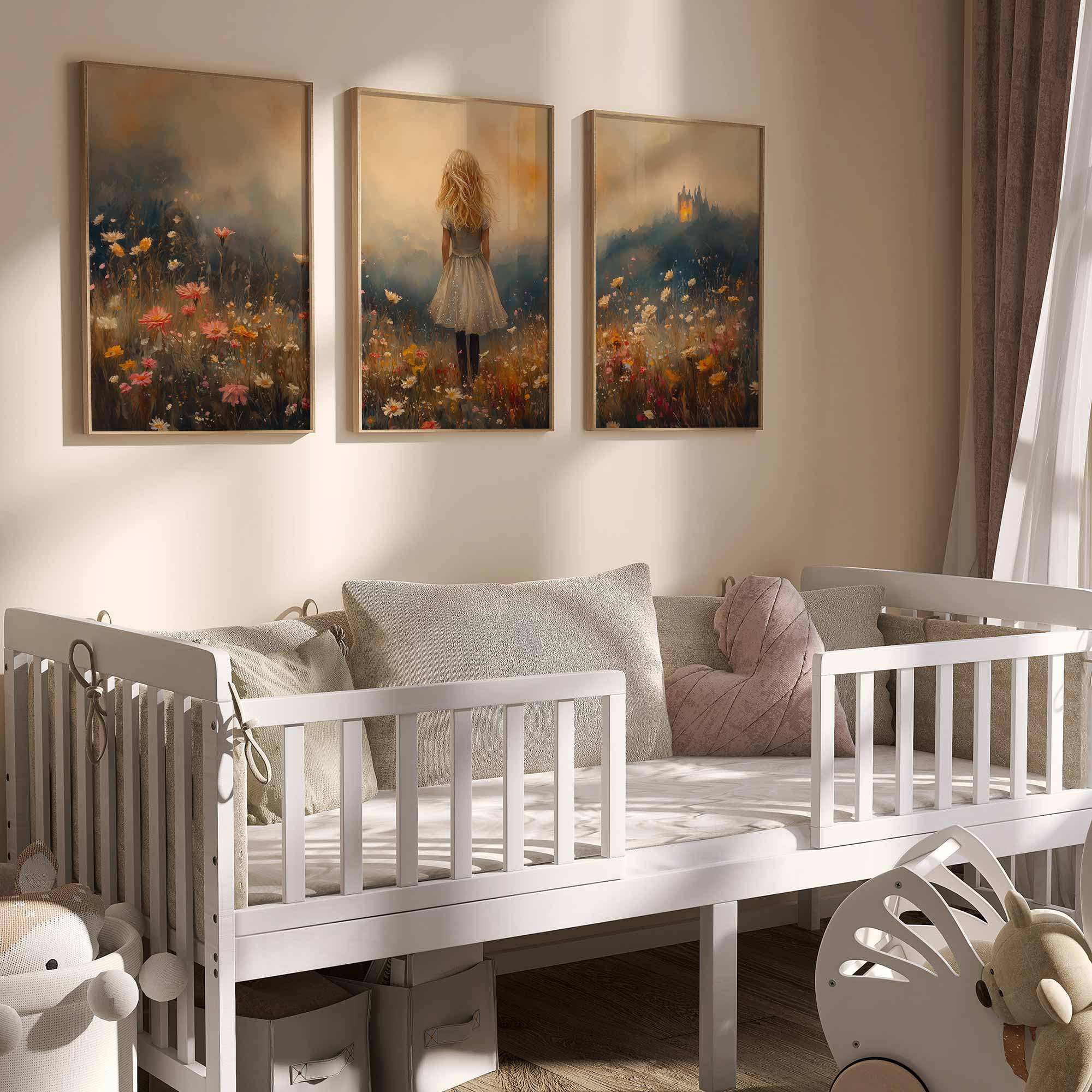 Feeëriek Meisje in Bloemenveld met Kasteel