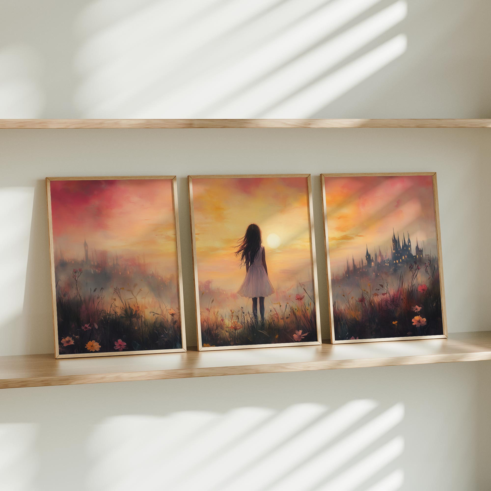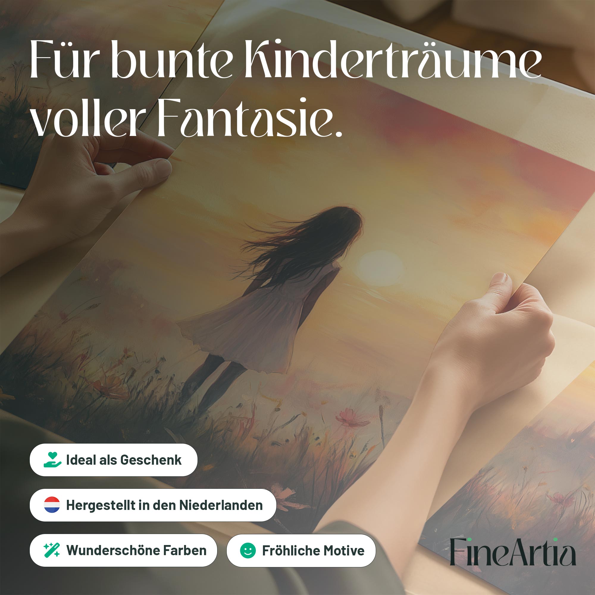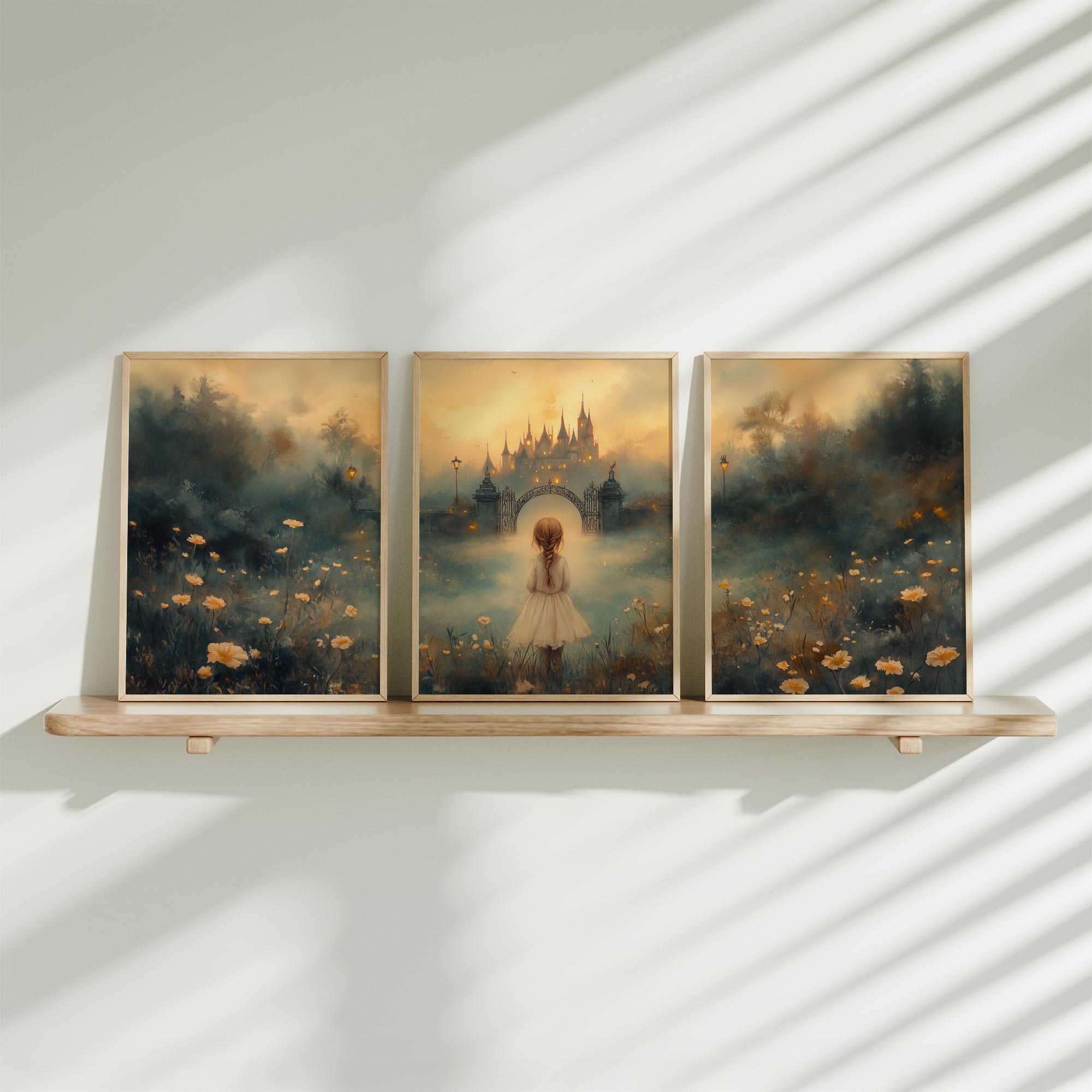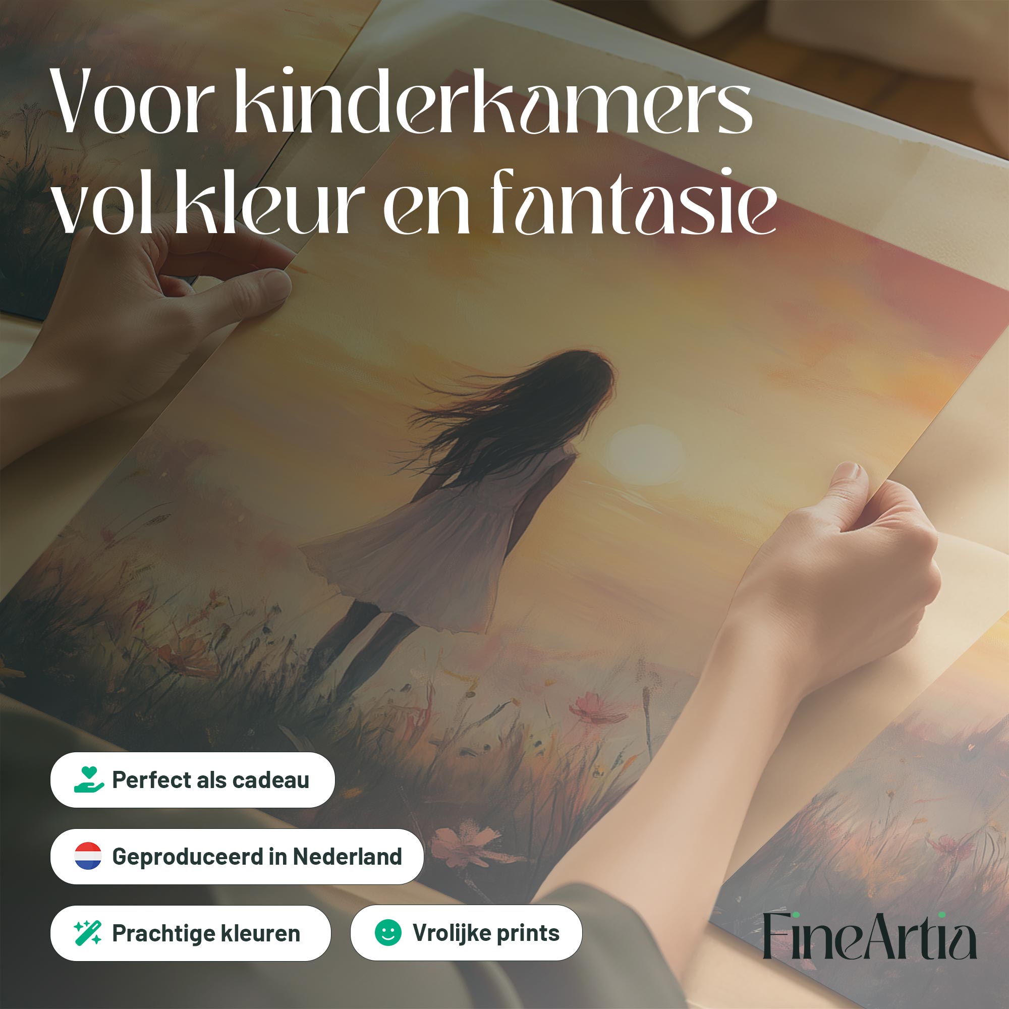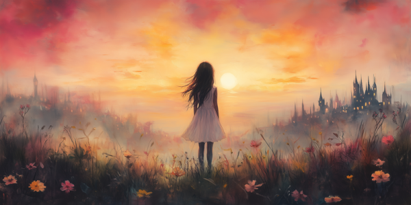 Feeëriek Meisje in Bloemenveld met Kasteel