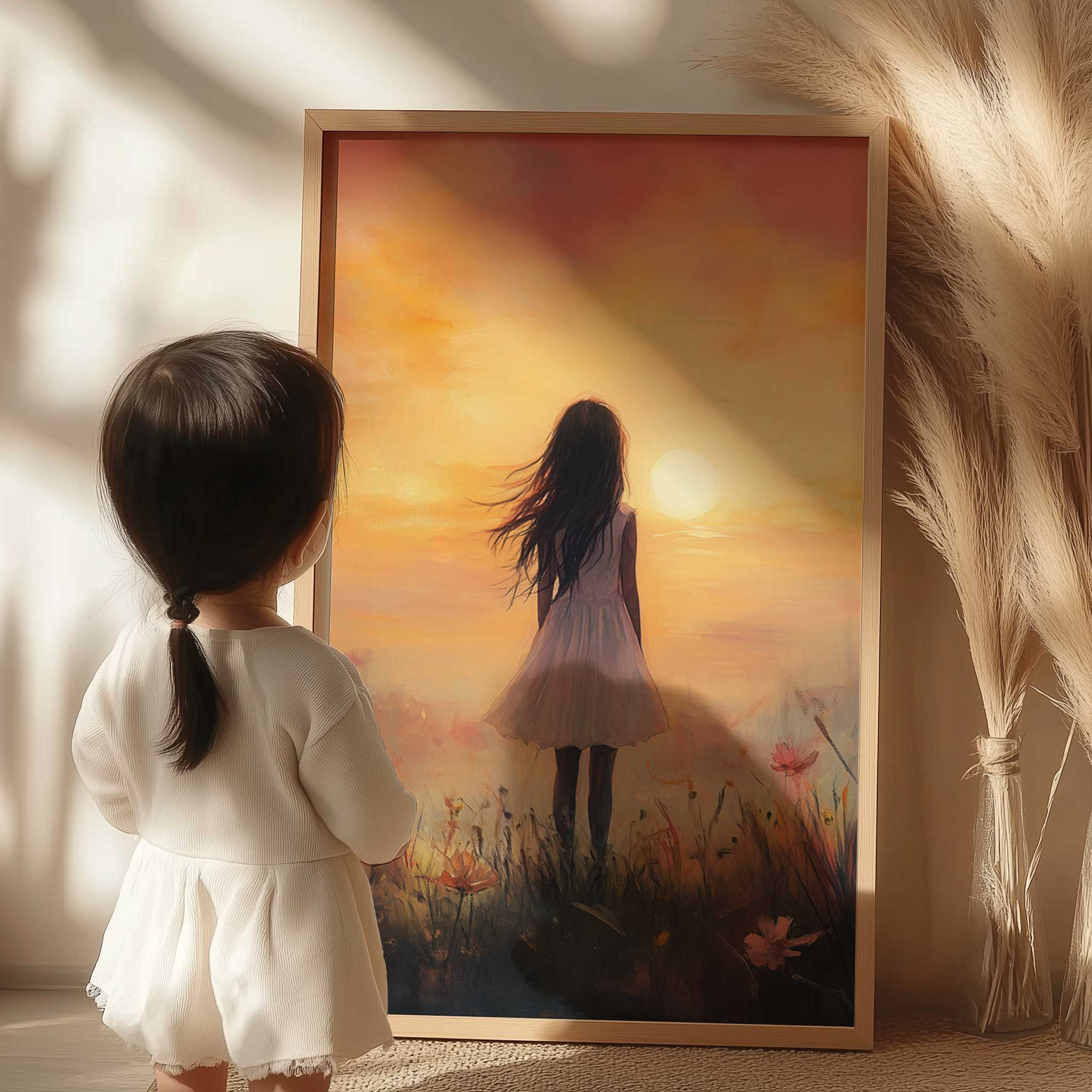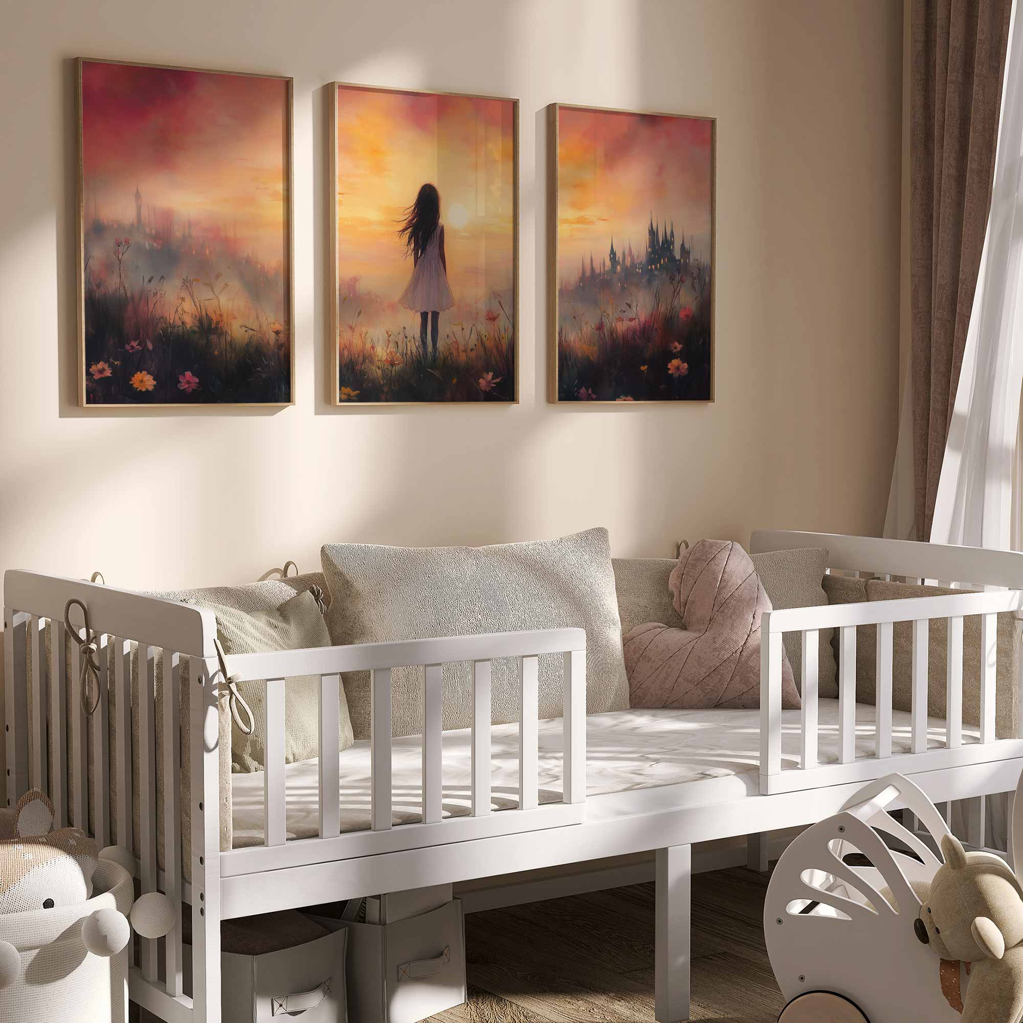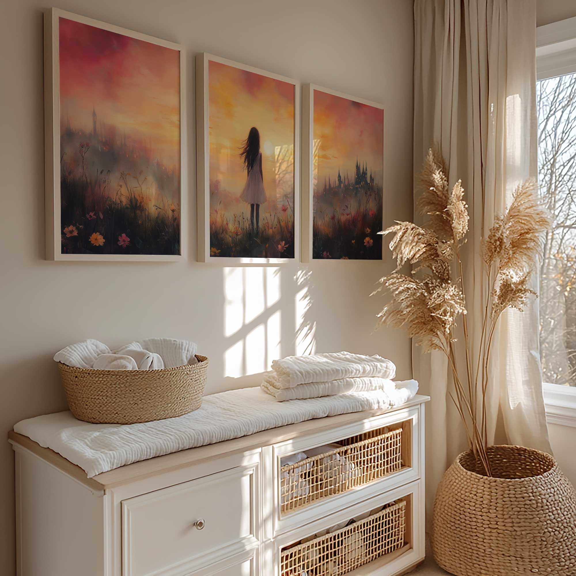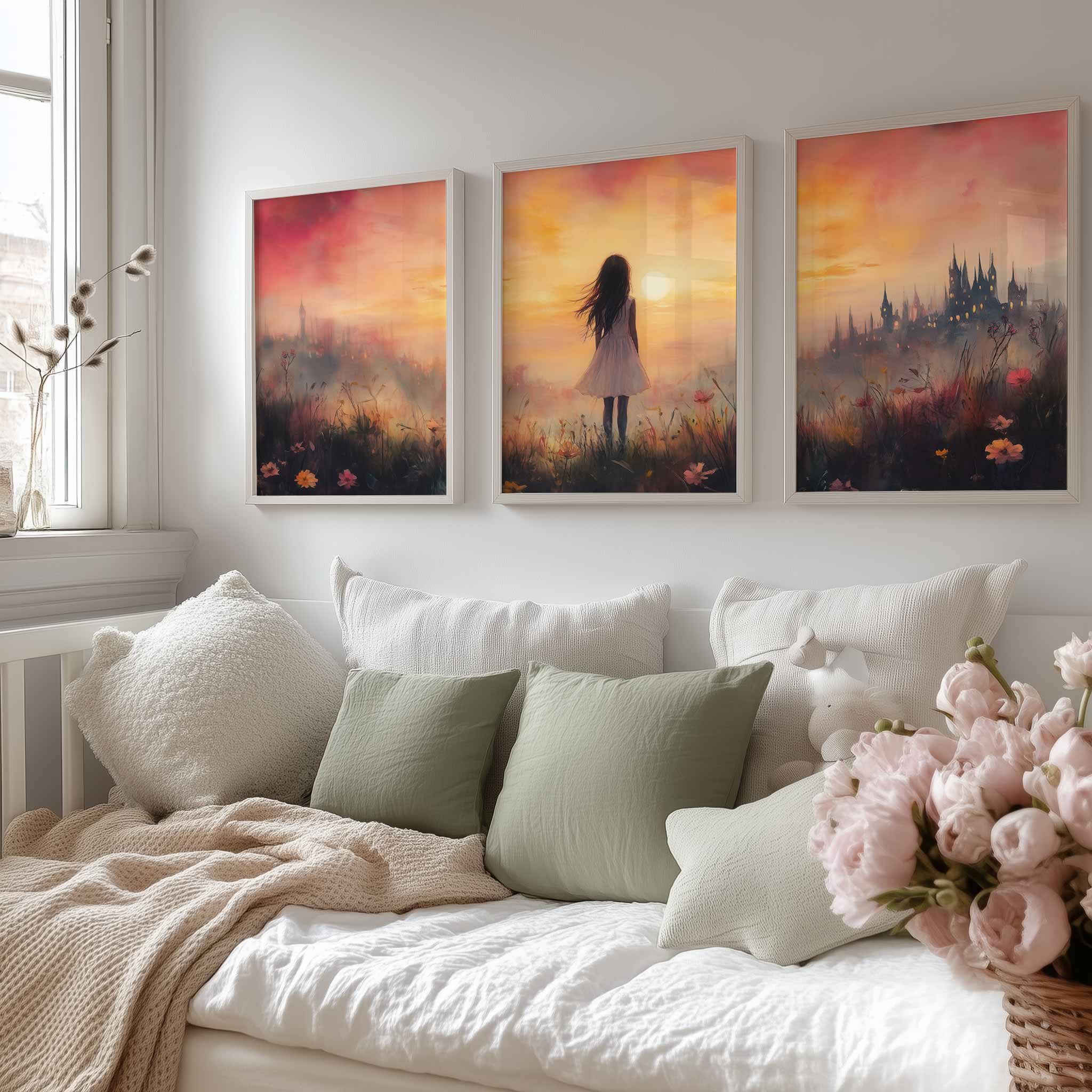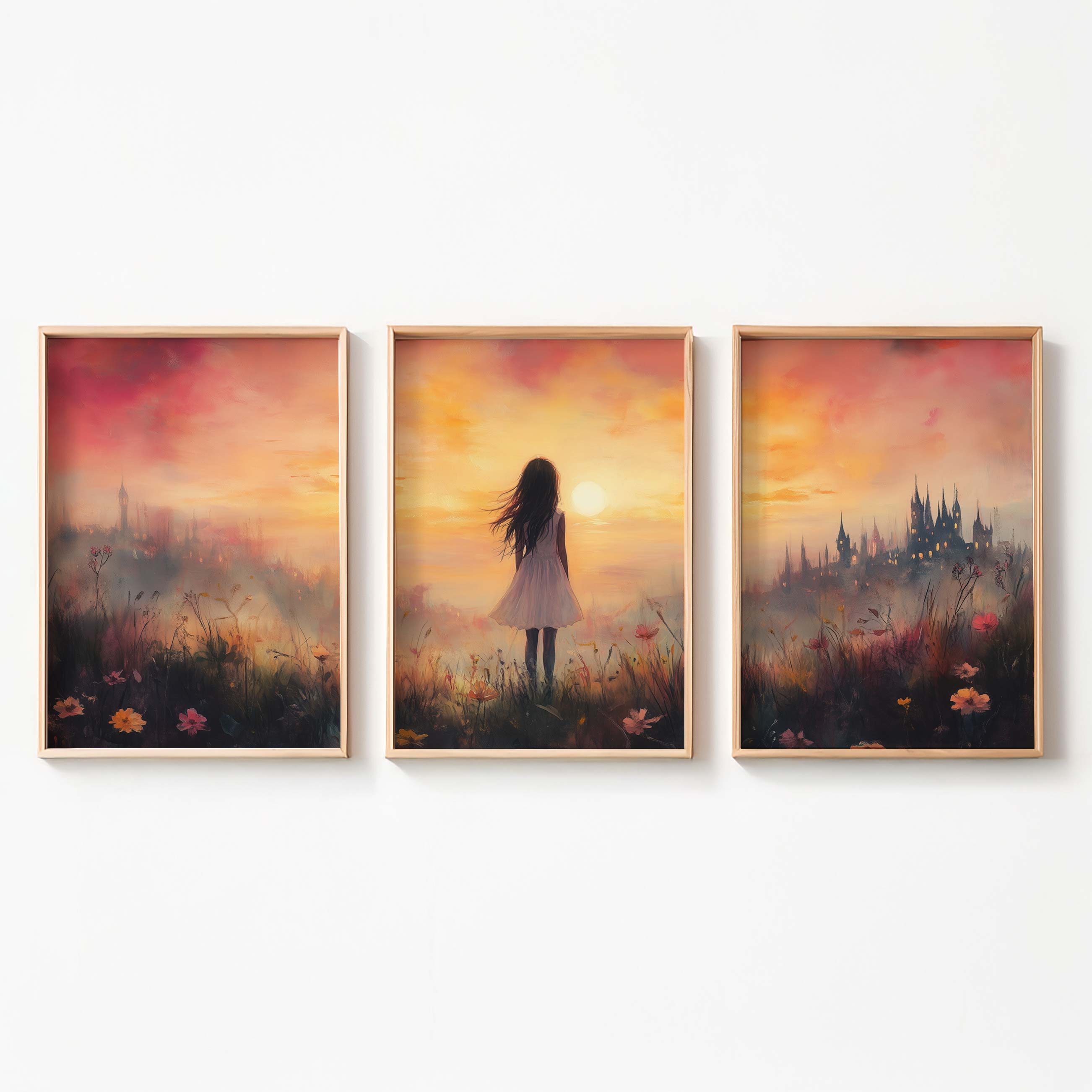 Feeëriek Meisje in Bloemenveld met Kasteel