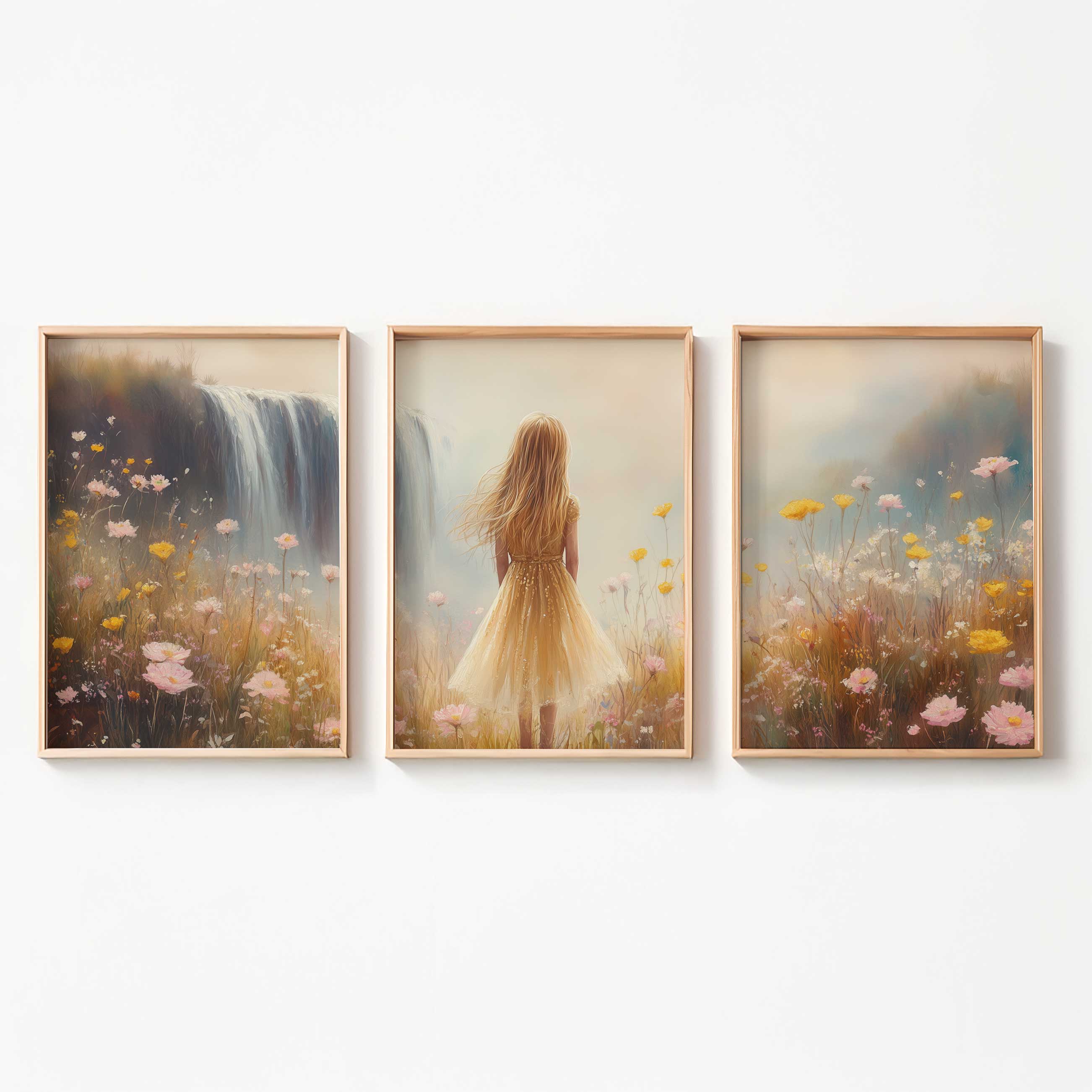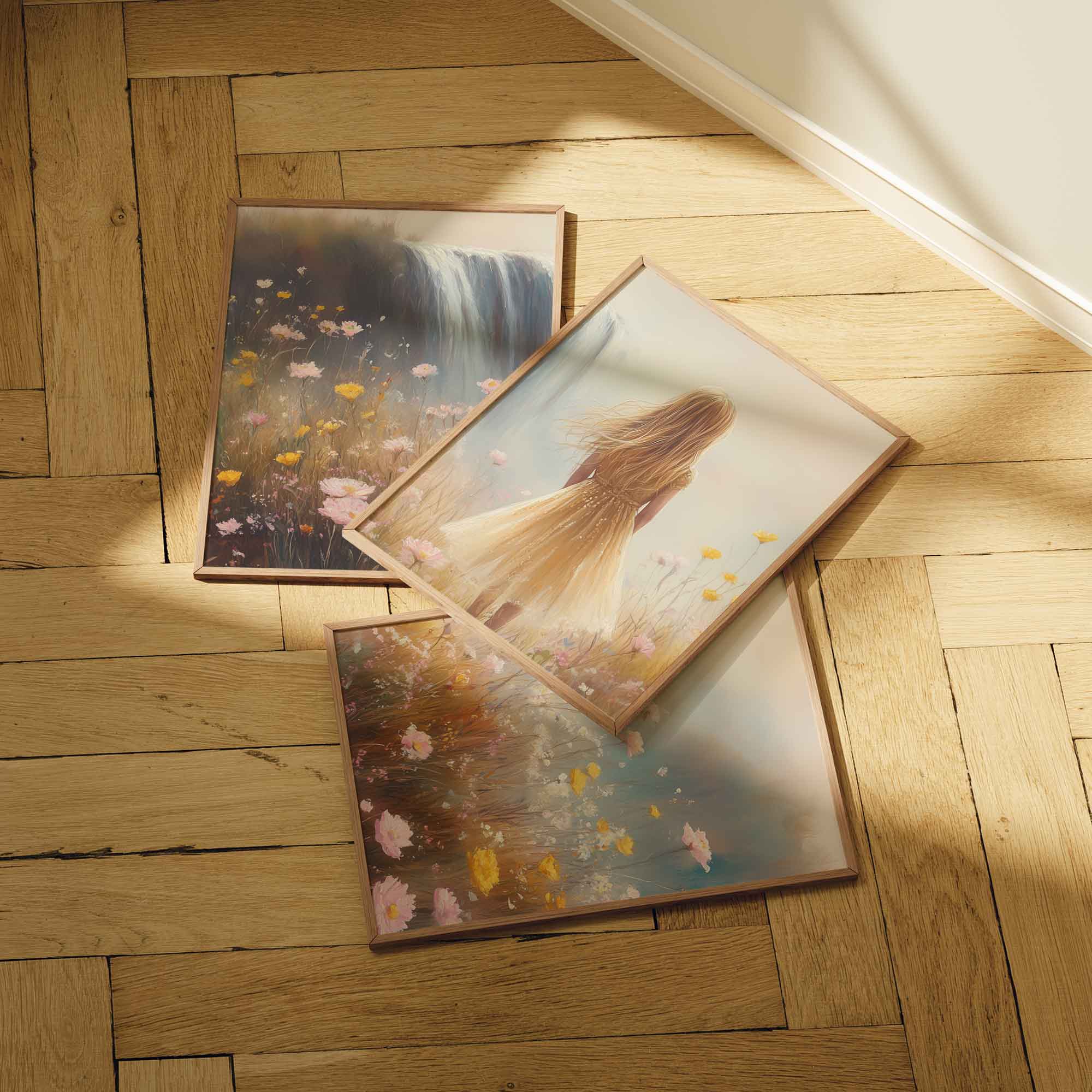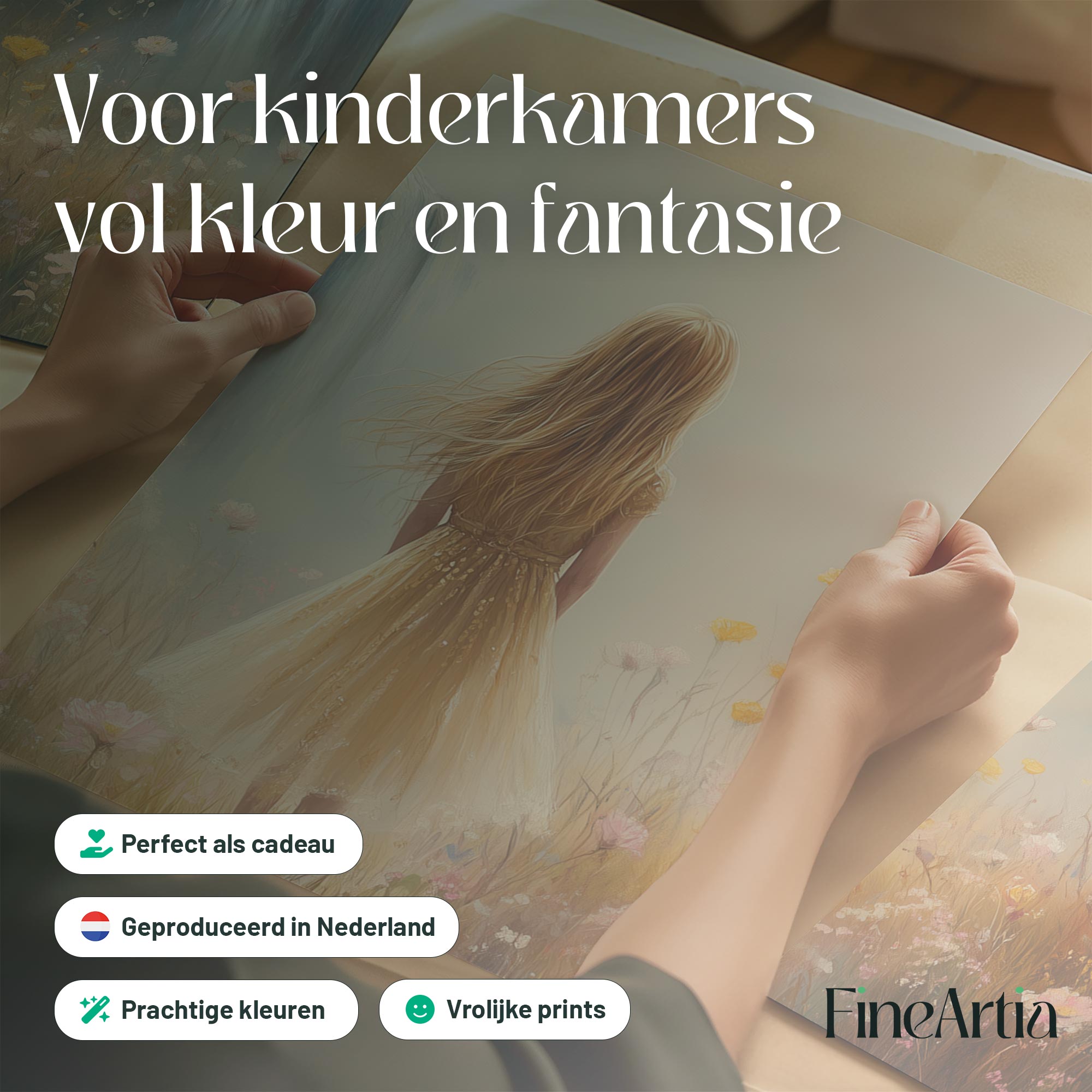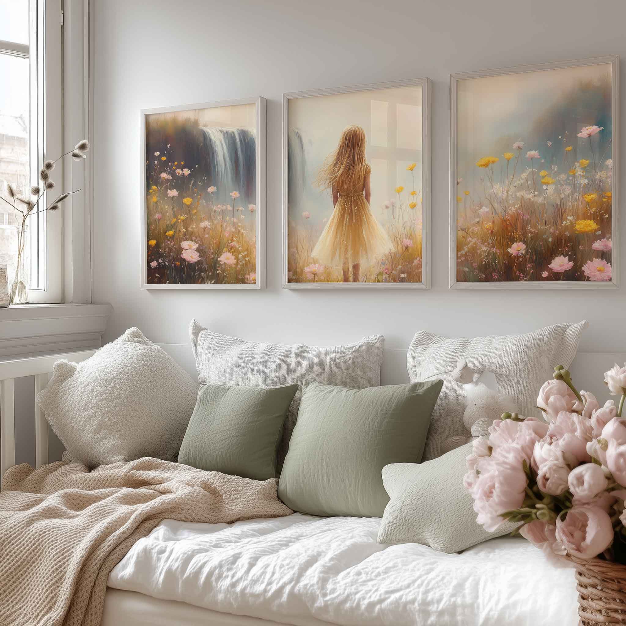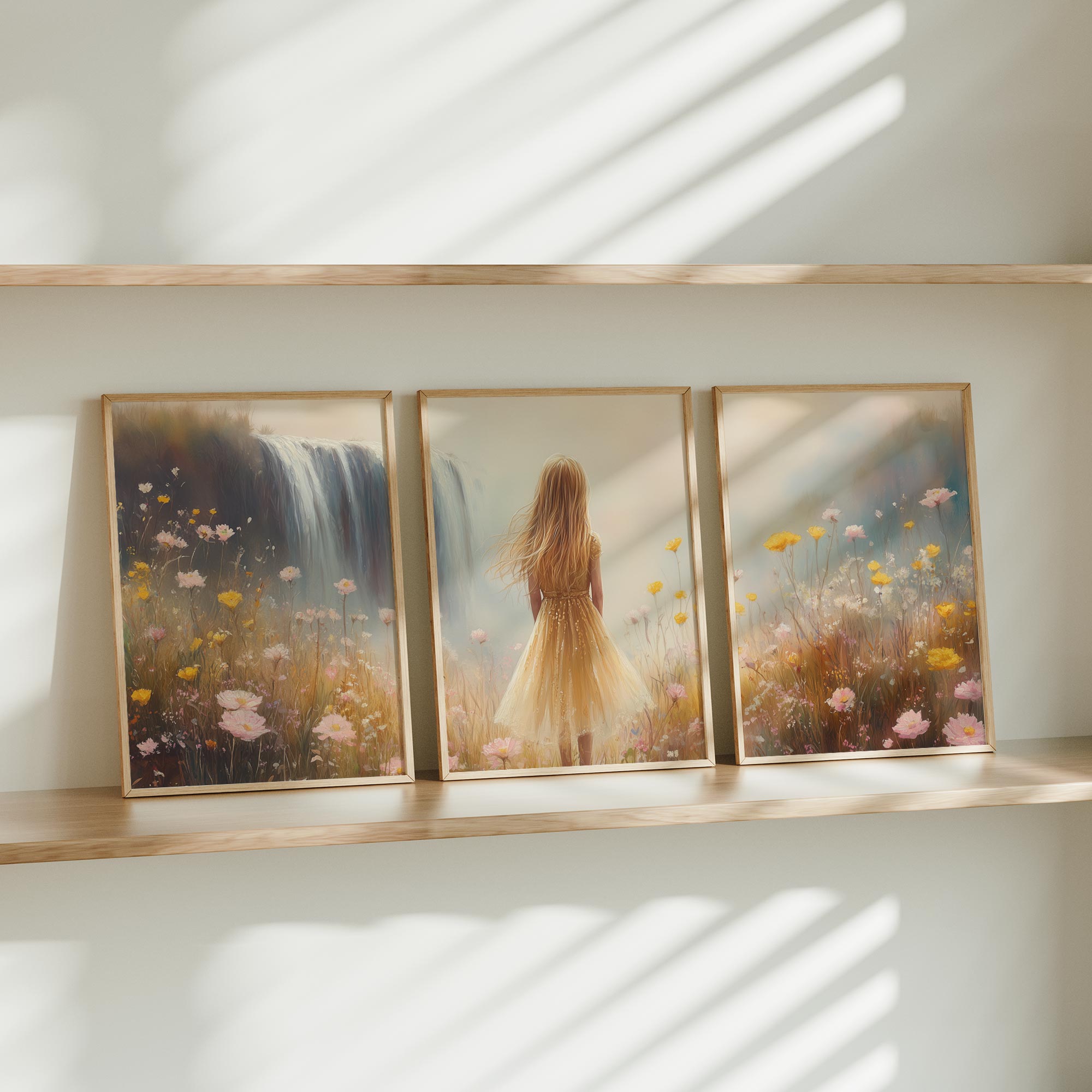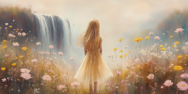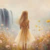Terug naar collectie Posters Geel jurkje bij de waterval – Dromerig bloemenveld