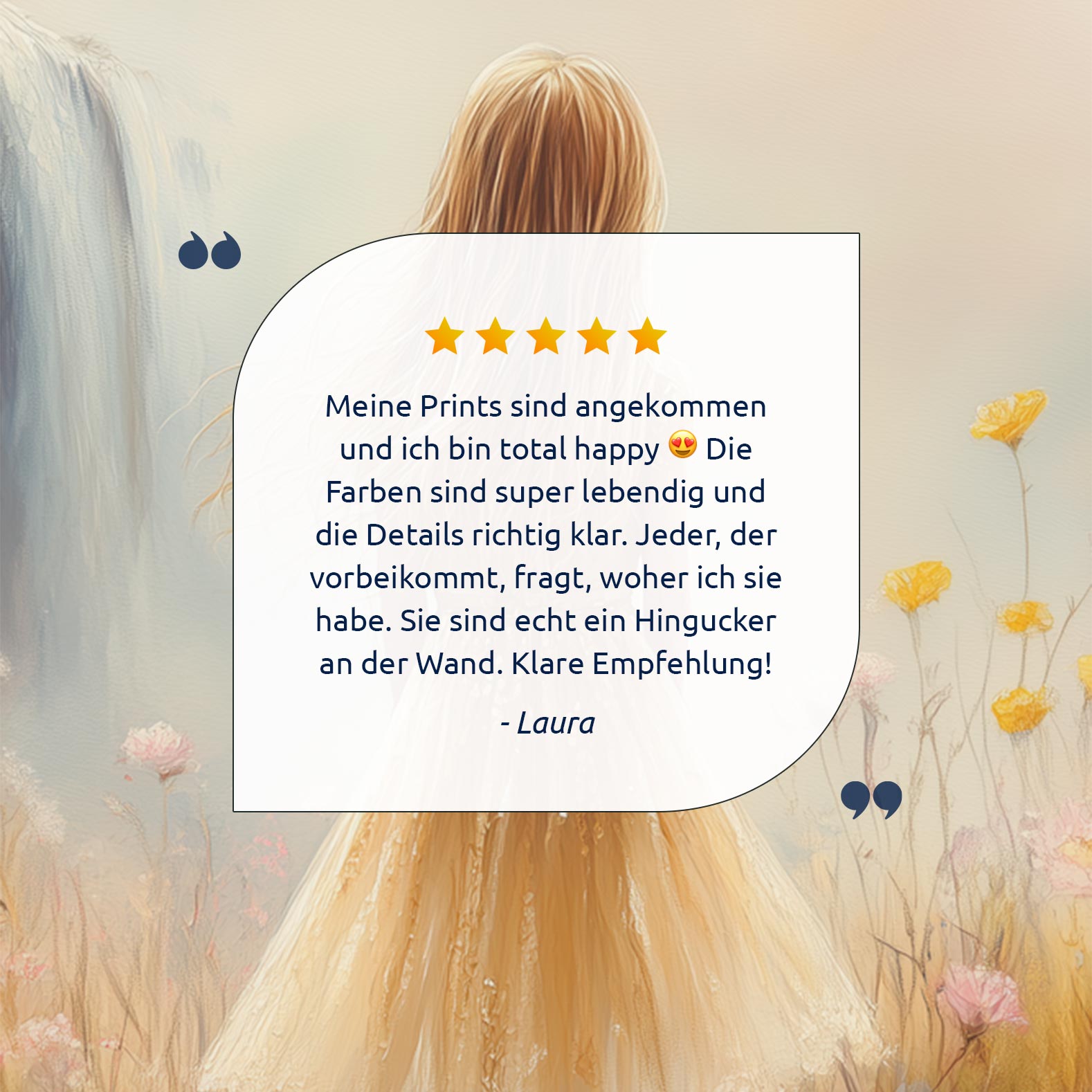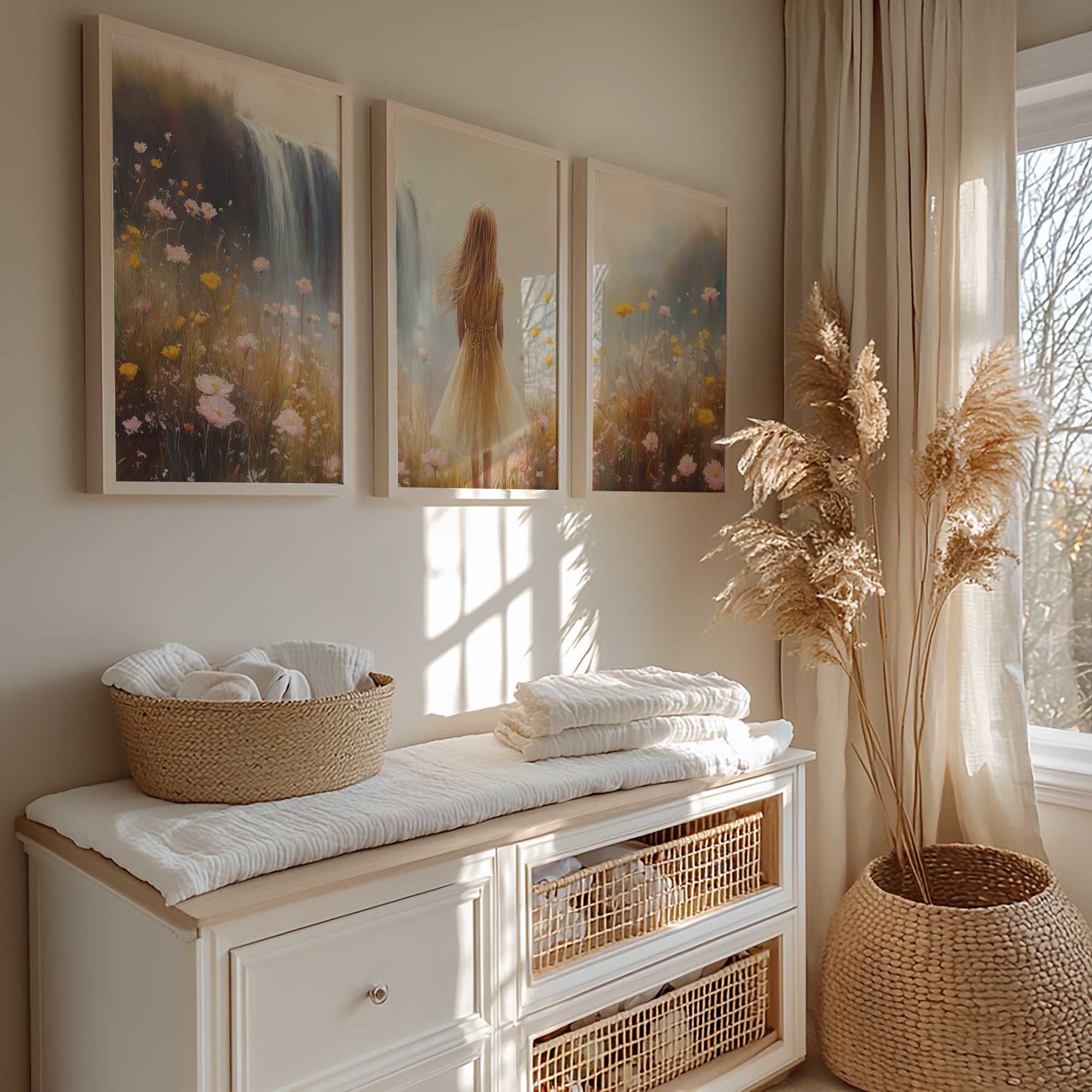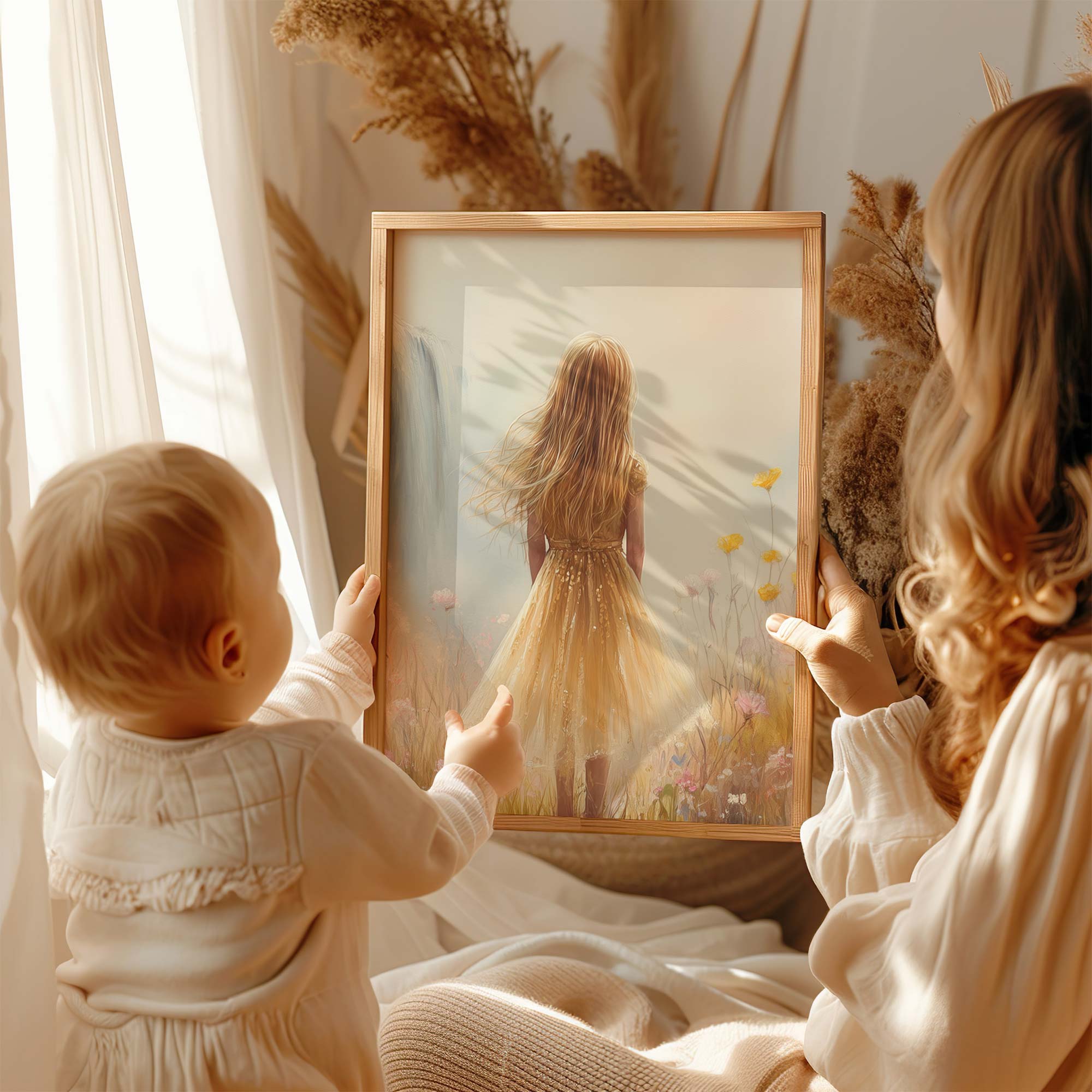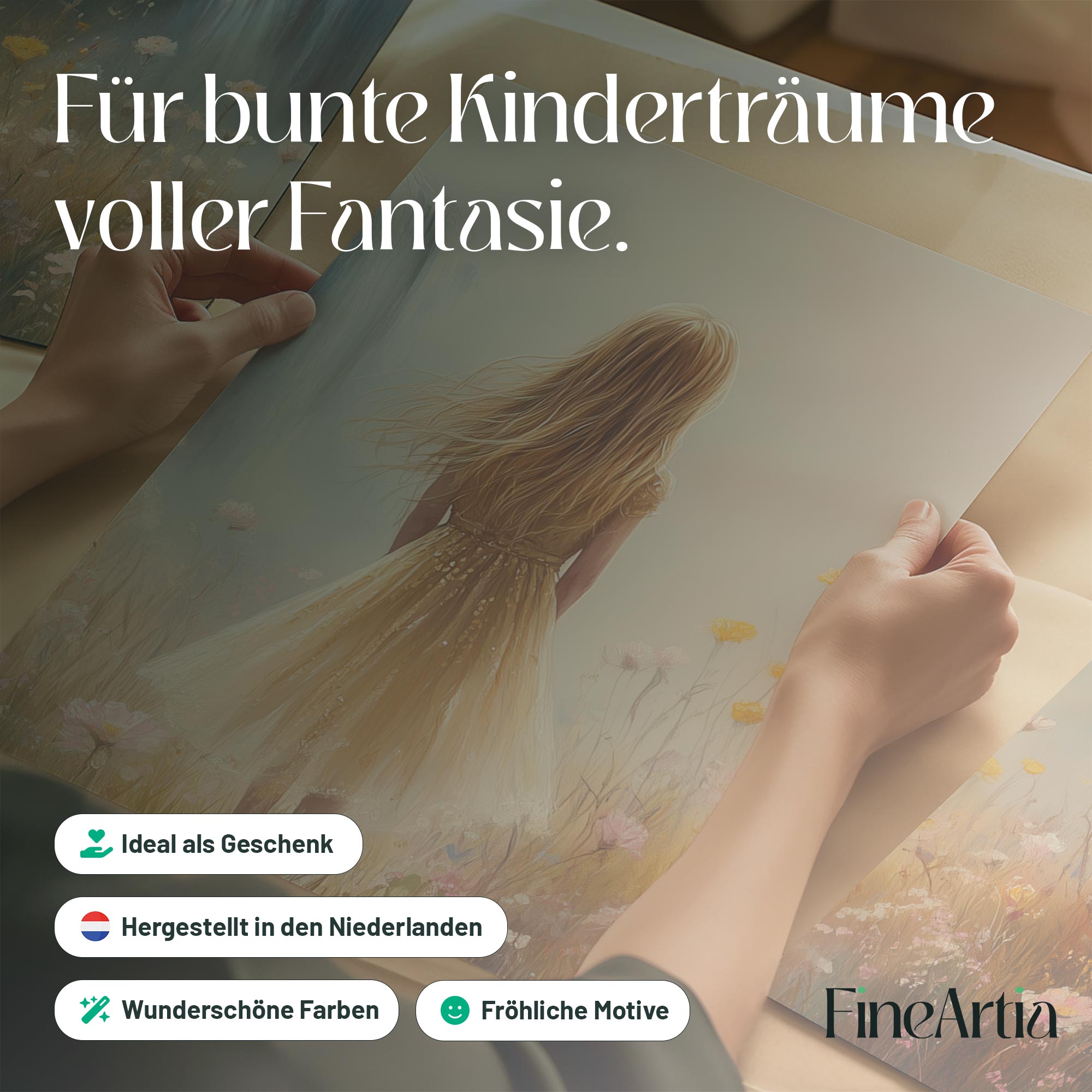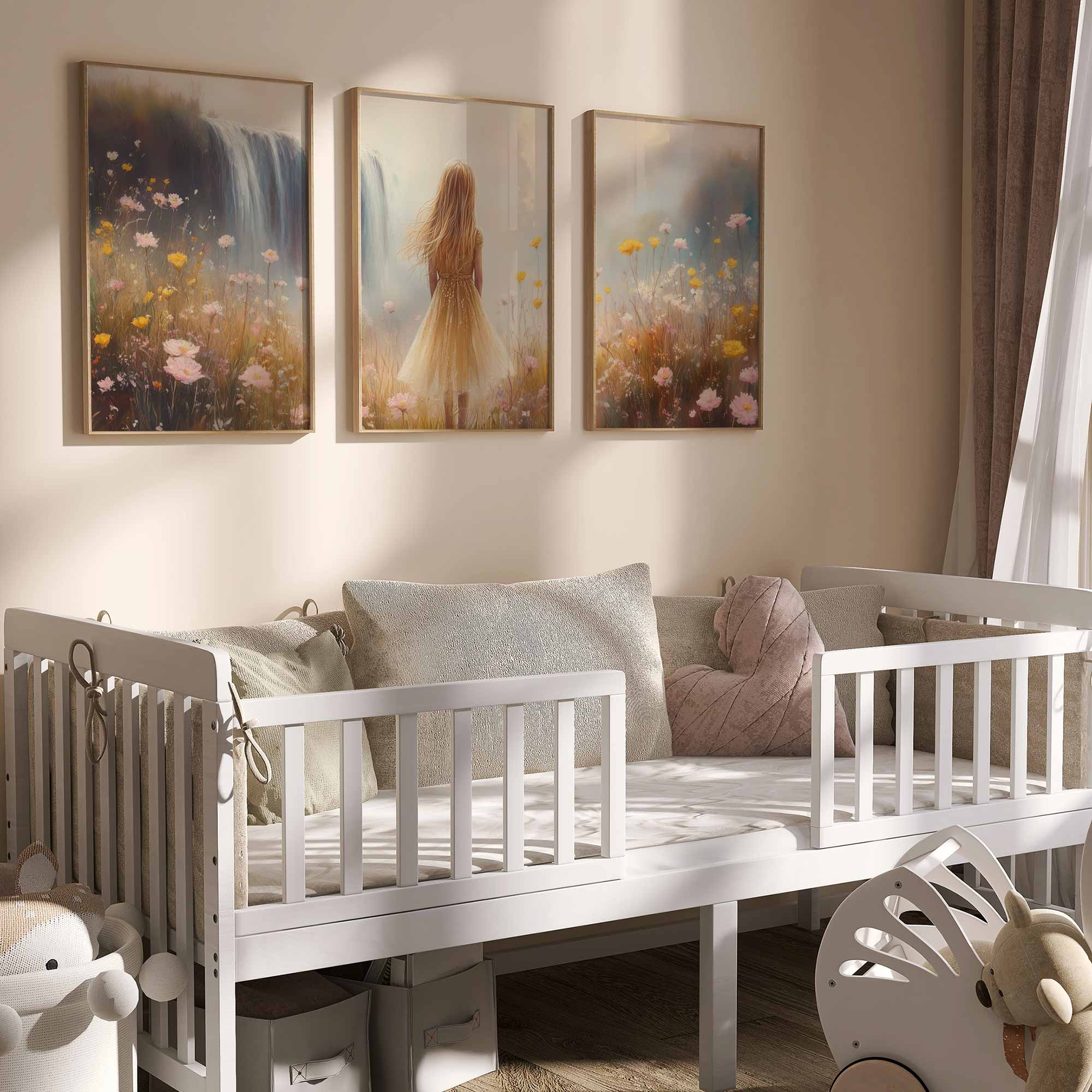 Terug naar collectie Posters Geel jurkje bij de waterval – Dromerig bloemenveld