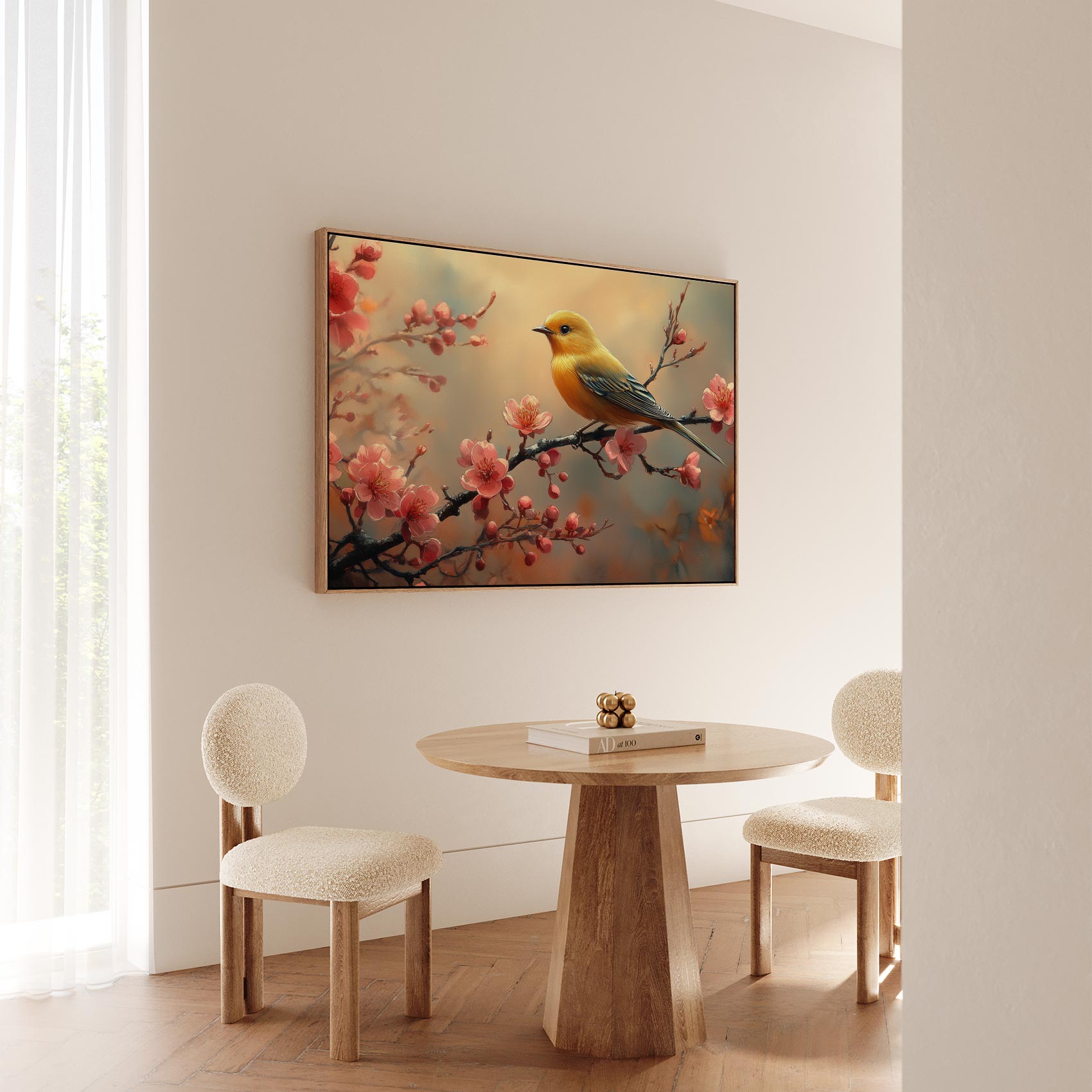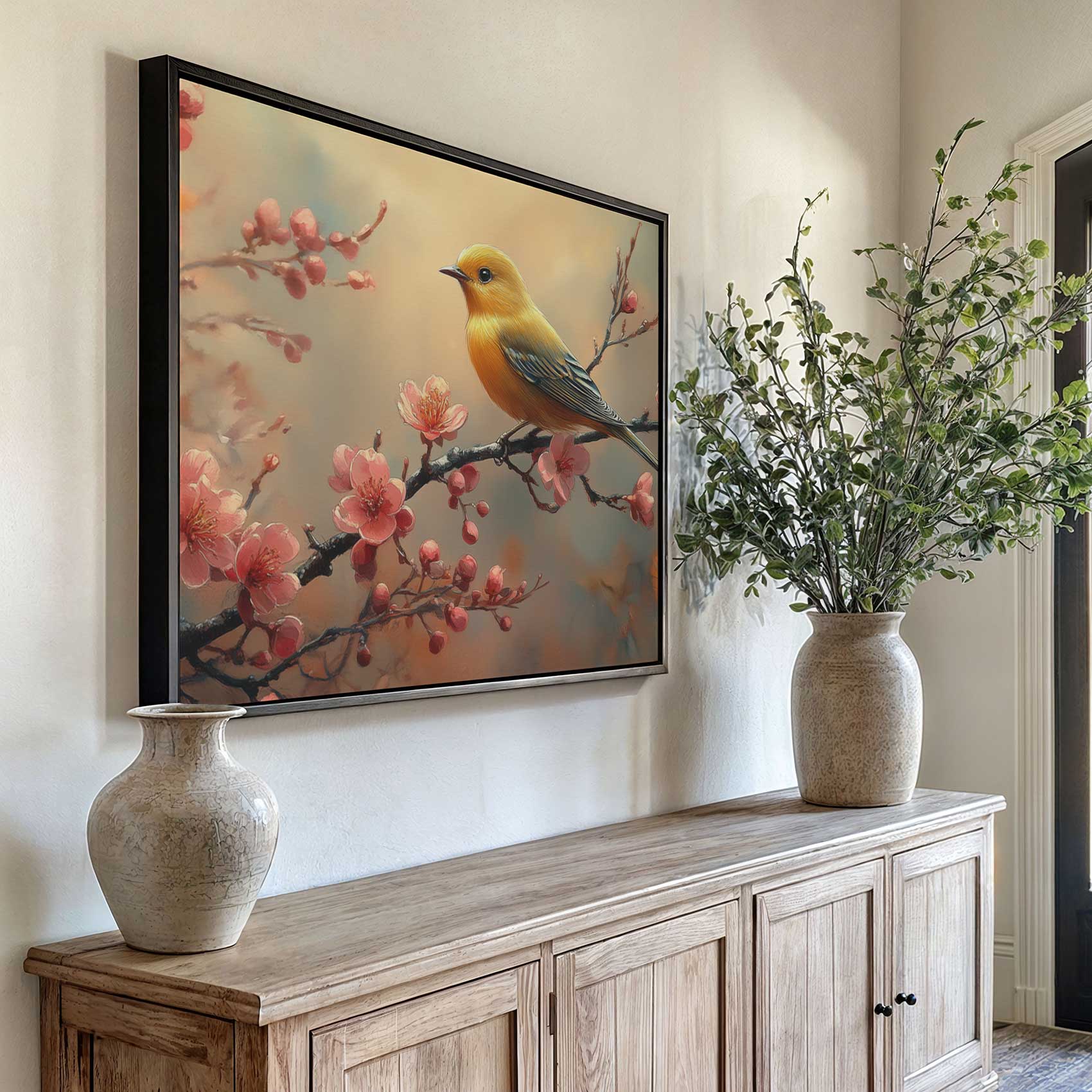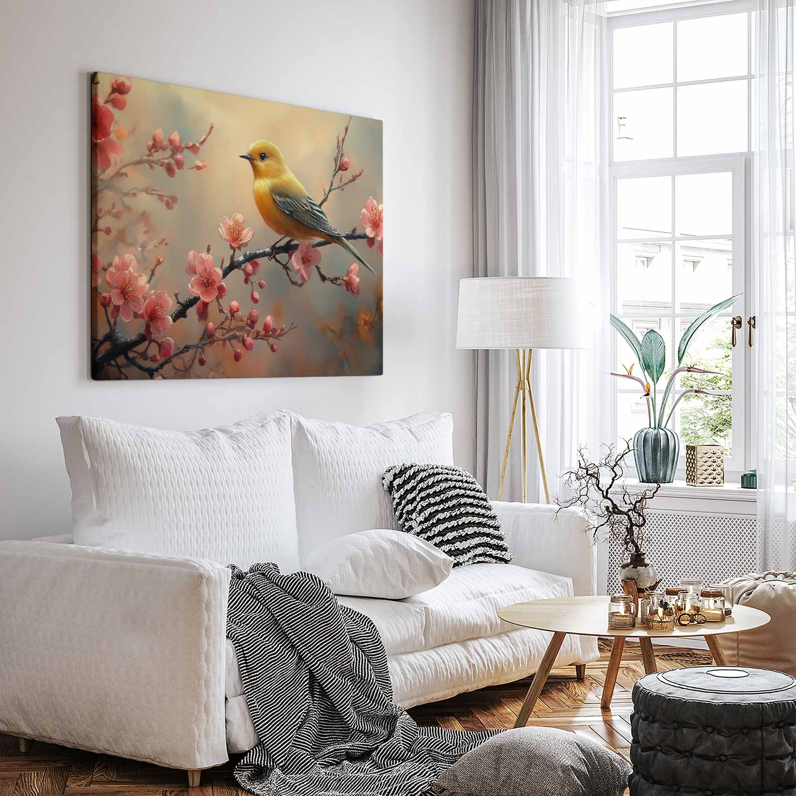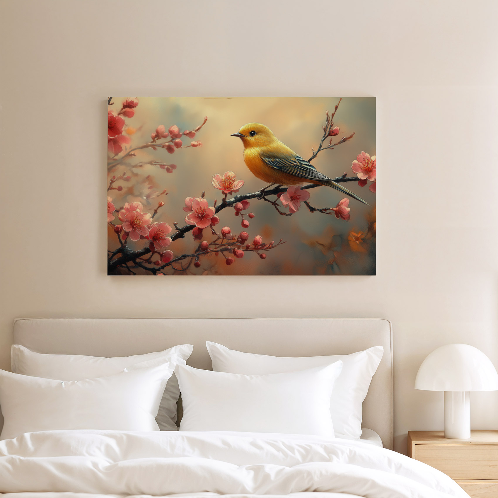 Gele vogel tussen roze bloesem