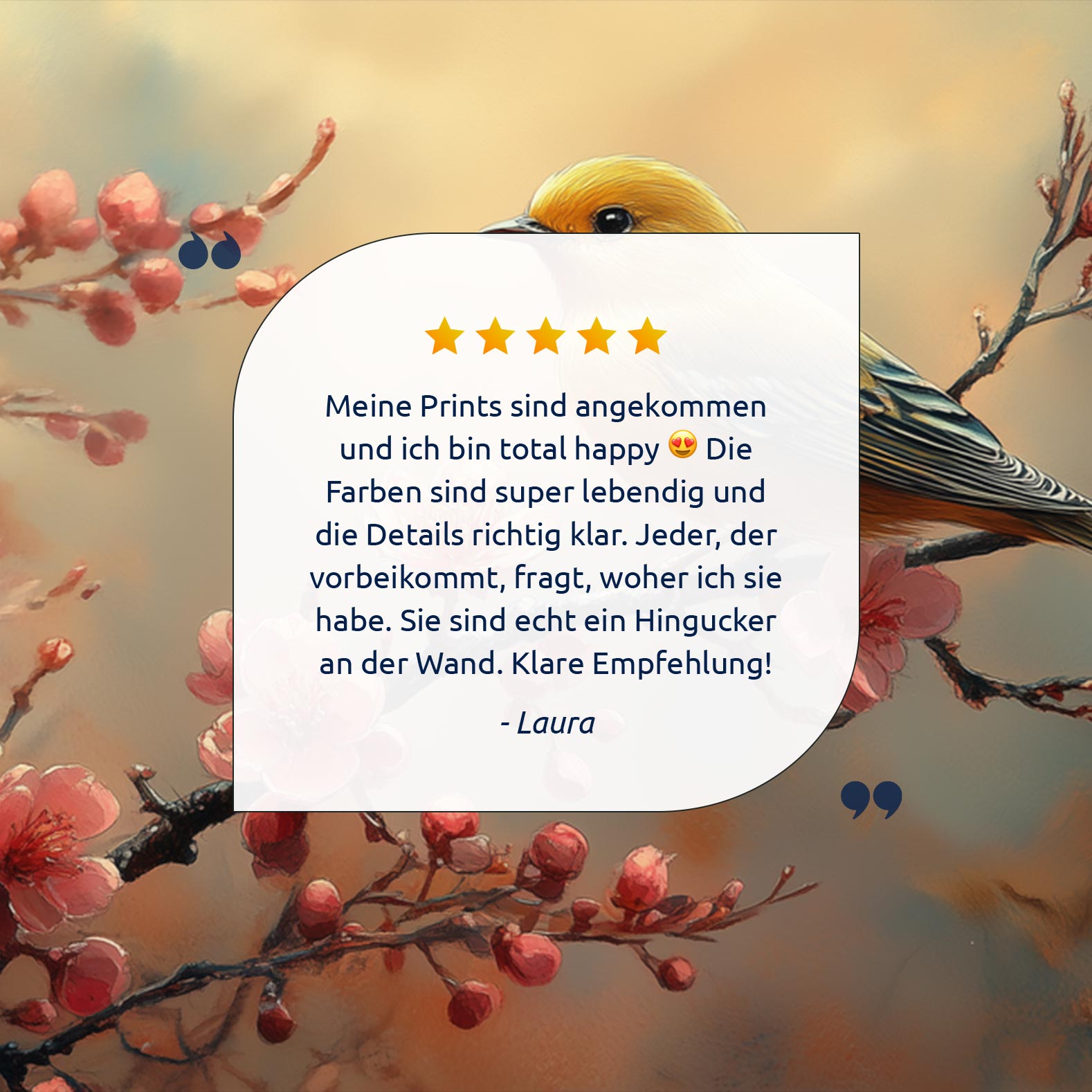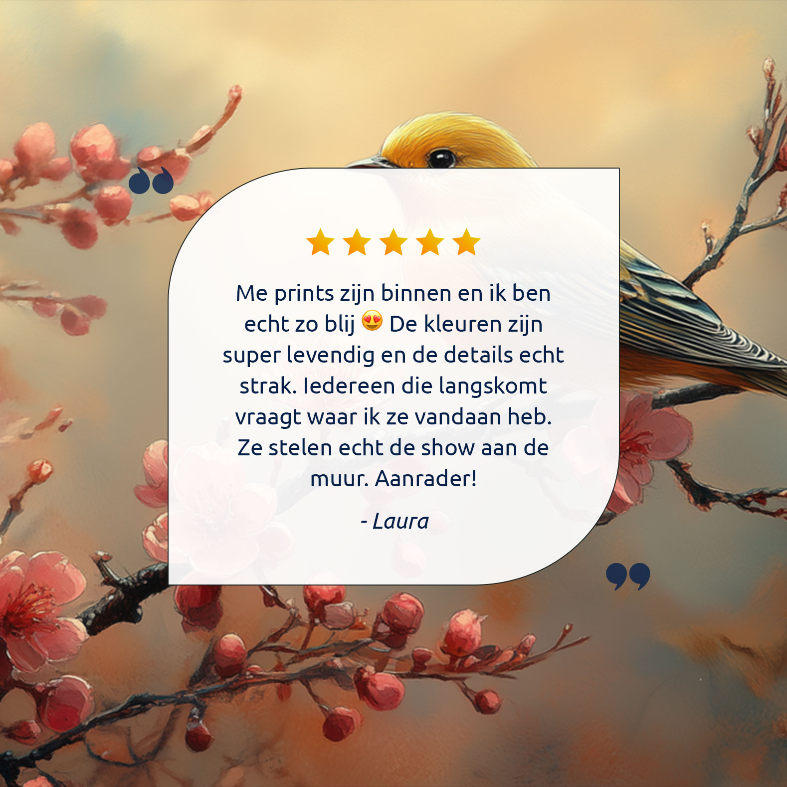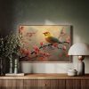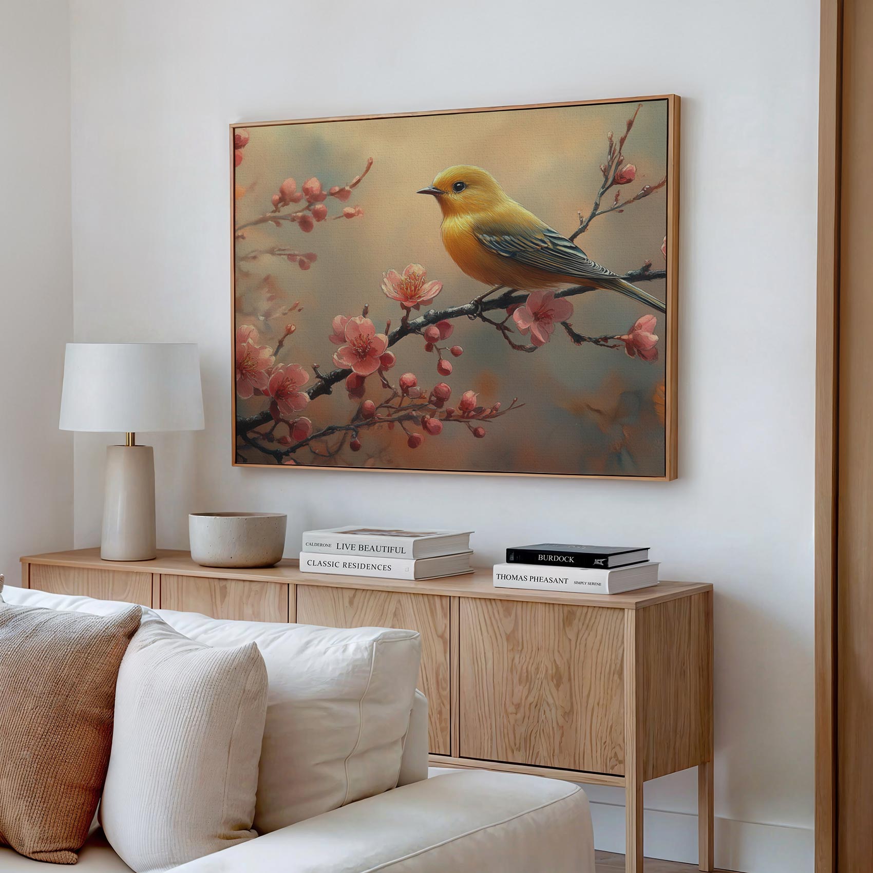 Gele vogel tussen roze bloesem