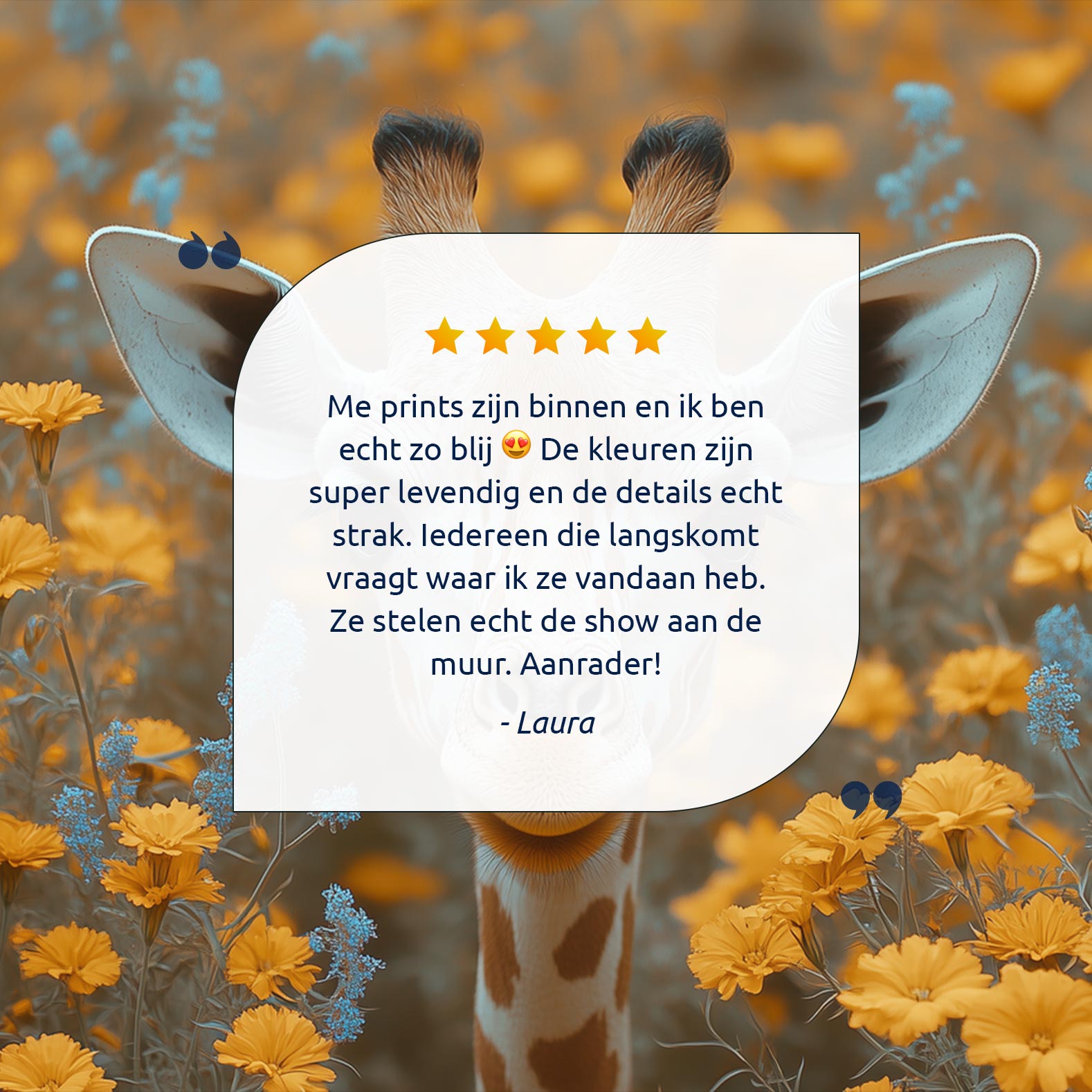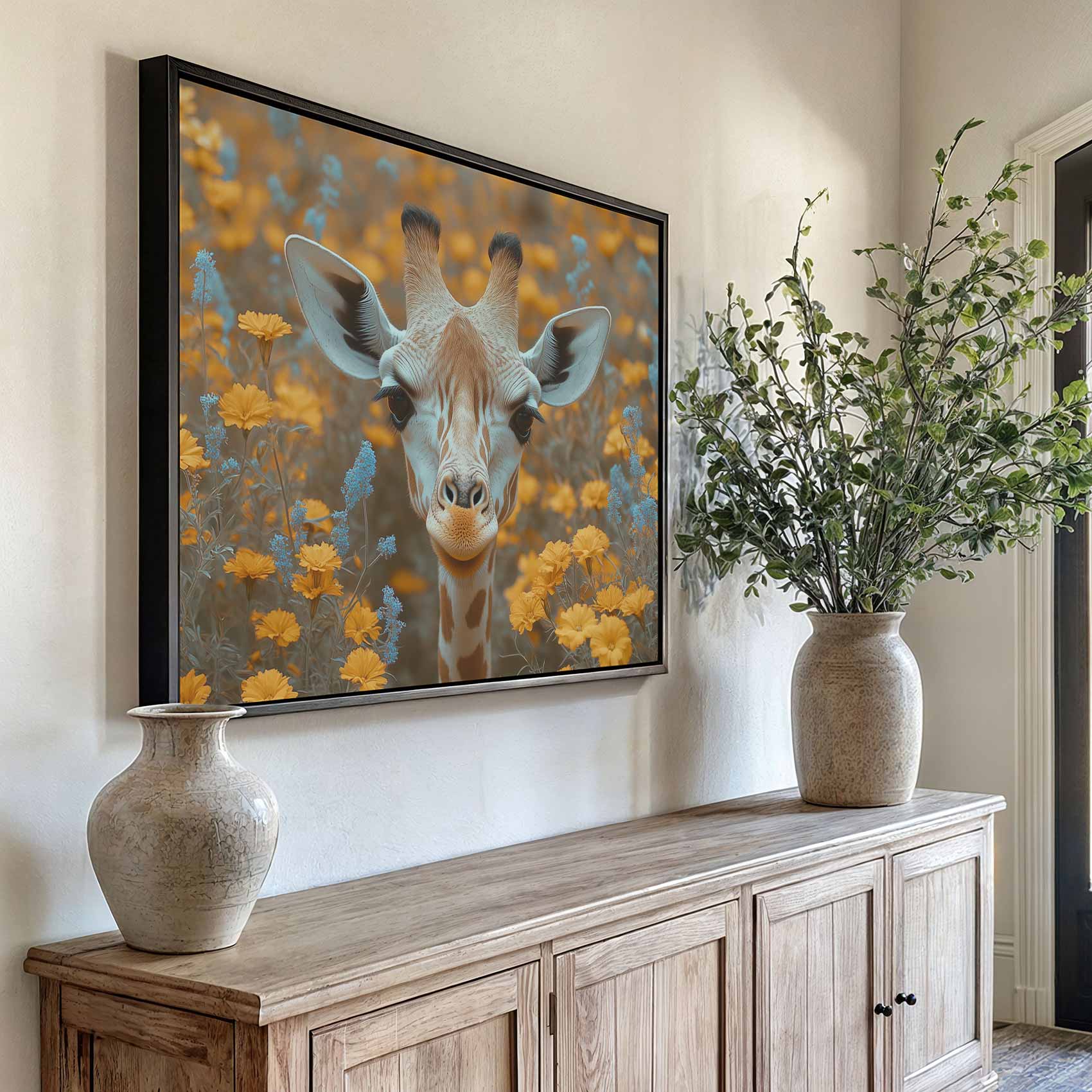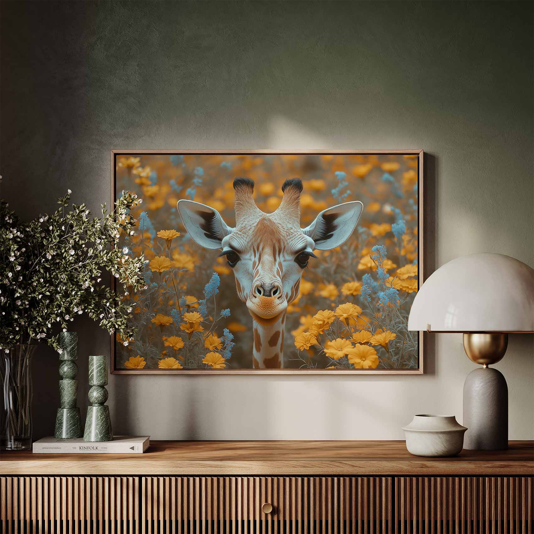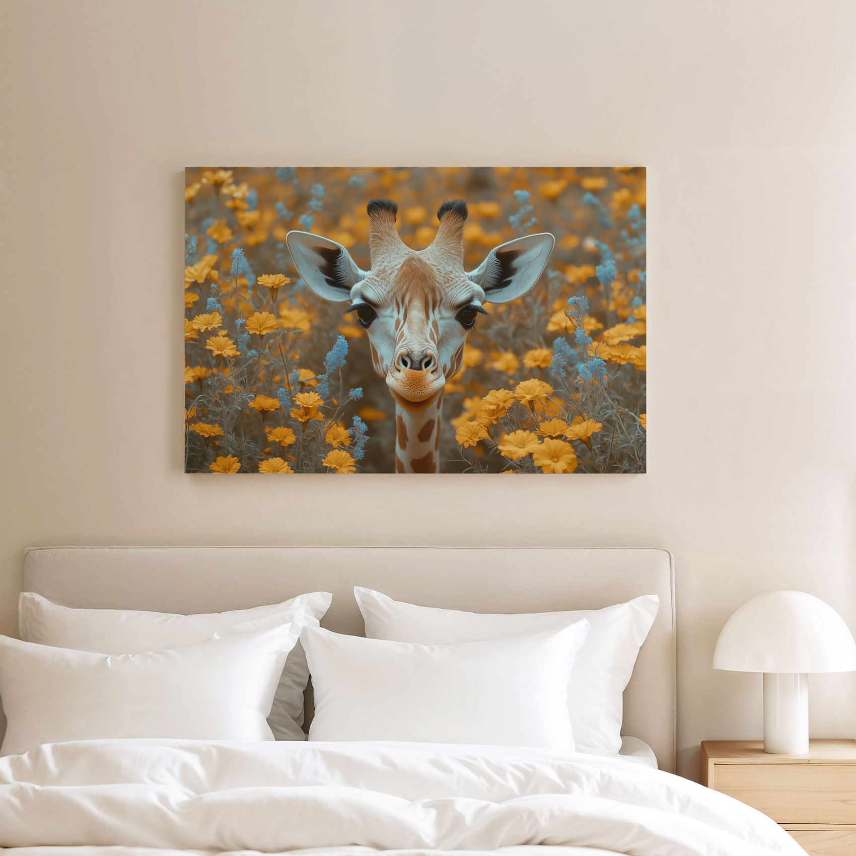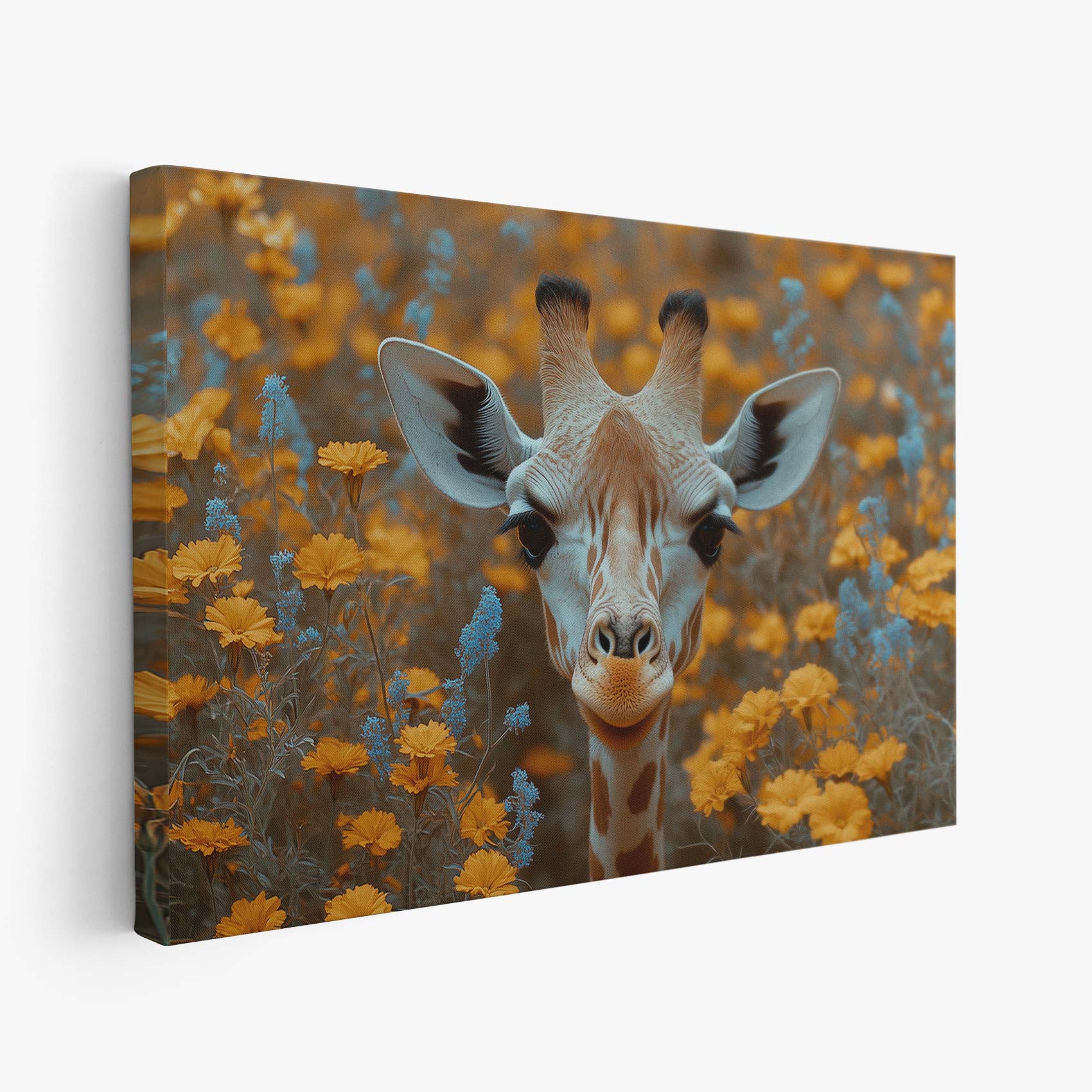 Giraf tussen gele bloemen