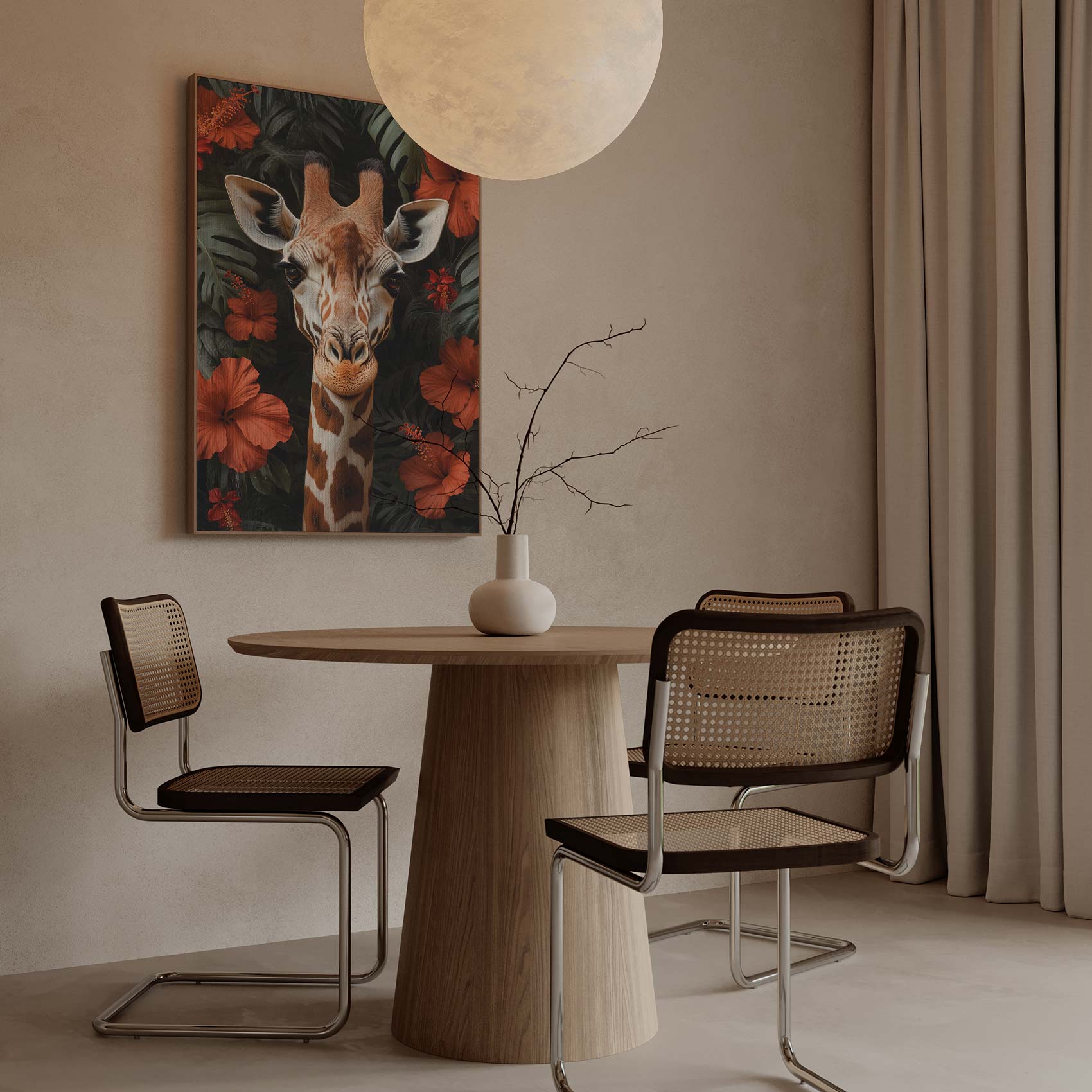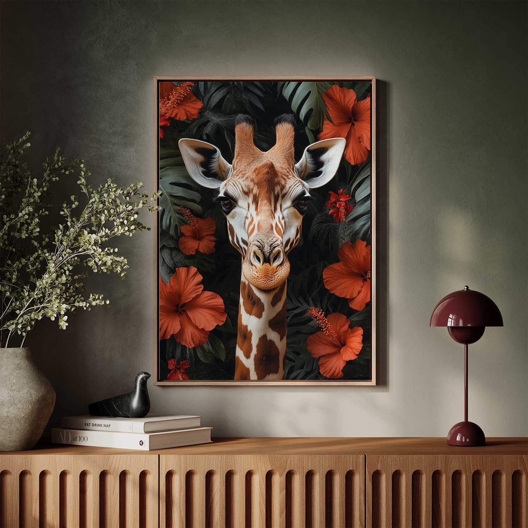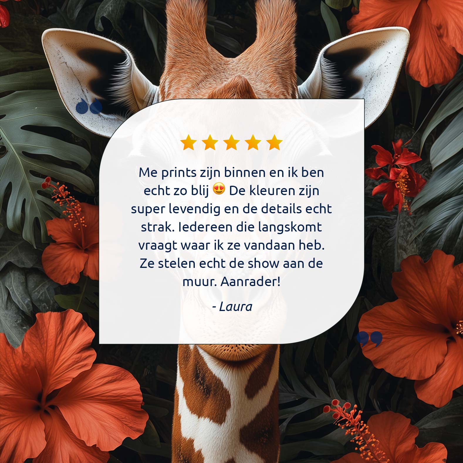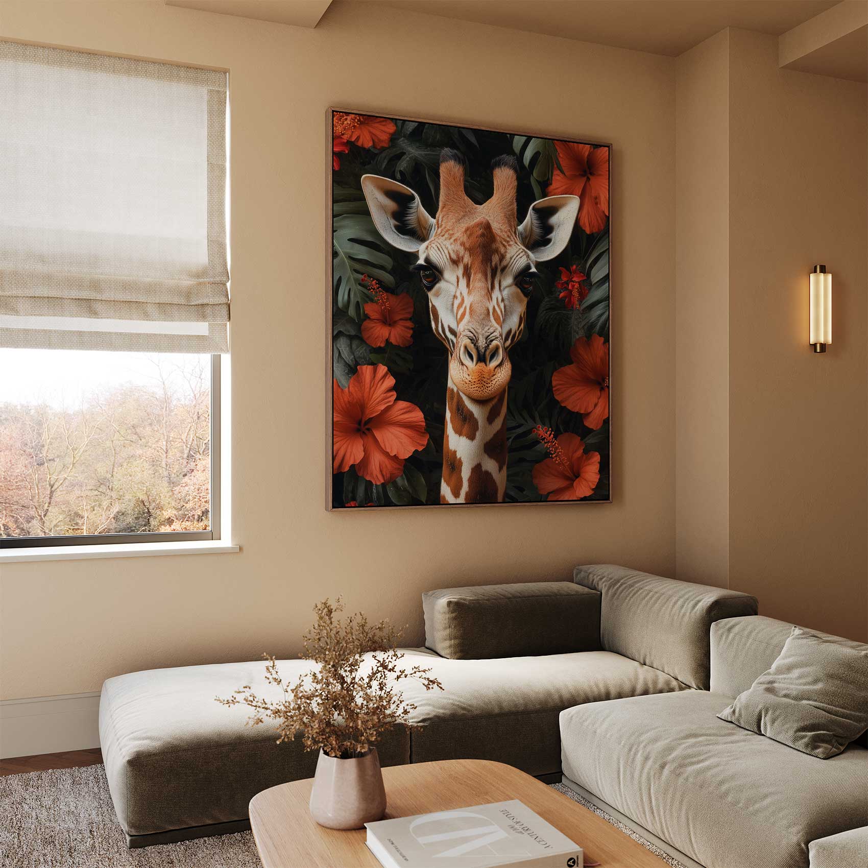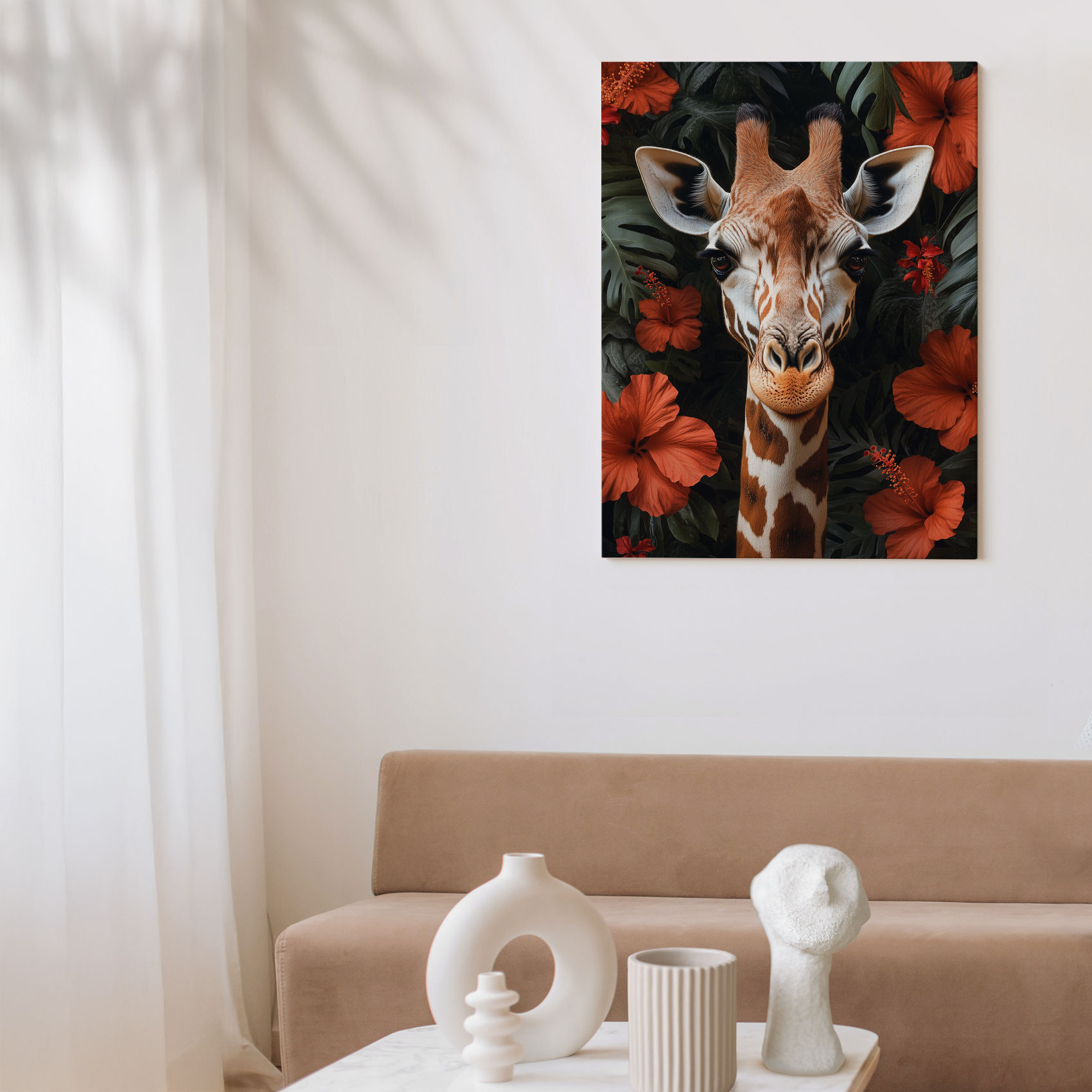 Giraf tussen rode bloemen