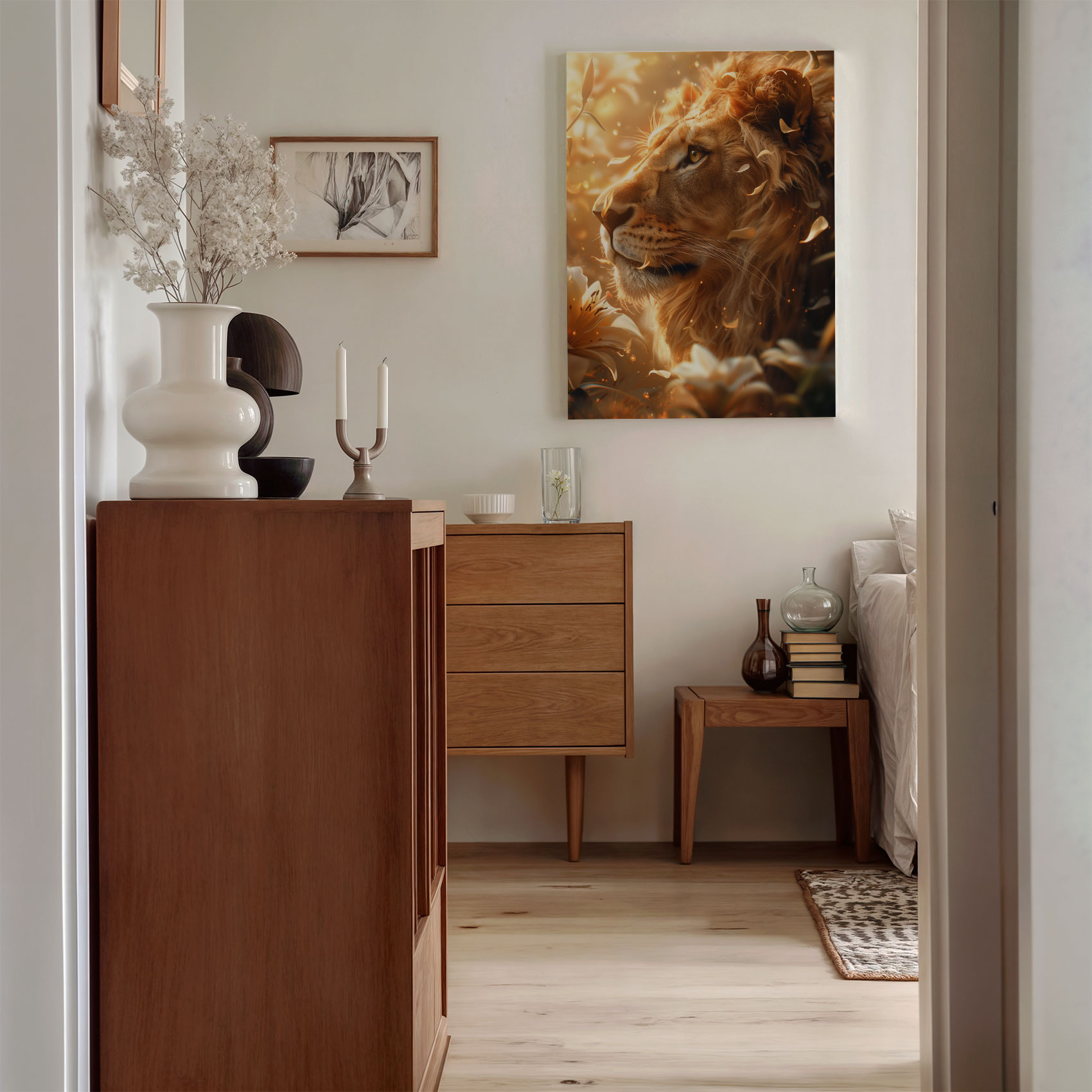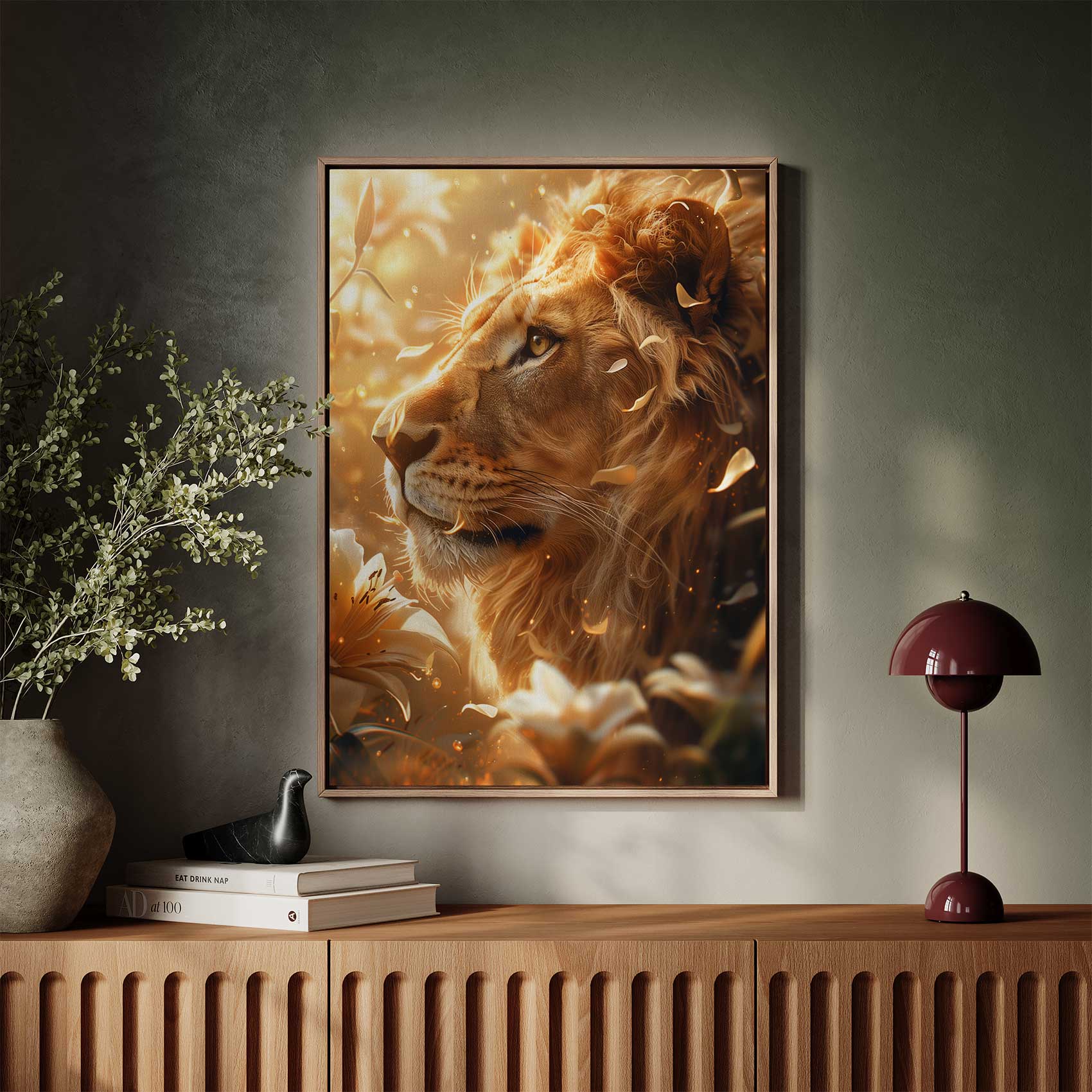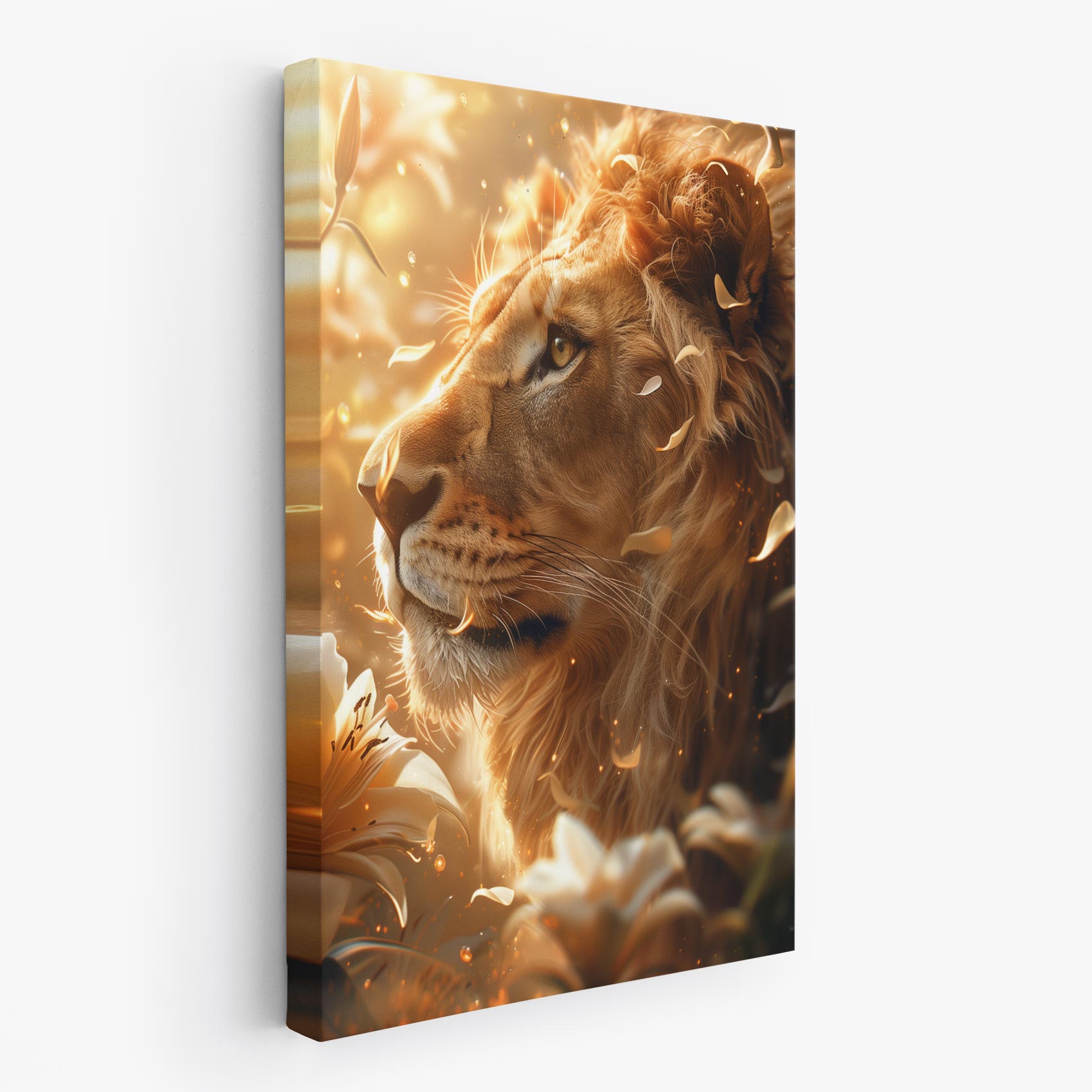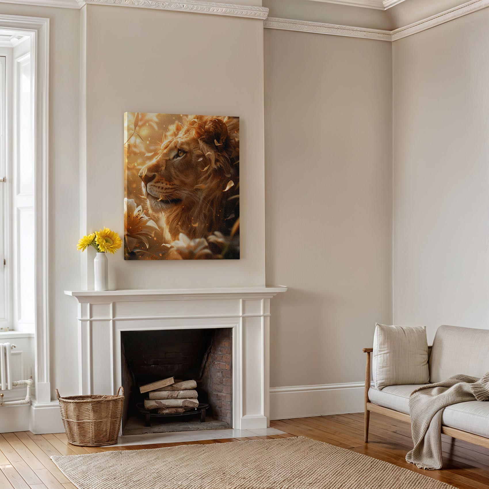 Terug naar collectie Canvas Gouden leeuw in bloemenpracht