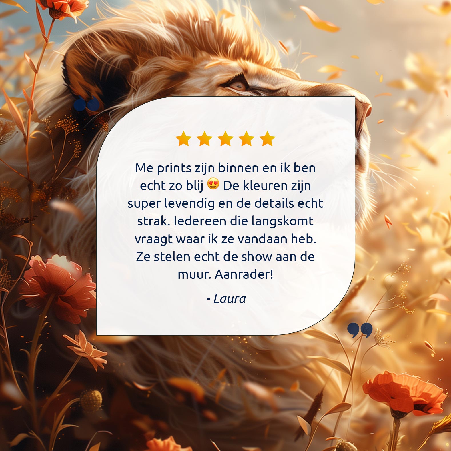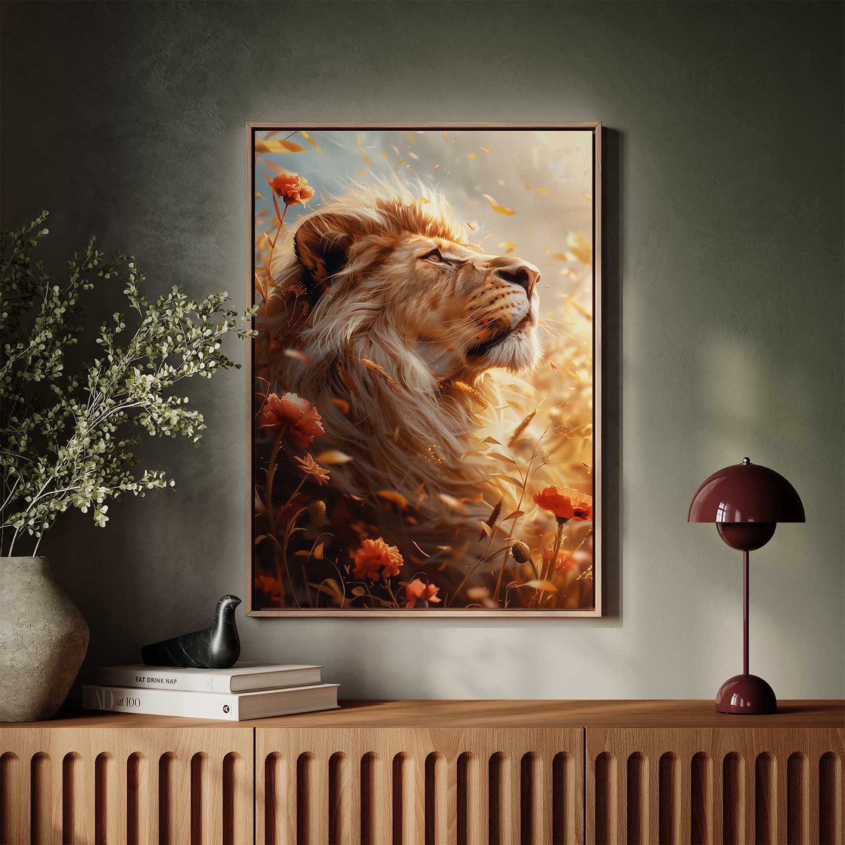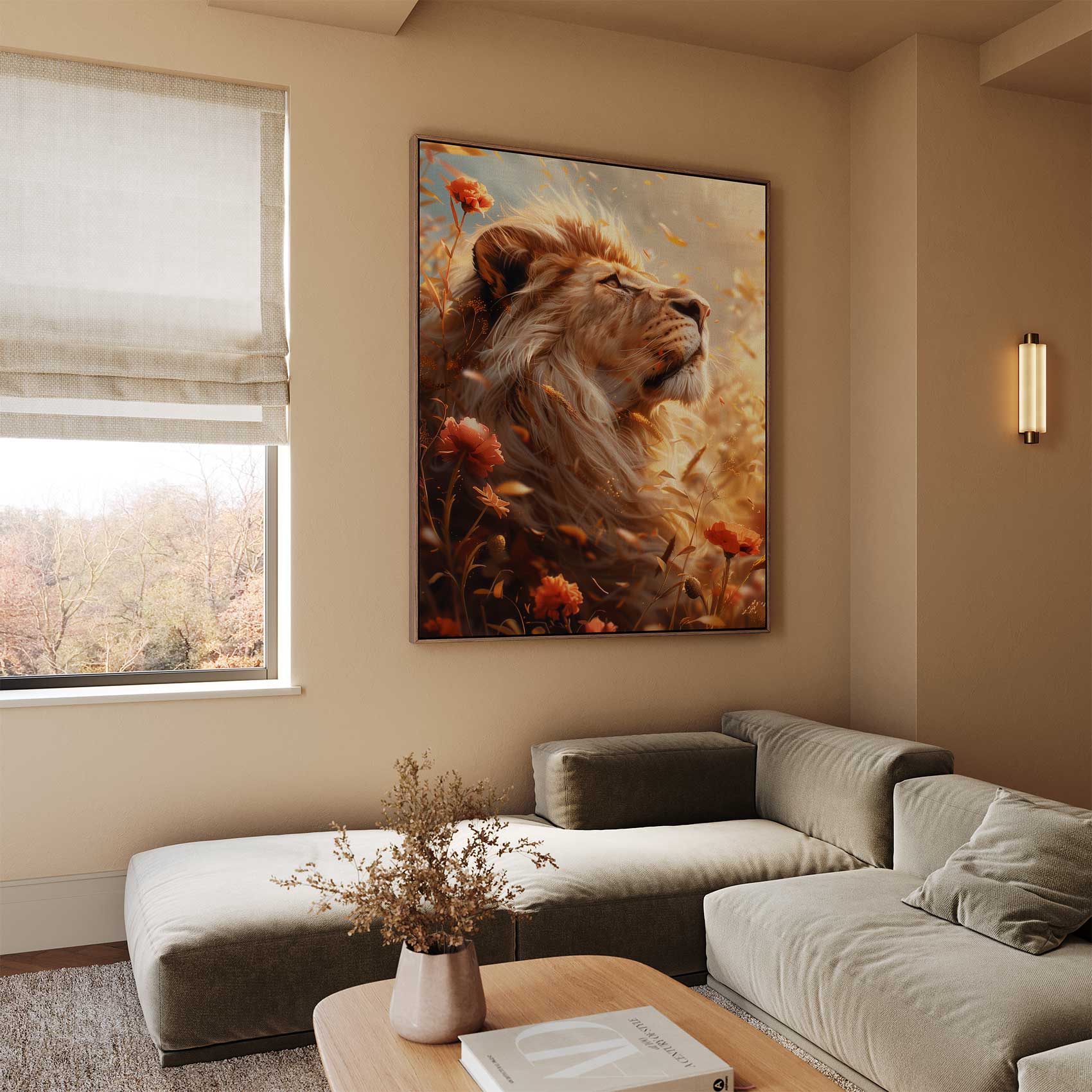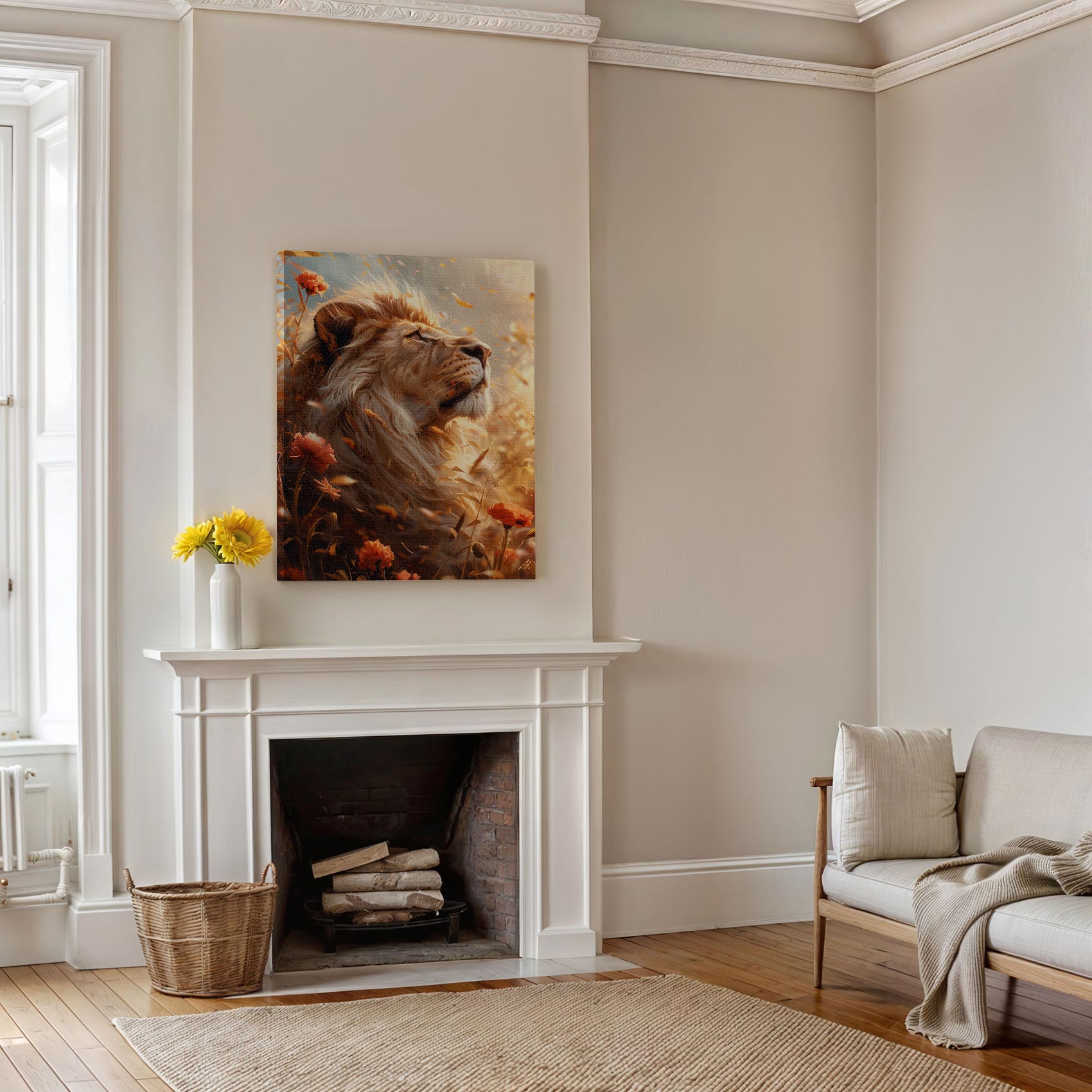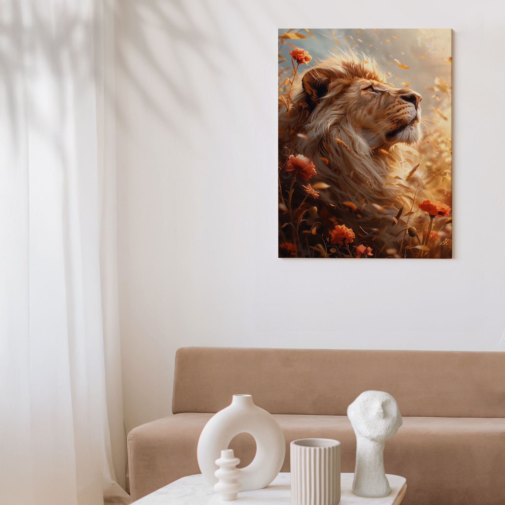 Terug naar collectie Canvas Gouden leeuw in bloemenveld