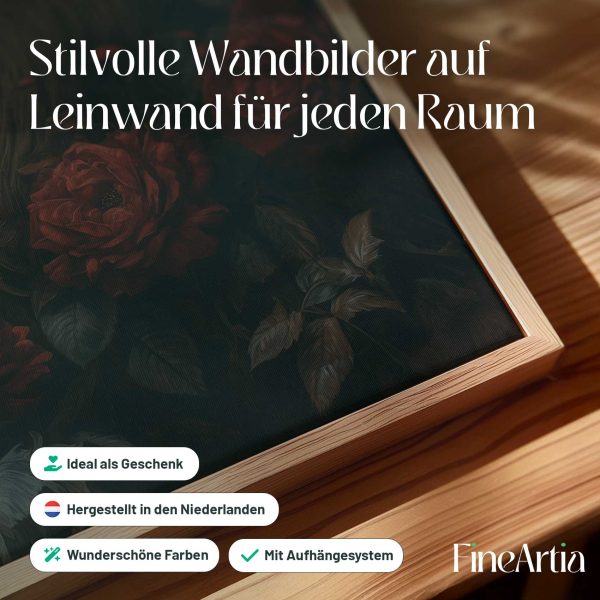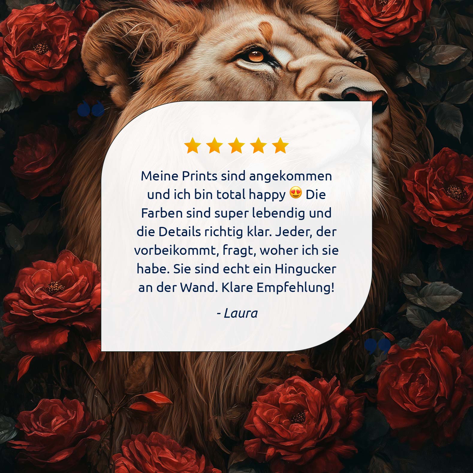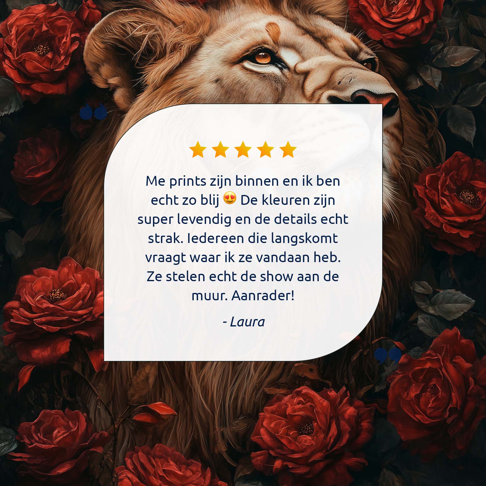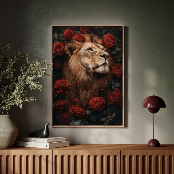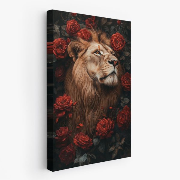 Terug naar collectie Canvas Gouden leeuw tussen rode rozen