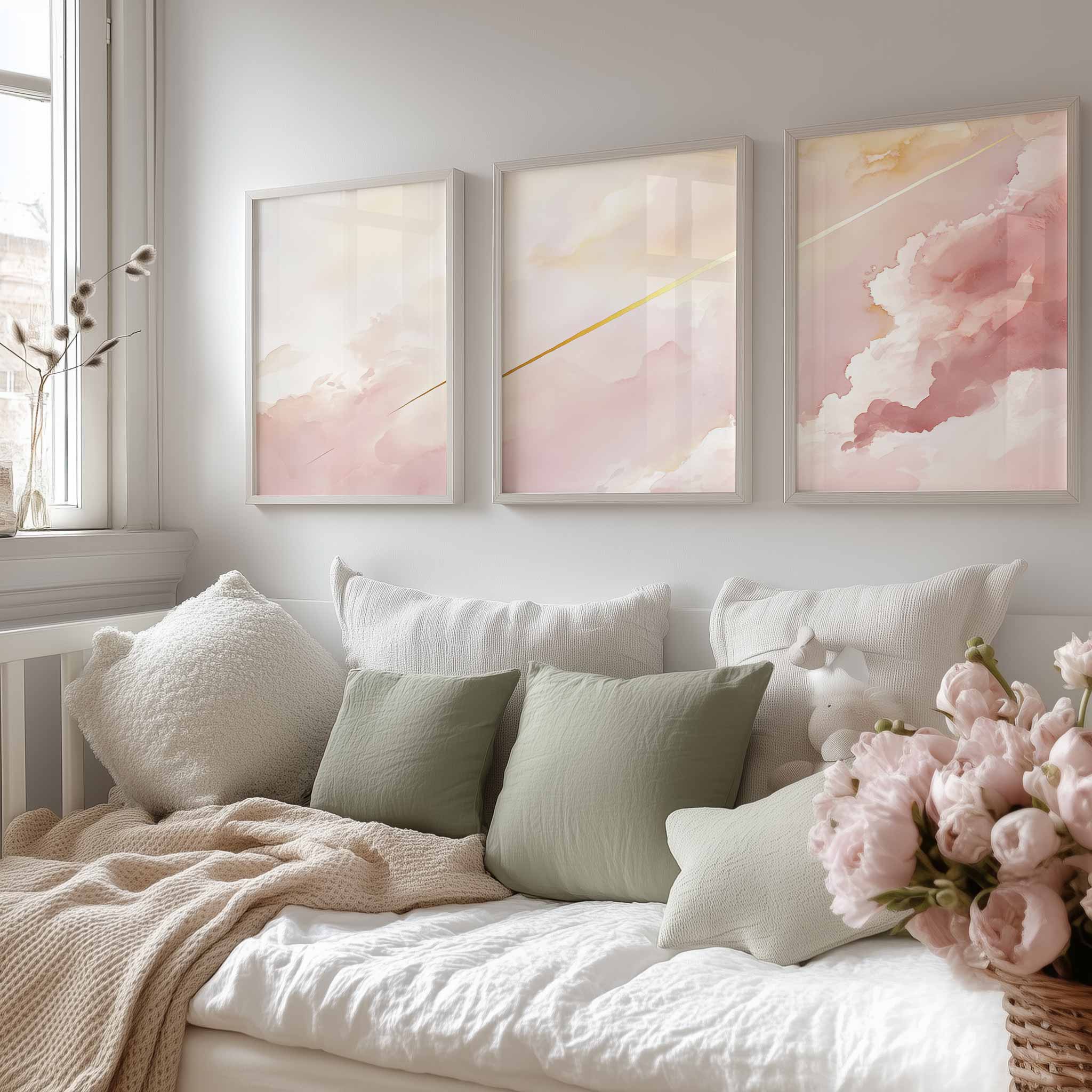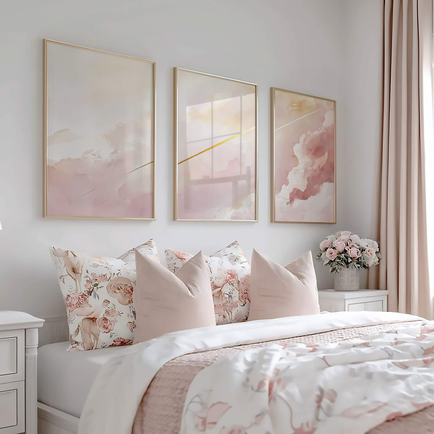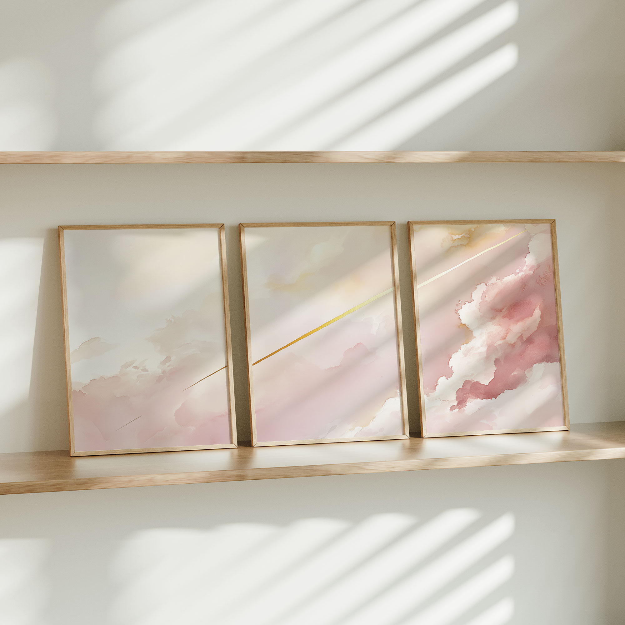 Gouden Lijn in Roze Wolkenhemel – Dromerige Wanddecoratie