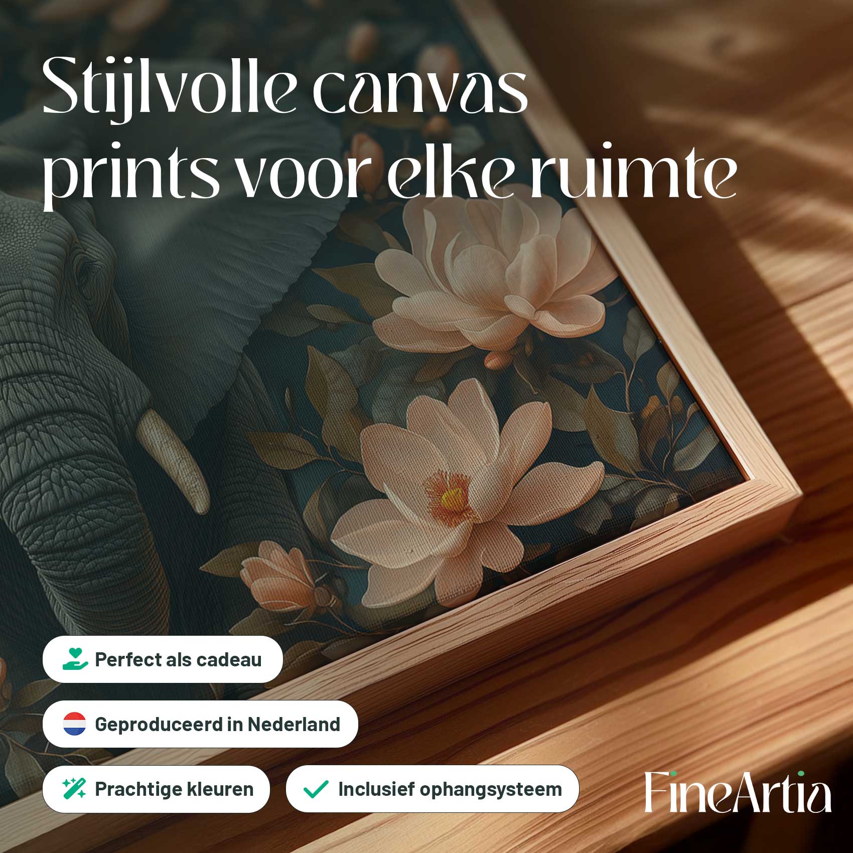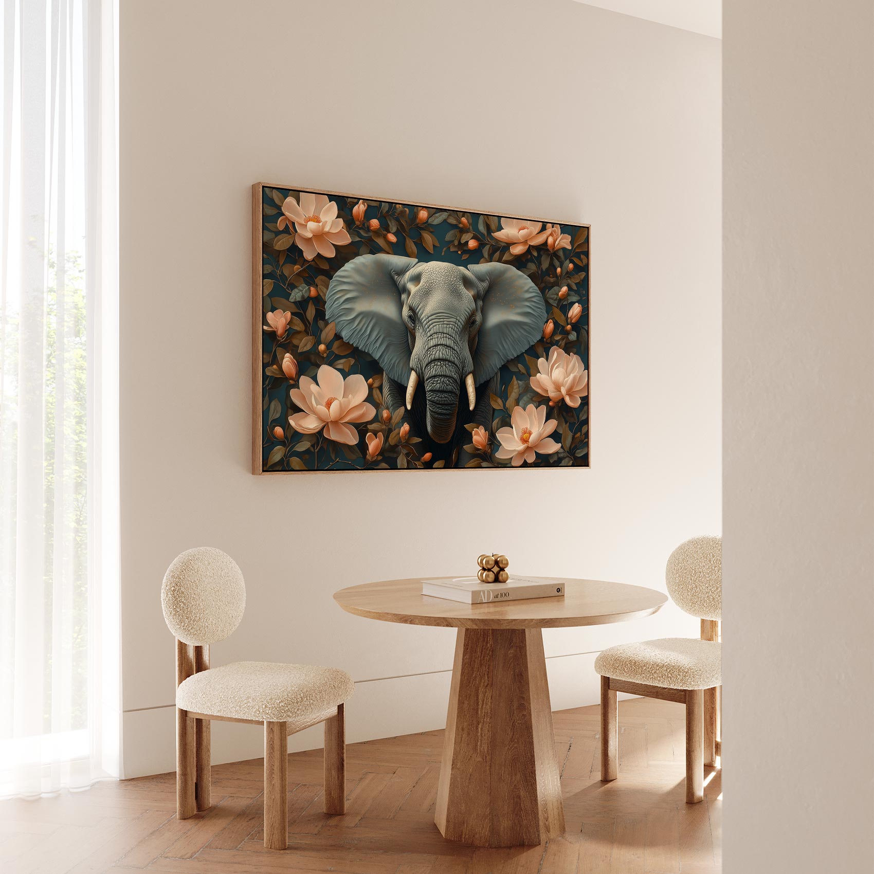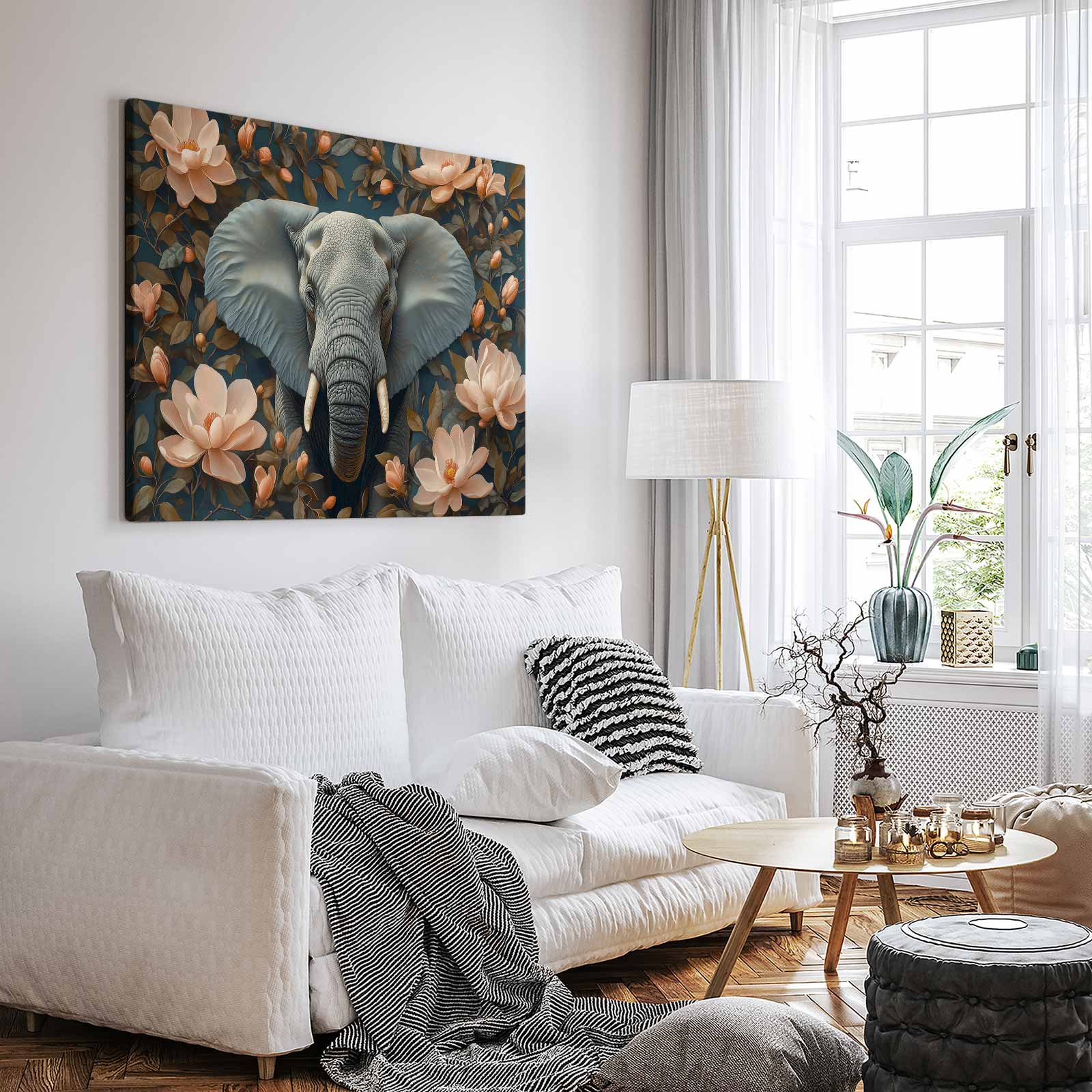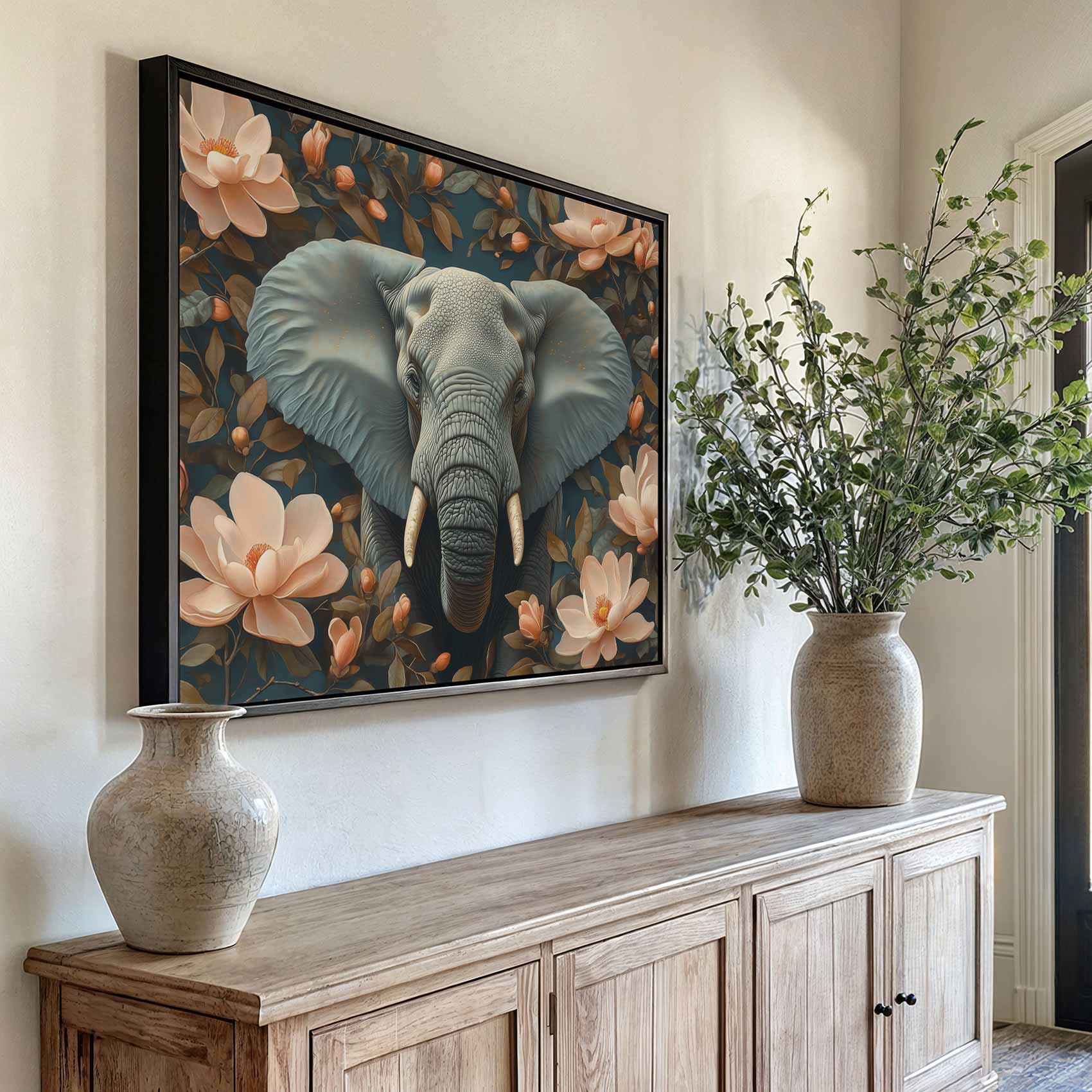 Grijze olifant tussen roze bloemen