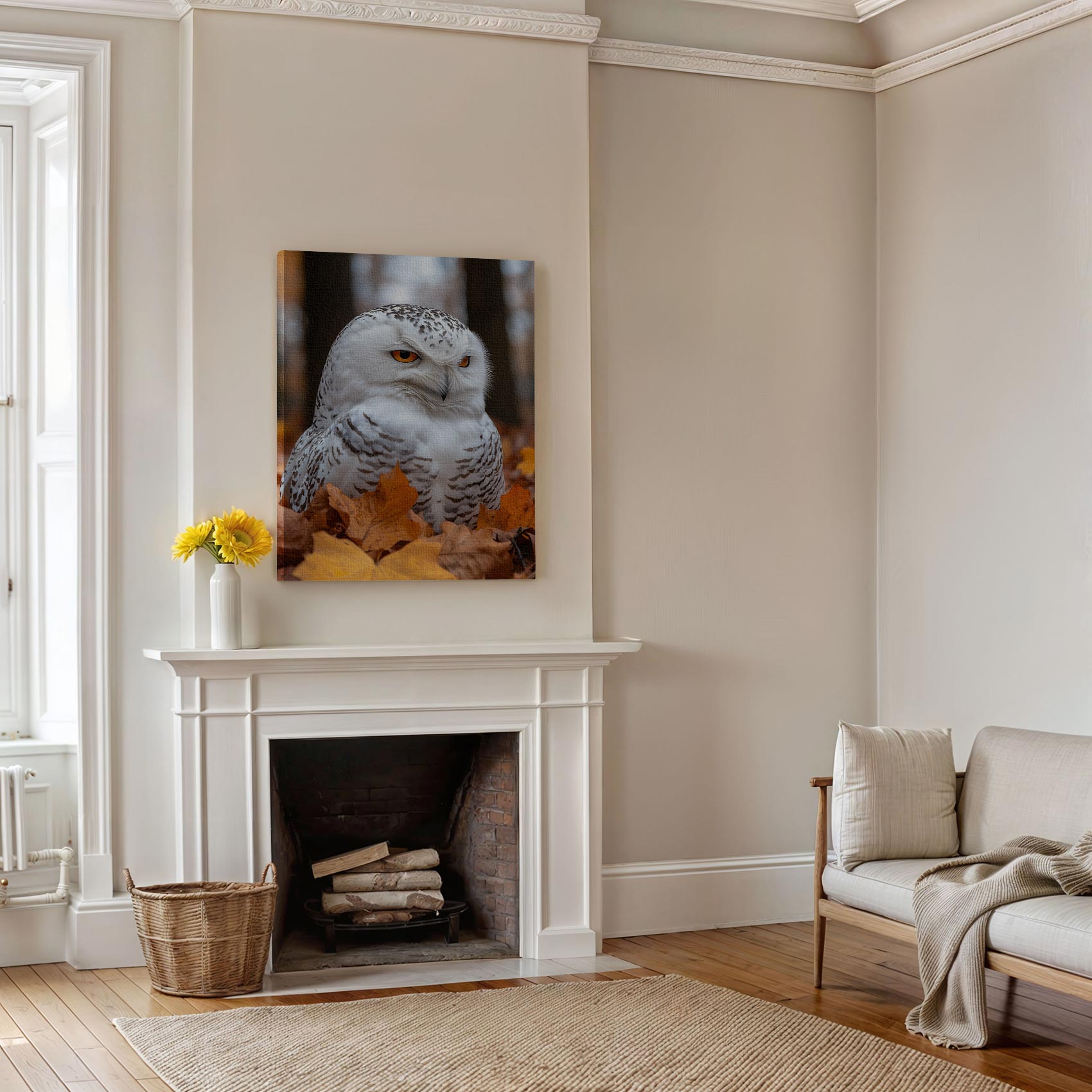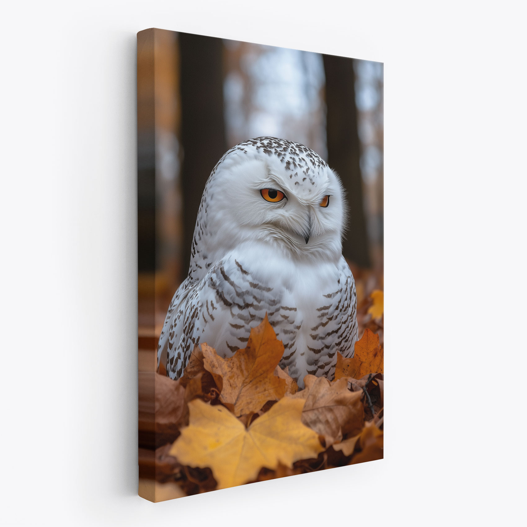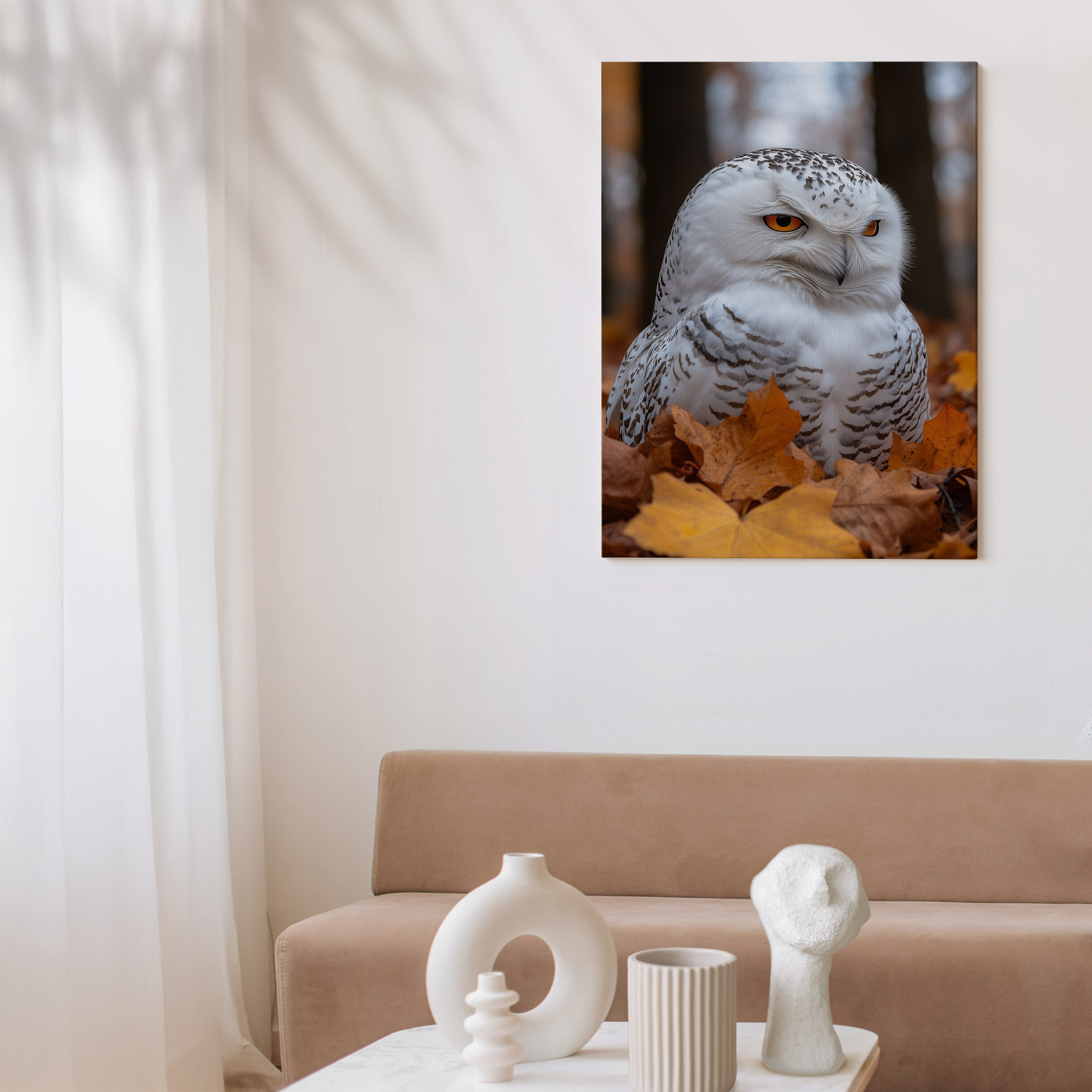 Terug naar collectie Canvas Herfstige sneeuwuil op bladeren