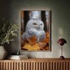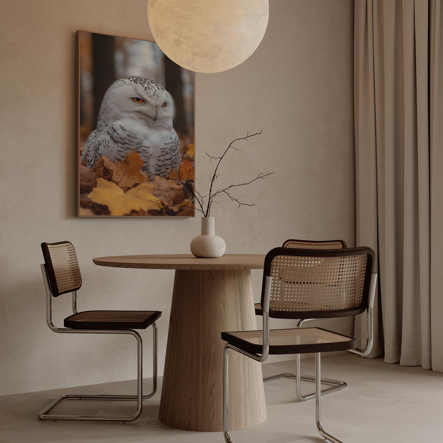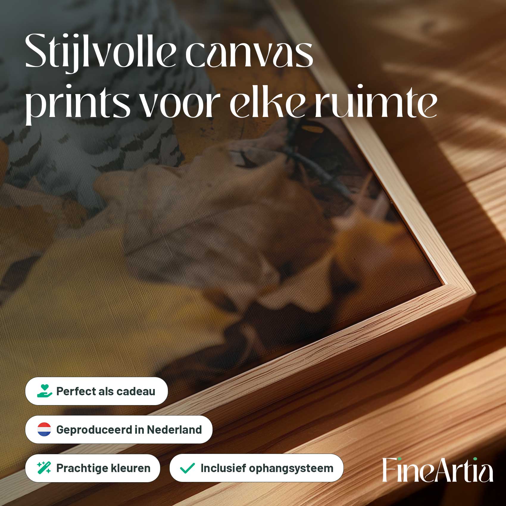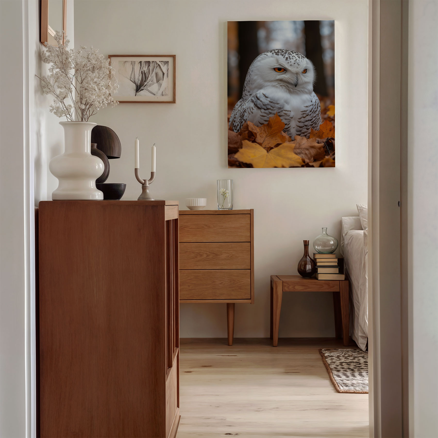 Terug naar collectie Canvas Herfstige sneeuwuil op bladeren