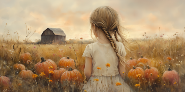 Herfstmagie: Meisje tussen pompoenenvelden