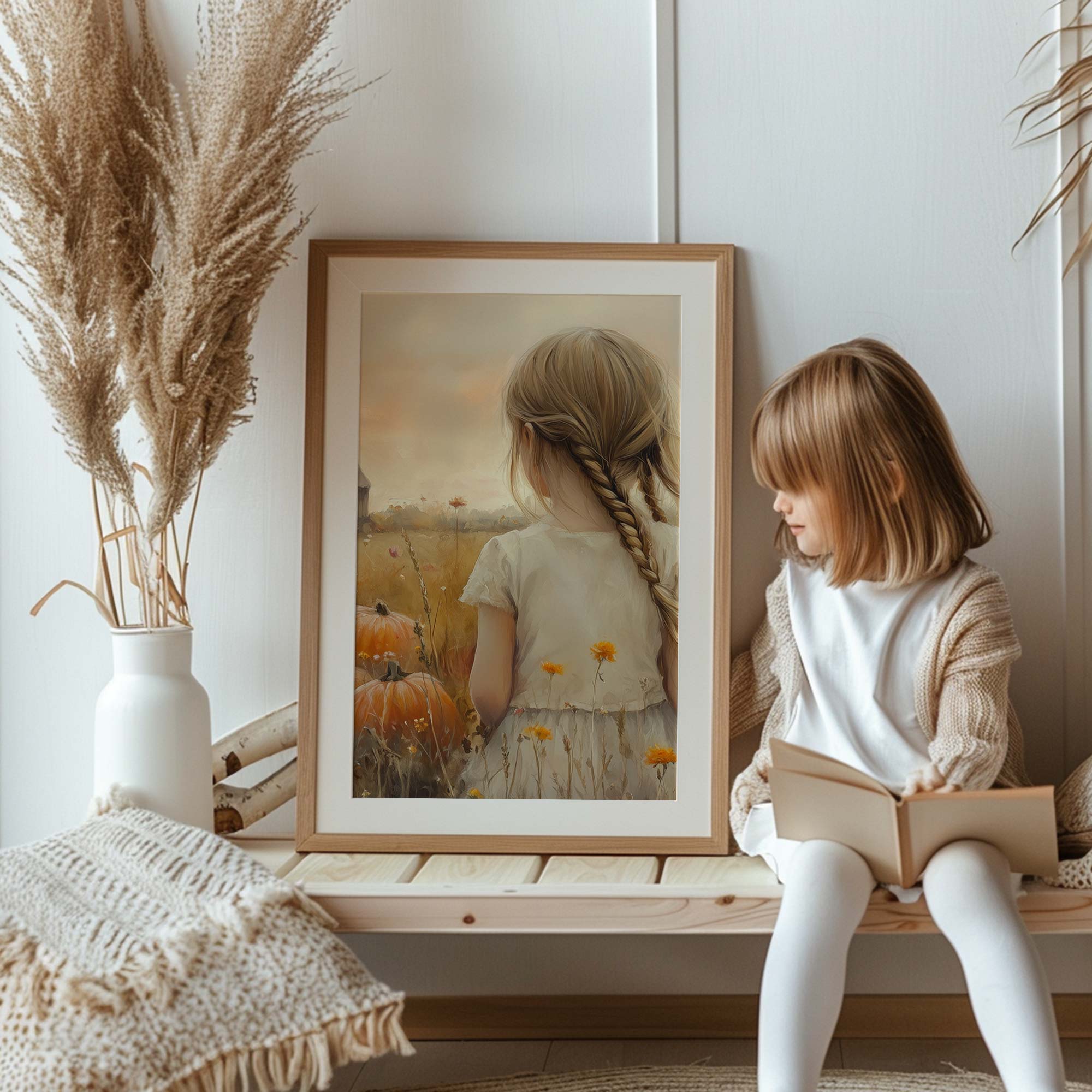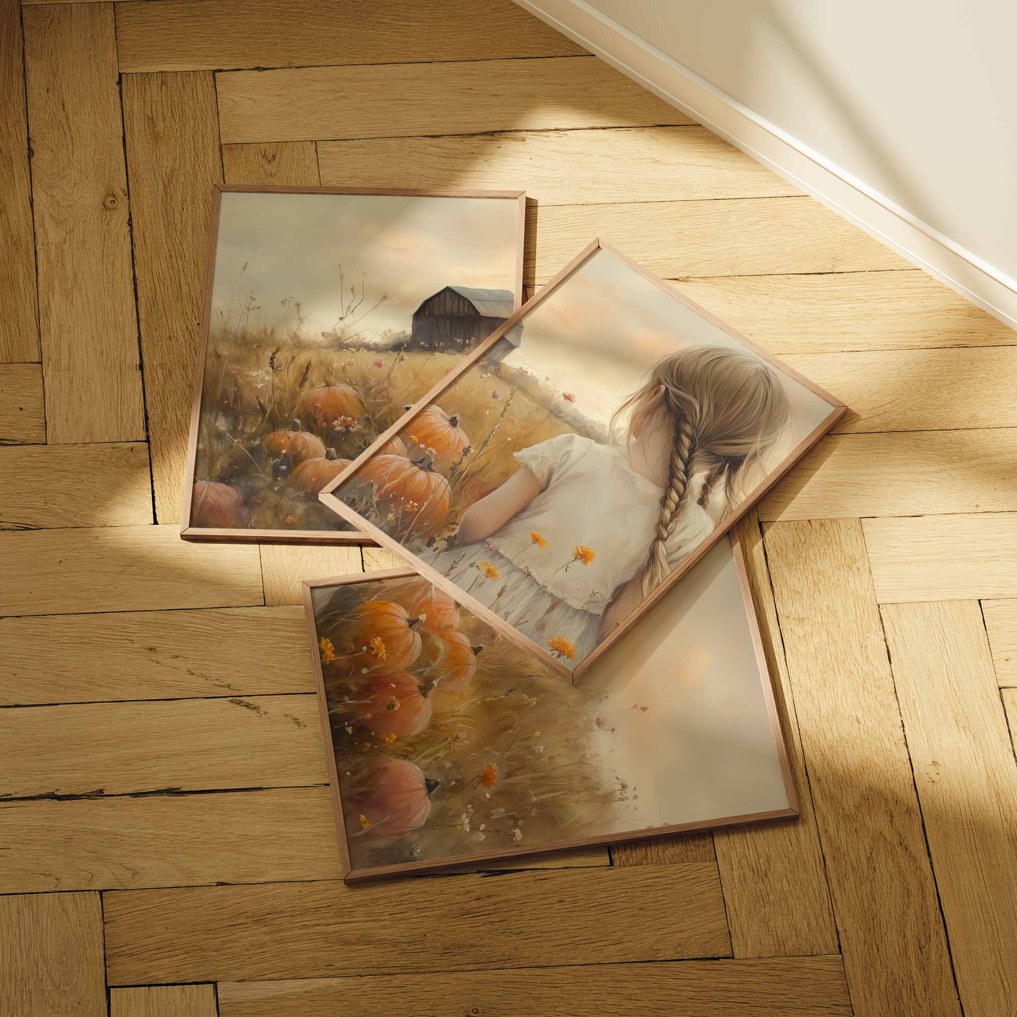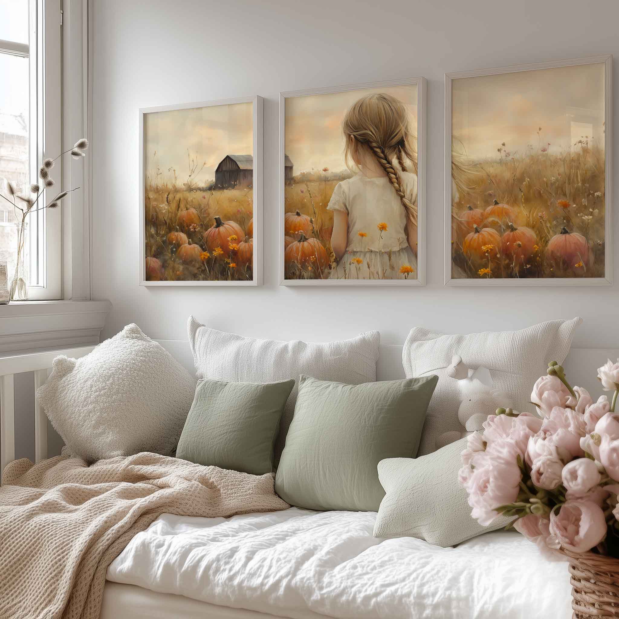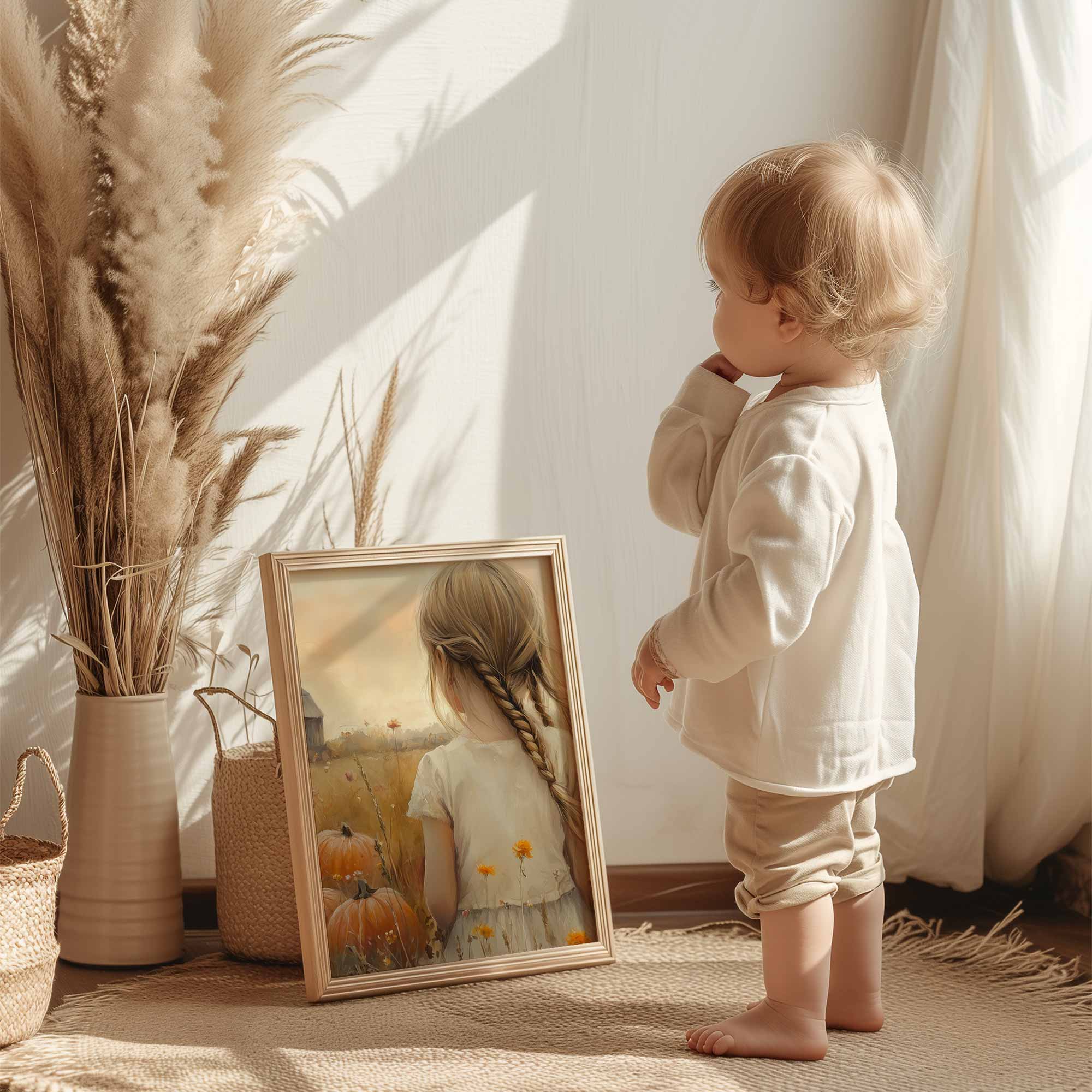 Terug naar collectie Posters Herfstmagie: Meisje tussen pompoenenvelden