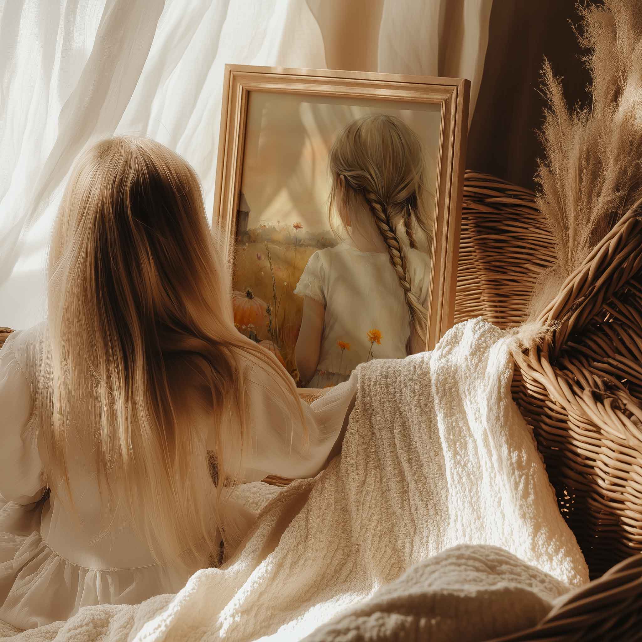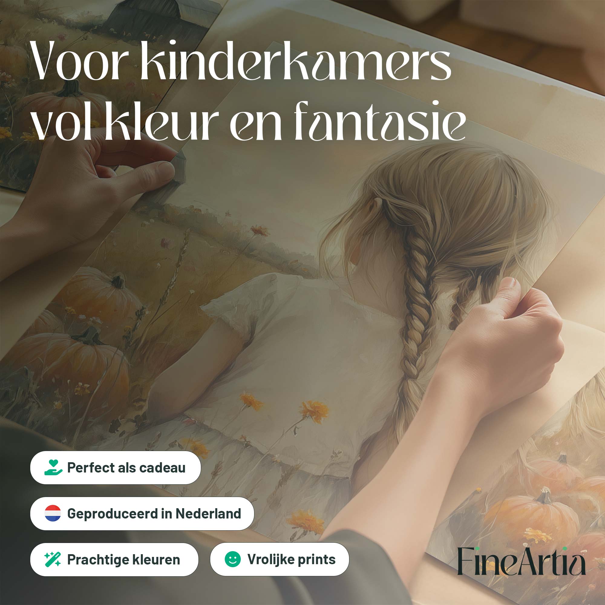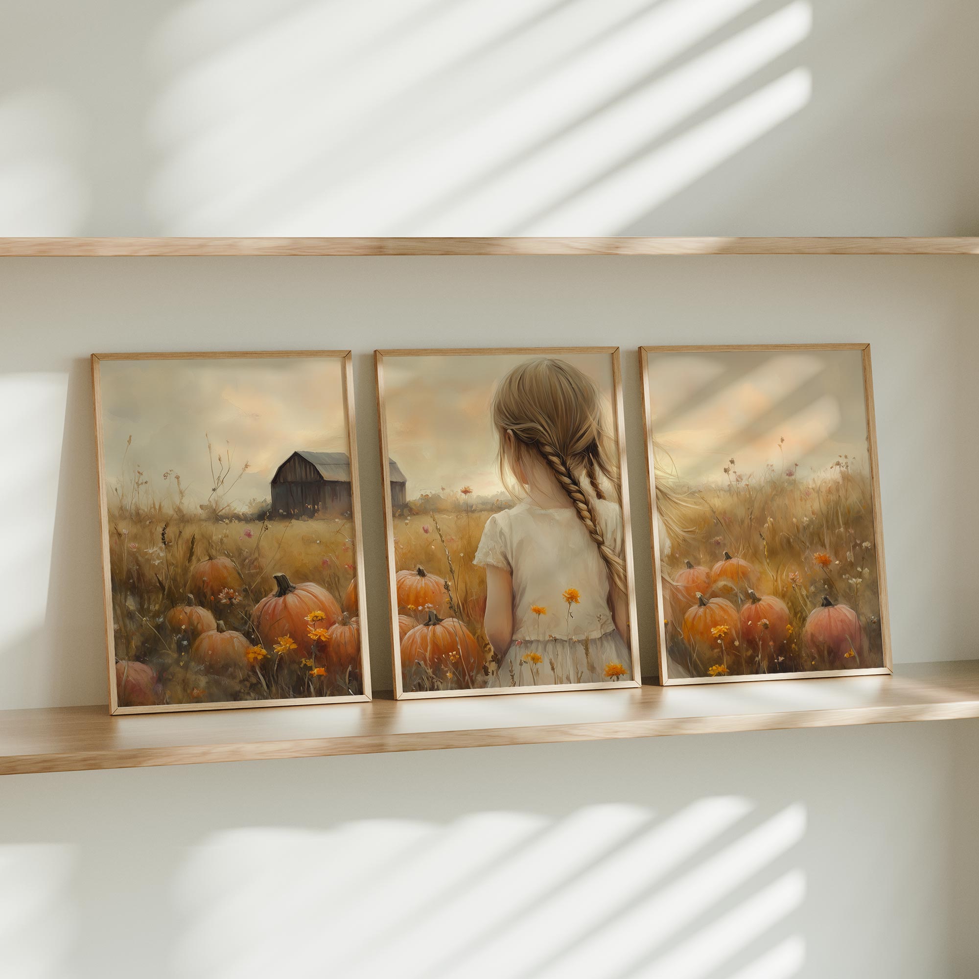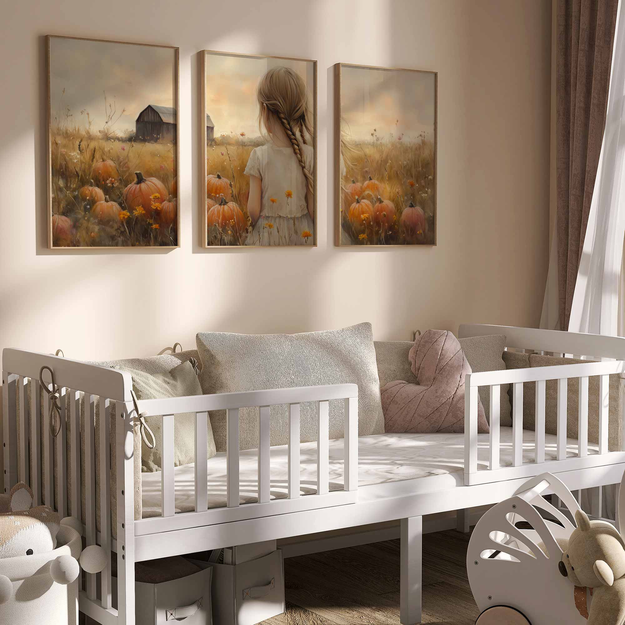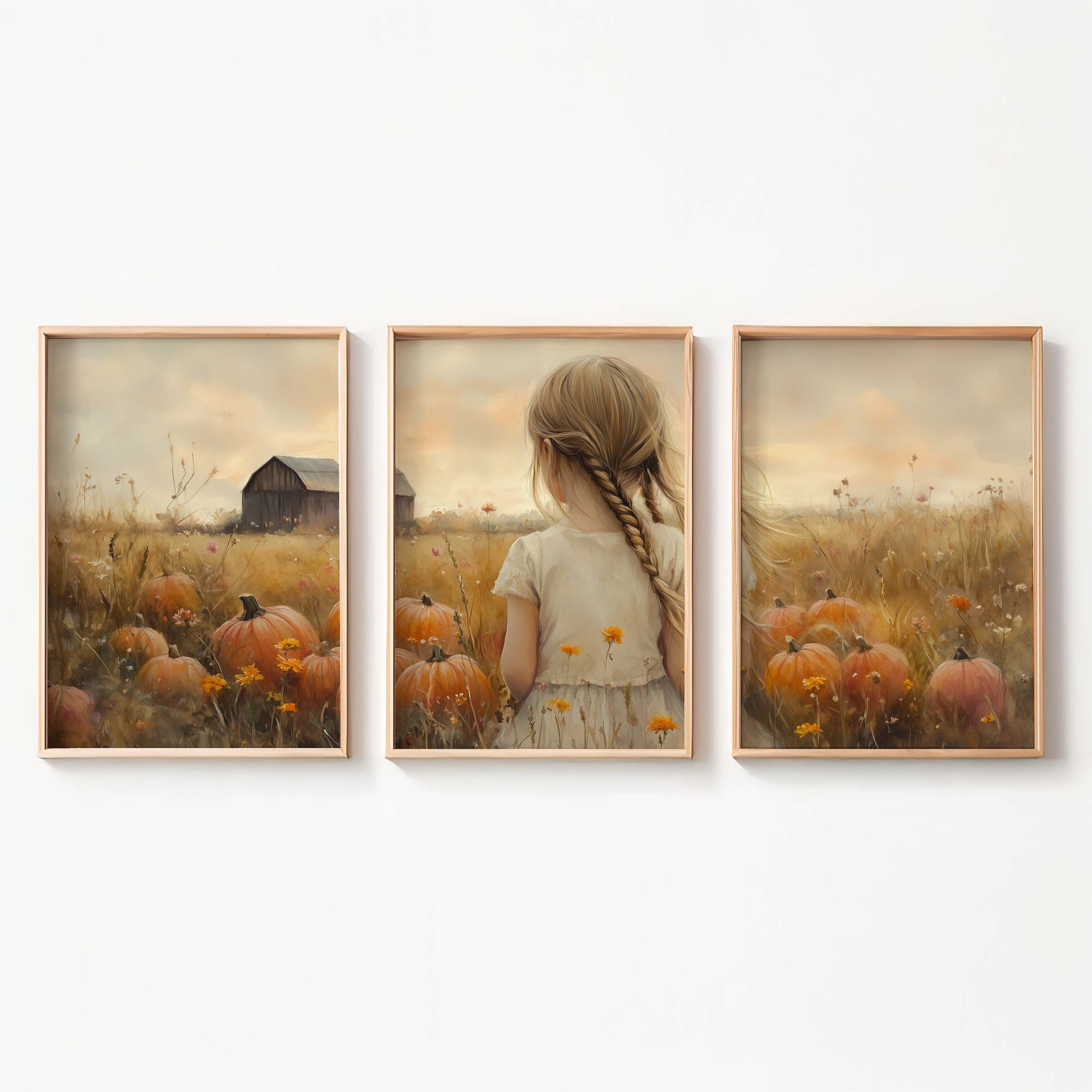 Terug naar collectie Posters Herfstmagie: Meisje tussen pompoenenvelden