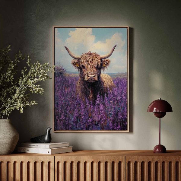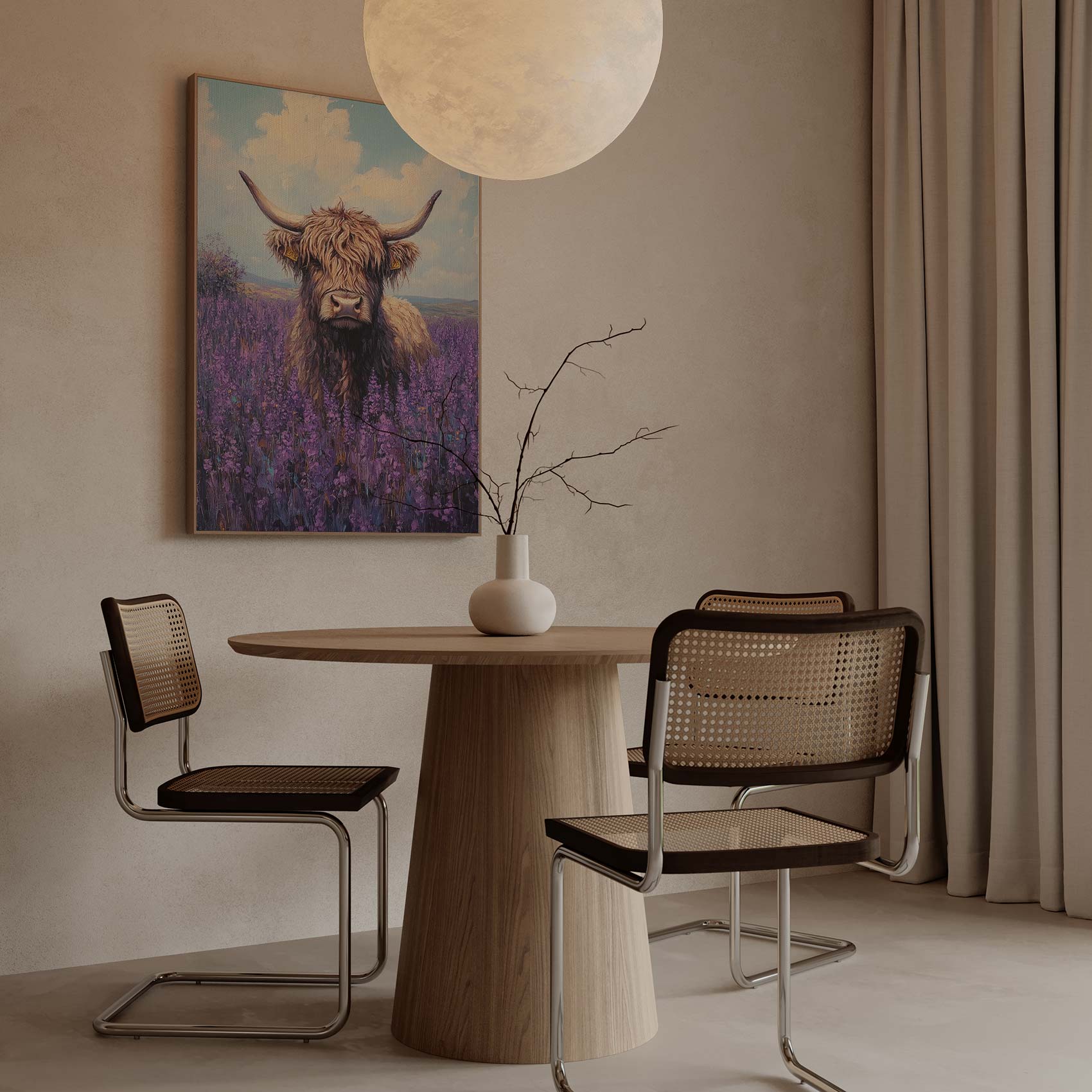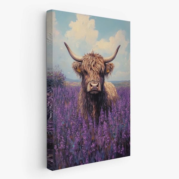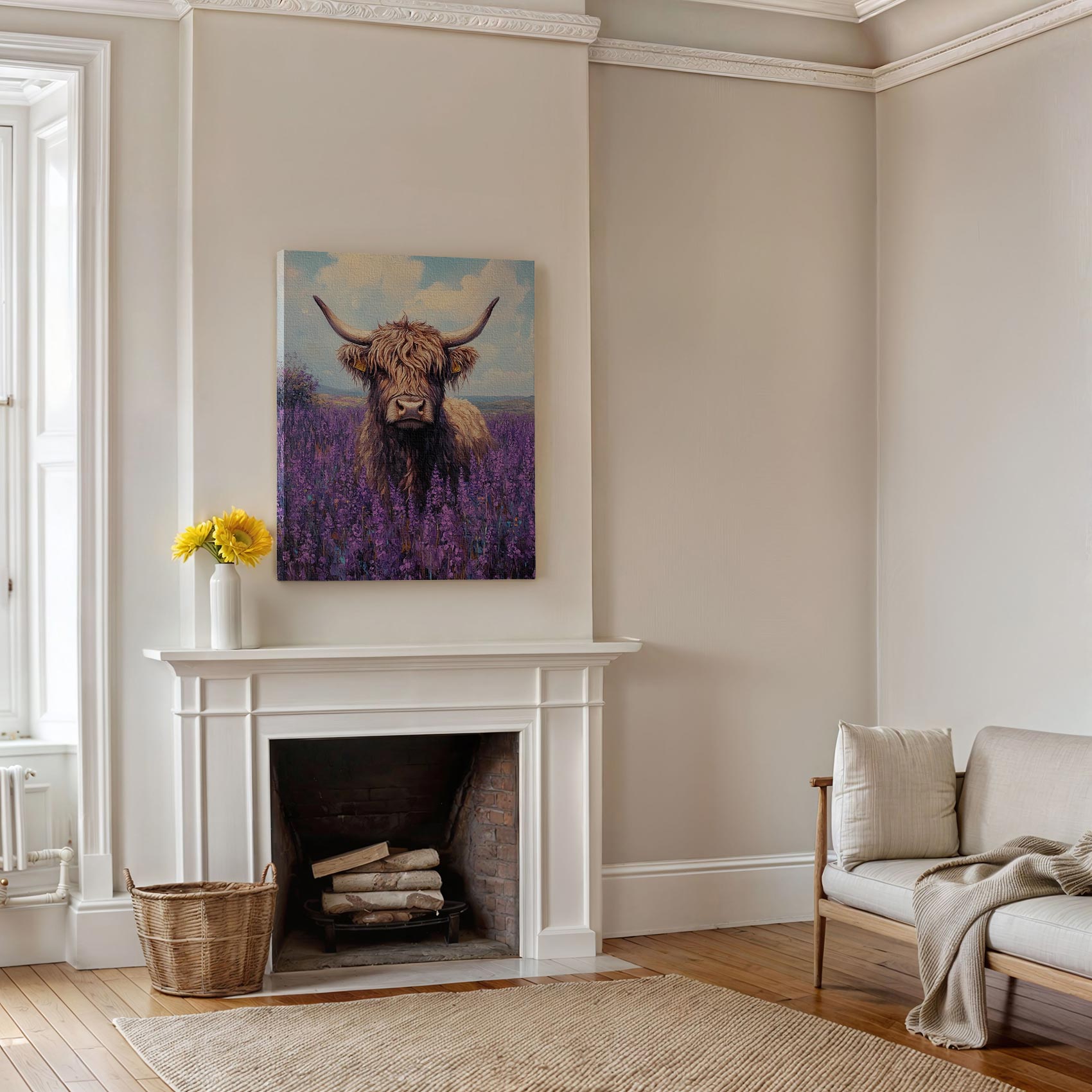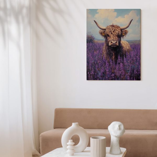 Terug naar collectie Canvas Impressionistische Schotse hooglander in paarse bloemen