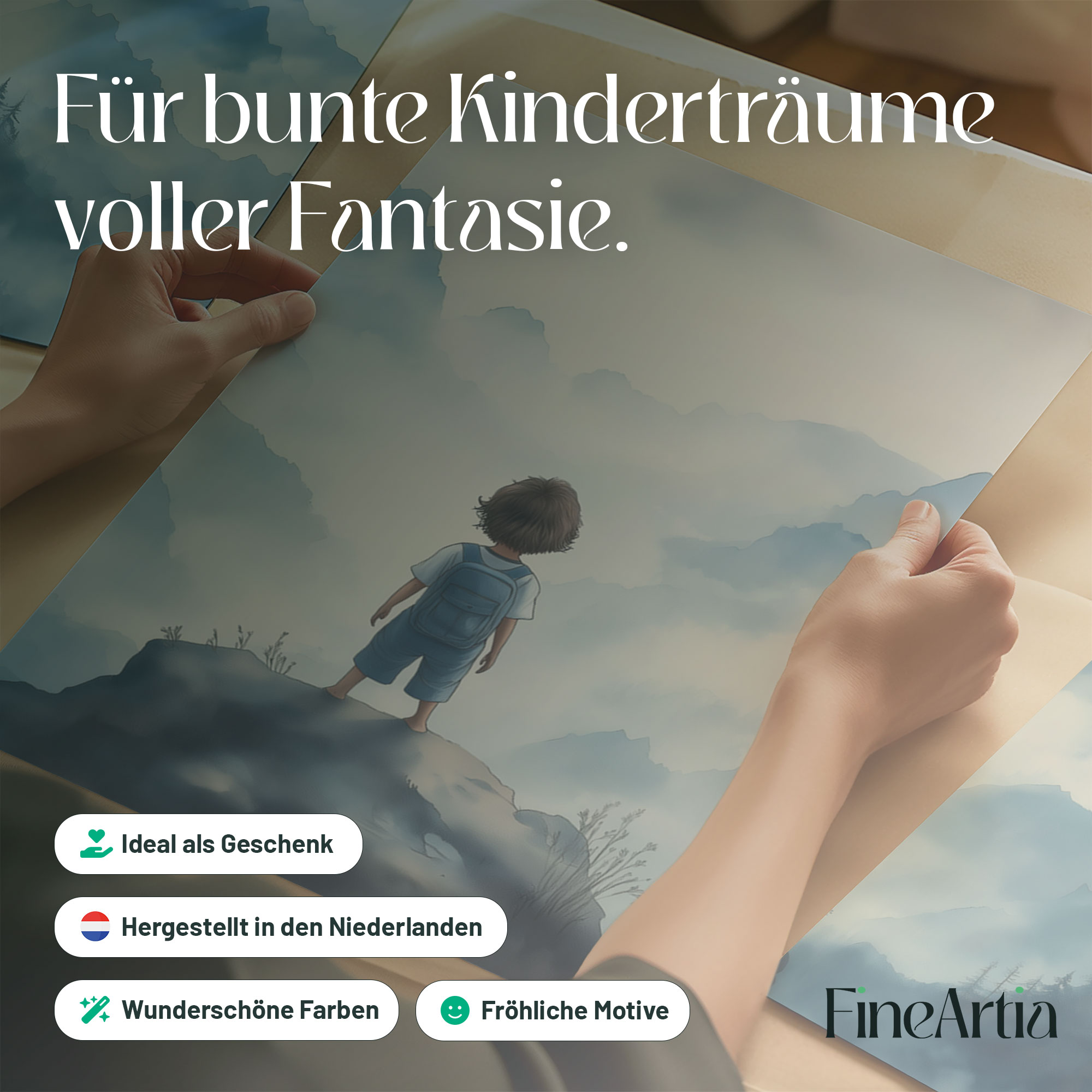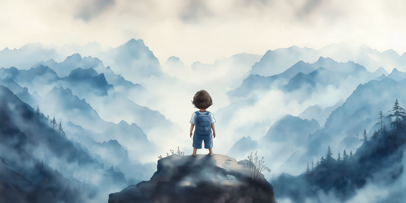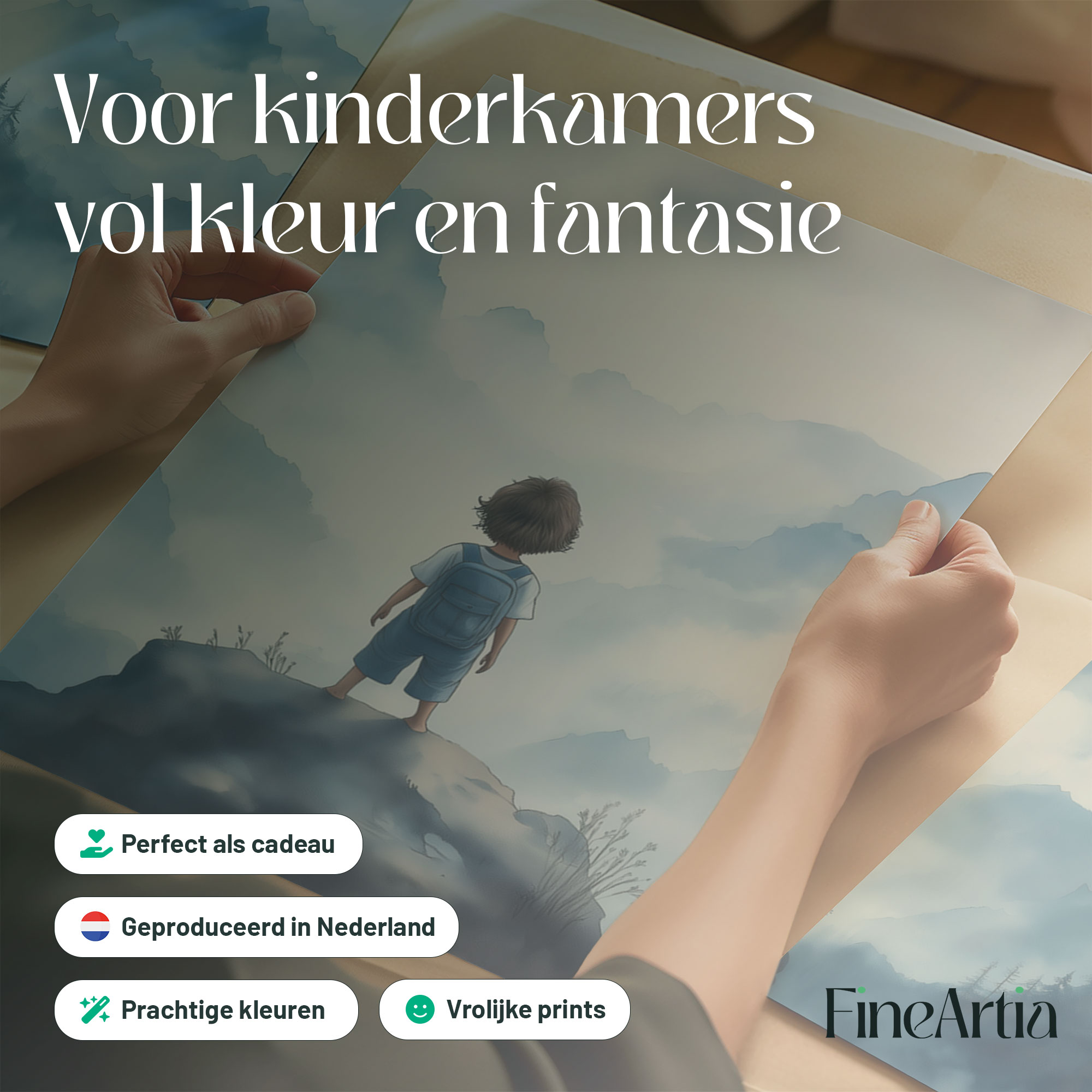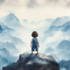 Jonge Avonturier in Mistige Bergen – Droom en Ontdek
