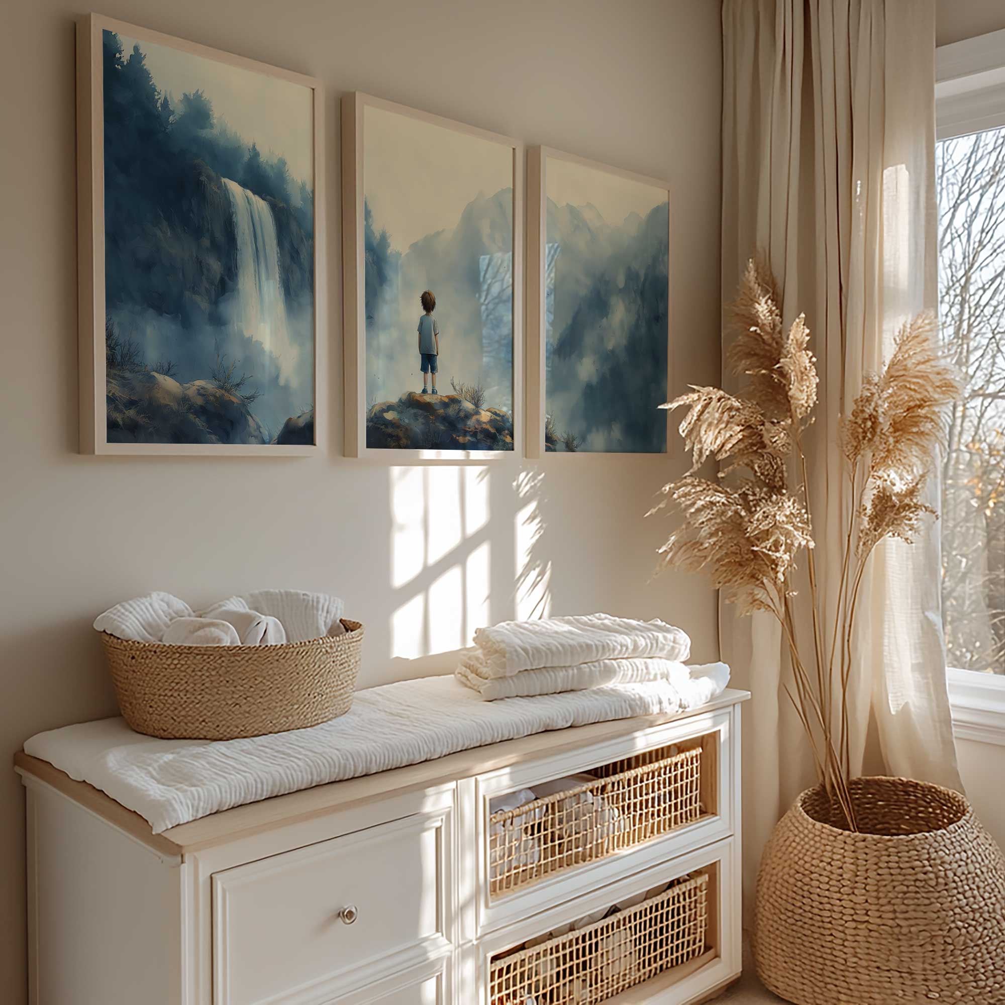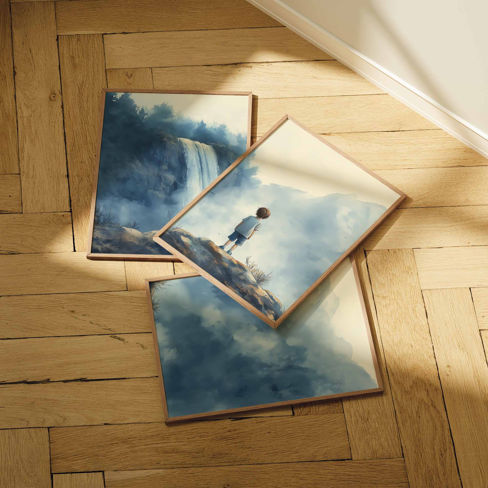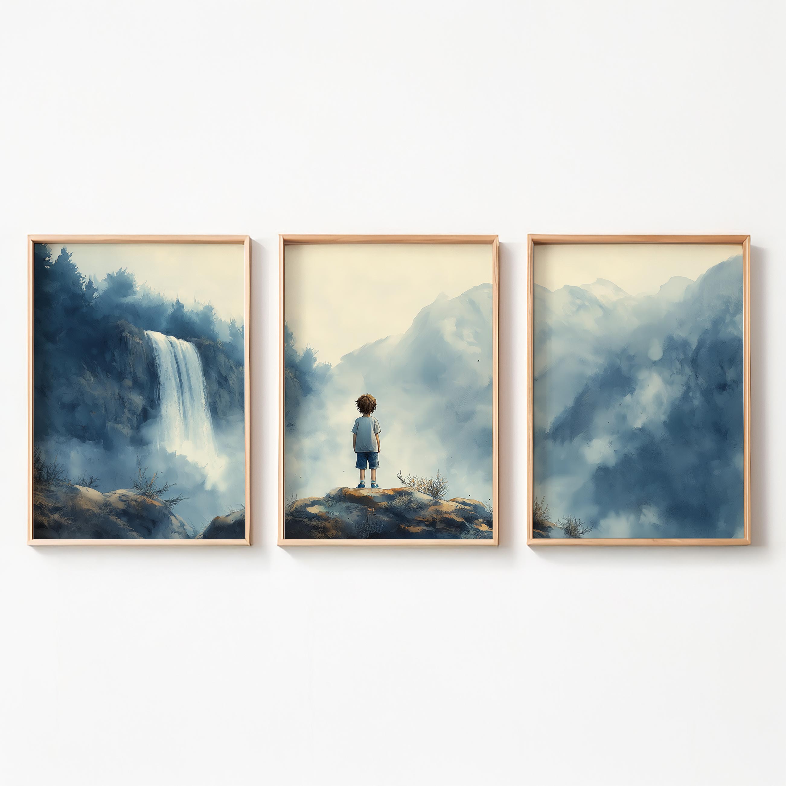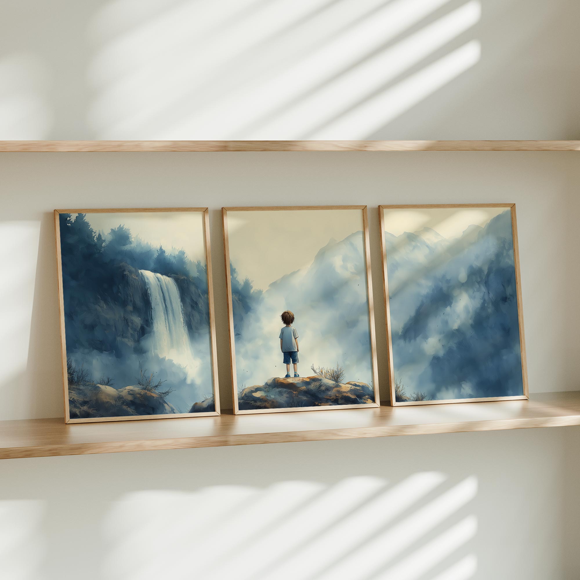 Jongen bij de Waterval – Dromerig Landschap in Blauw en Groen