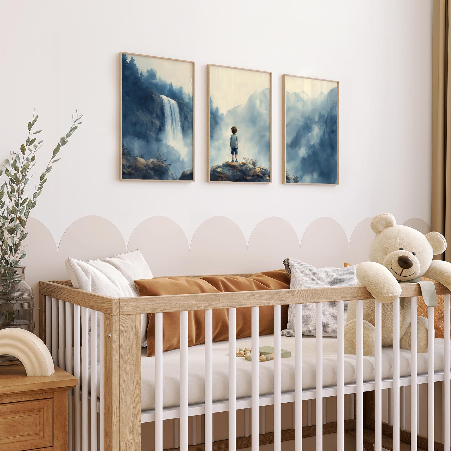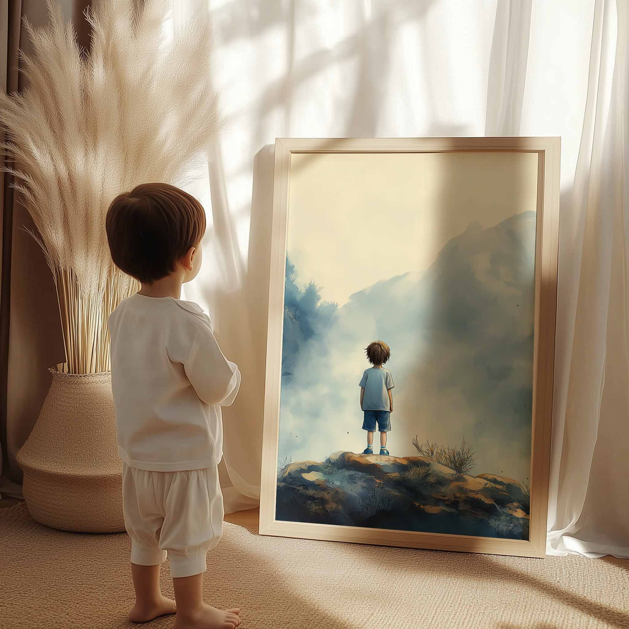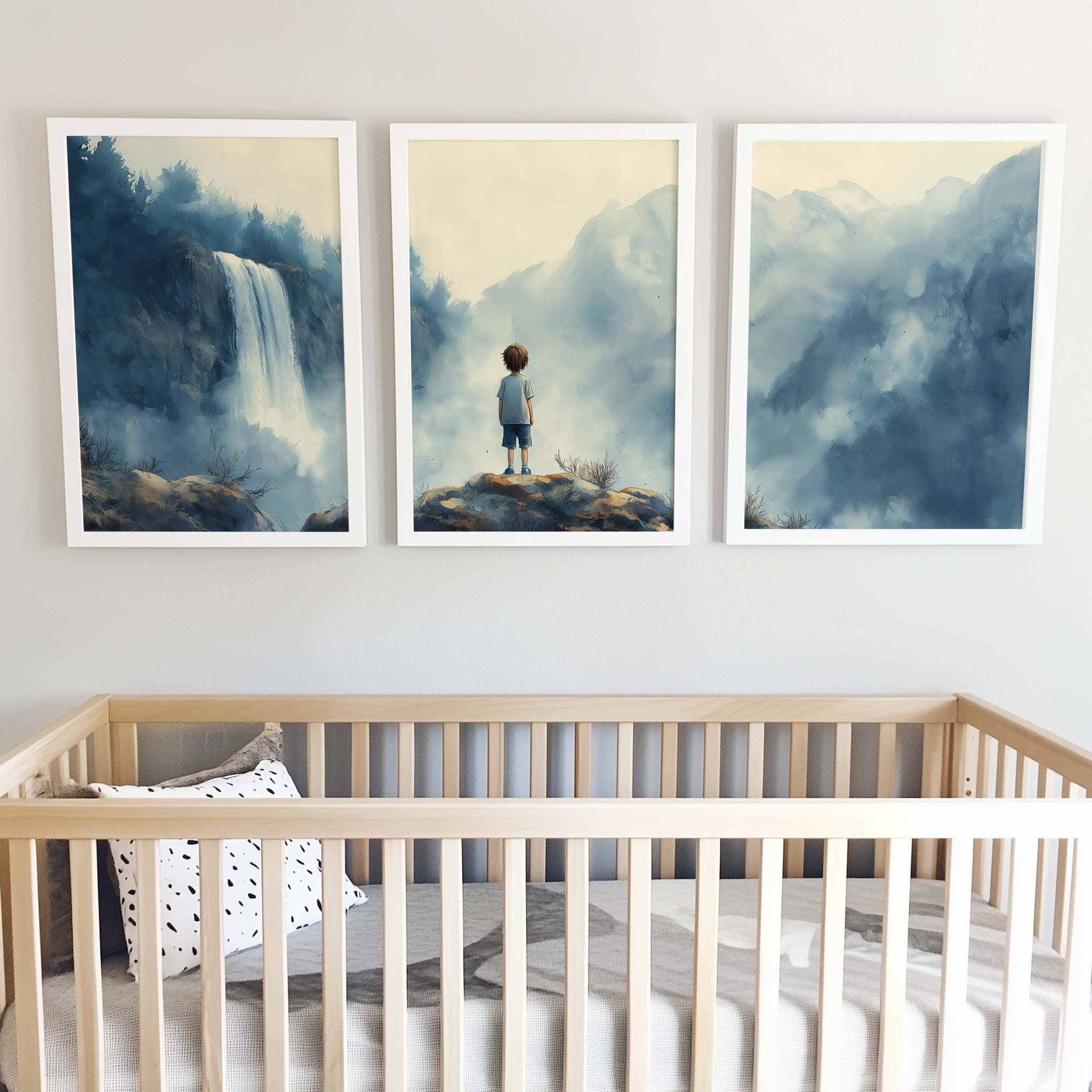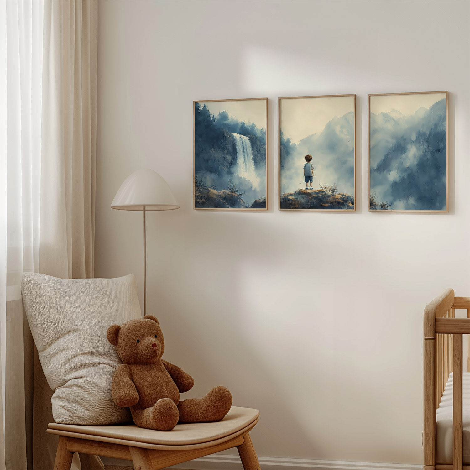 Jongen bij de Waterval – Dromerig Landschap in Blauw en Groen