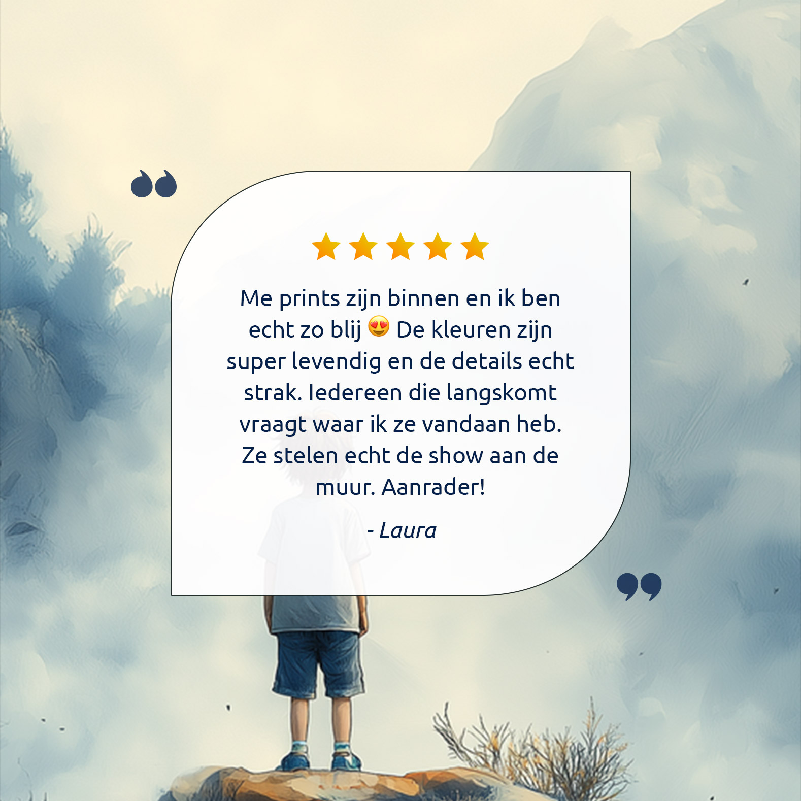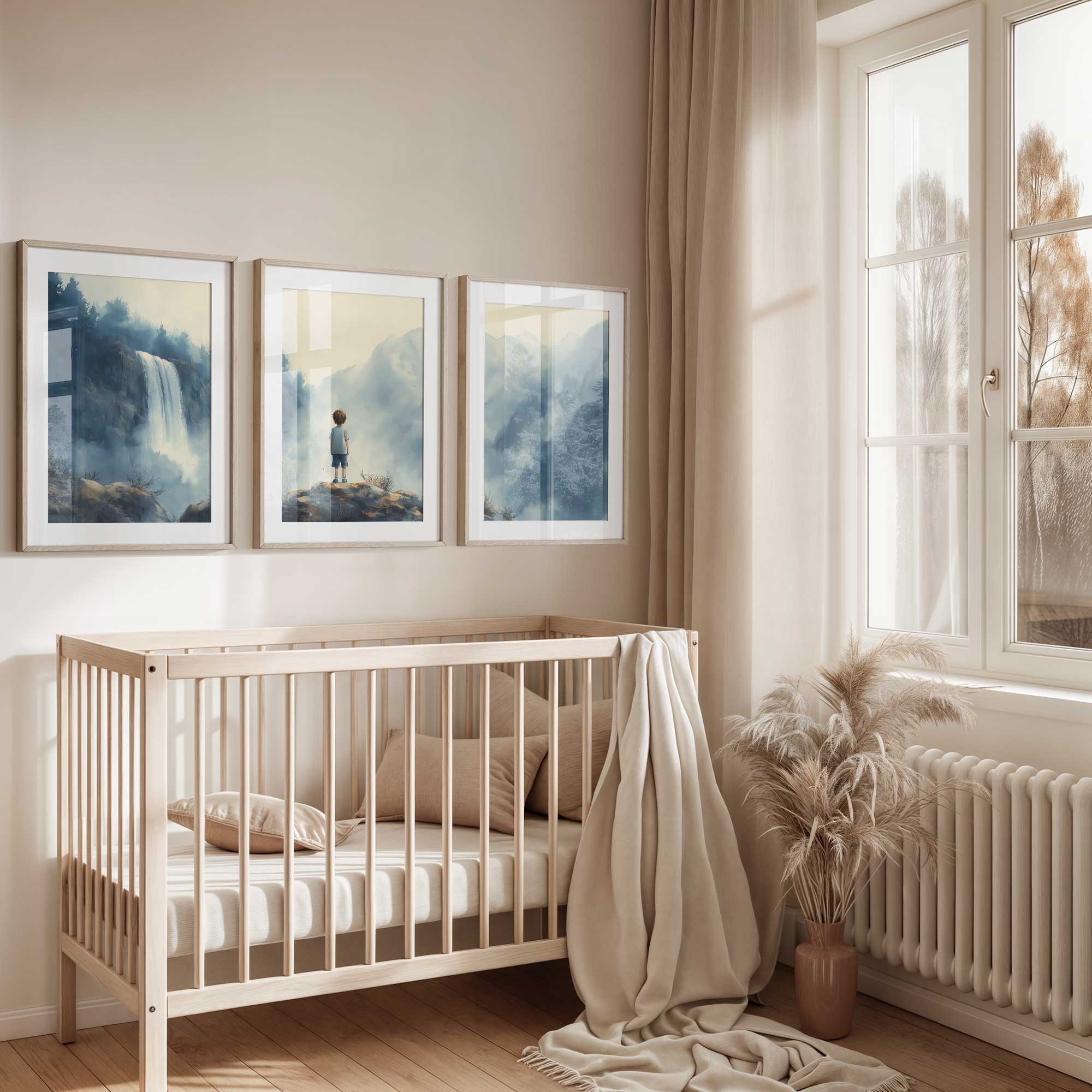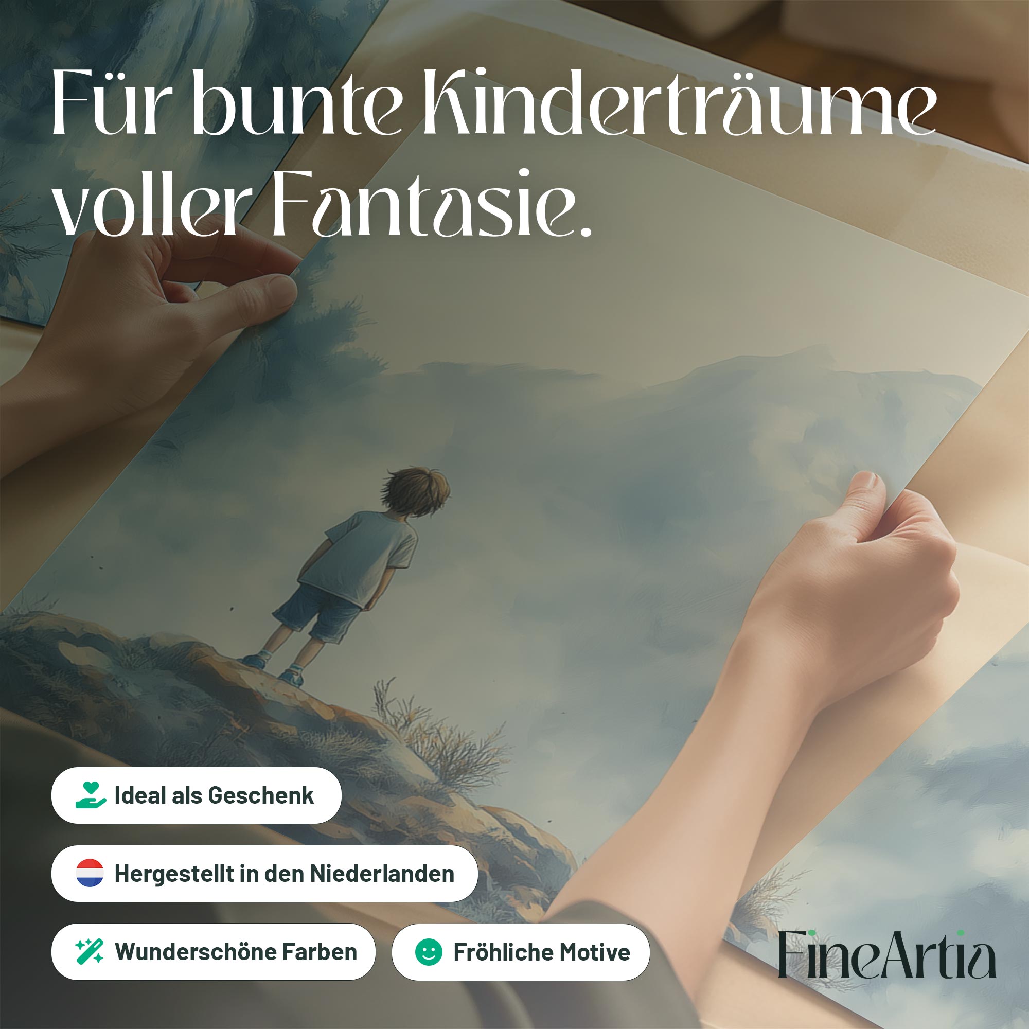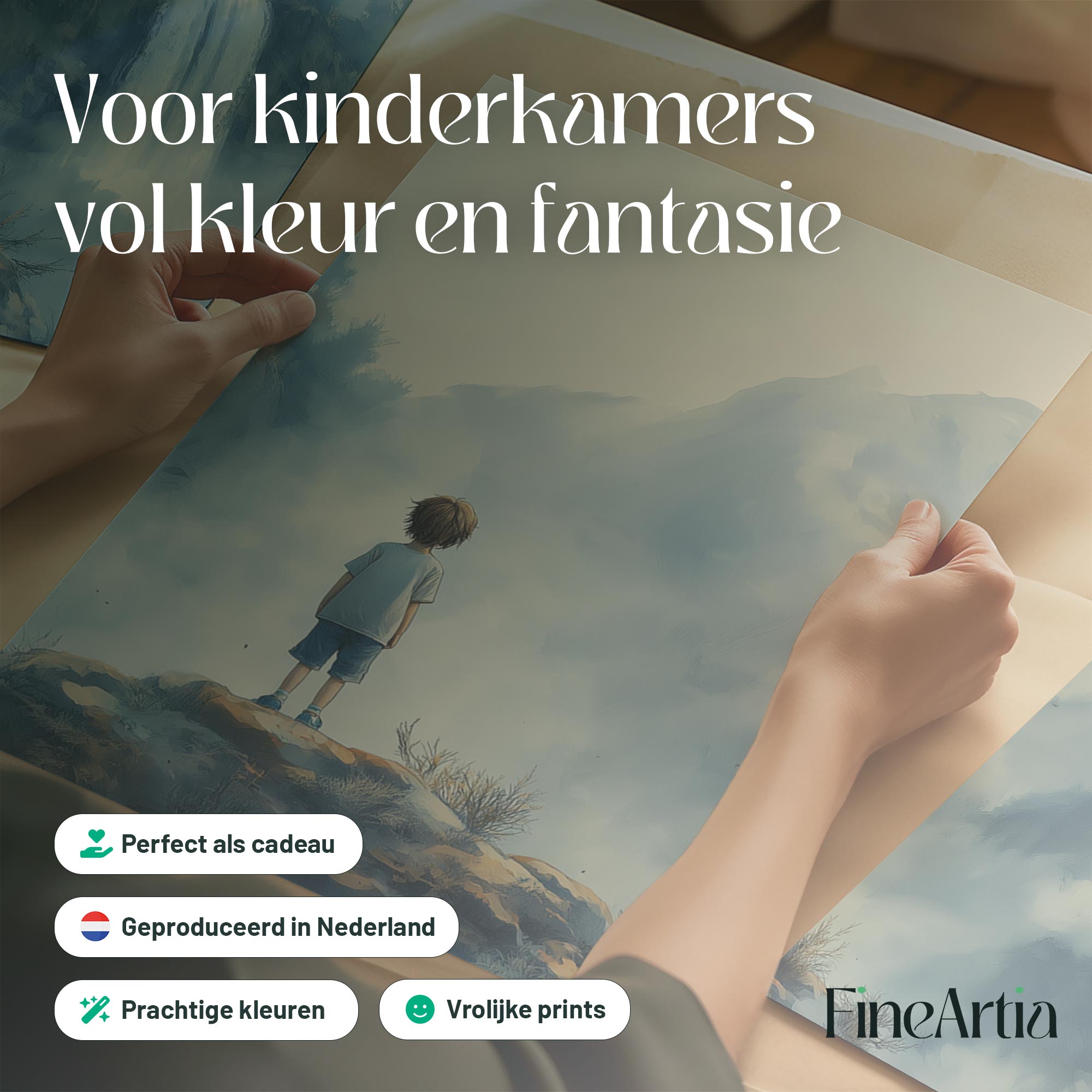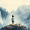 Jongen bij de Waterval – Dromerig Landschap in Blauw en Groen
