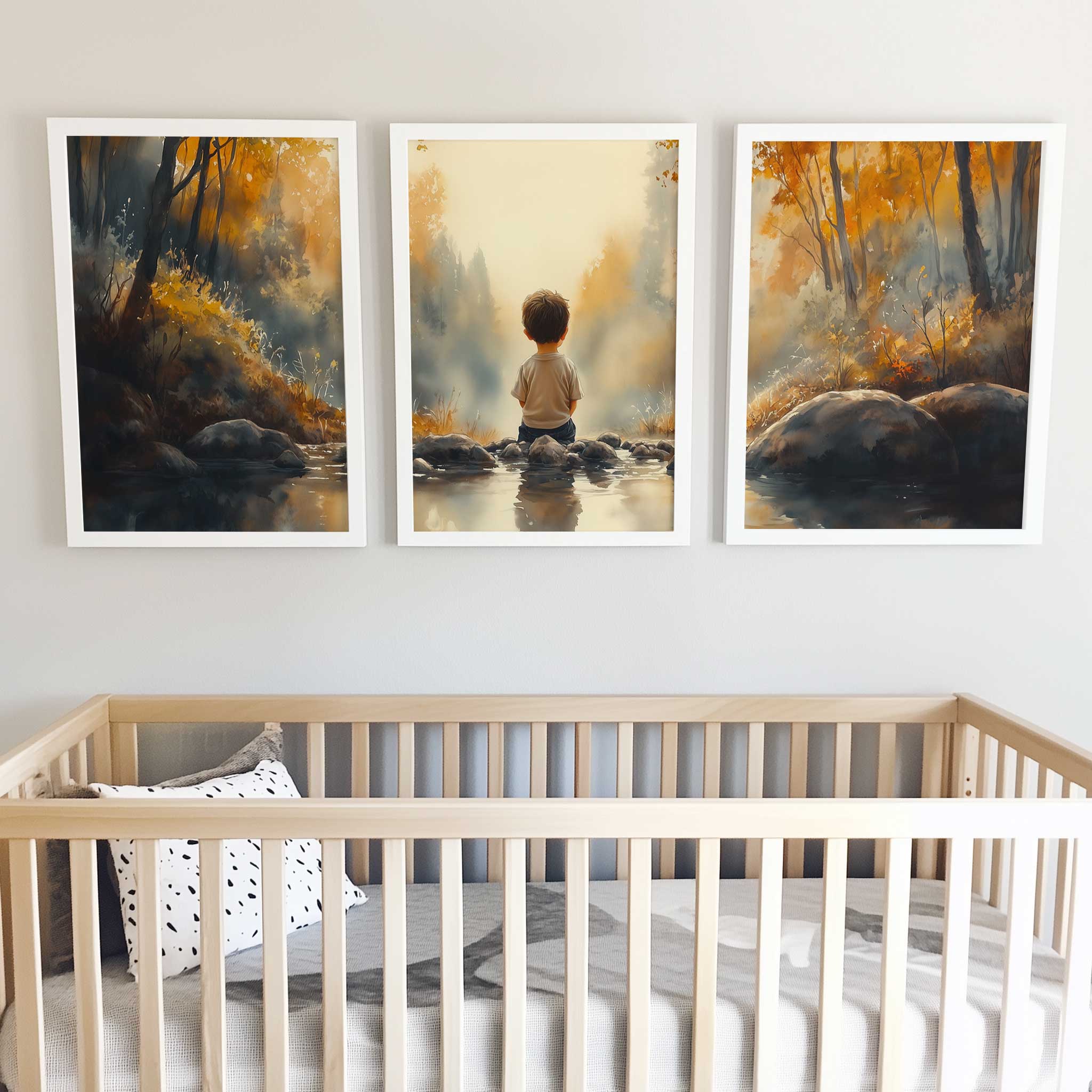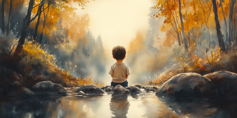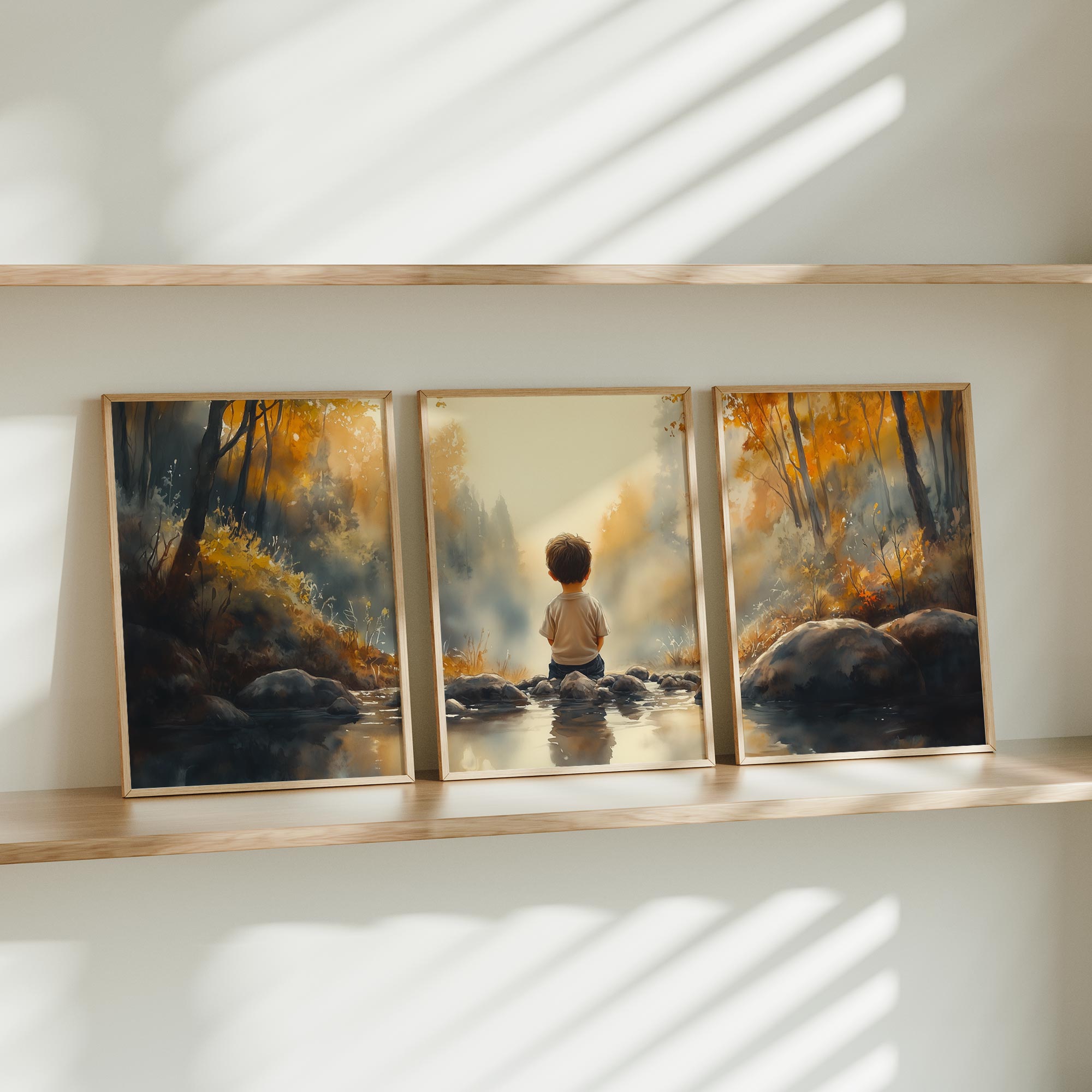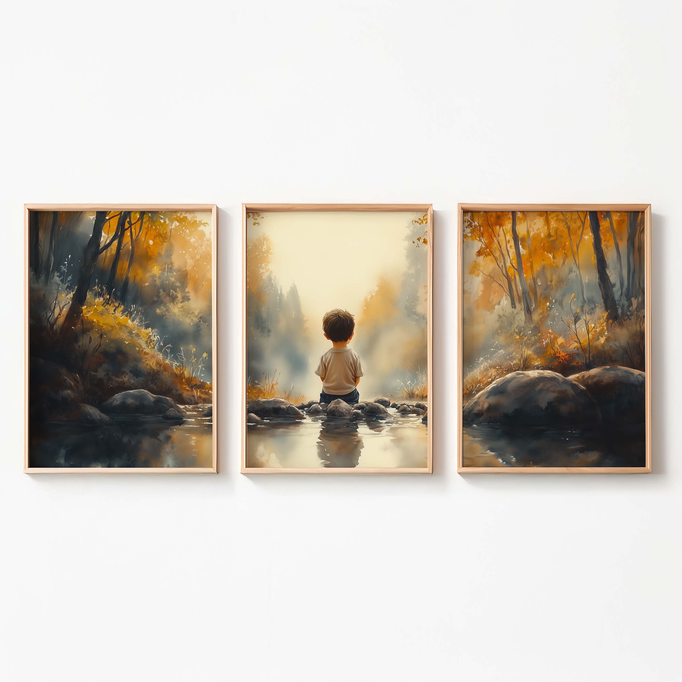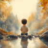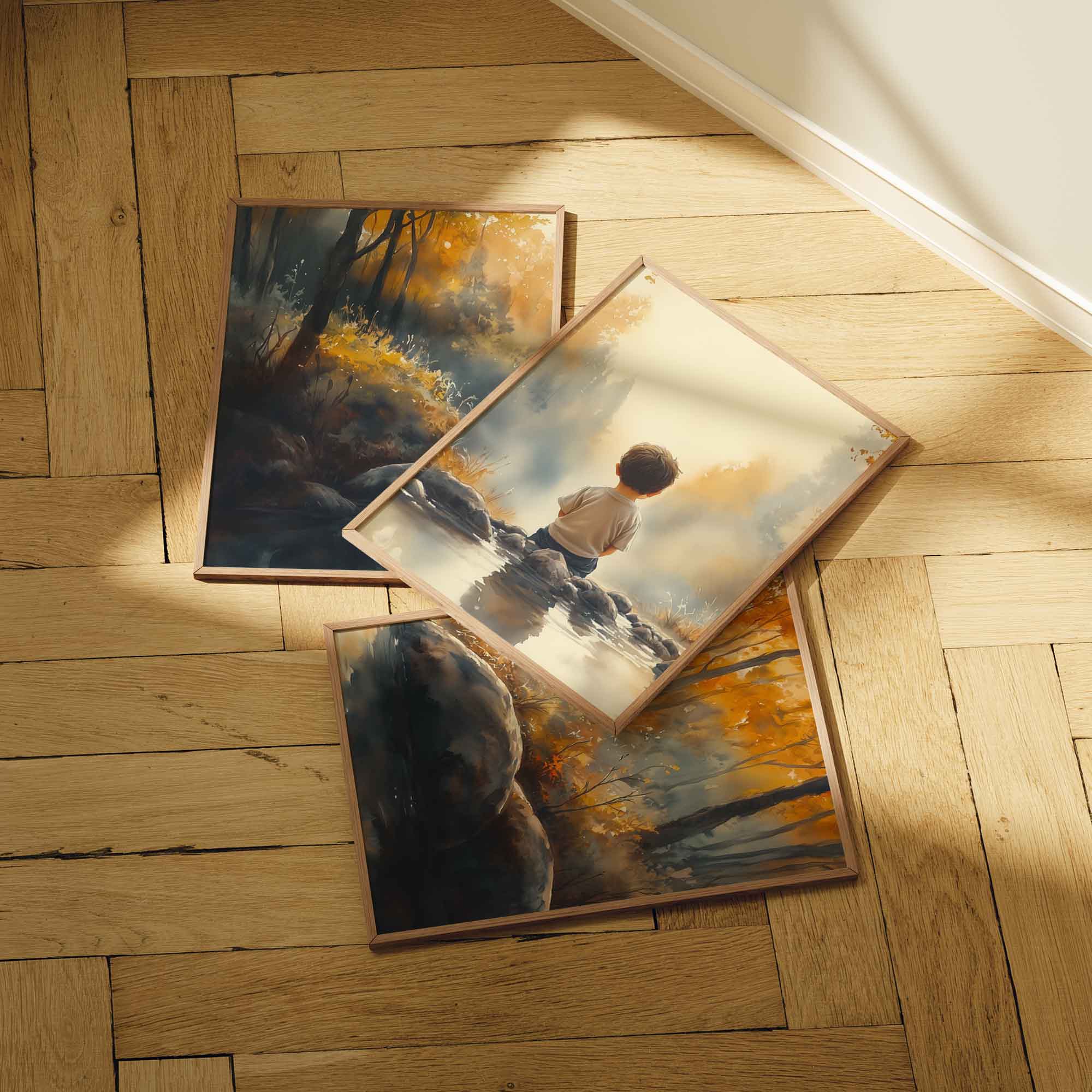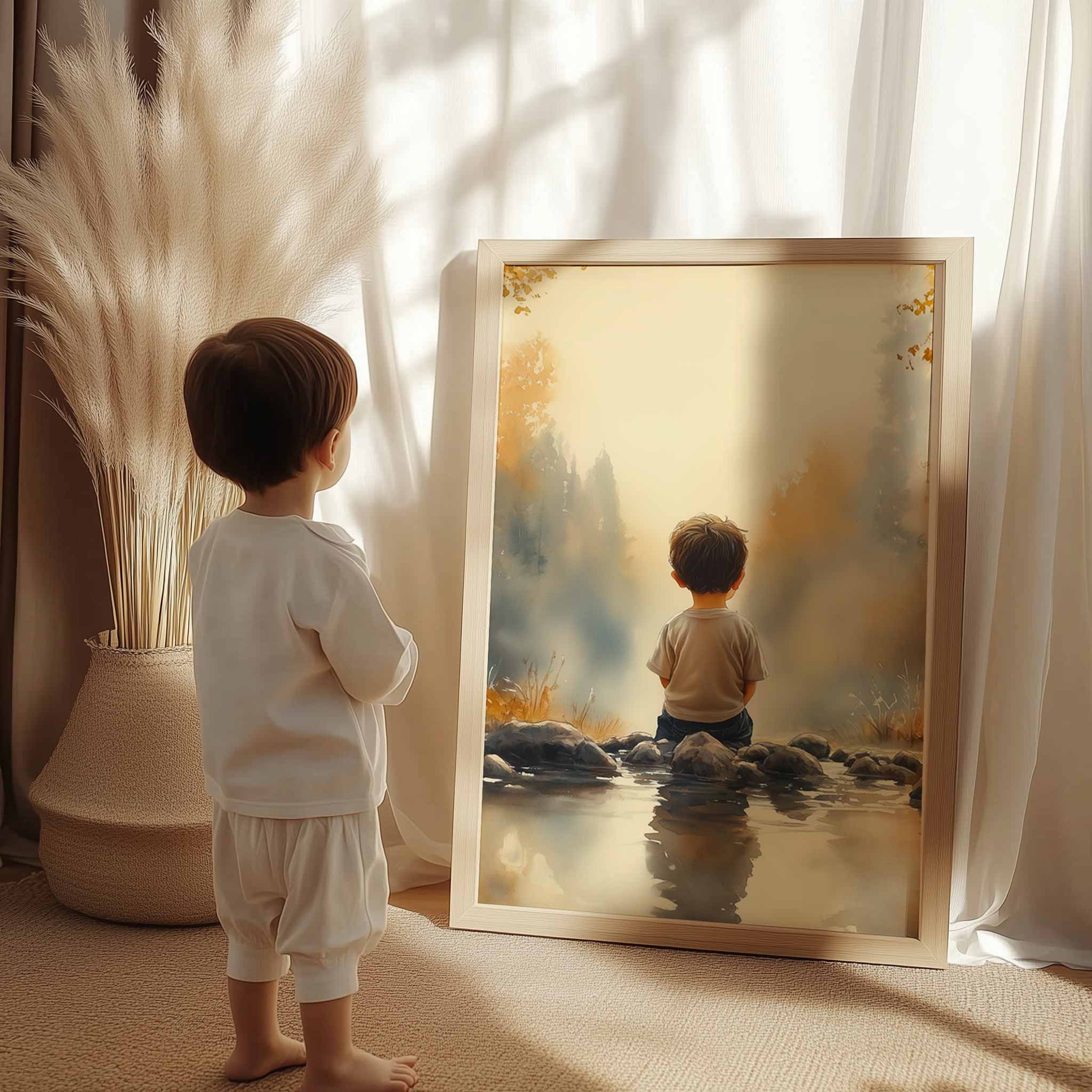 Jongen bij het water – Serene bosscène voor kinderkamers