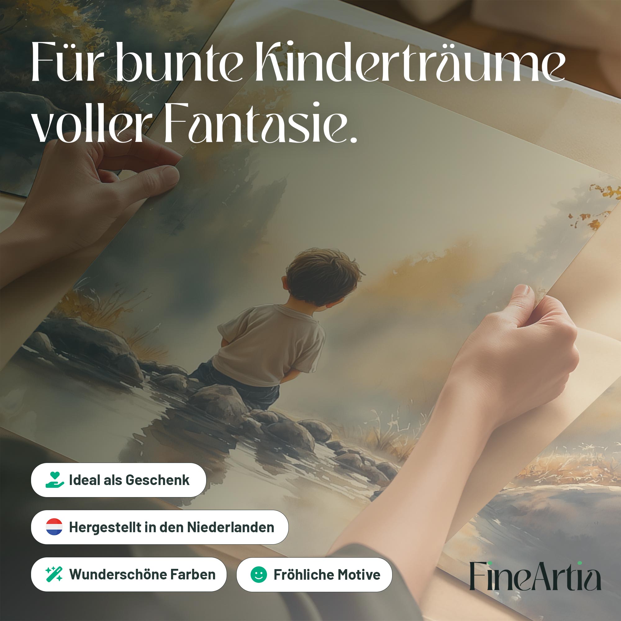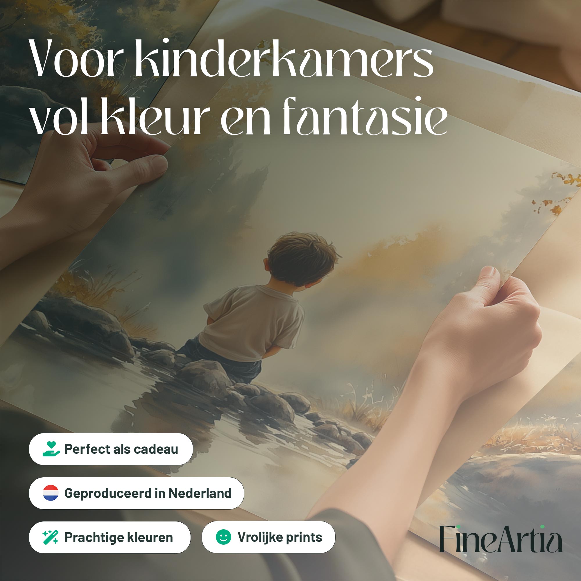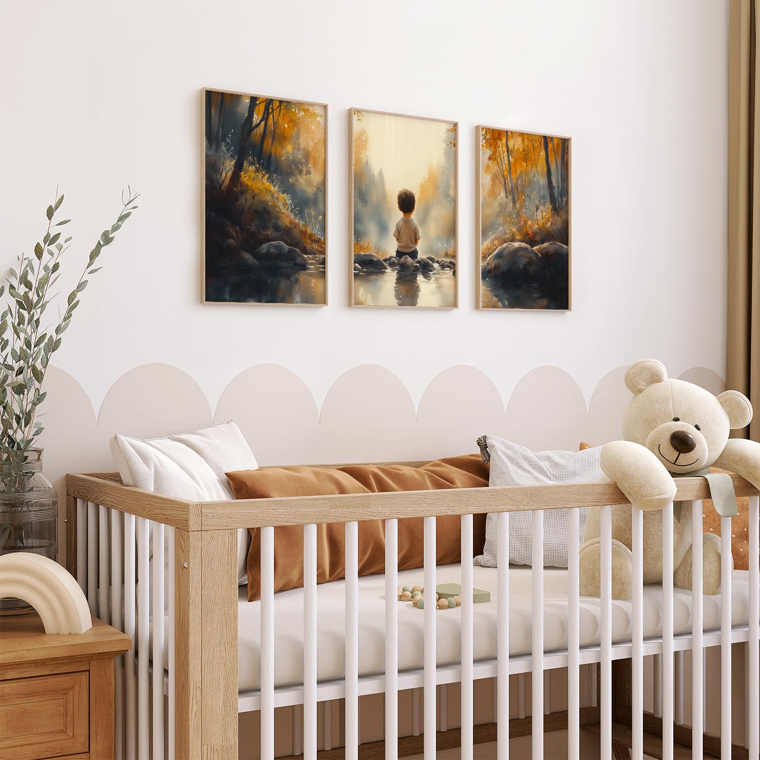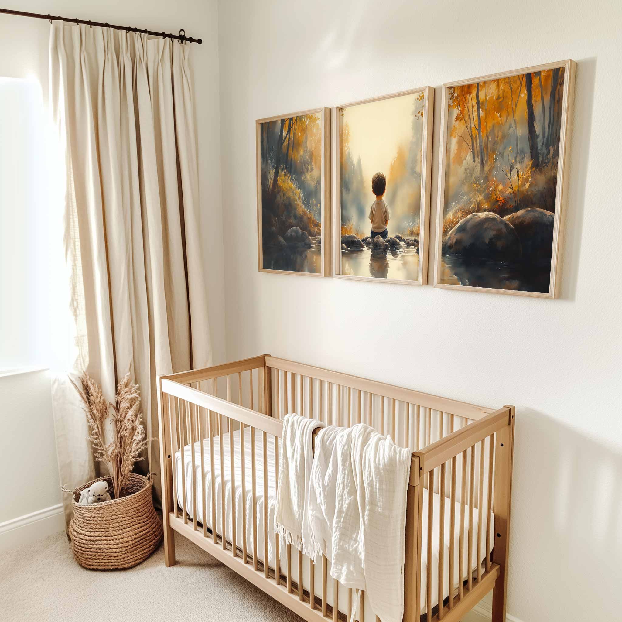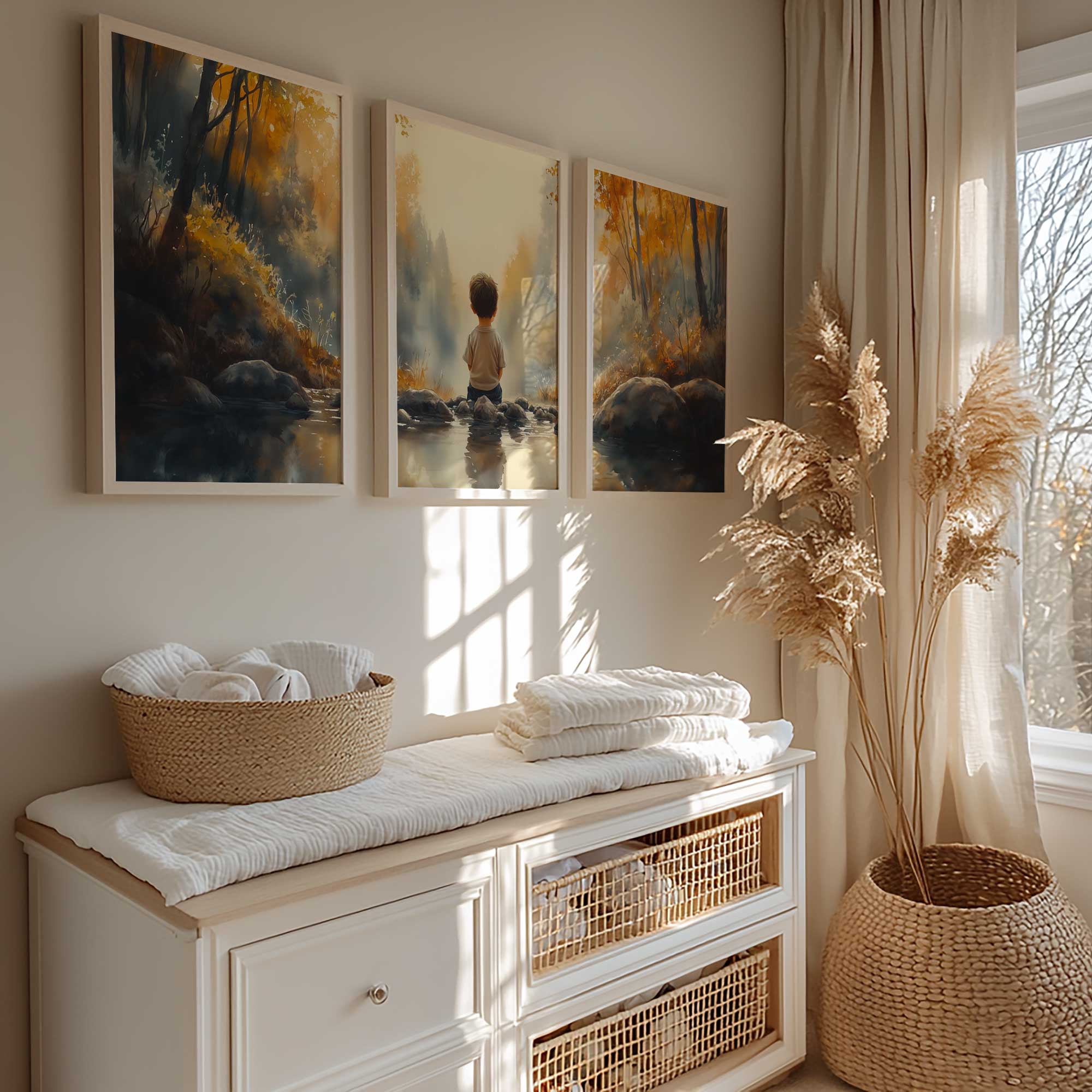 Jongen bij het water – Serene bosscène voor kinderkamers