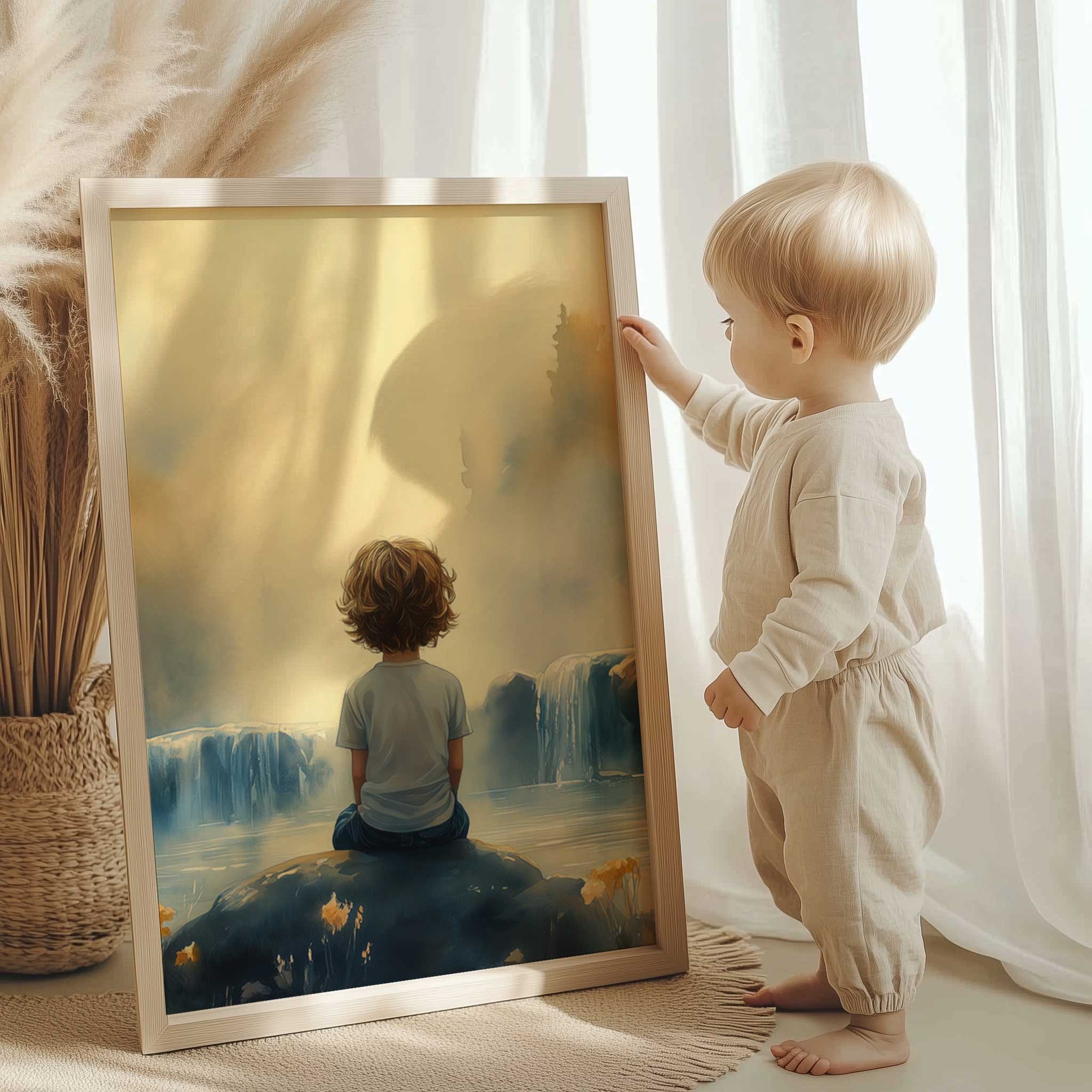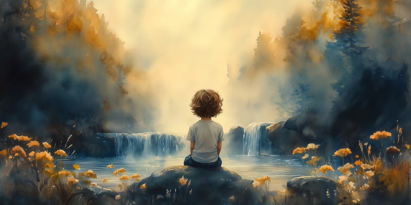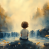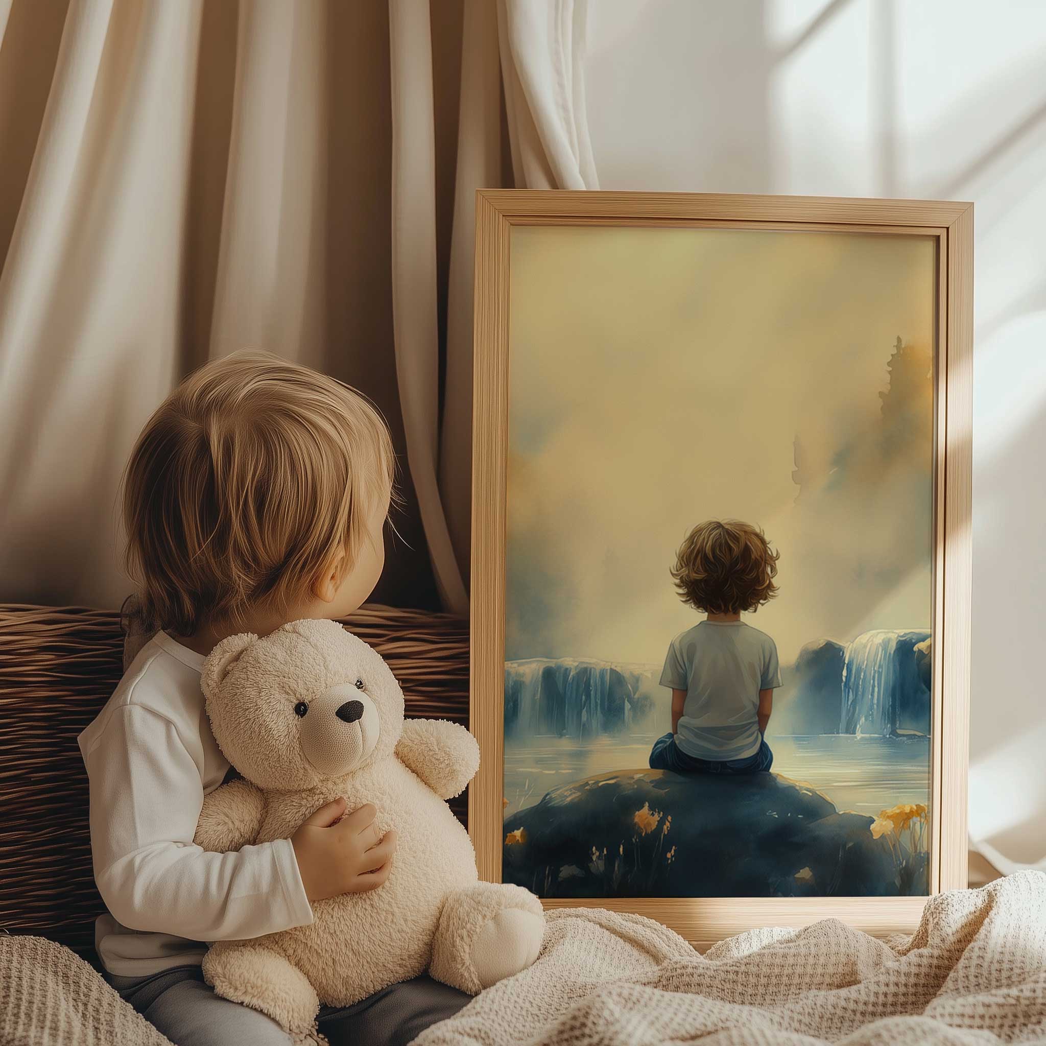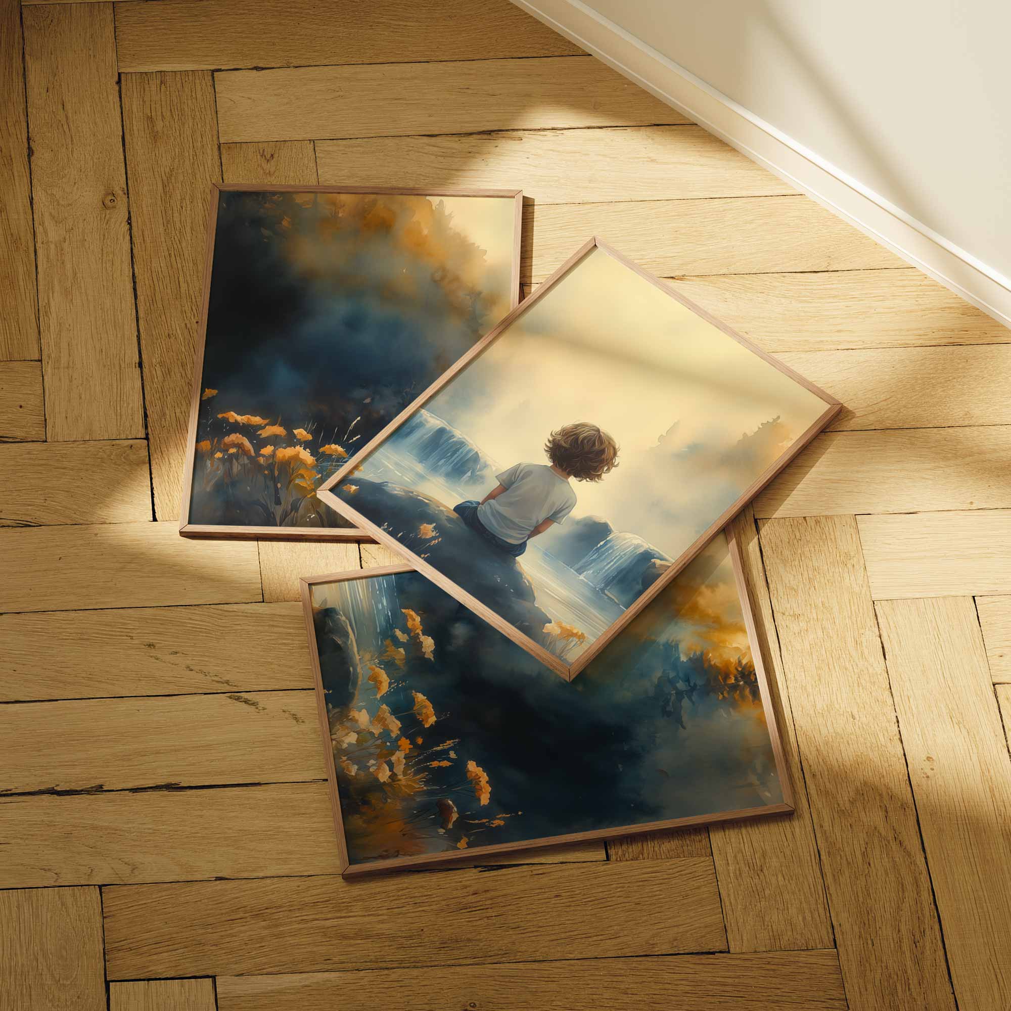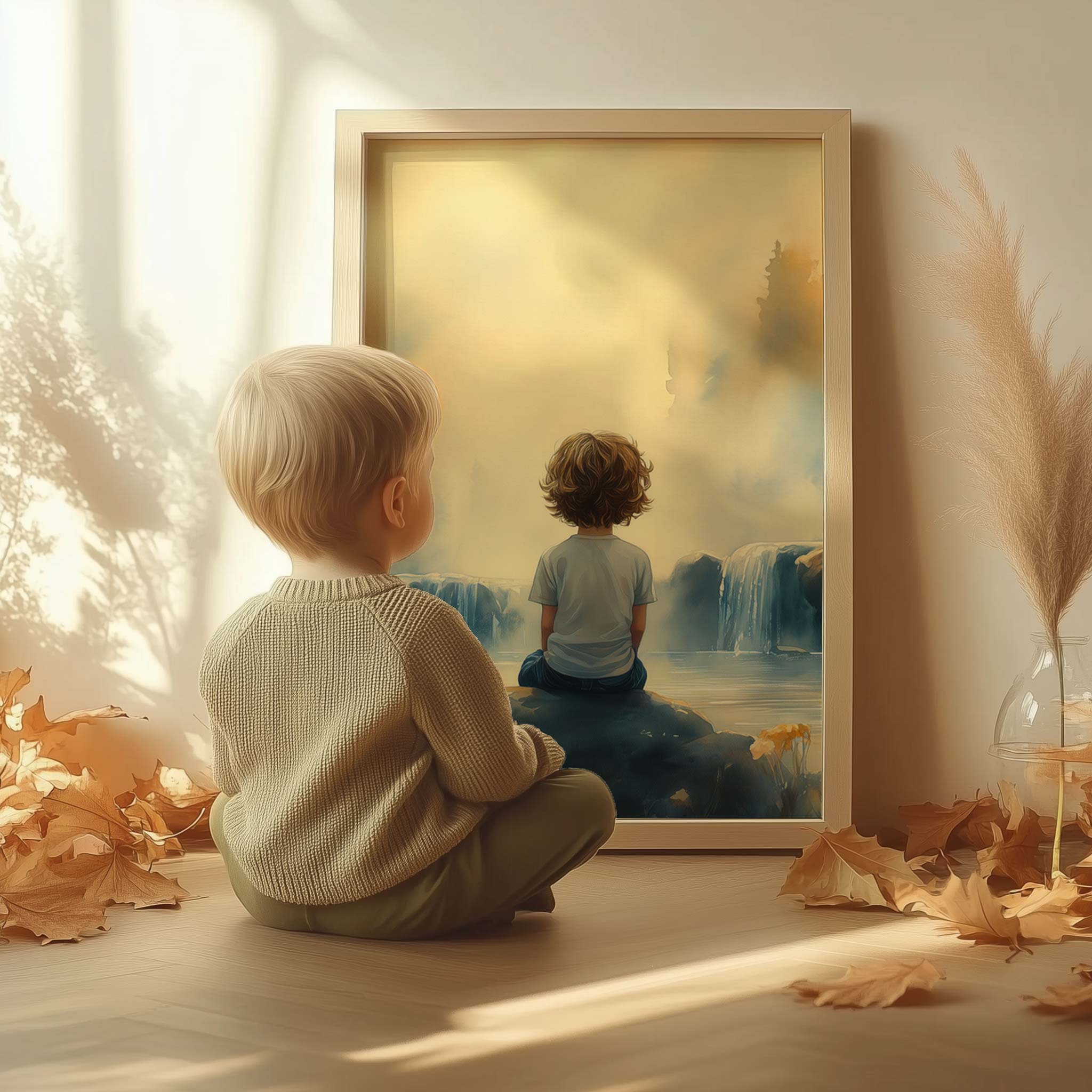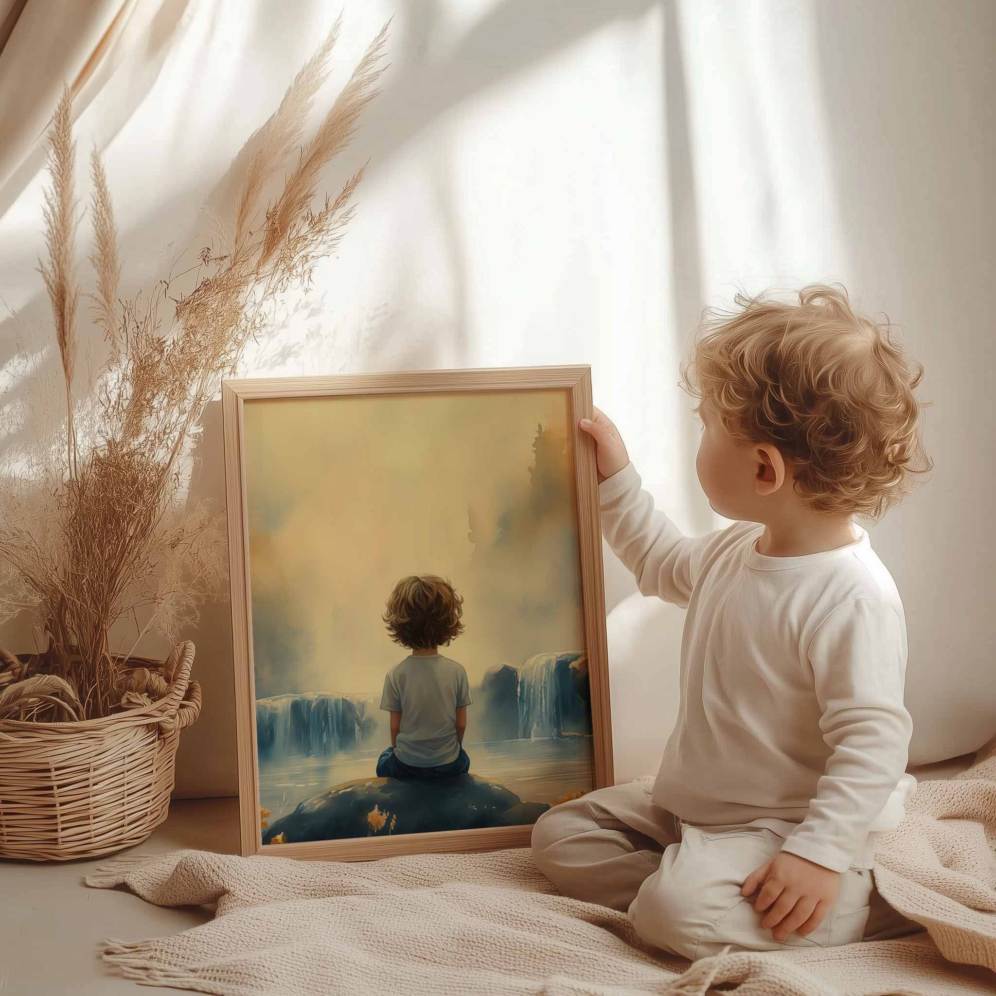 Jongen bij waterval: dromerig tafereel in warme tinten