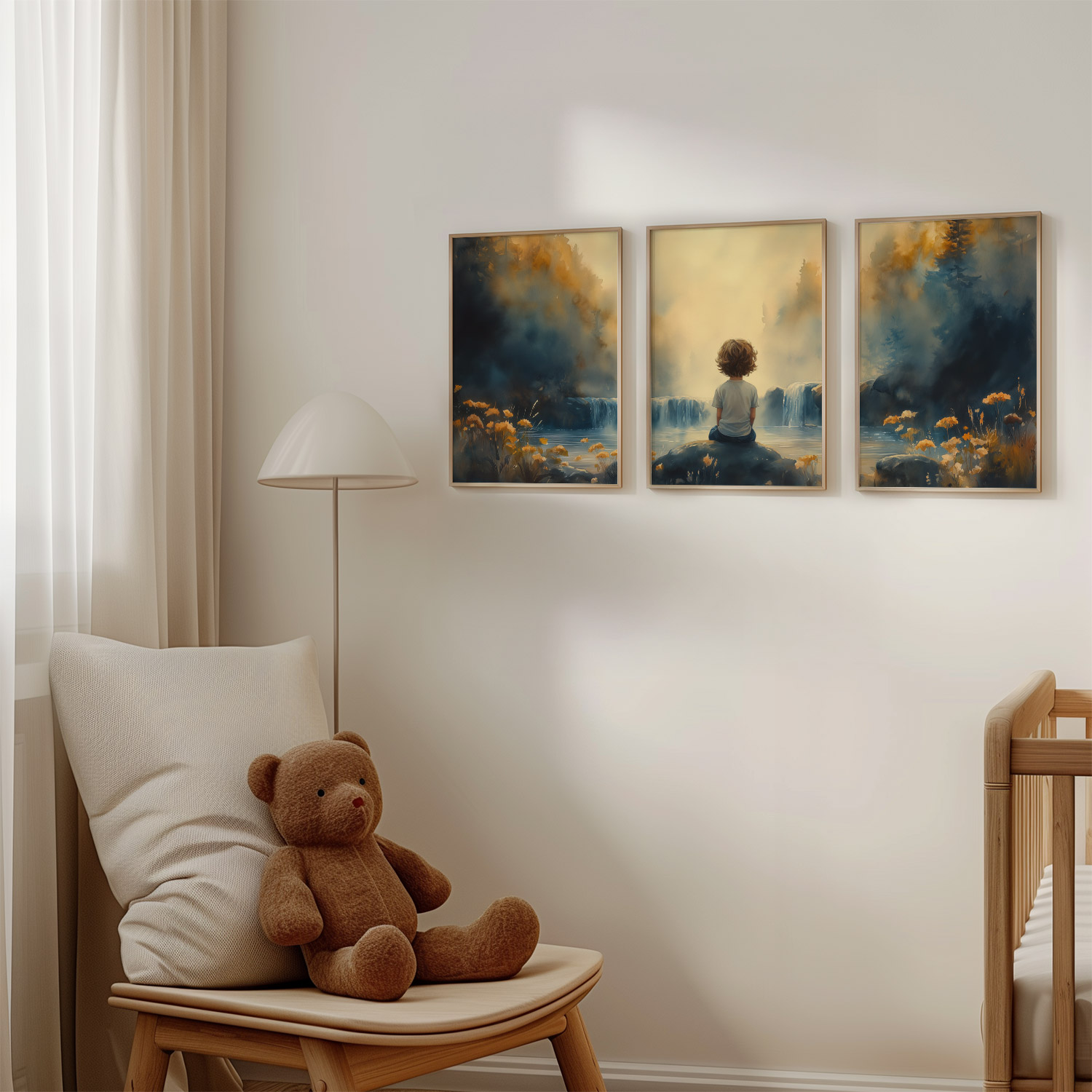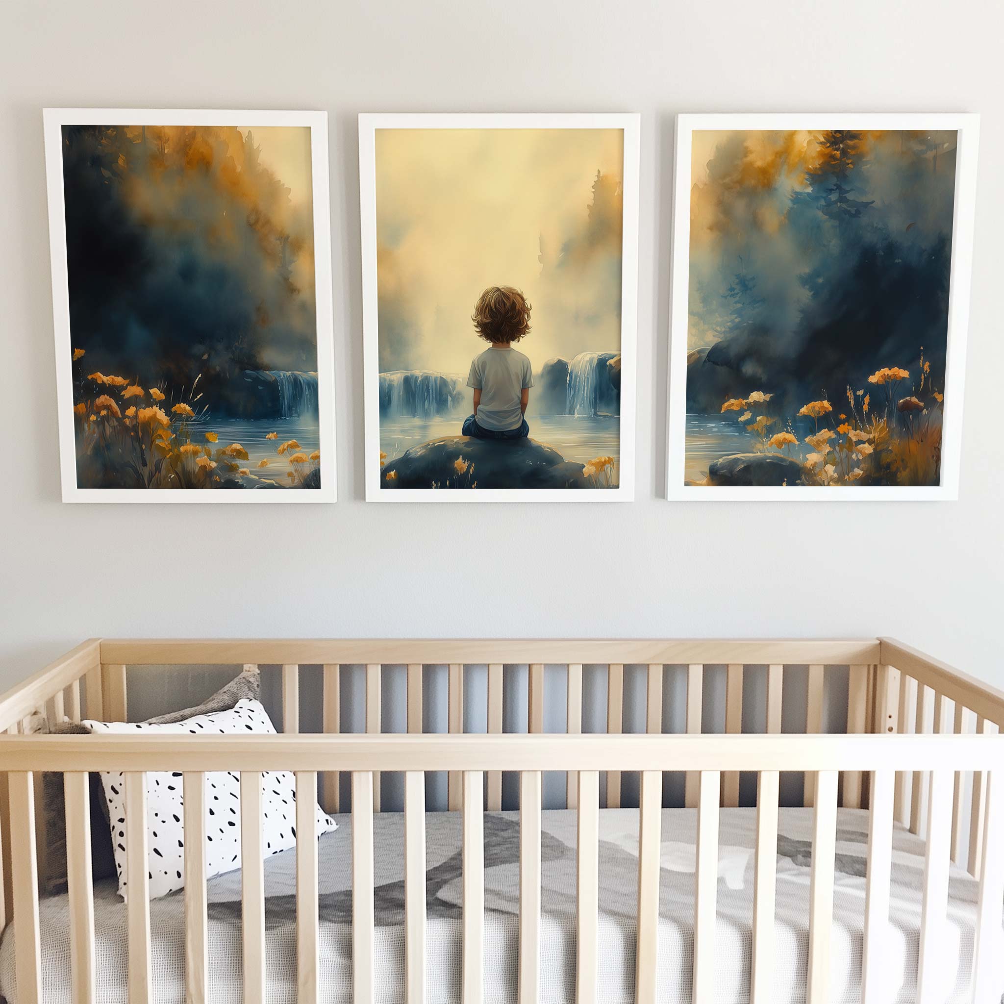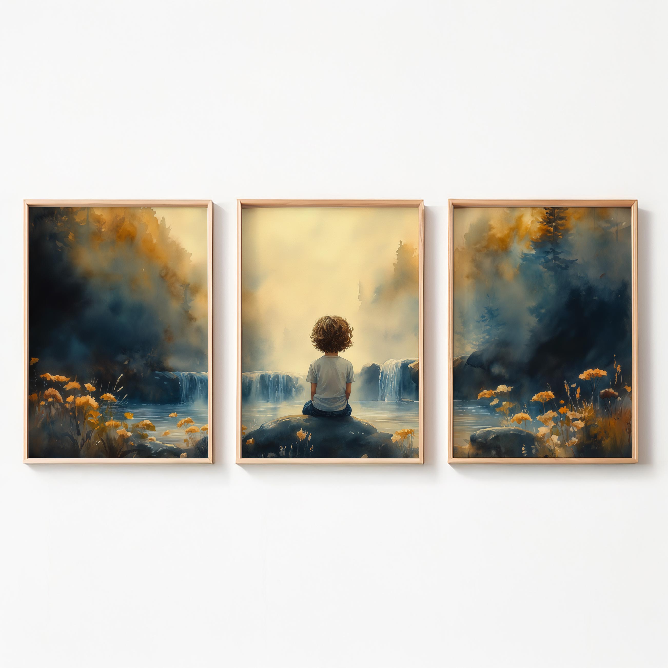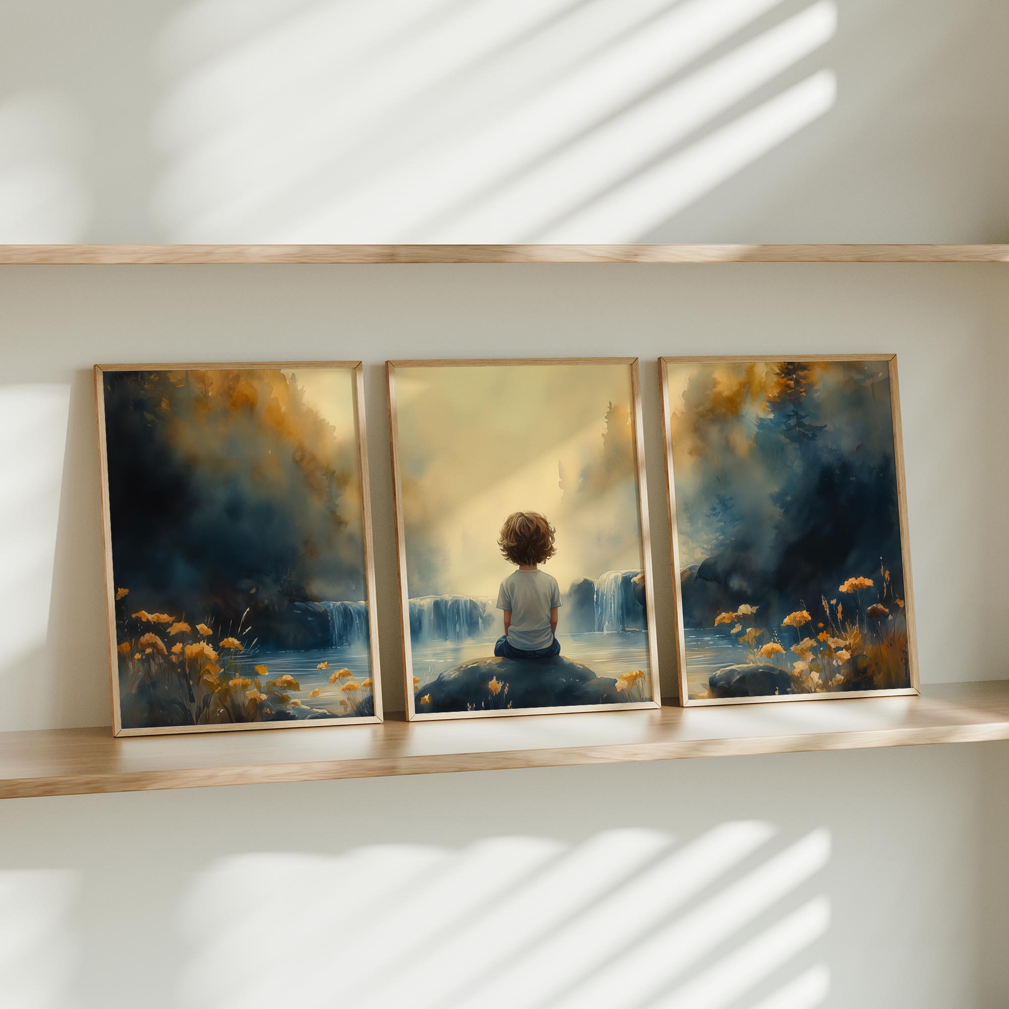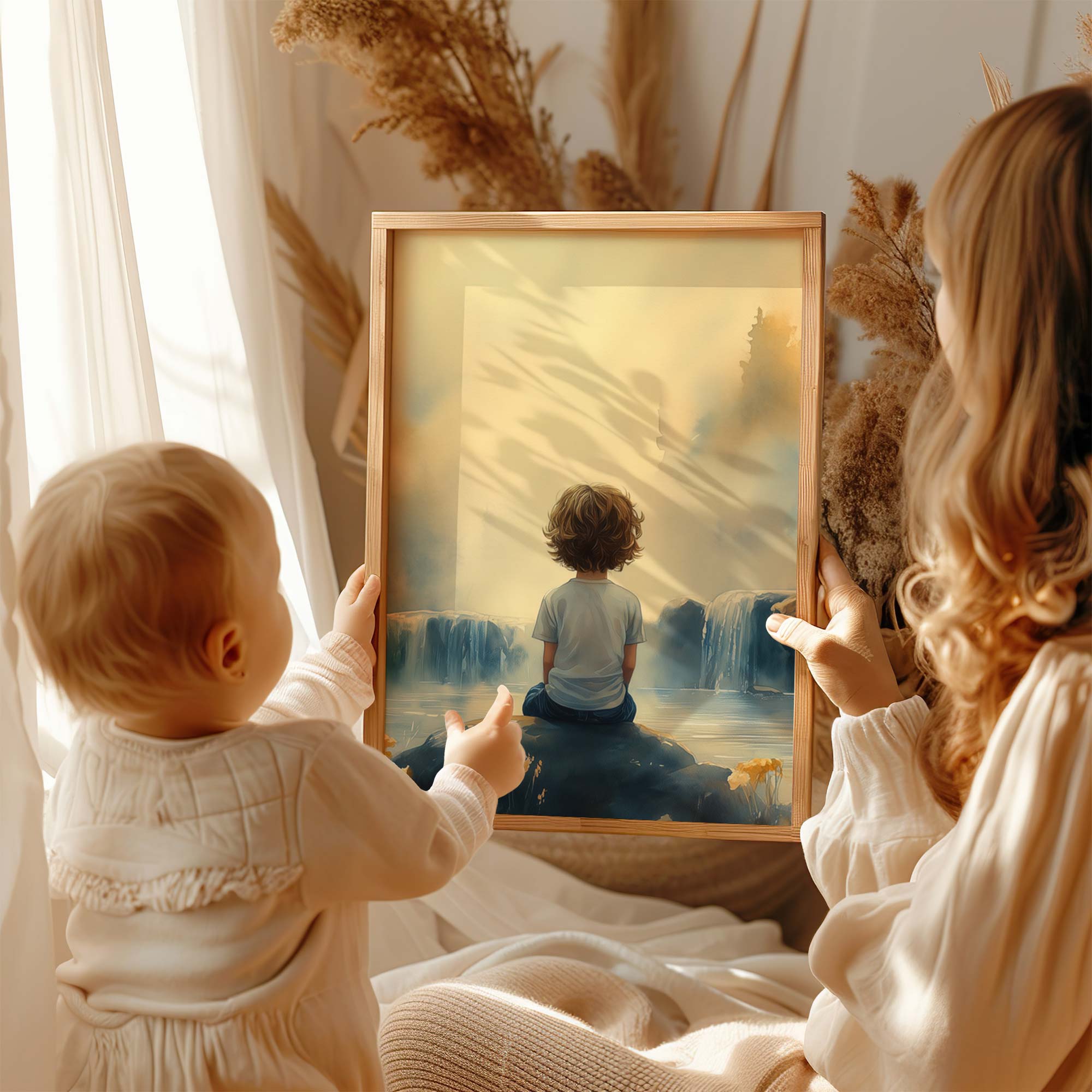 Jongen bij waterval: dromerig tafereel in warme tinten