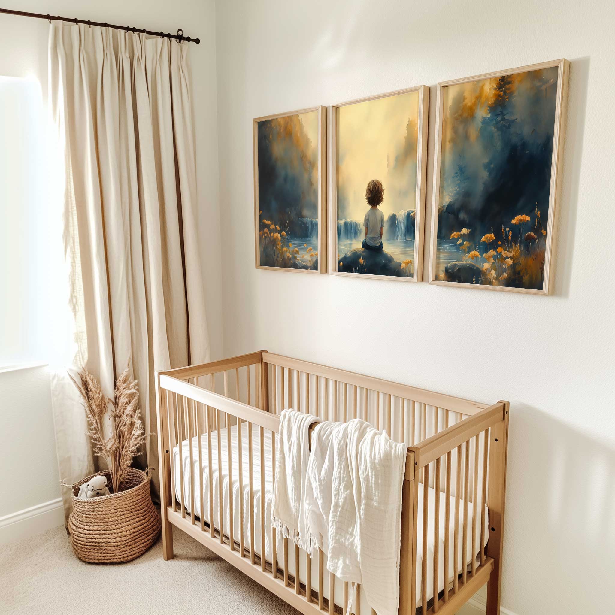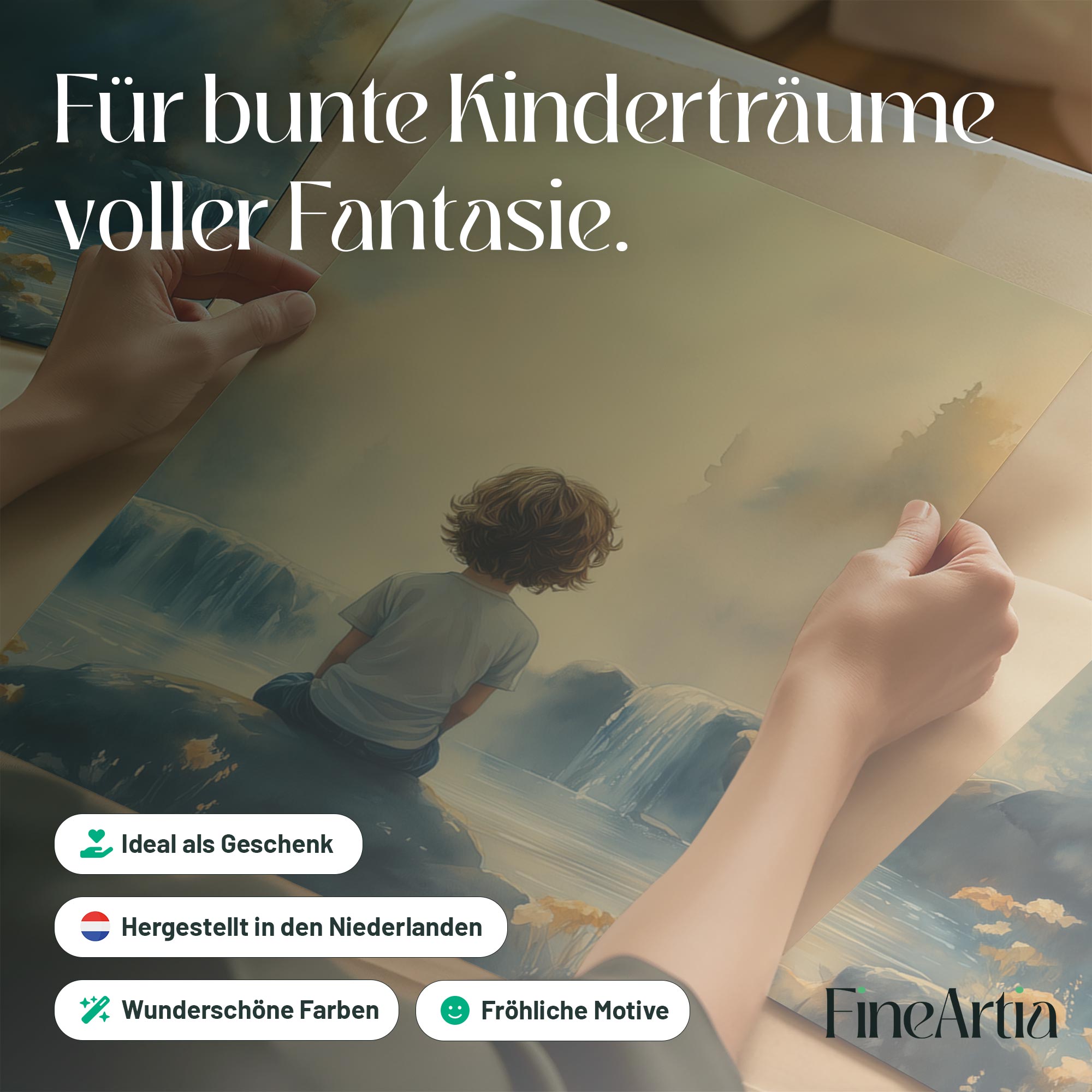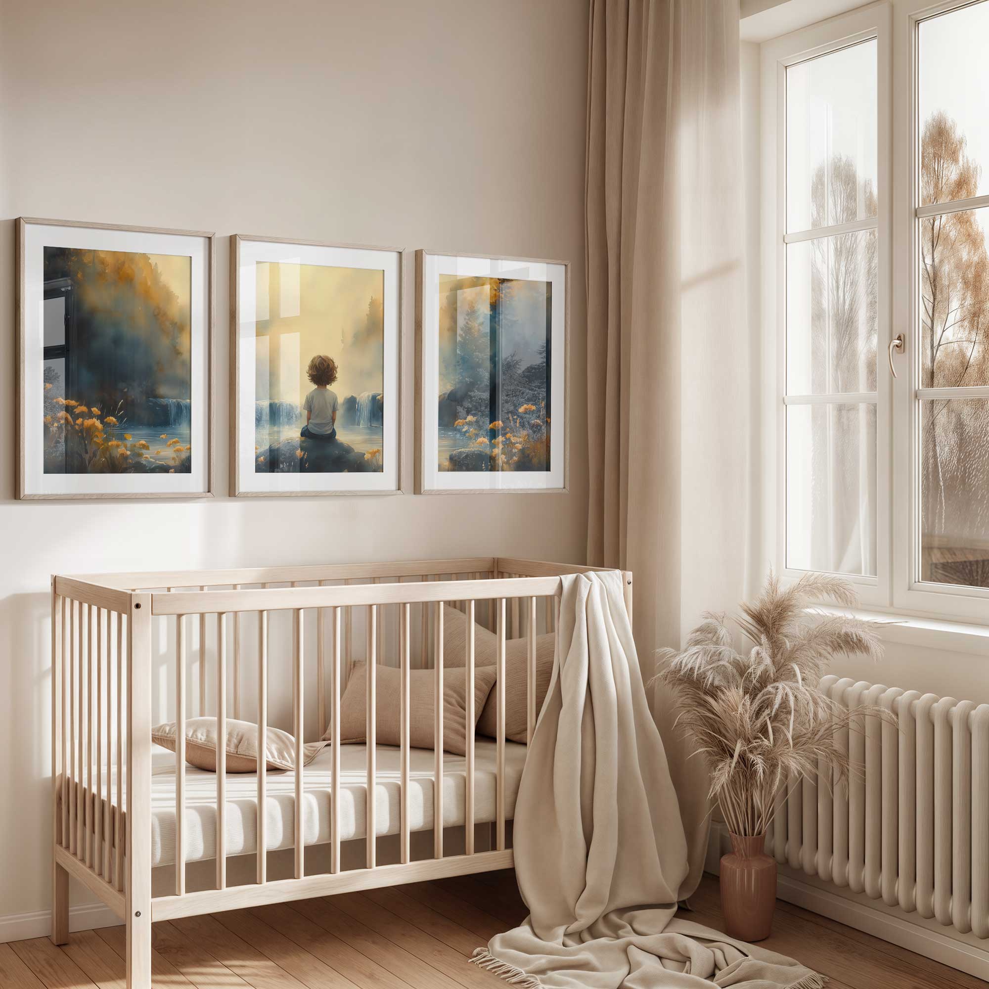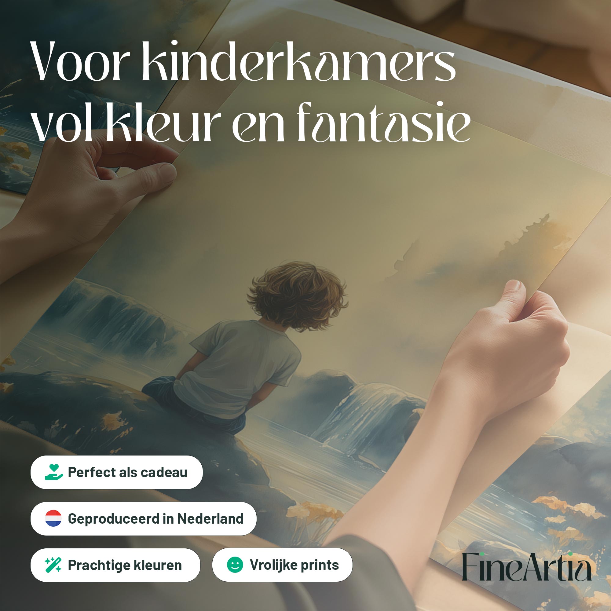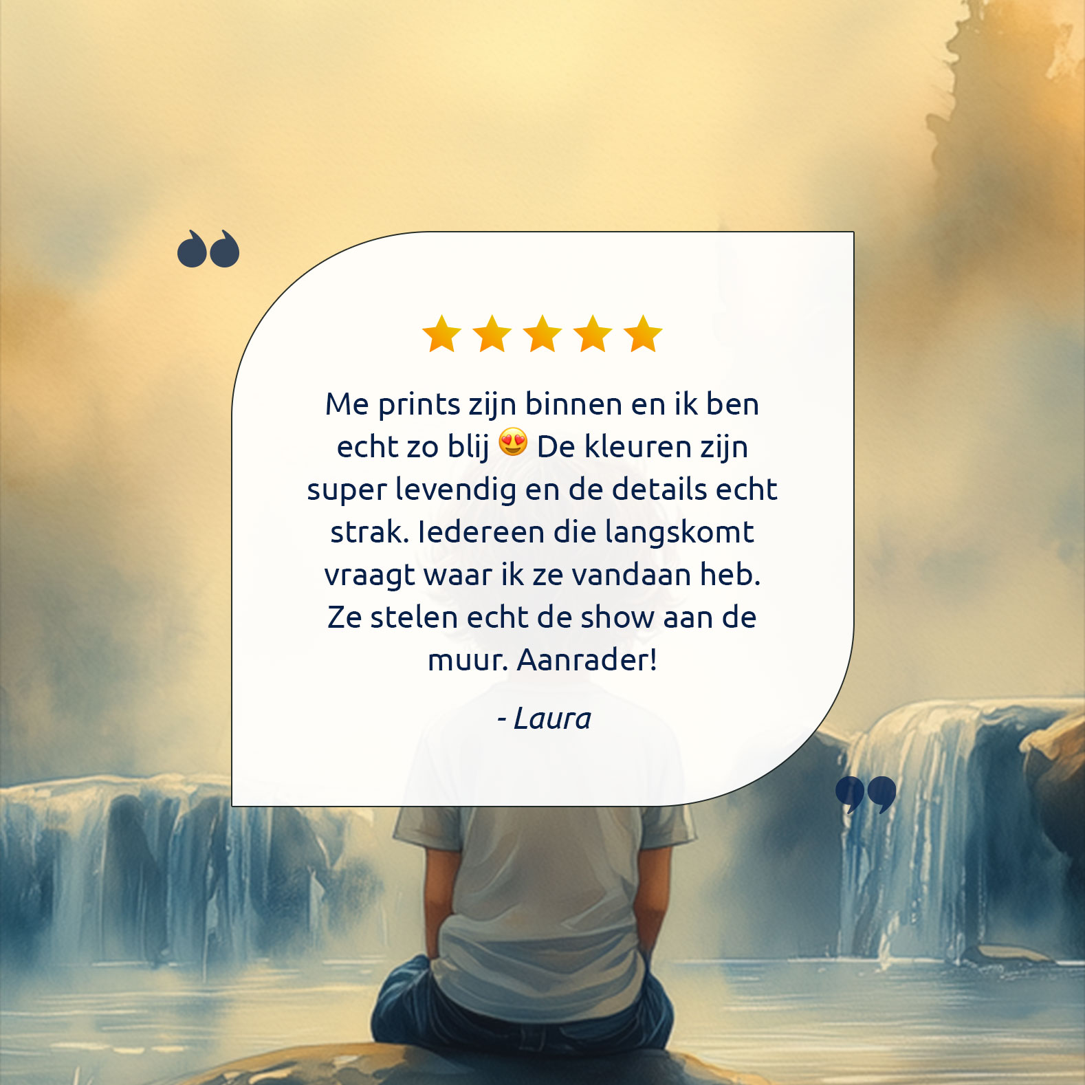 Jongen bij waterval: dromerig tafereel in warme tinten