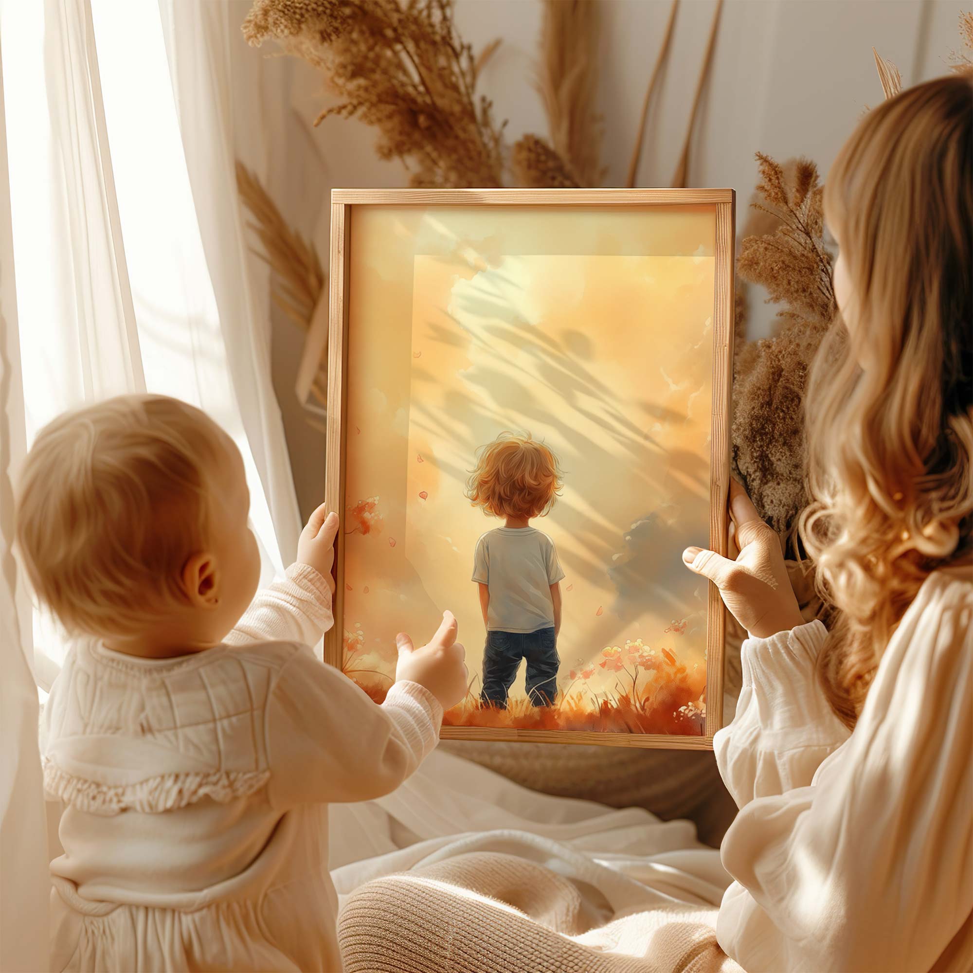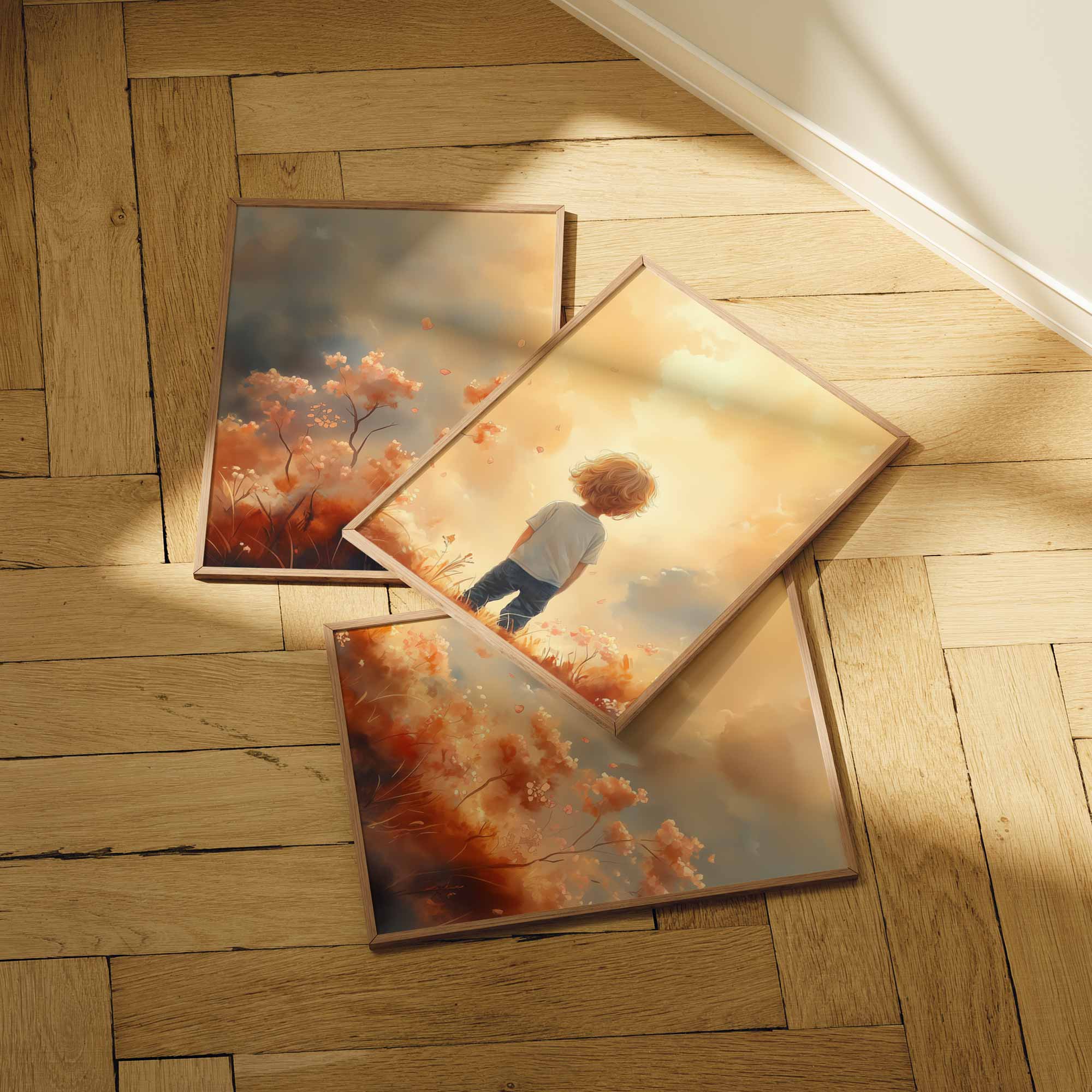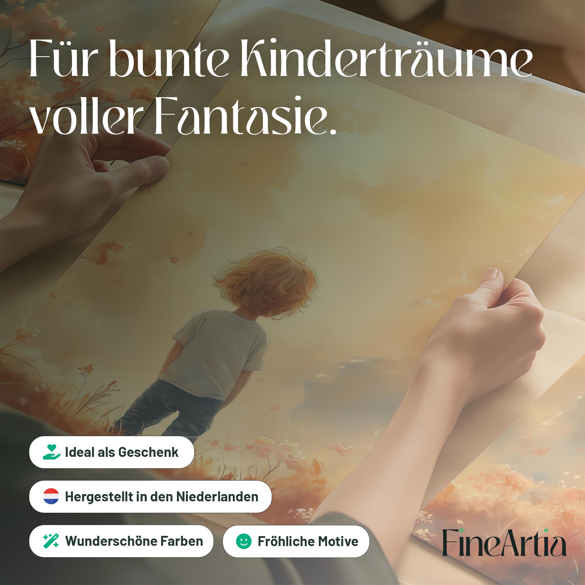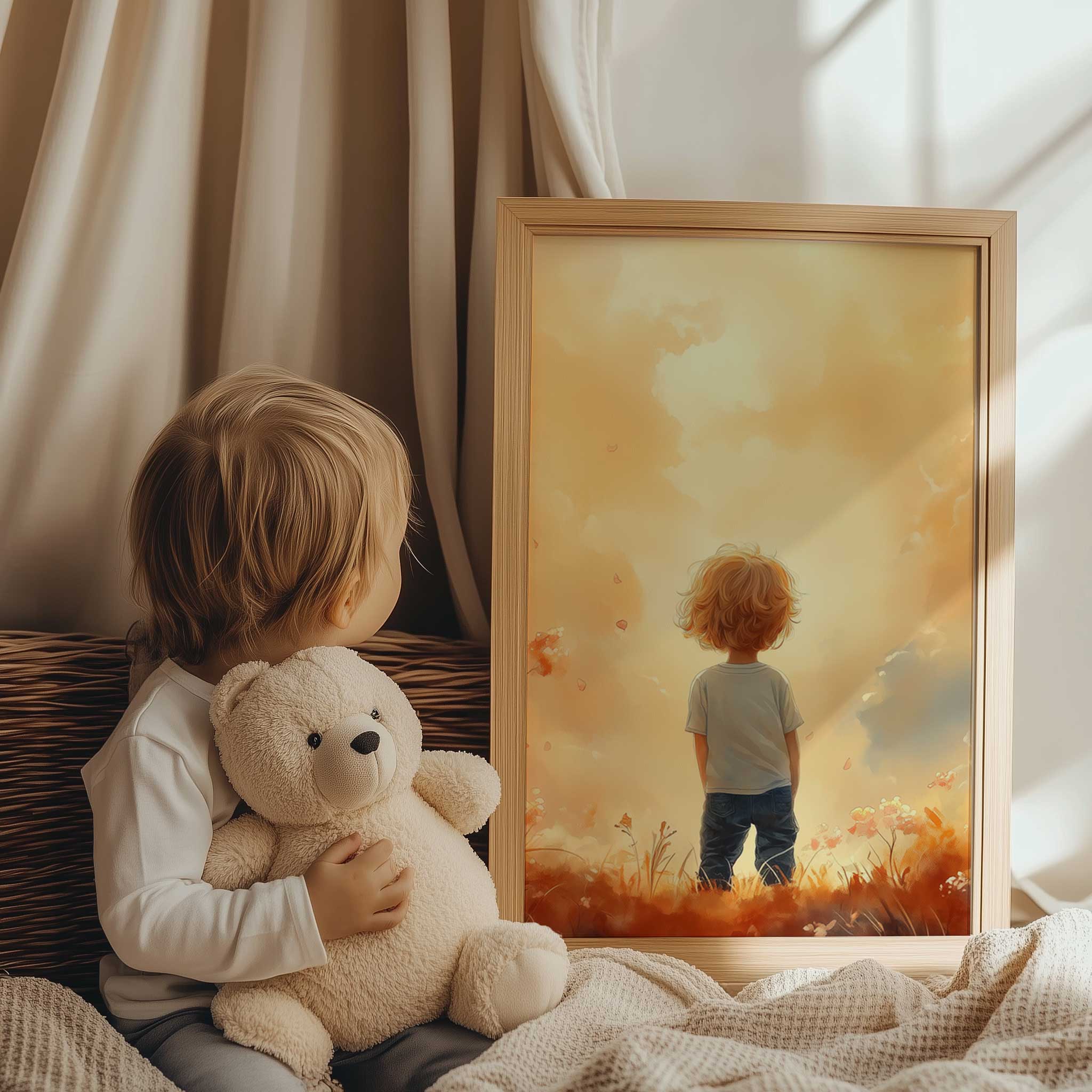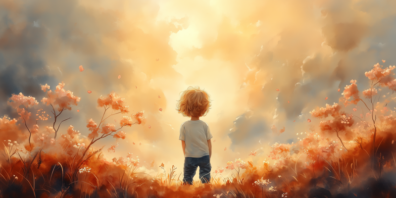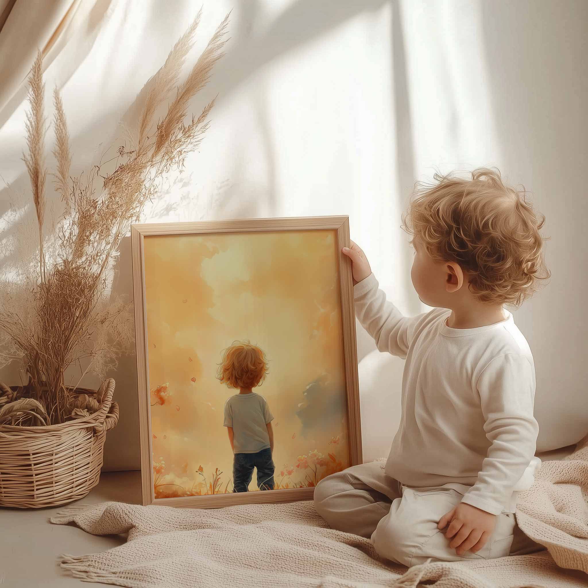 Jongen in Bloeiend Landschap onder Kleurrijke Hemel