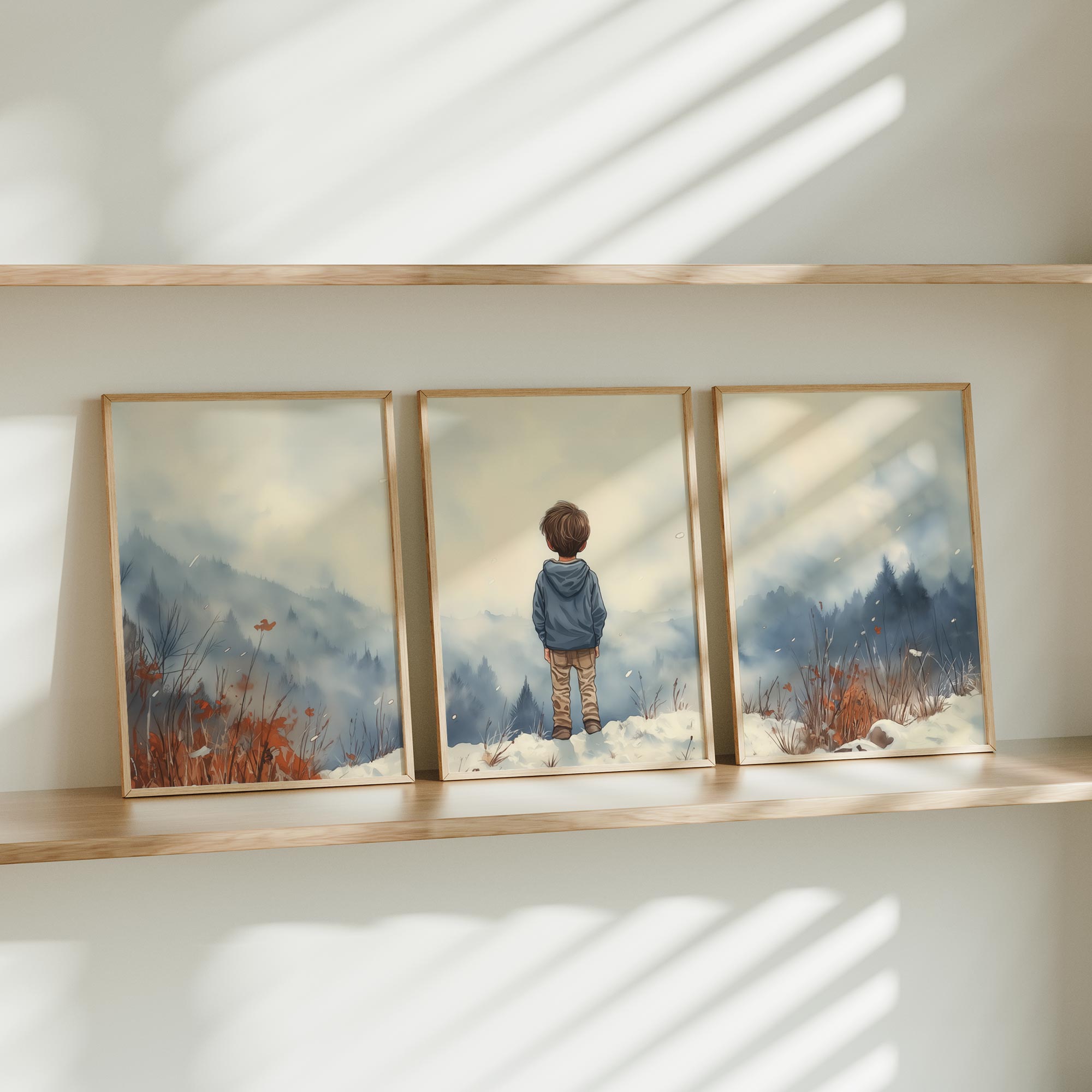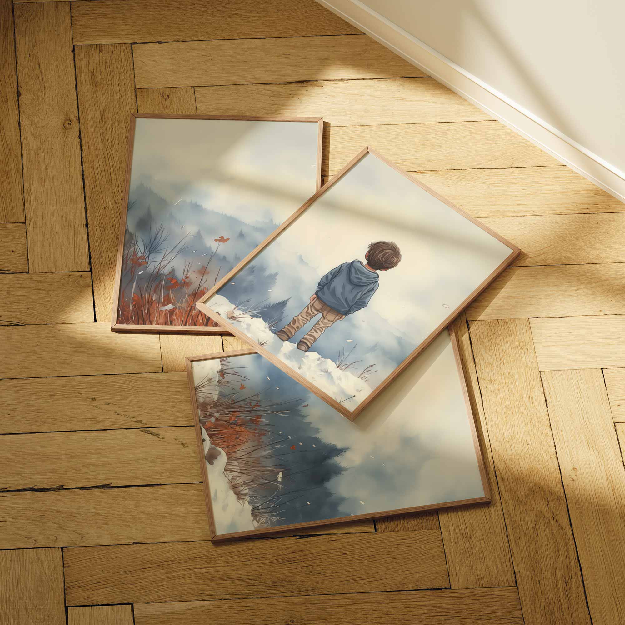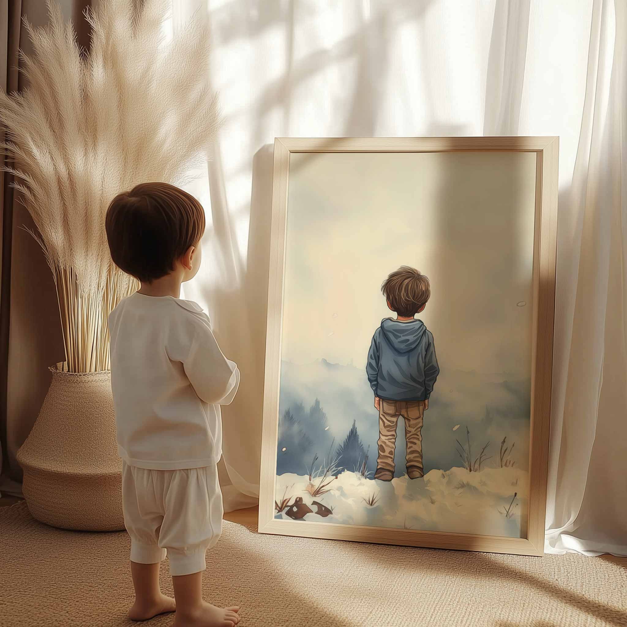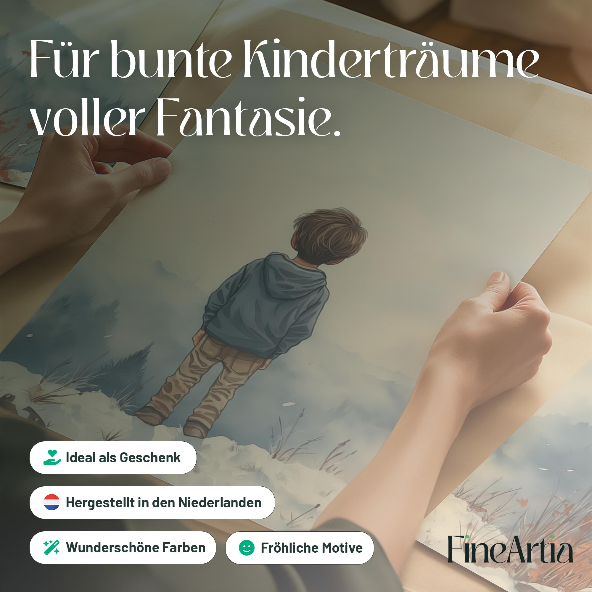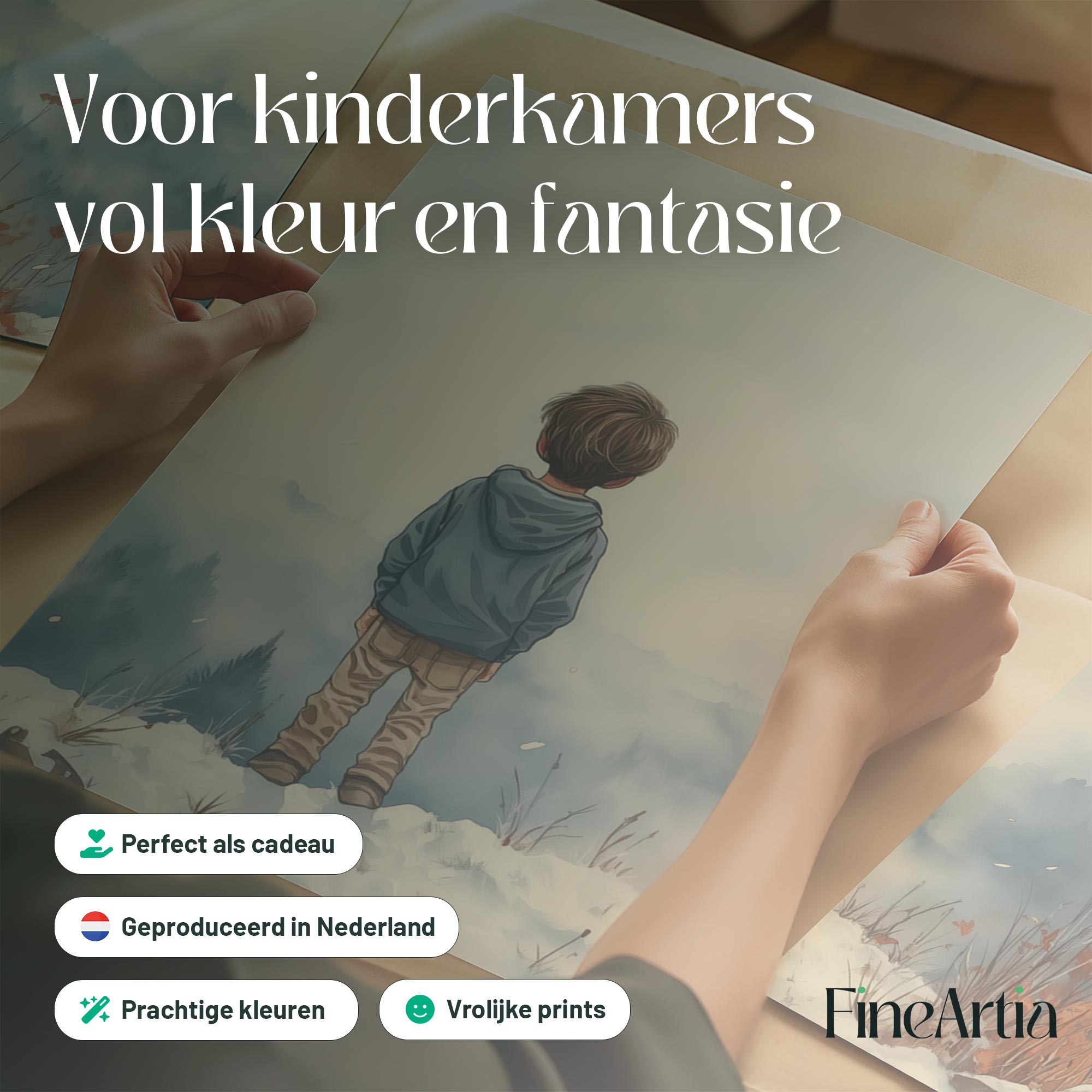 Terug naar collectie Posters Jongen in de sneeuw: Dromerig winters landschap