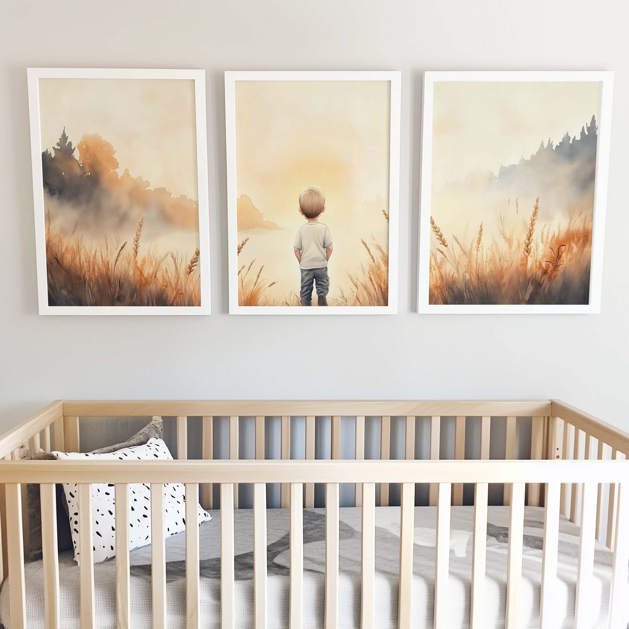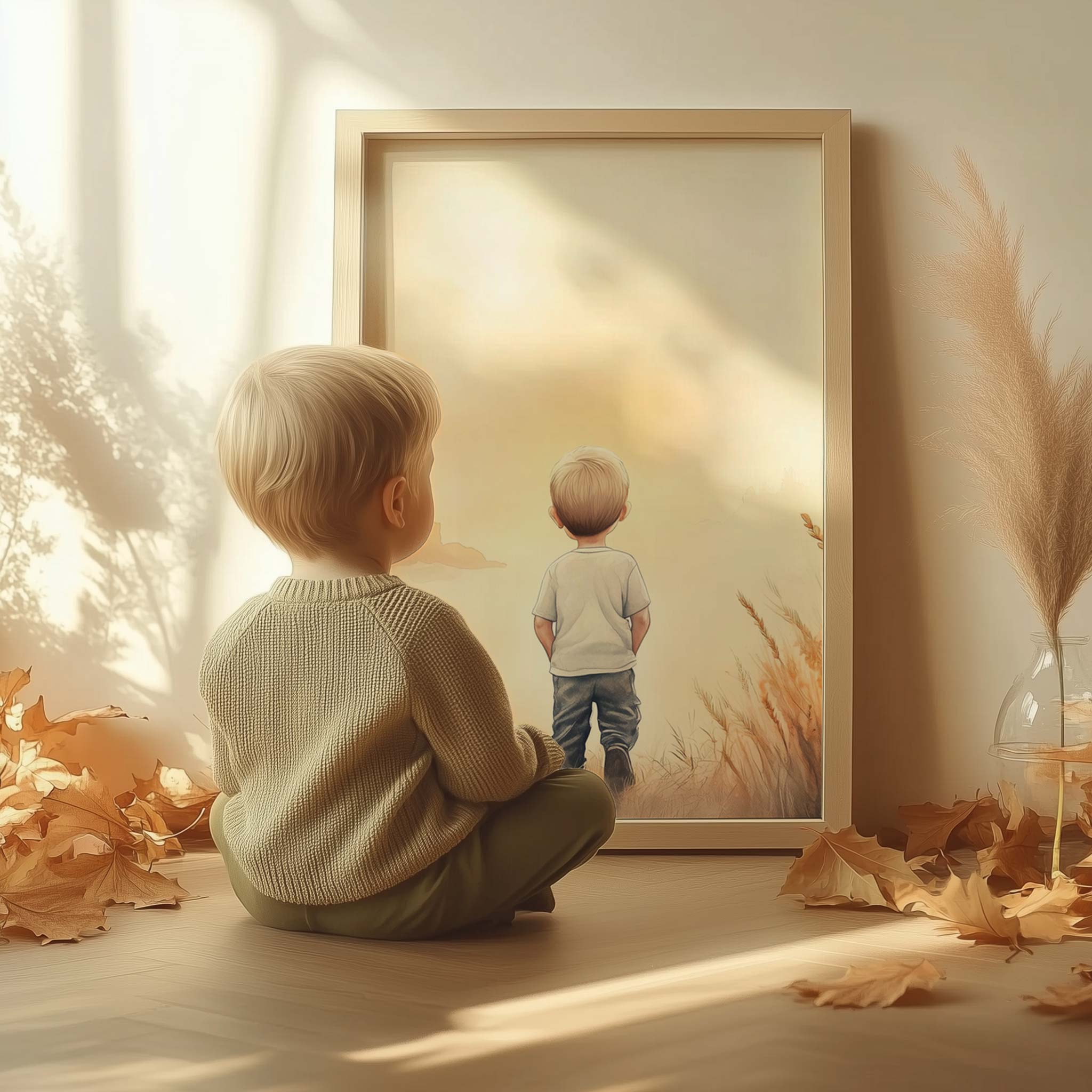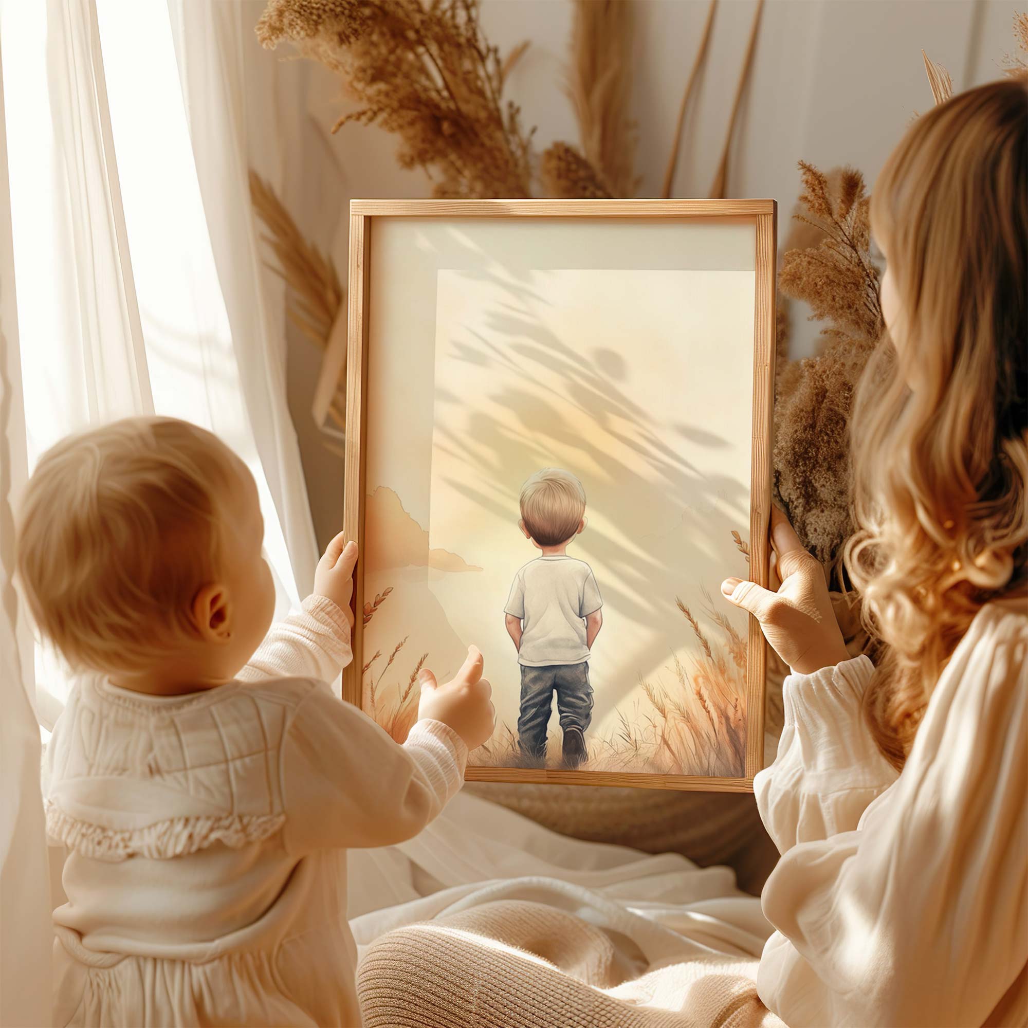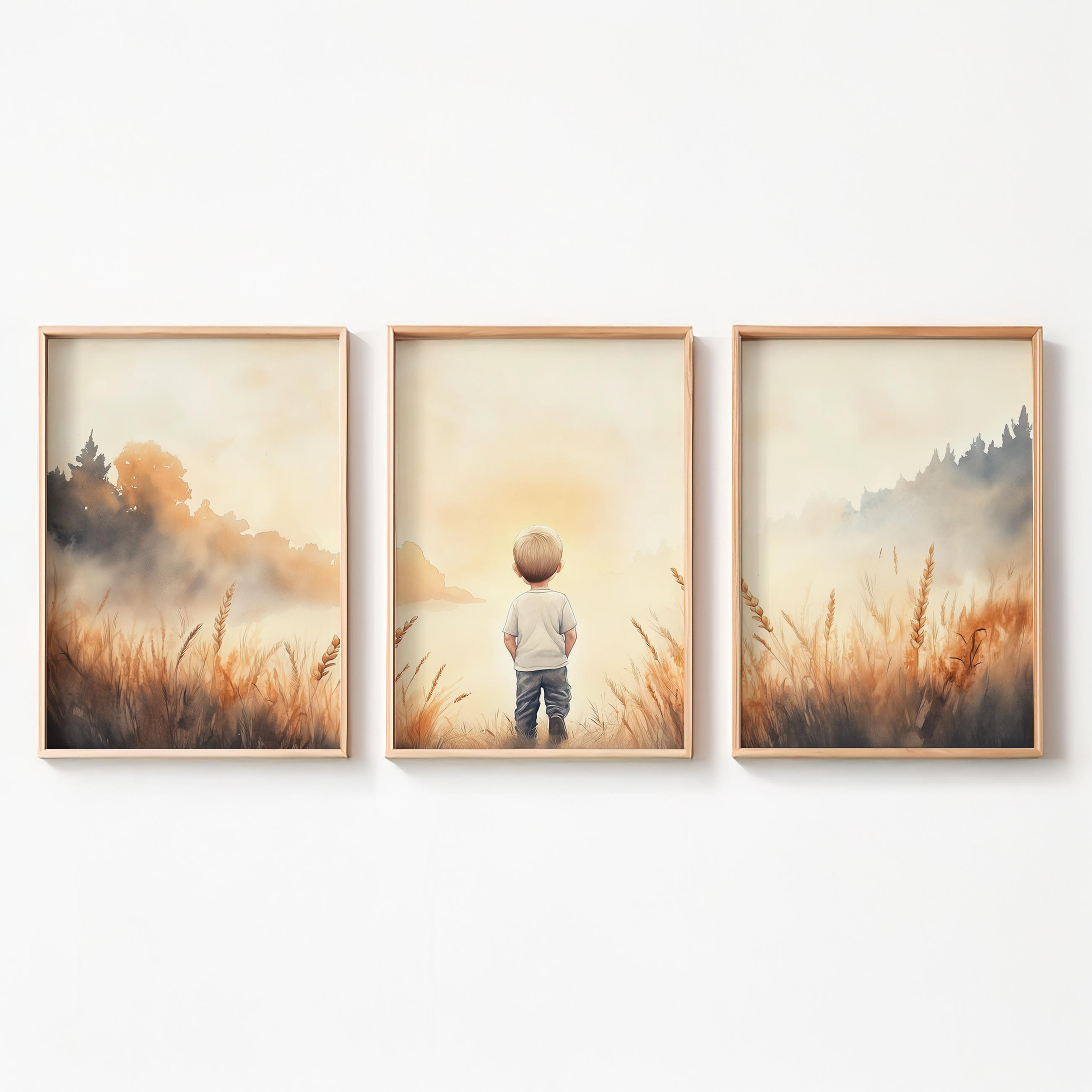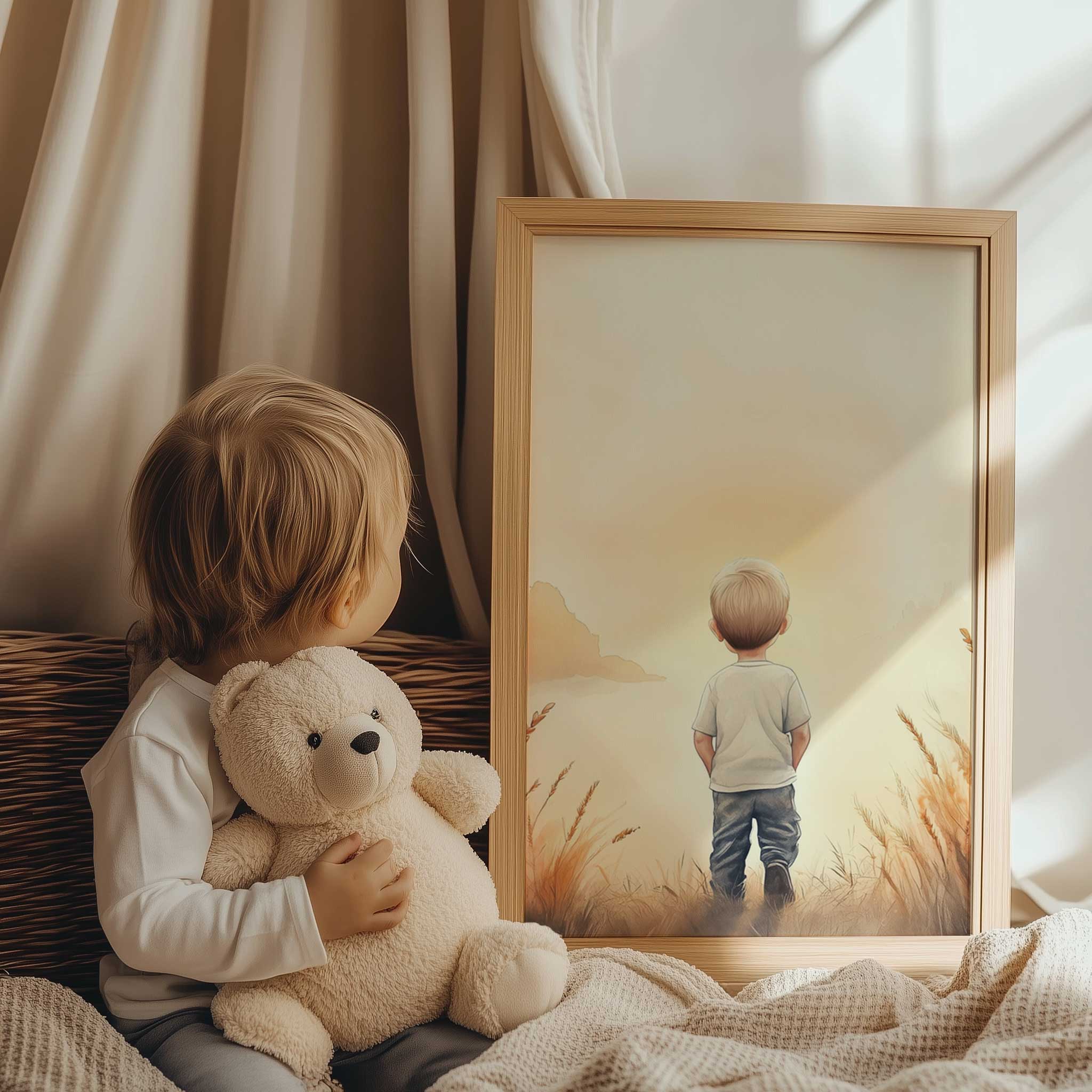 Jongen in Gouden Gras – Serene Horizon Illustratie