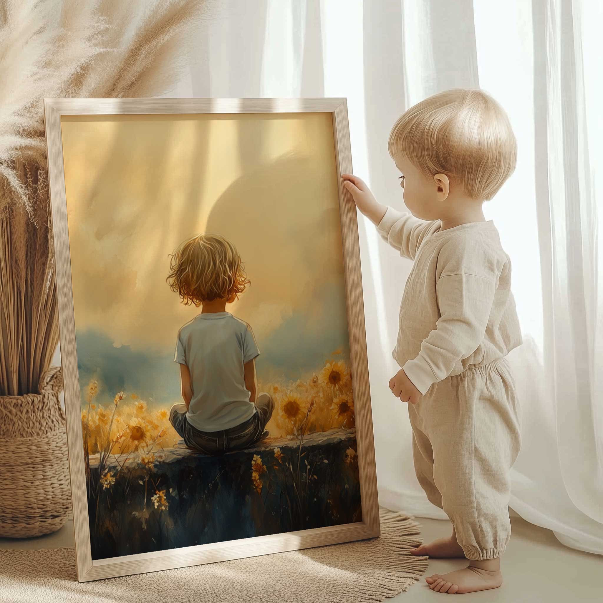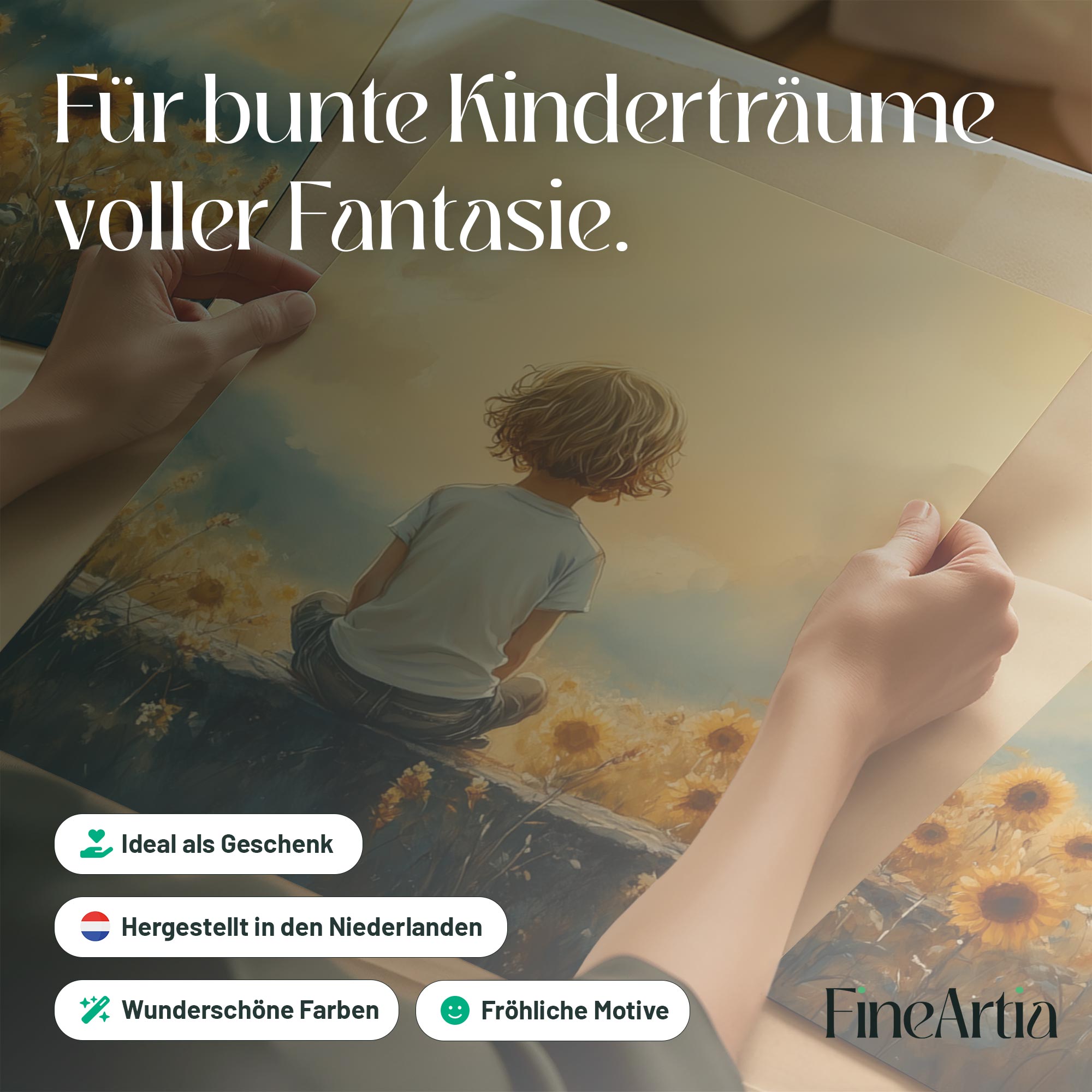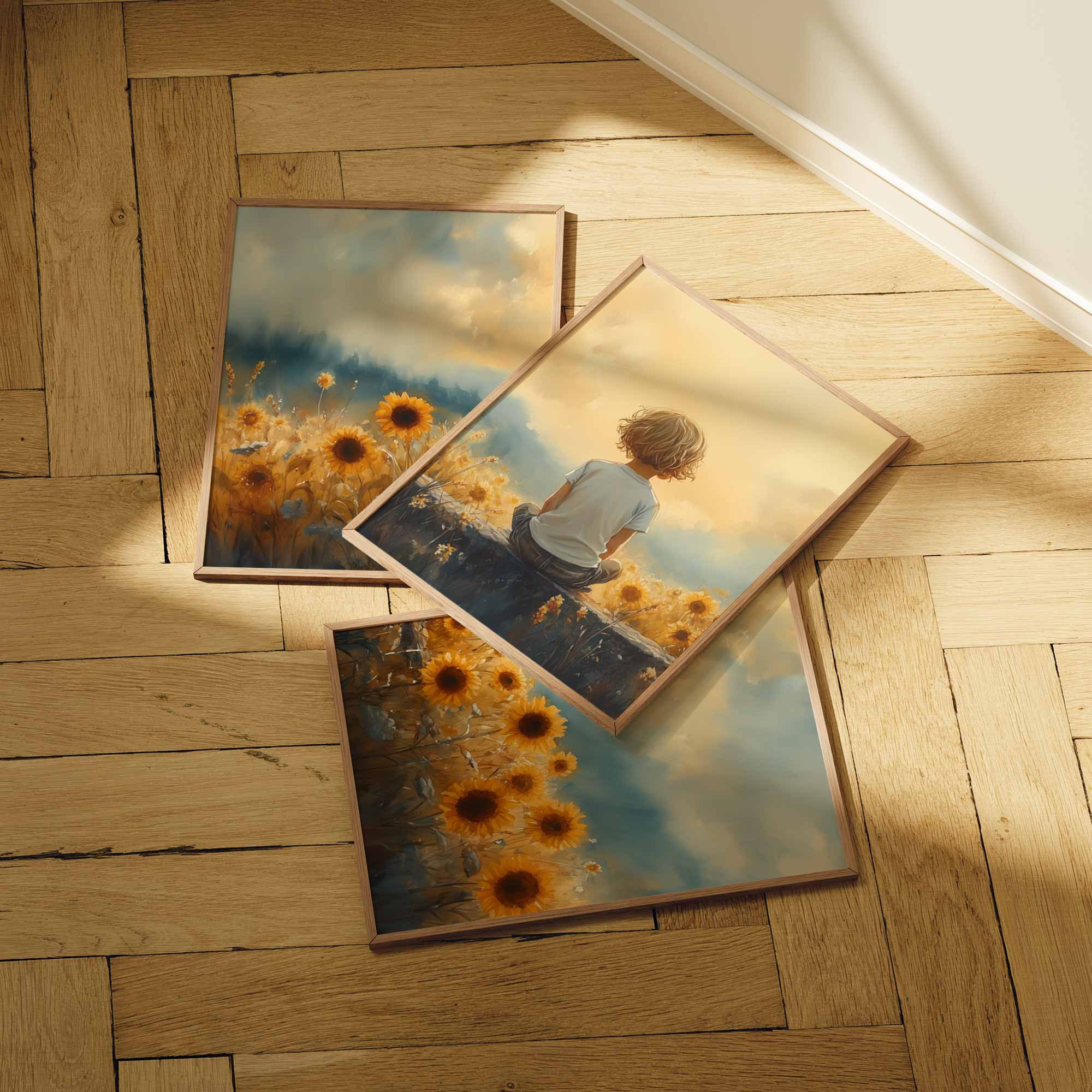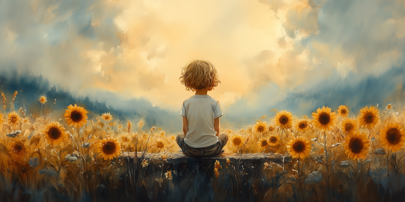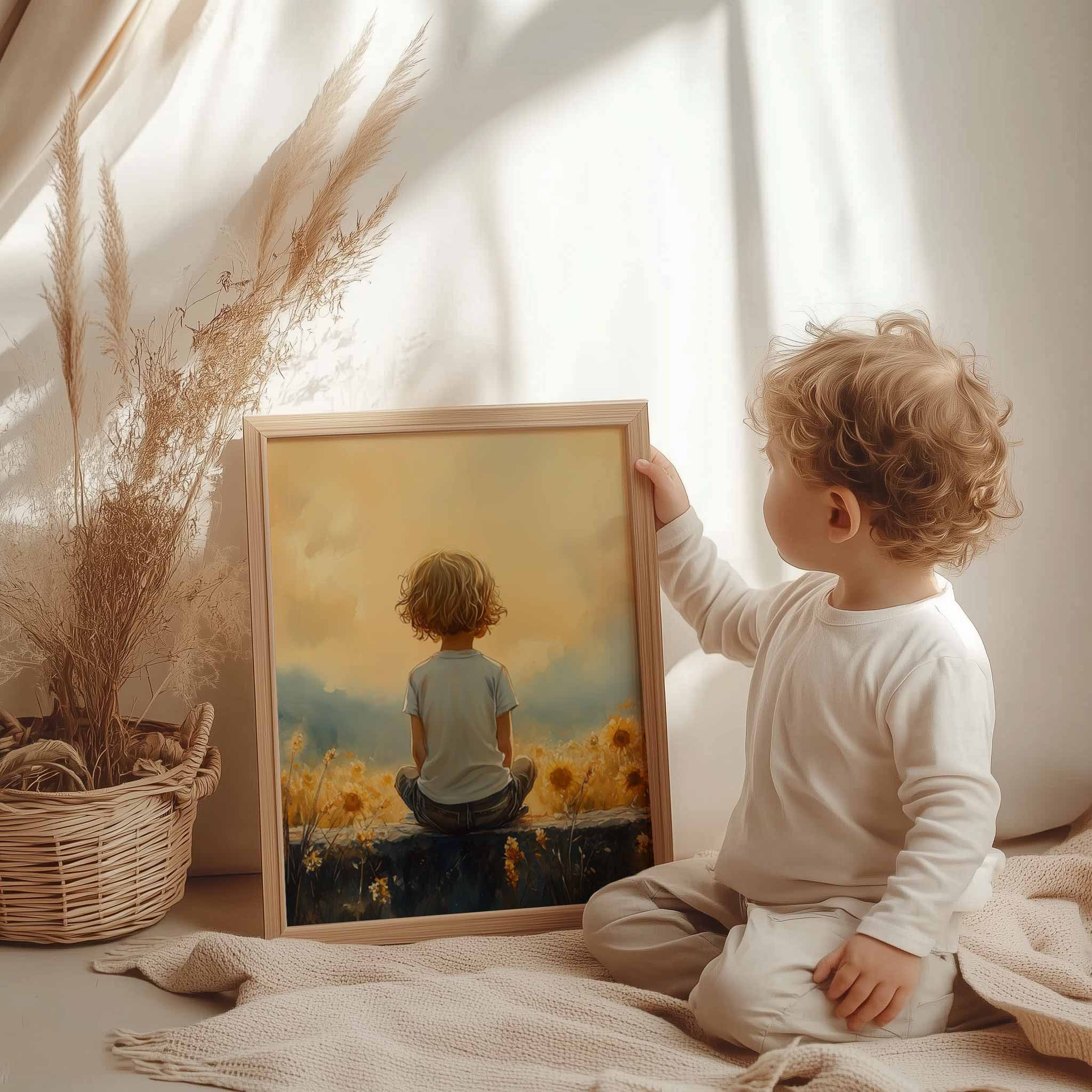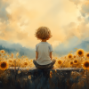 Jongen in Zonnebloemenveld – Dromerig Pastel Landschap