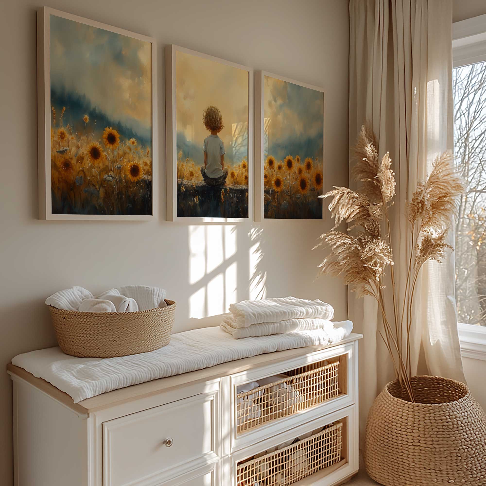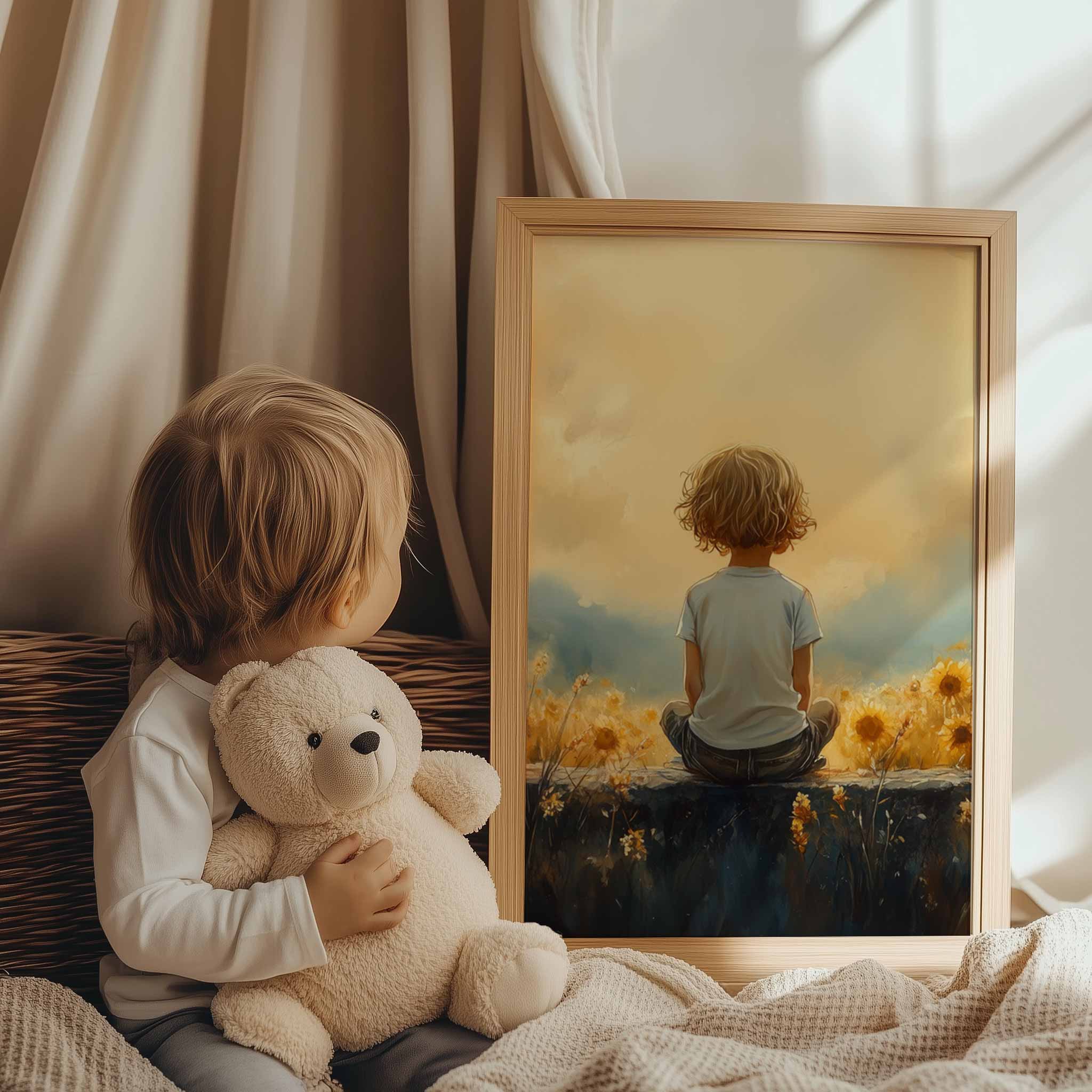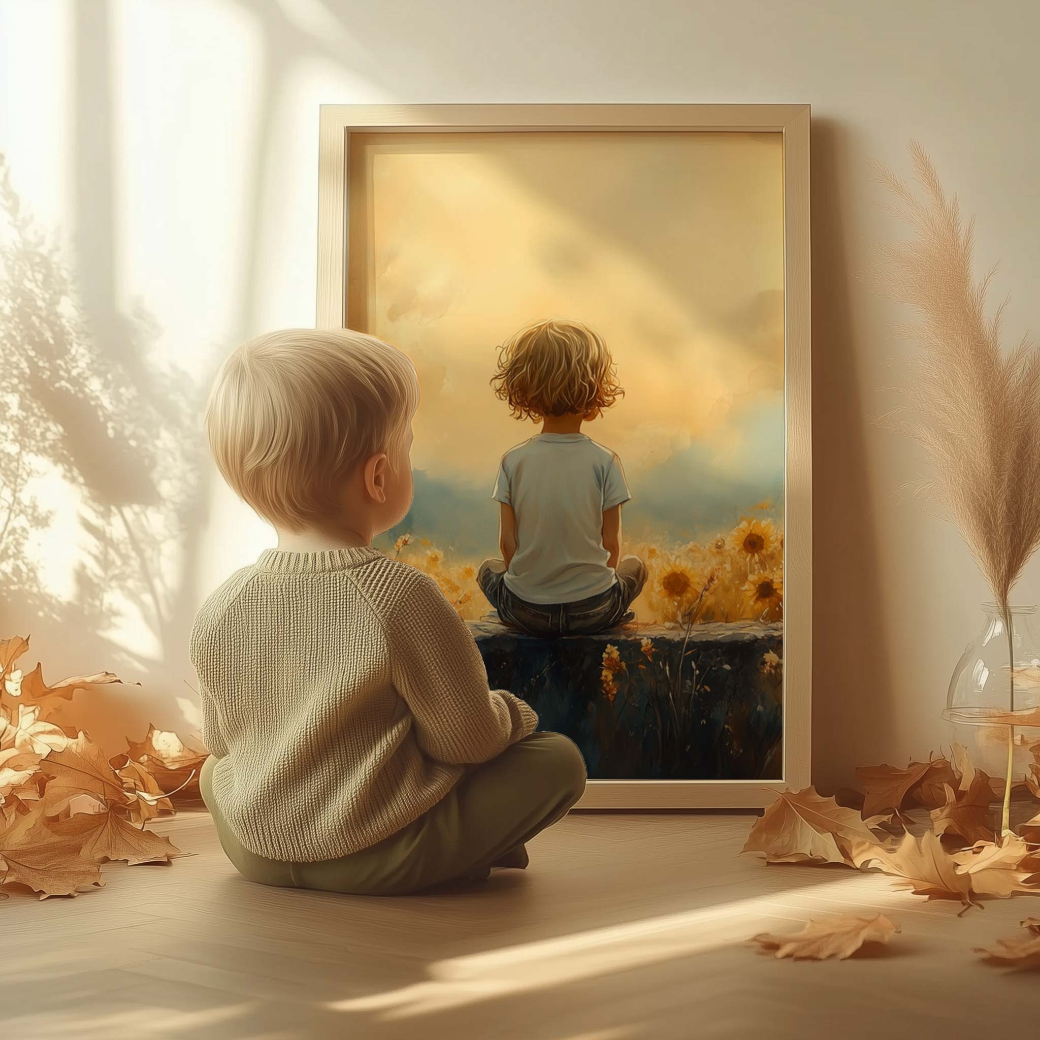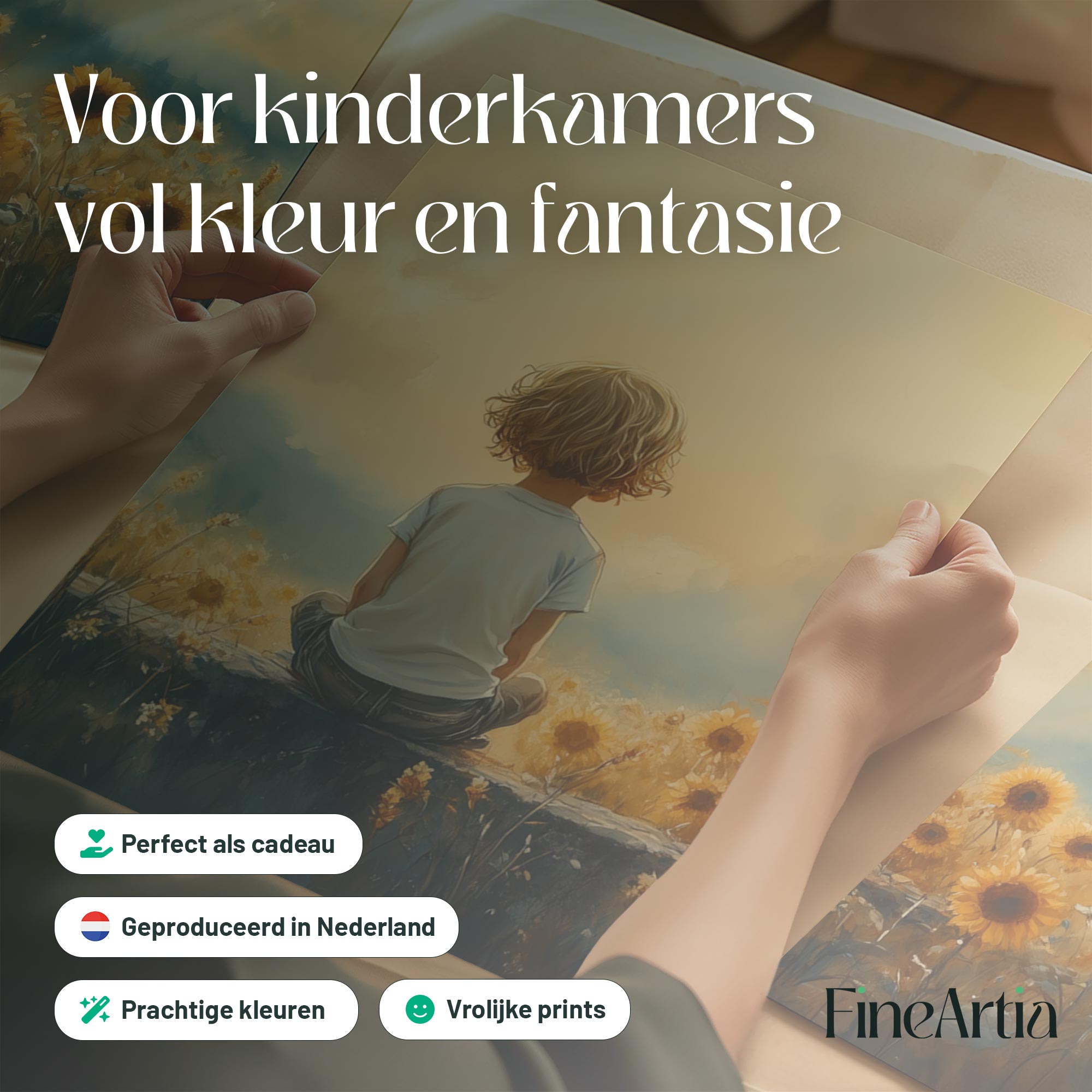 Jongen in Zonnebloemenveld – Dromerig Pastel Landschap