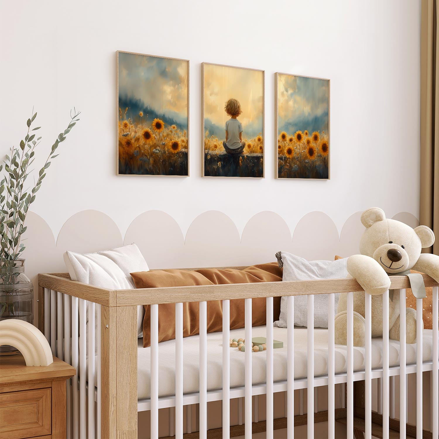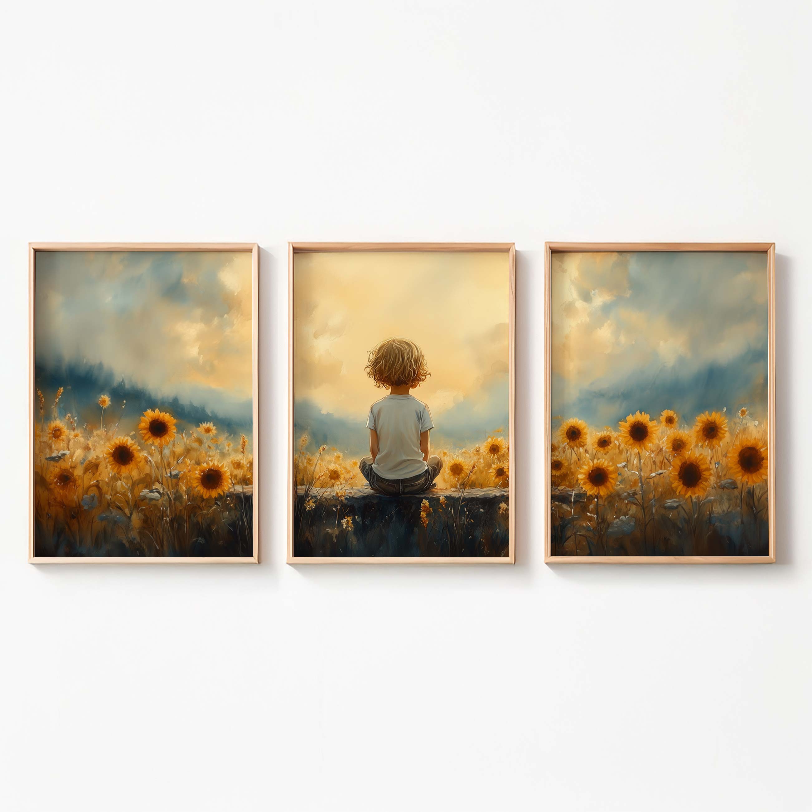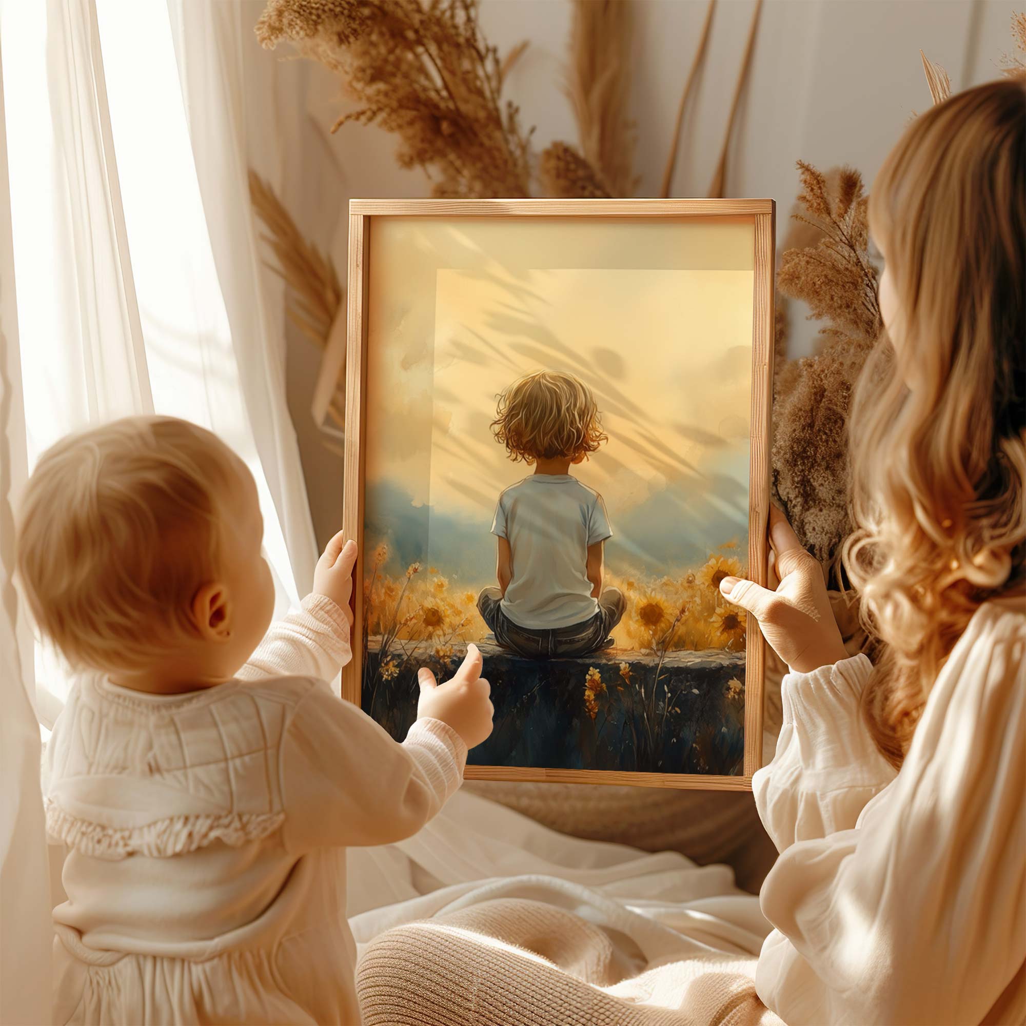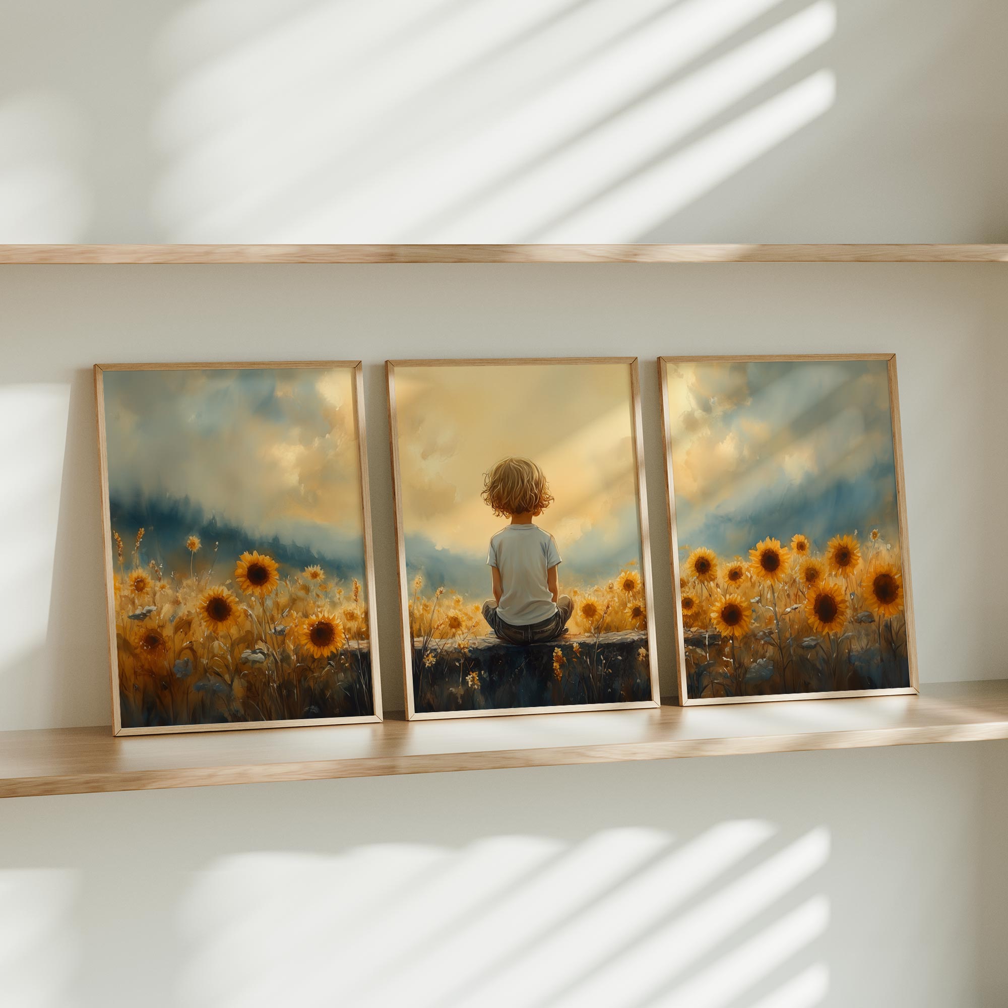 Jongen in Zonnebloemenveld – Dromerig Pastel Landschap