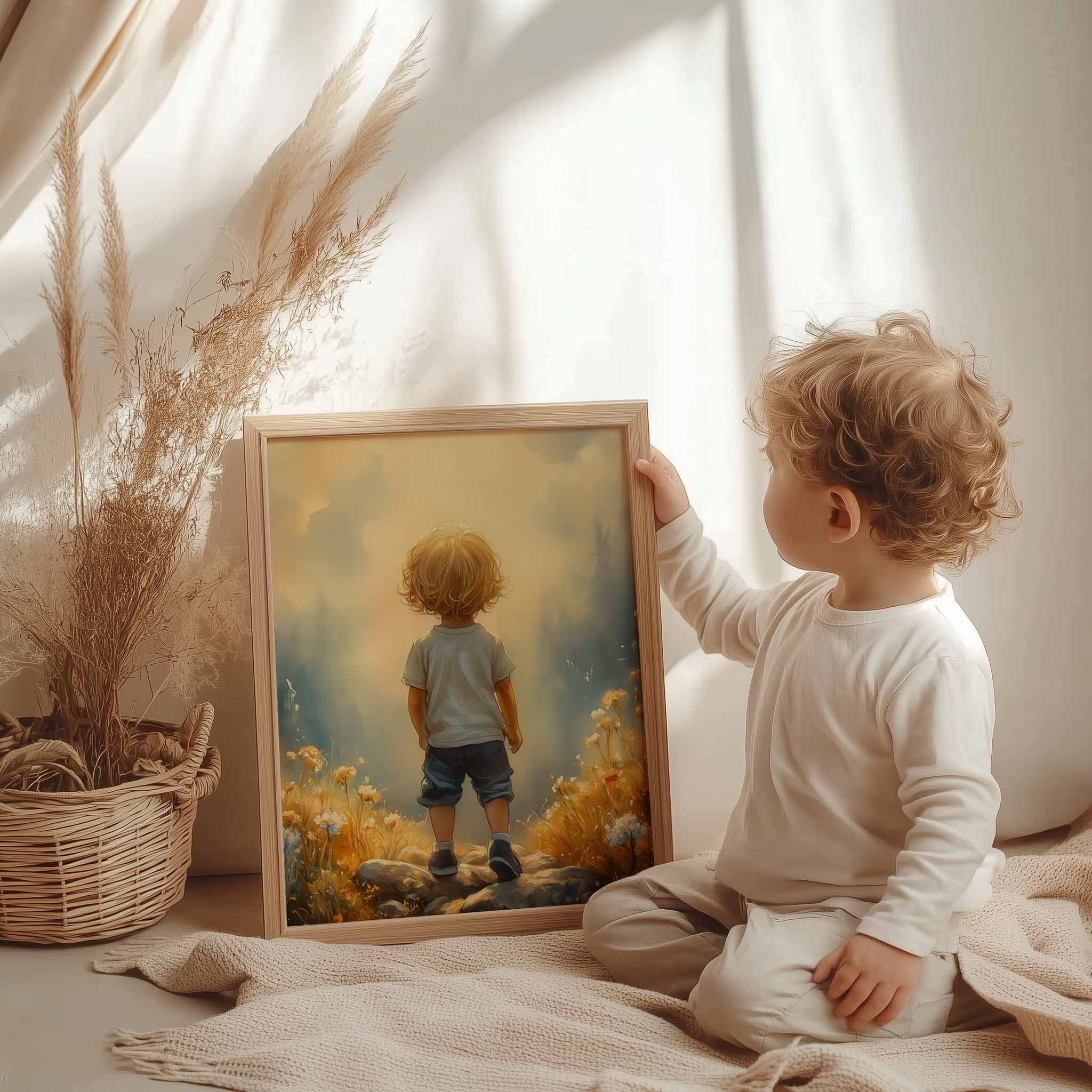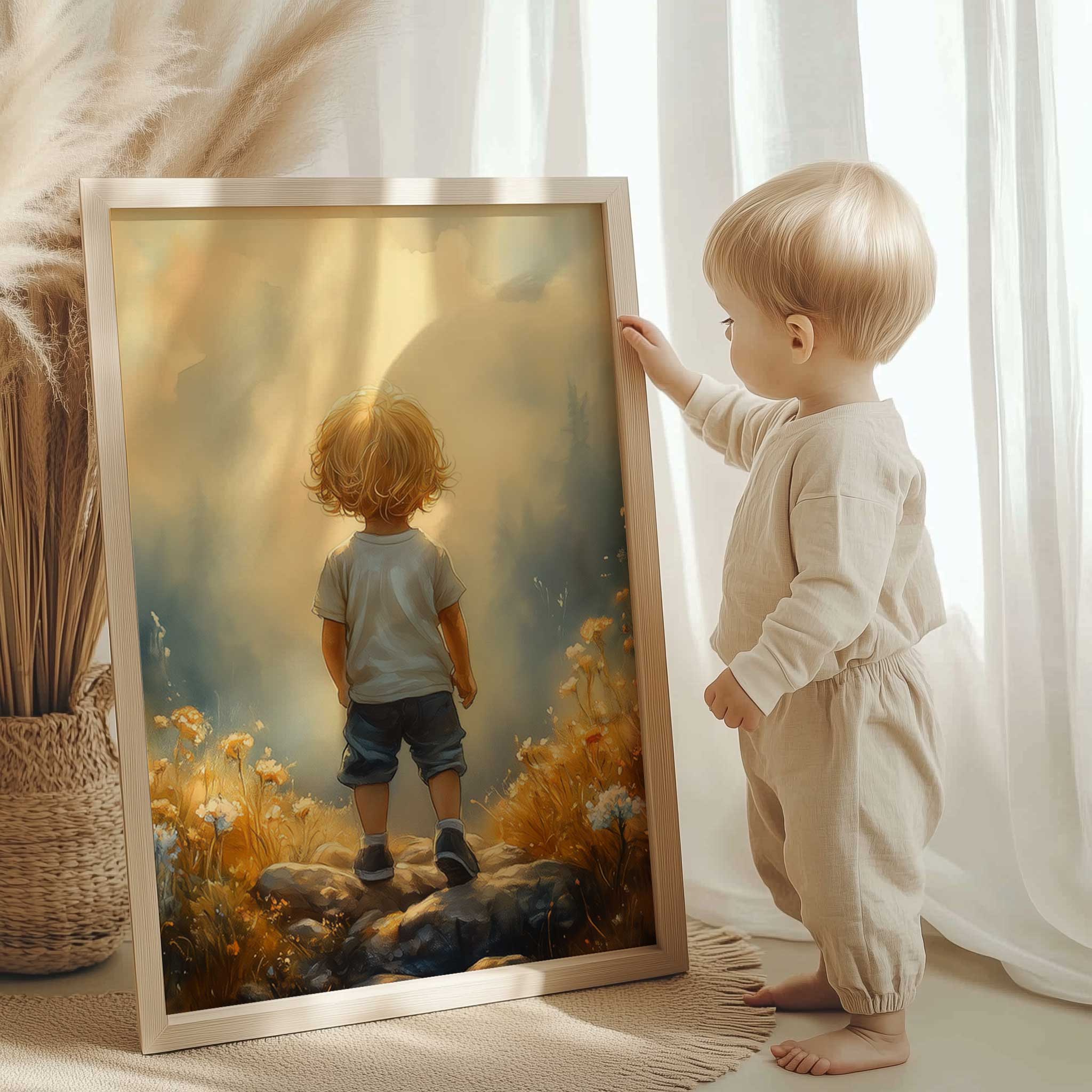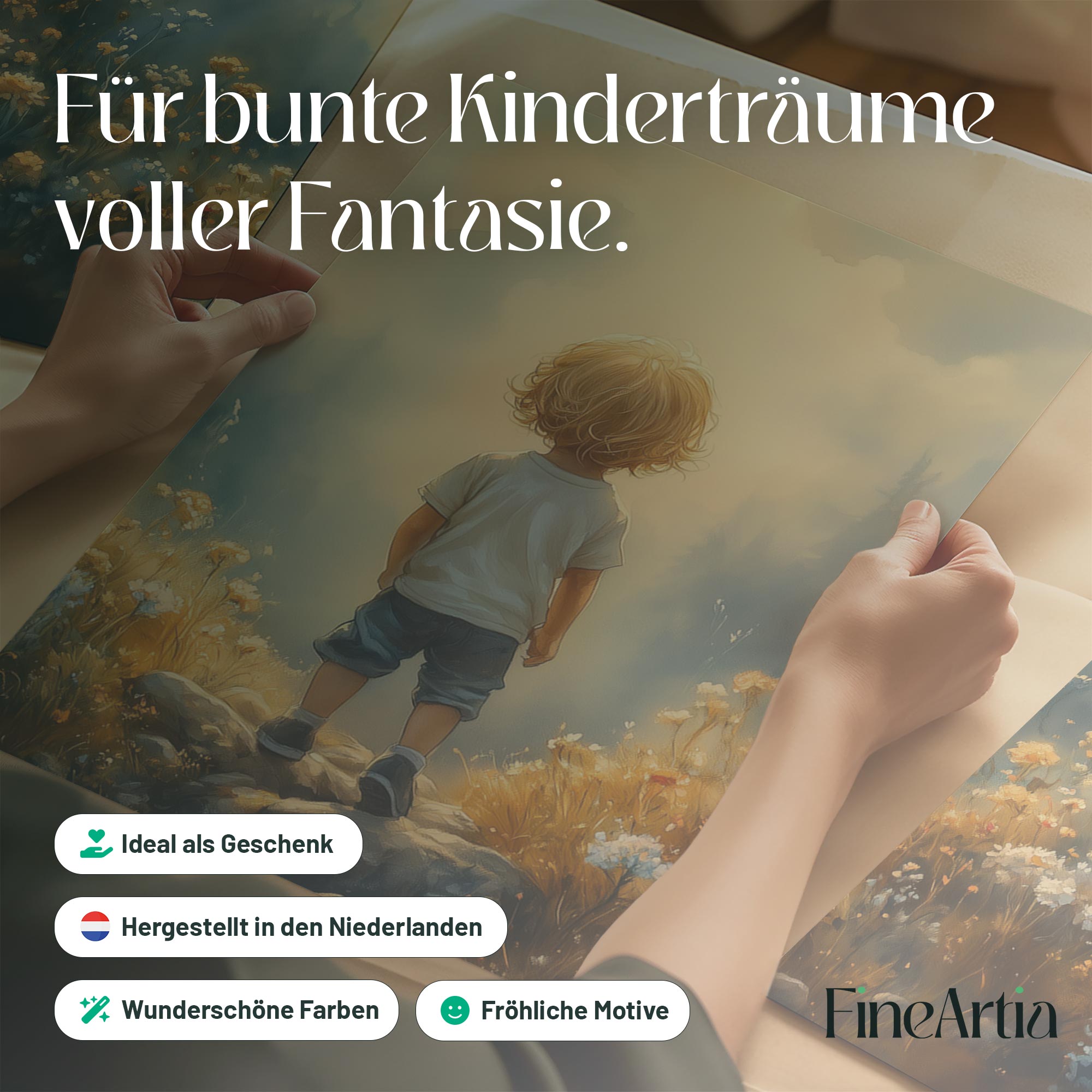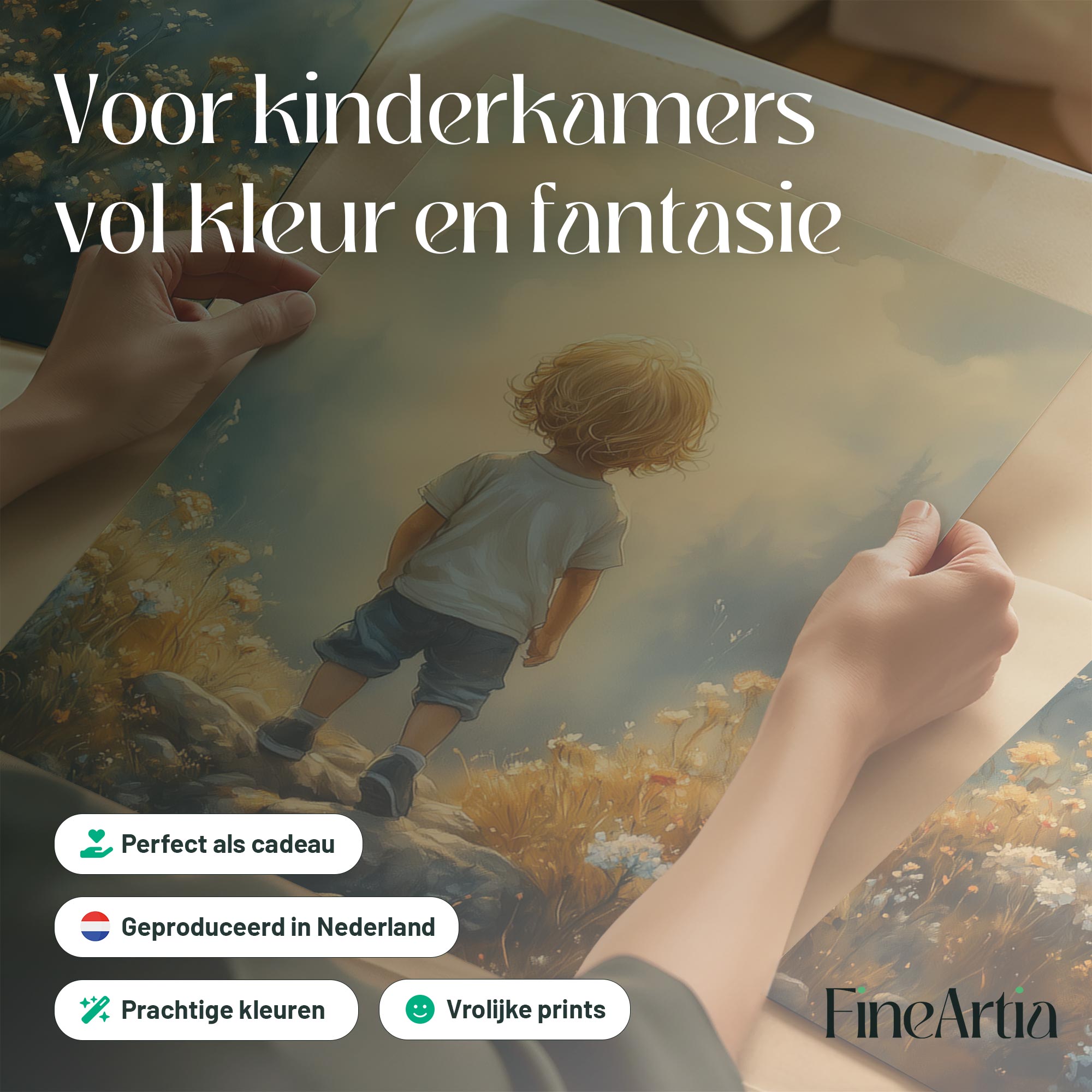 Terug naar collectie Posters Jongen op de rots: Speels avontuur in bloemenveld