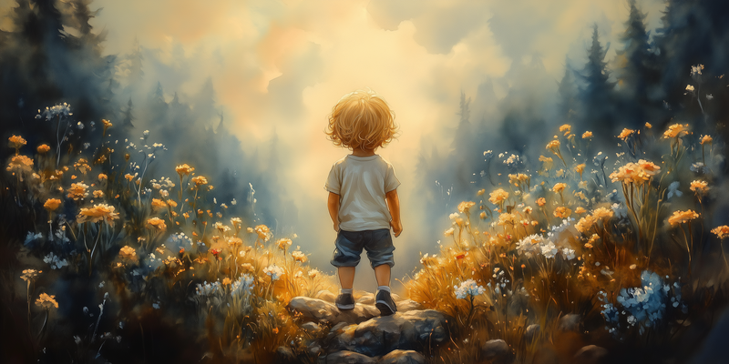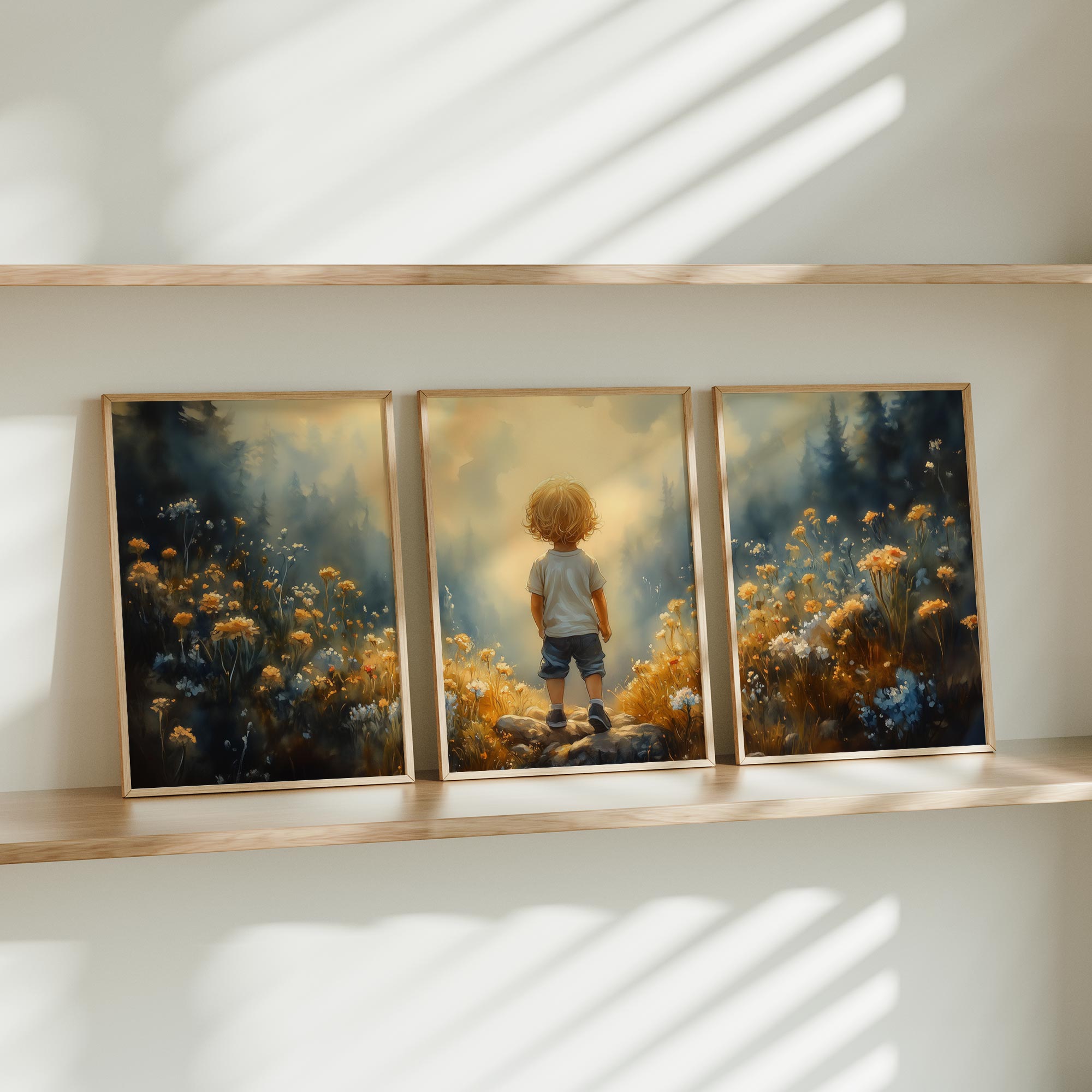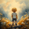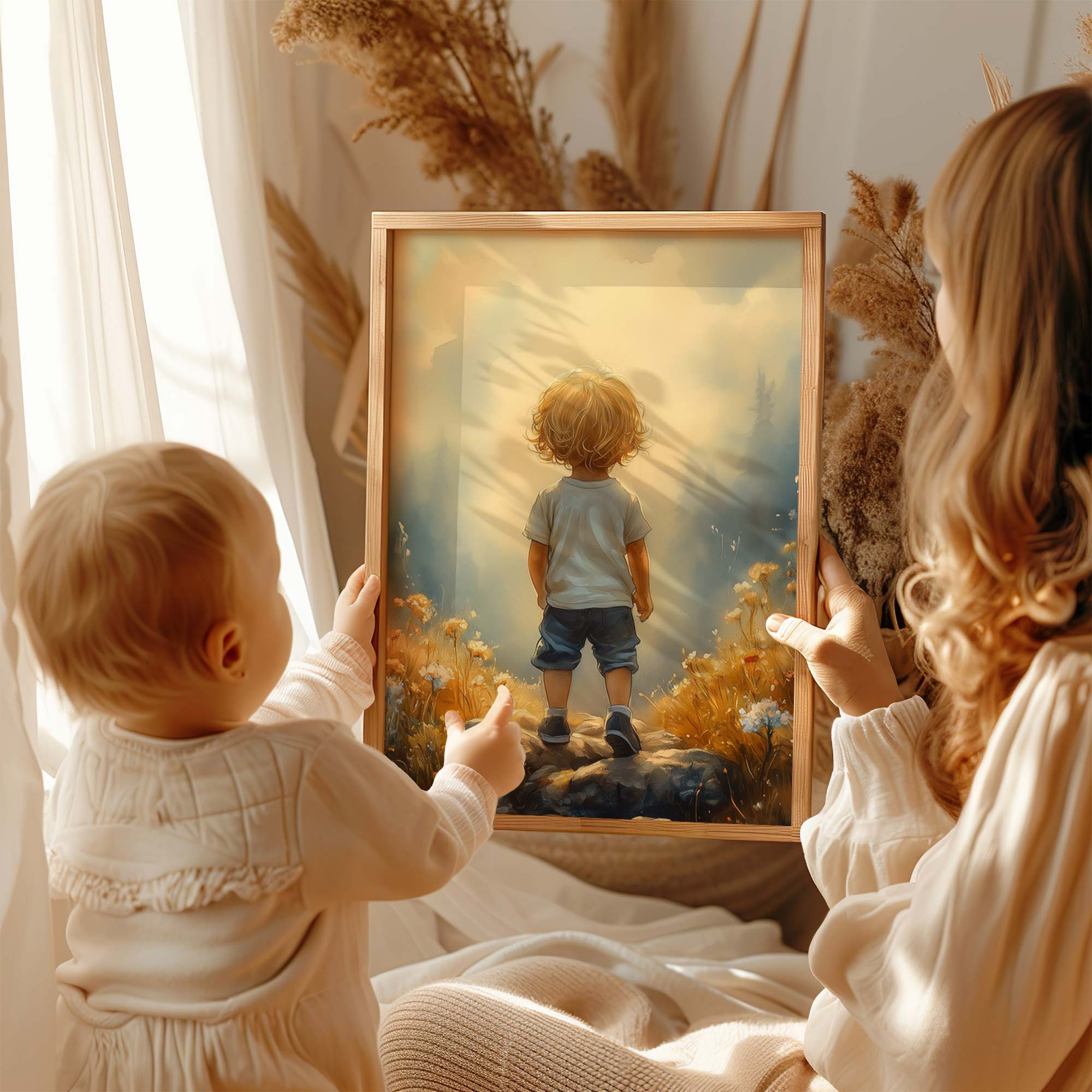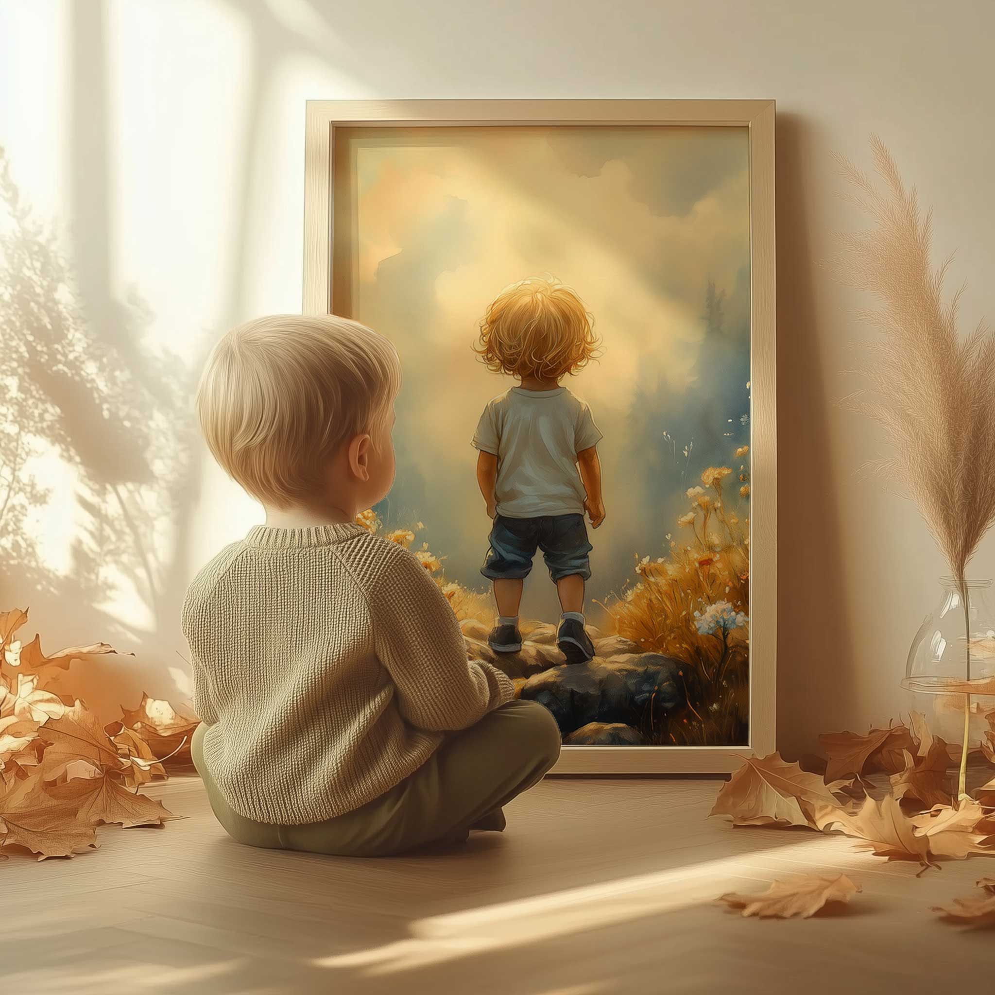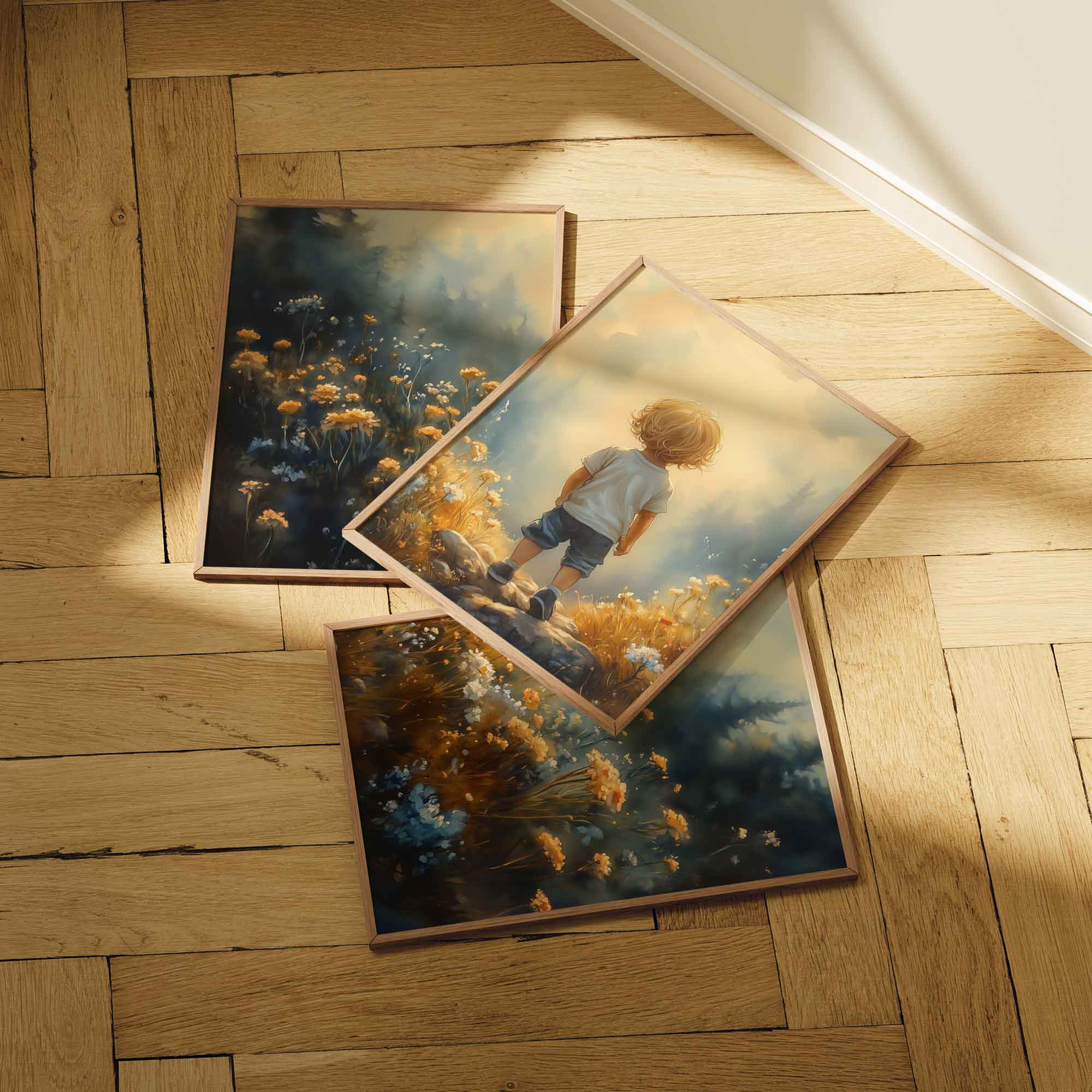 Terug naar collectie Posters Jongen op de rots: Speels avontuur in bloemenveld
